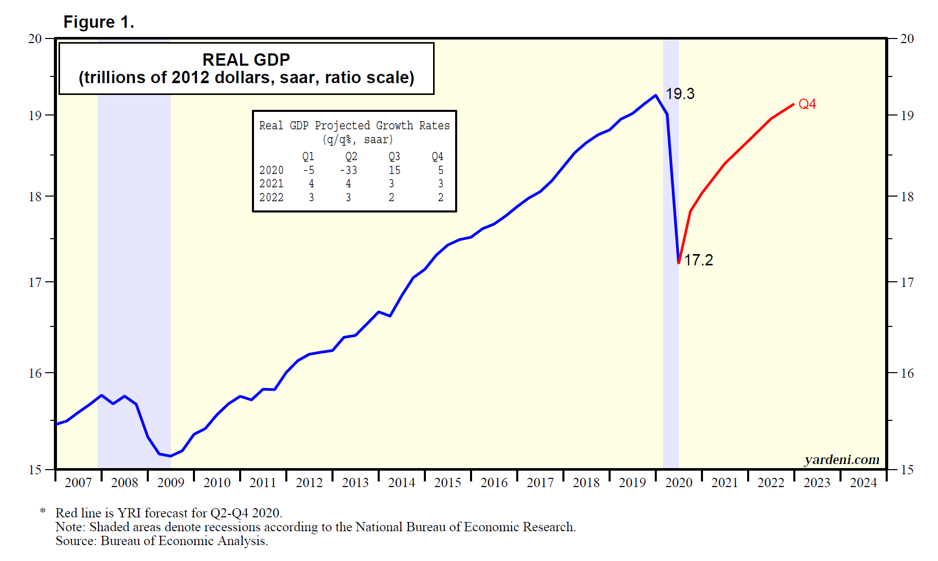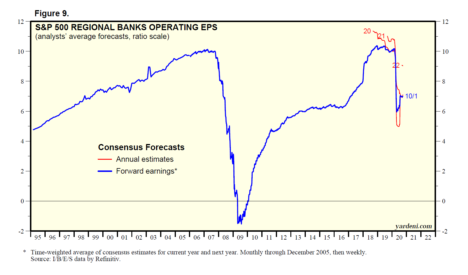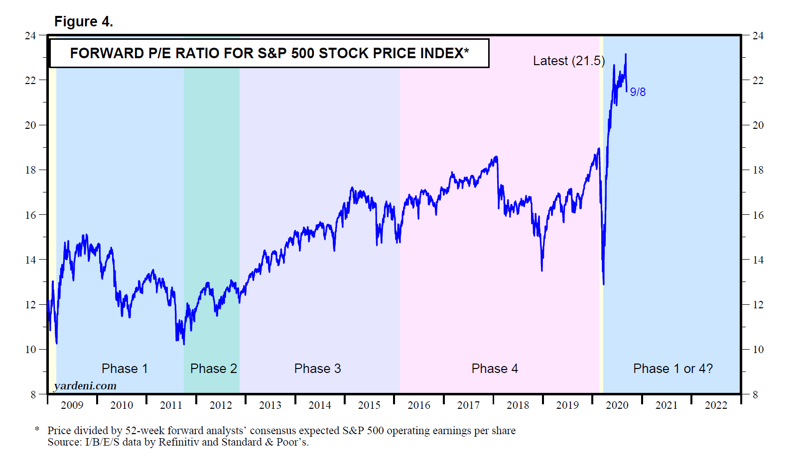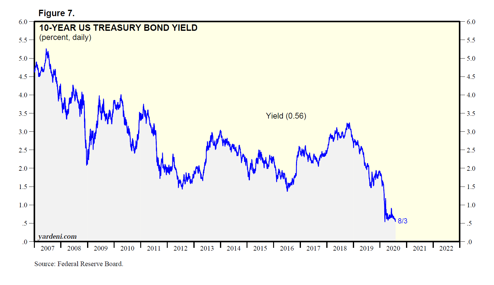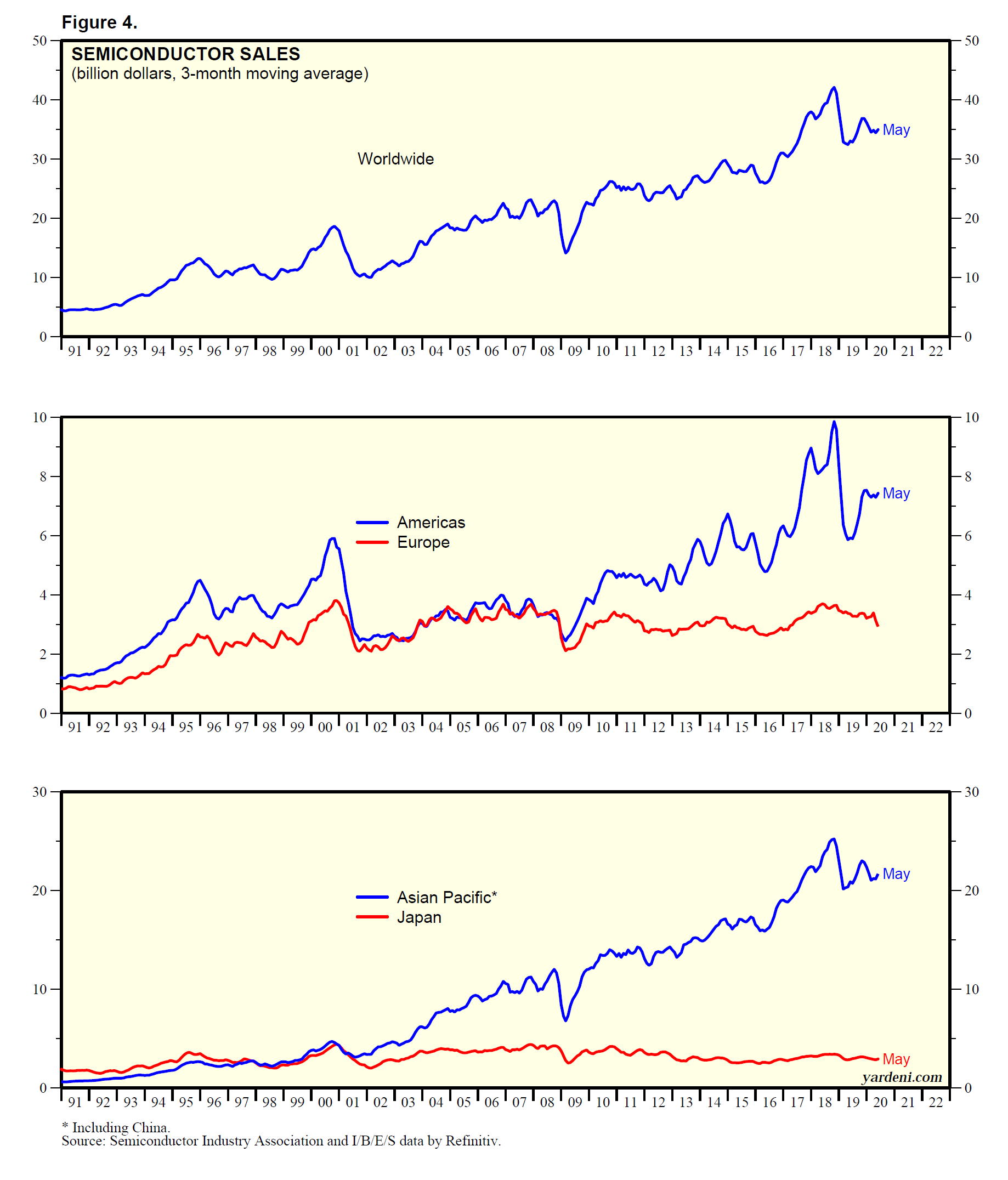 Corporate Finance I: Accounting for Fun & Profits. Yesterday, Joe and I raised our estimates for S&P 500 revenues and earnings per share and profit margins to the following: 2020 ($1,400, $140, 10%), 2021 ($1,545, $170, 11%), and 2022 ($1,625, $195, 12%). As a result, our S&P 500 year-end targets for this year and the next two years are now 3740, 4290, and 4620. (See YRI Earnings Forecasts.)