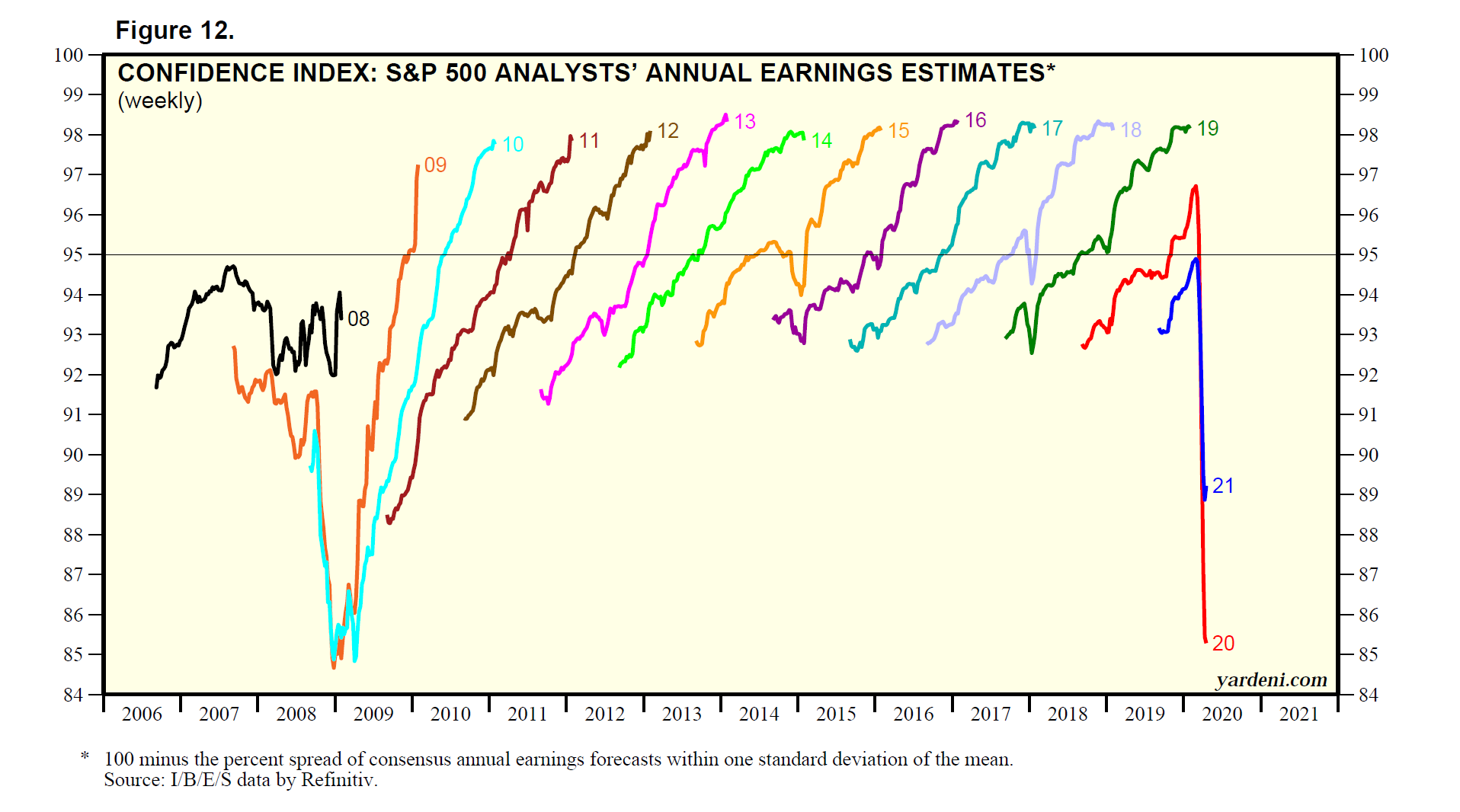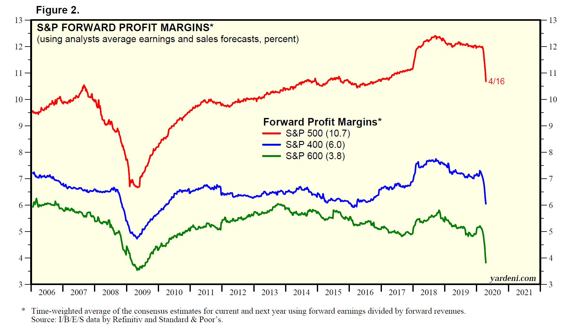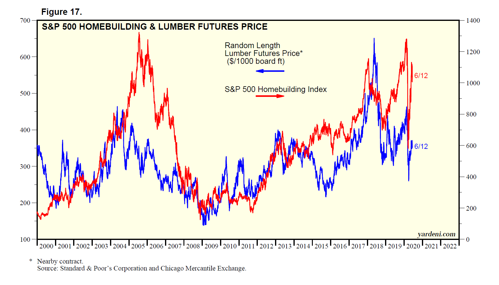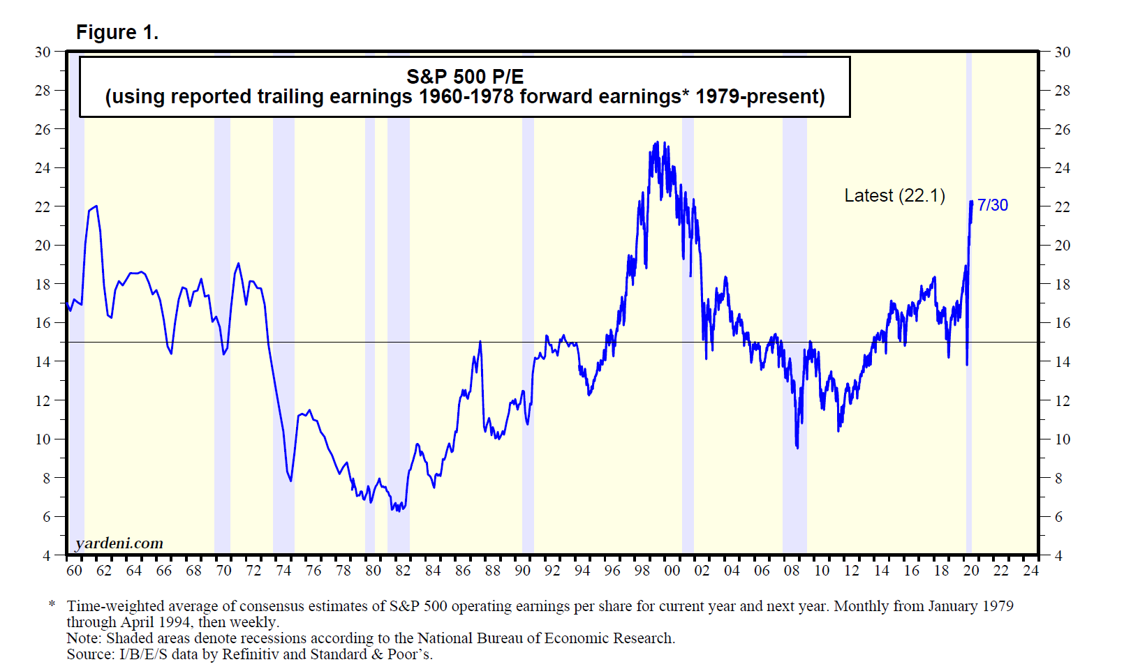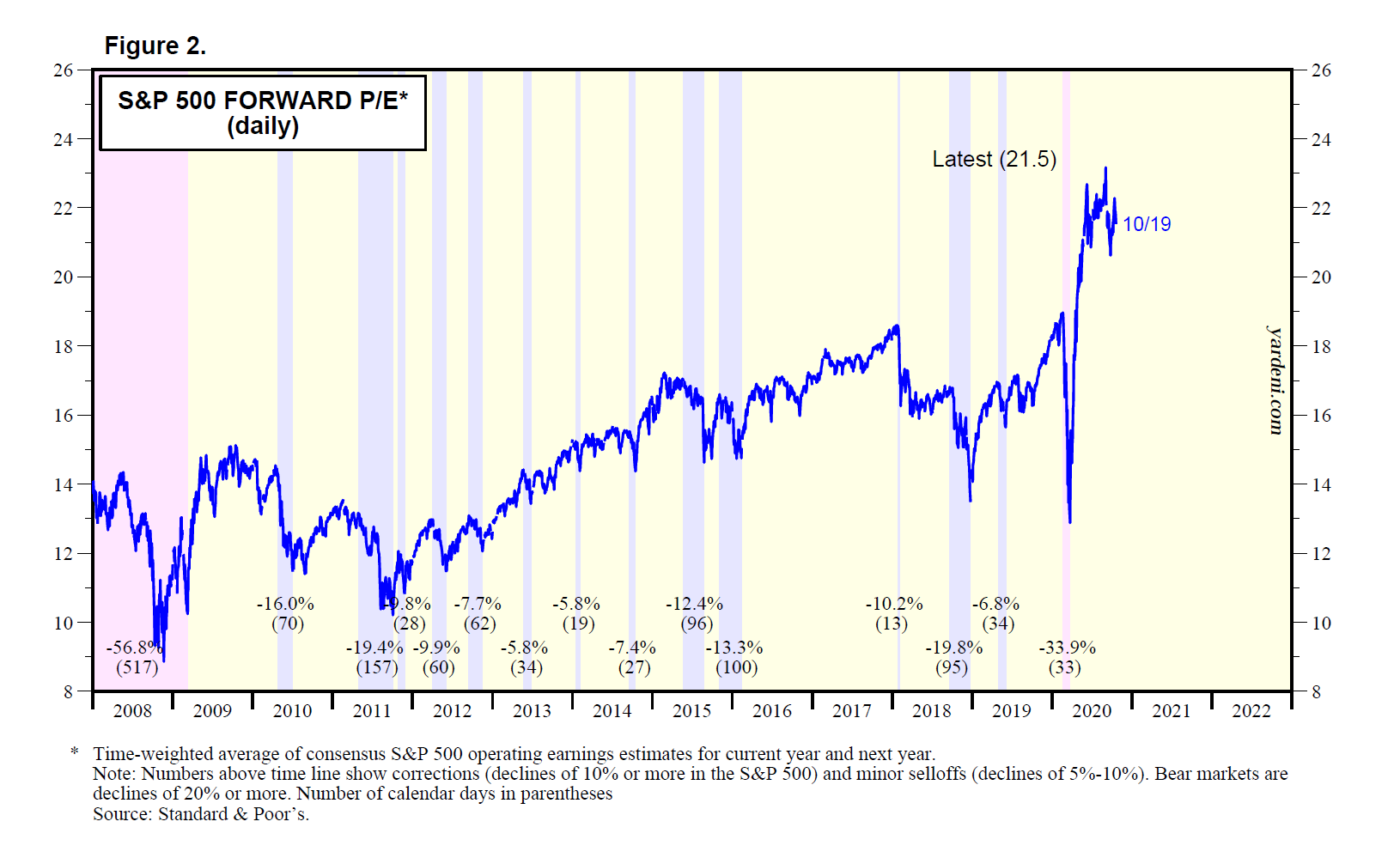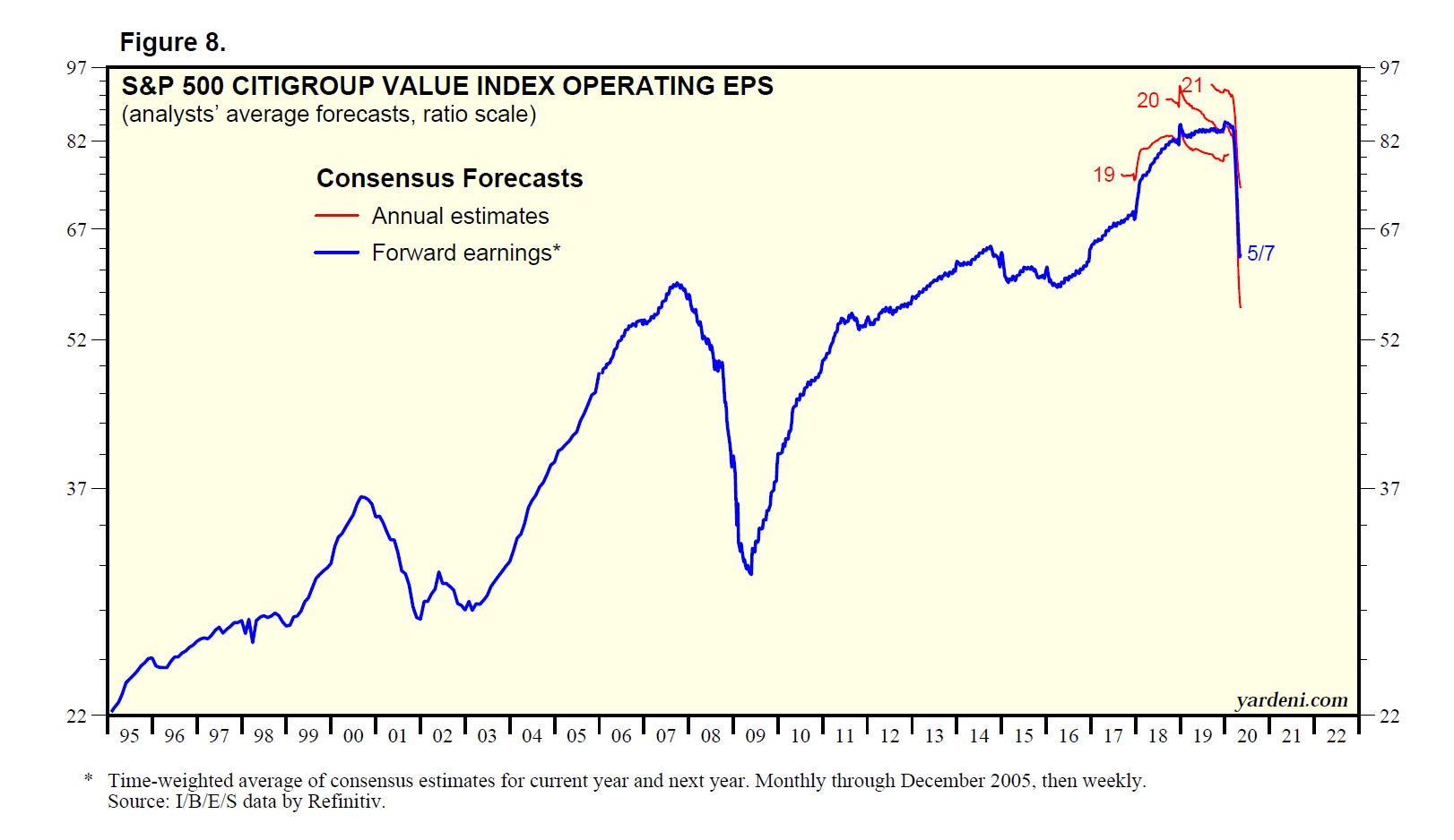 Corporate Finance I: Accounting for Fun & Profits. Yesterday, Joe and I raised our estimates for S&P 500 revenues and earnings per share and profit margins to the following: 2020 ($1,400, $140, 10%), 2021 ($1,545, $170, 11%), and 2022 ($1,625, $195, 12%). As a result, our S&P 500 year-end targets for this year and the next two years are now 3740, 4290, and 4620. (See YRI Earnings Forecasts.)