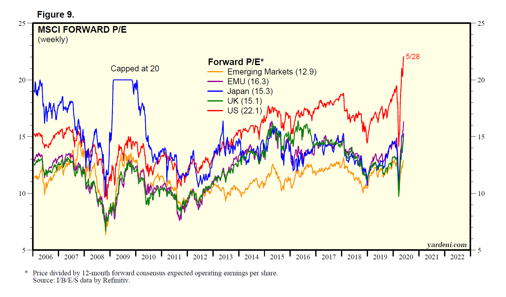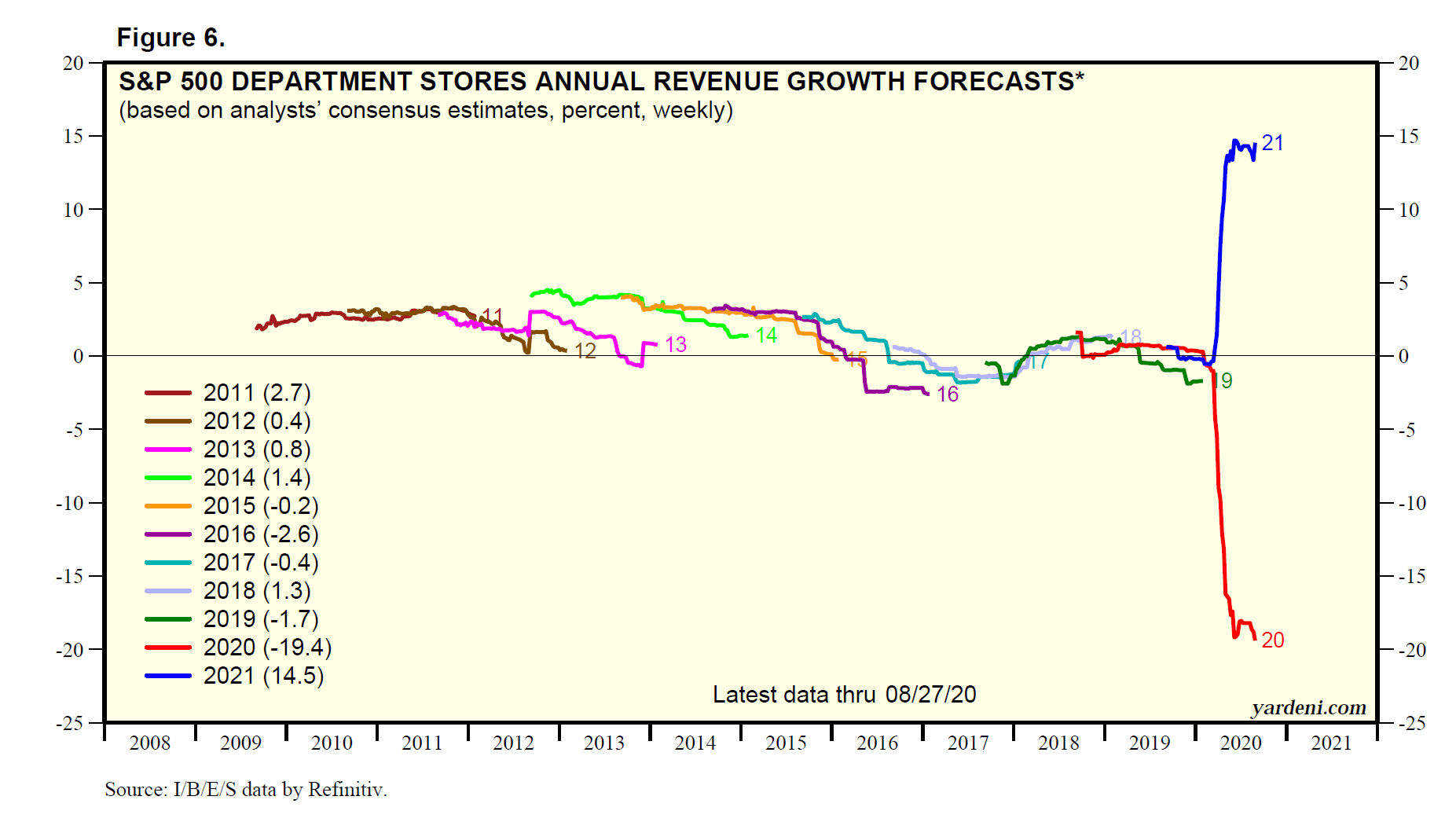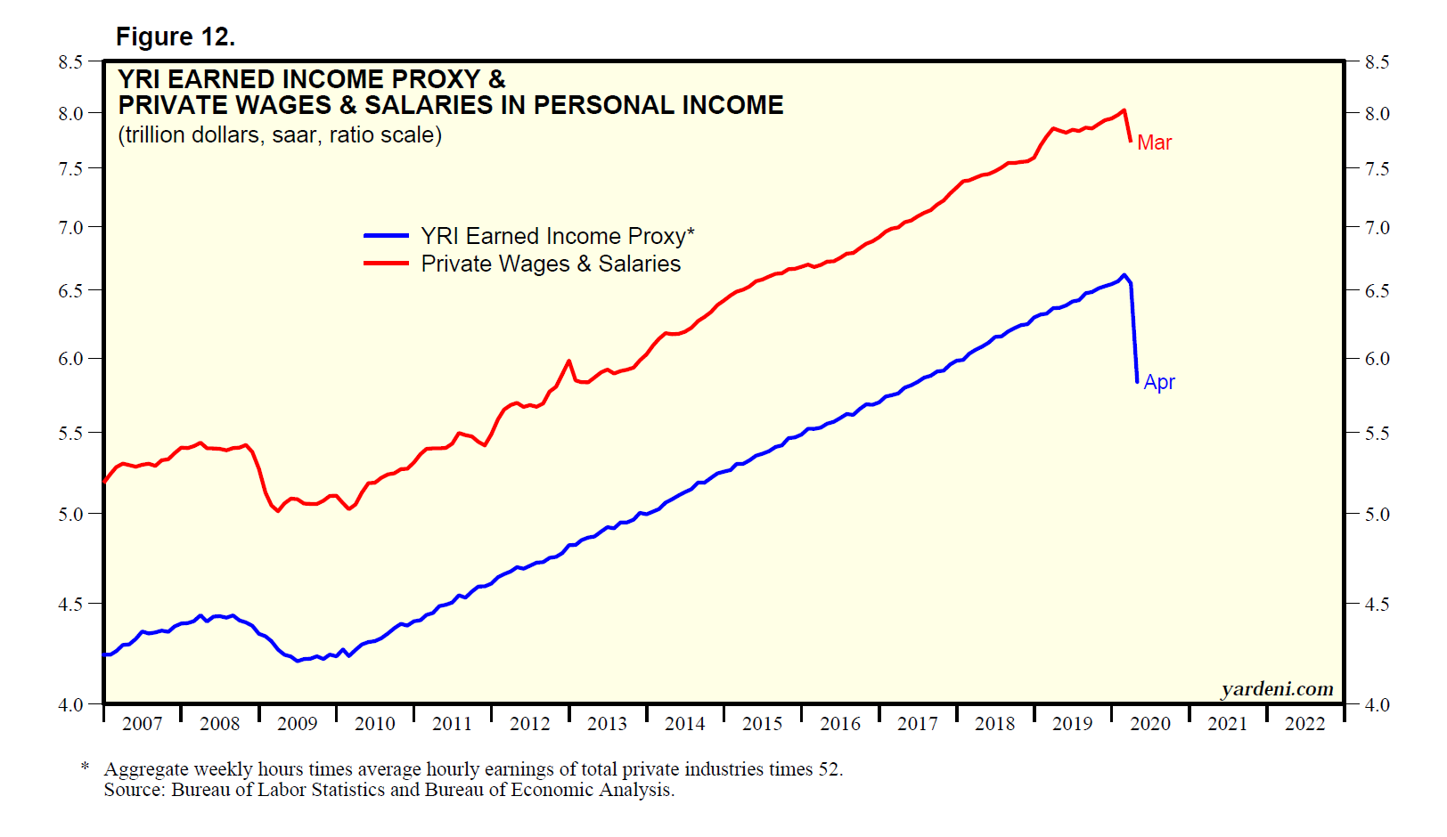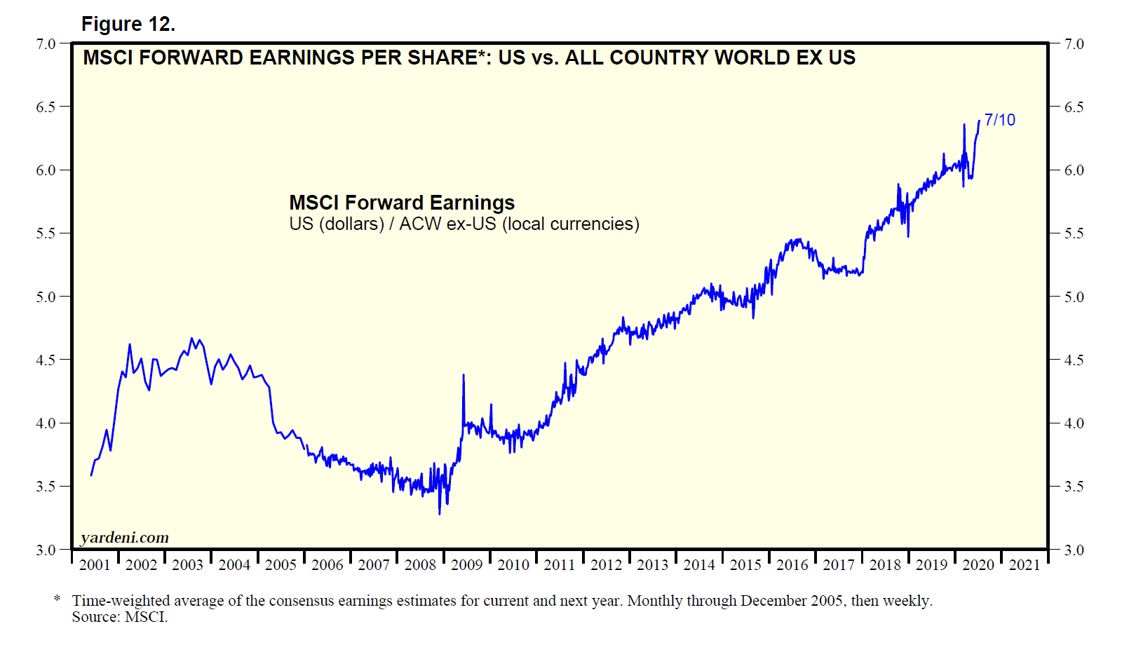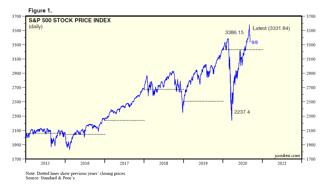 Corporate Finance I: Accounting for Fun & Profits. Yesterday, Joe and I raised our estimates for S&P 500 revenues and earnings per share and profit margins to the following: 2020 ($1,400, $140, 10%), 2021 ($1,545, $170, 11%), and 2022 ($1,625, $195, 12%). As a result, our S&P 500 year-end targets for this year and the next two years are now 3740, 4290, and 4620. (See YRI Earnings Forecasts.)