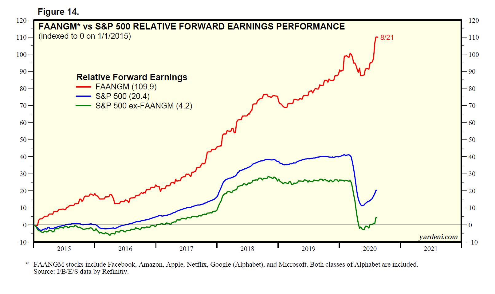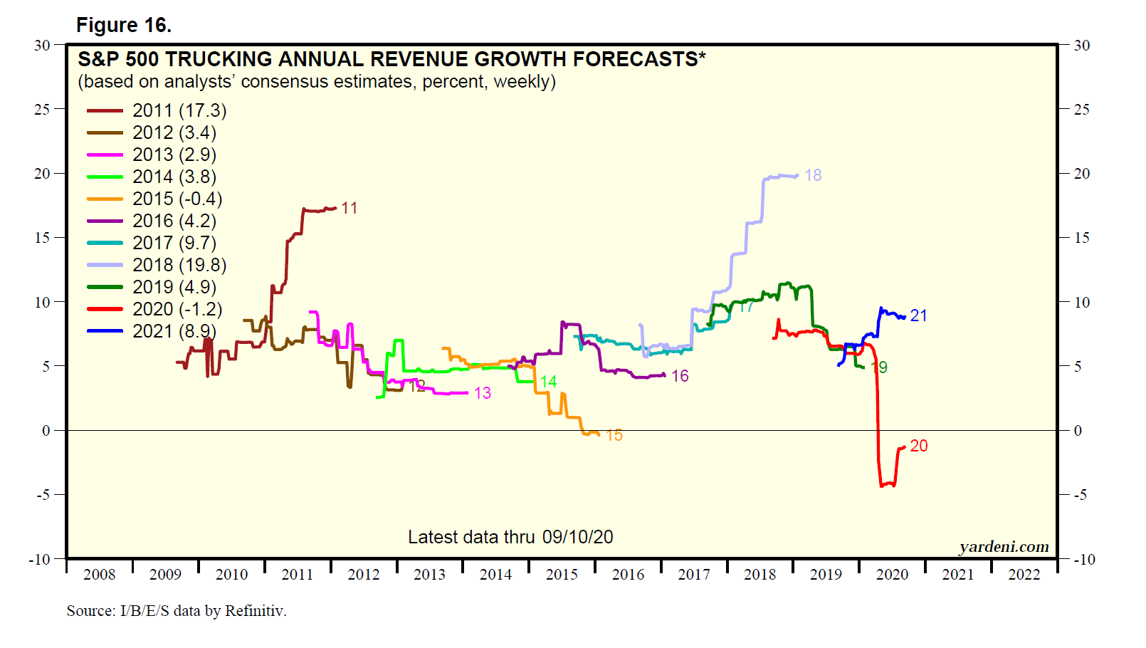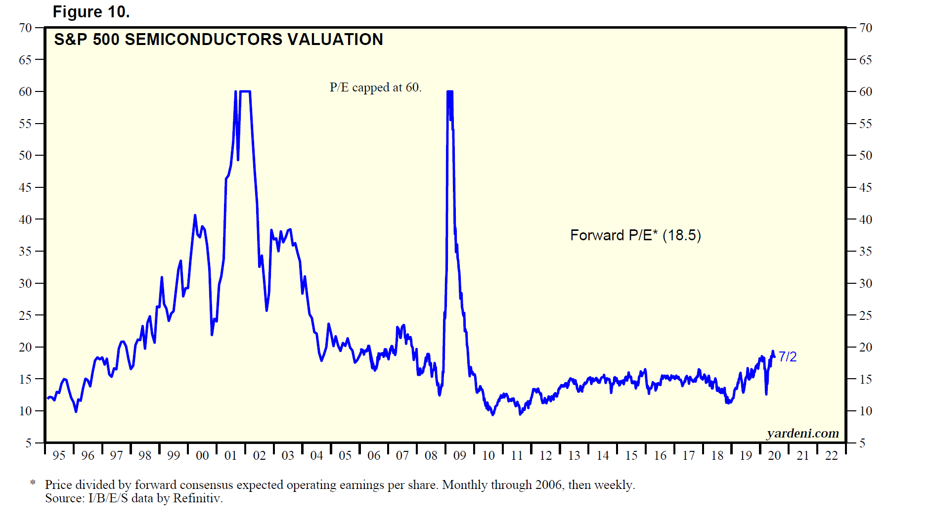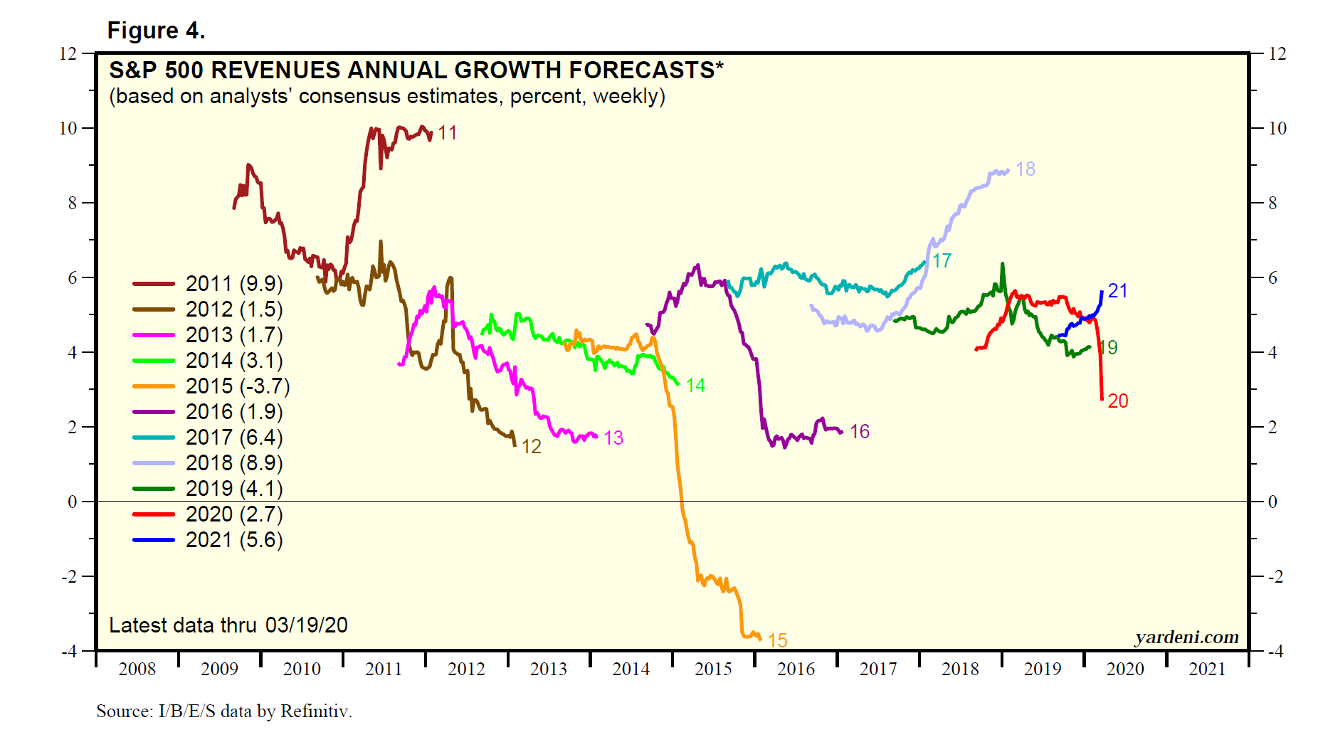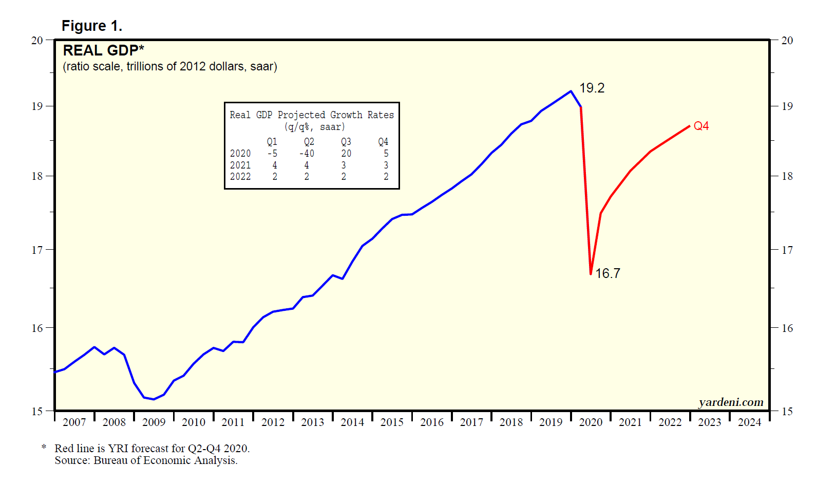 Corporate Finance I: Accounting for Fun & Profits. Yesterday, Joe and I raised our estimates for S&P 500 revenues and earnings per share and profit margins to the following: 2020 ($1,400, $140, 10%), 2021 ($1,545, $170, 11%), and 2022 ($1,625, $195, 12%). As a result, our S&P 500 year-end targets for this year and the next two years are now 3740, 4290, and 4620. (See YRI Earnings Forecasts.)