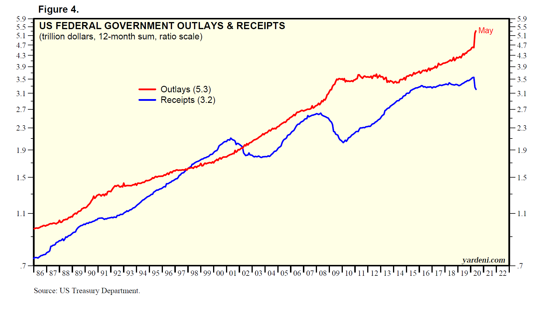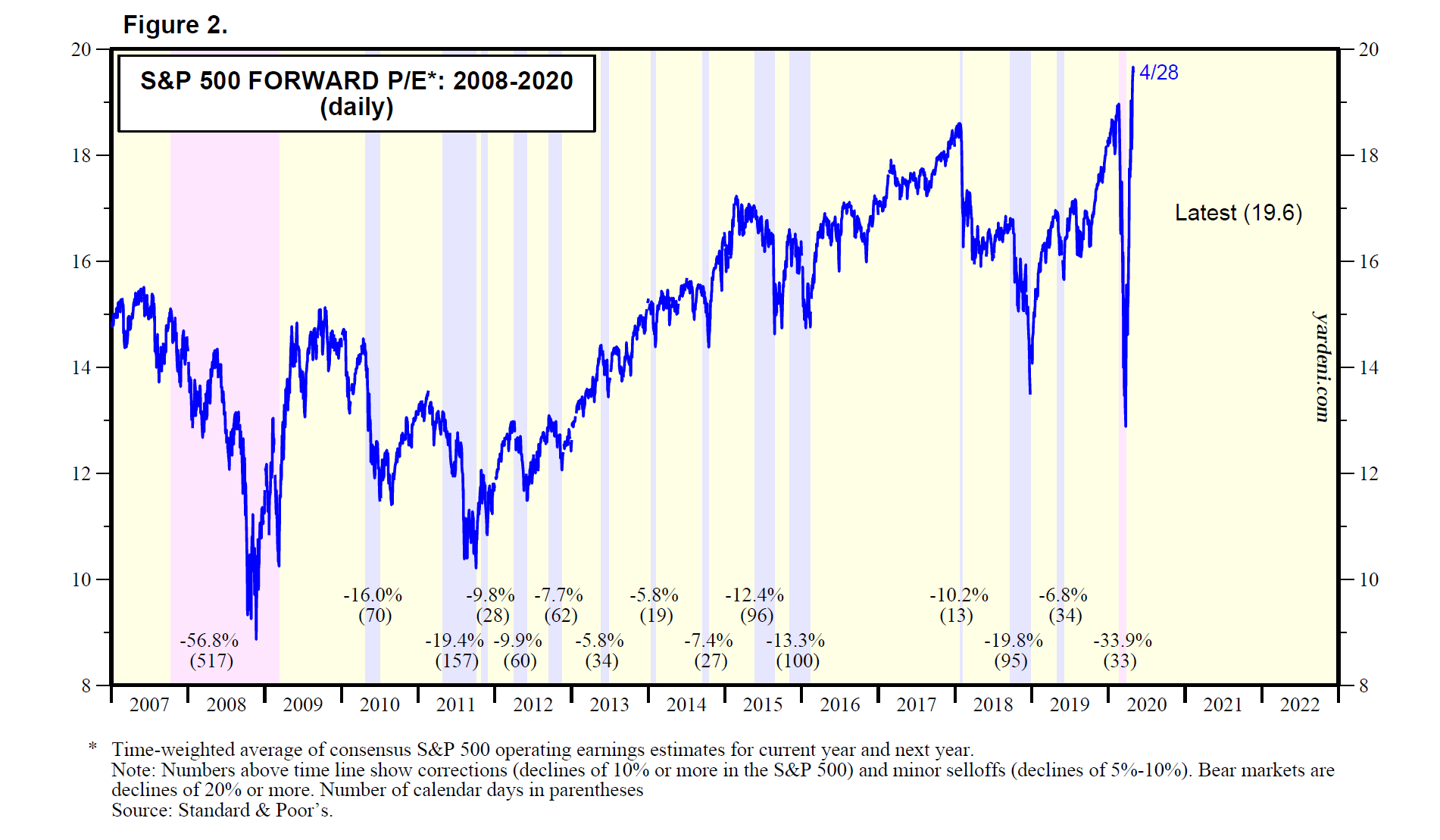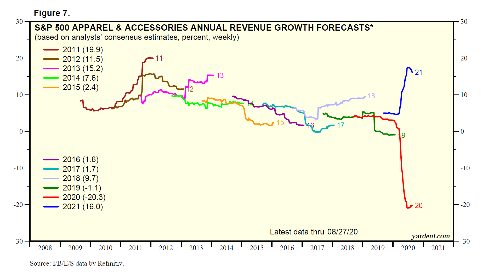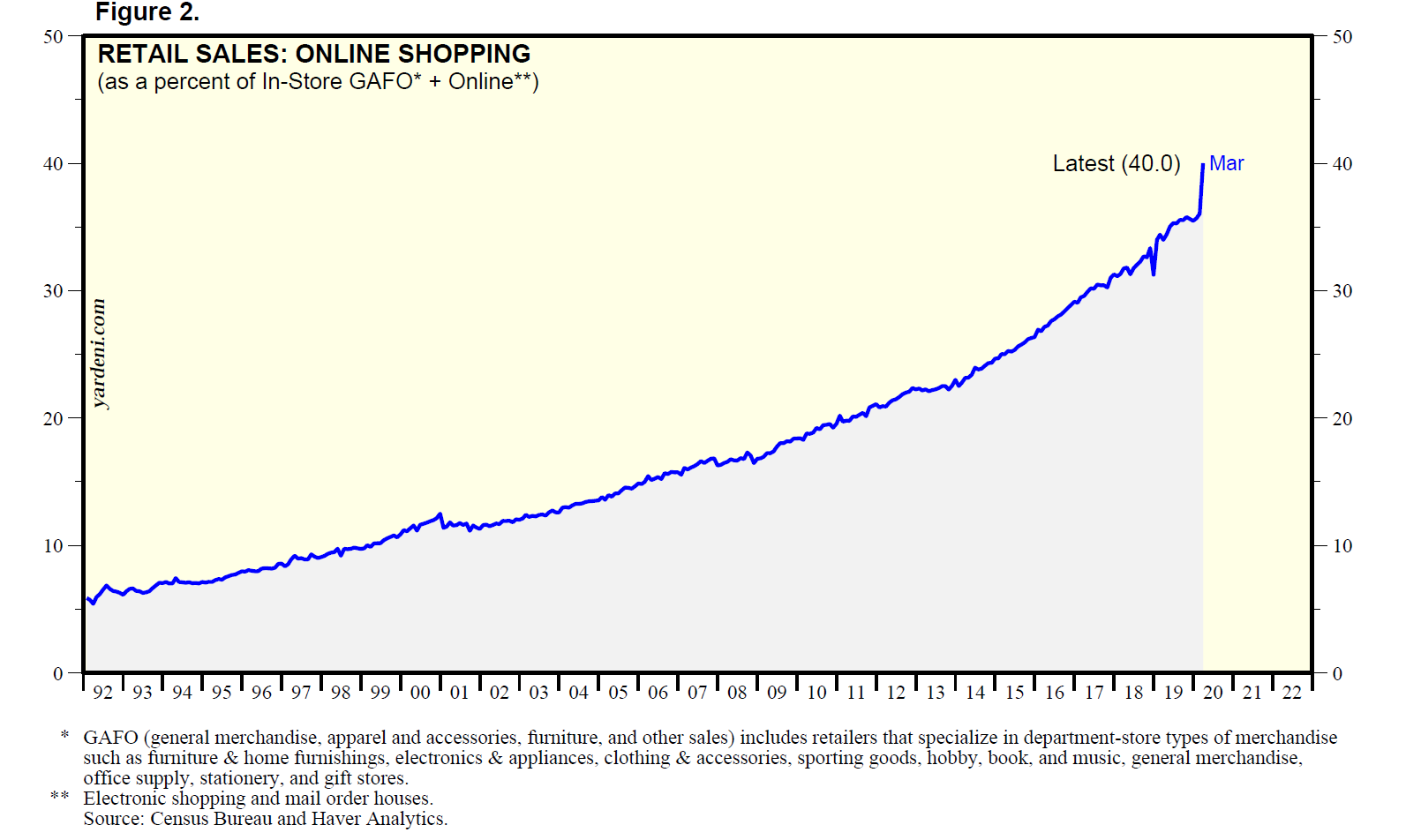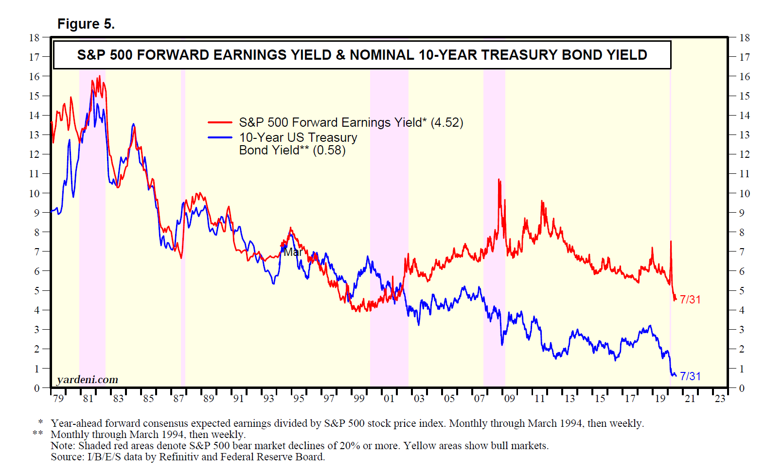 Corporate Finance I: Accounting for Fun & Profits. Yesterday, Joe and I raised our estimates for S&P 500 revenues and earnings per share and profit margins to the following: 2020 ($1,400, $140, 10%), 2021 ($1,545, $170, 11%), and 2022 ($1,625, $195, 12%). As a result, our S&P 500 year-end targets for this year and the next two years are now 3740, 4290, and 4620. (See YRI Earnings Forecasts.)