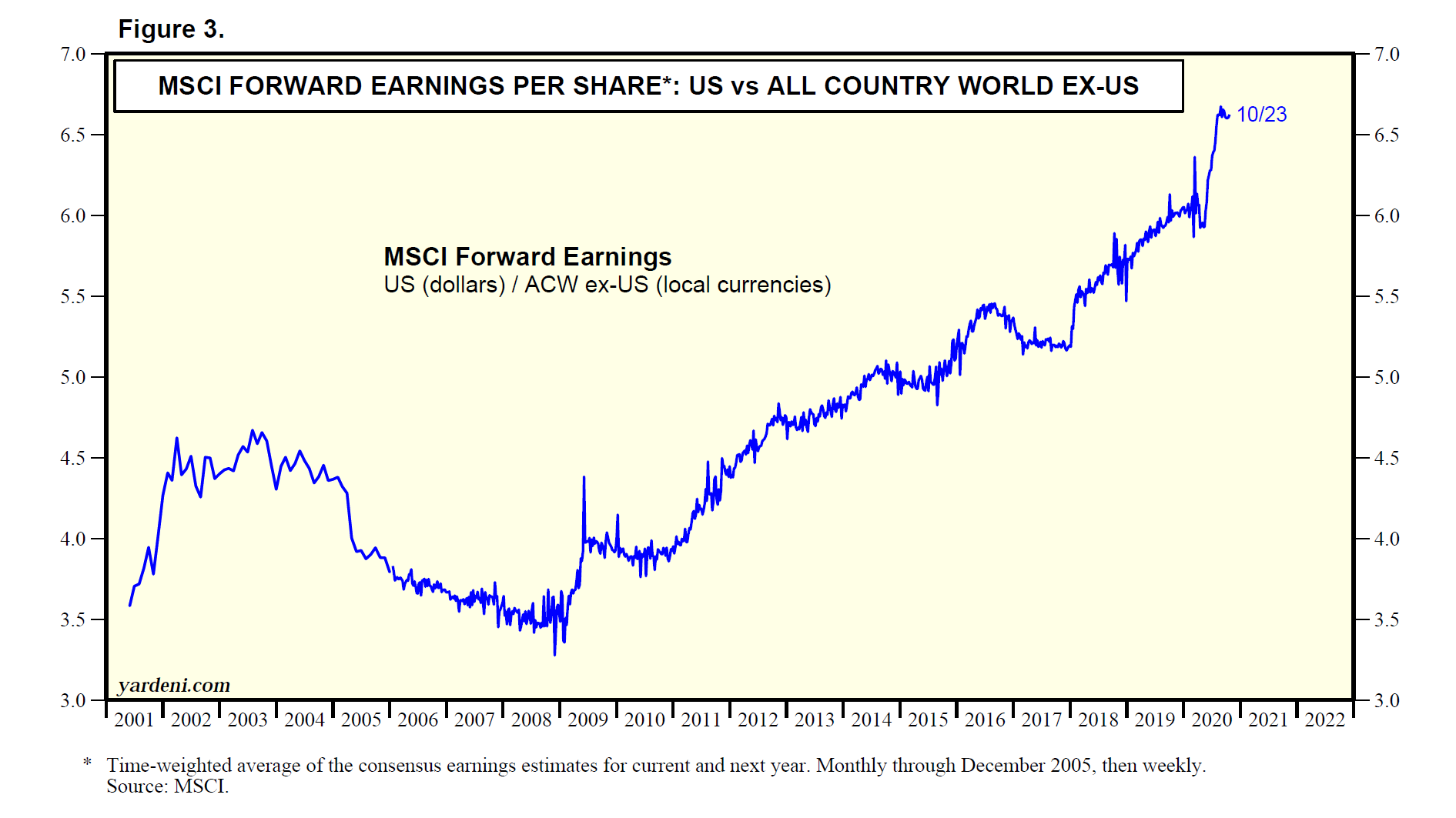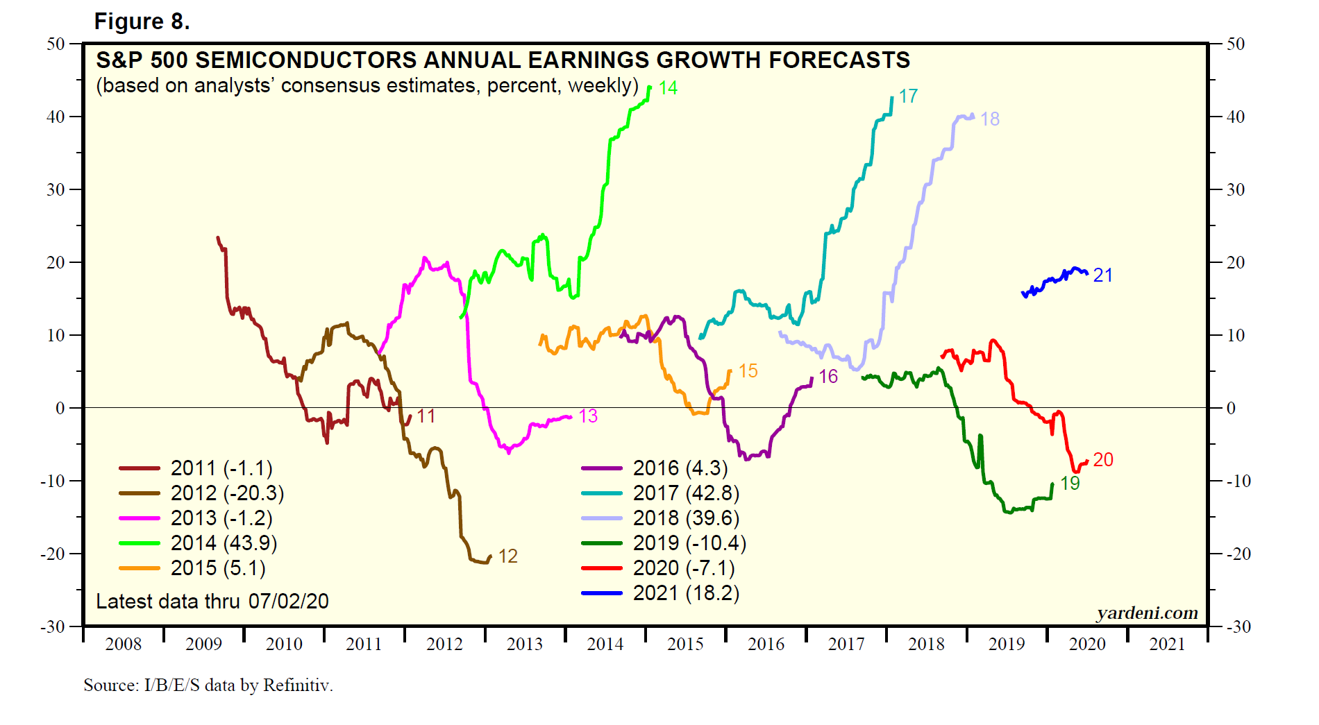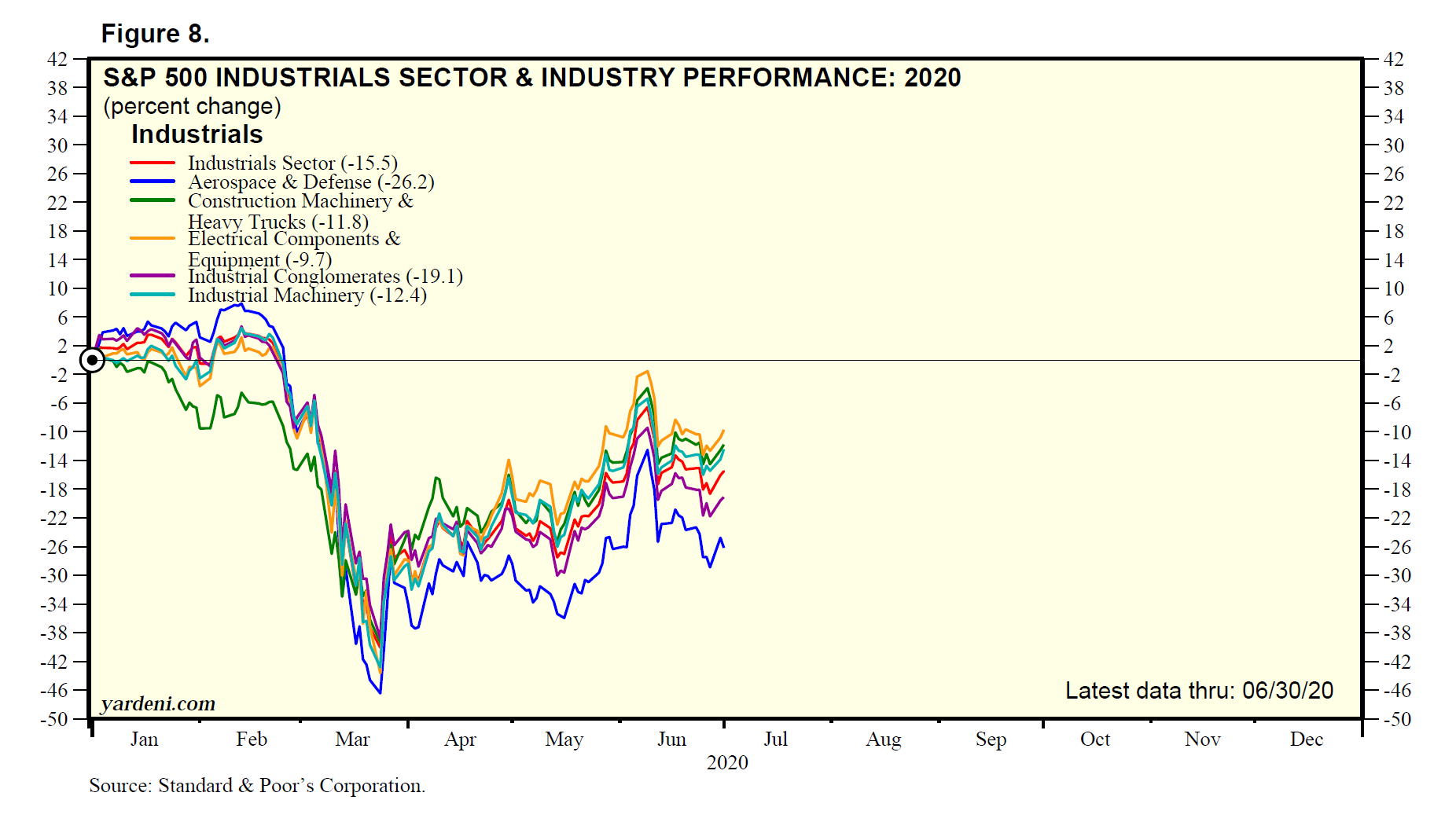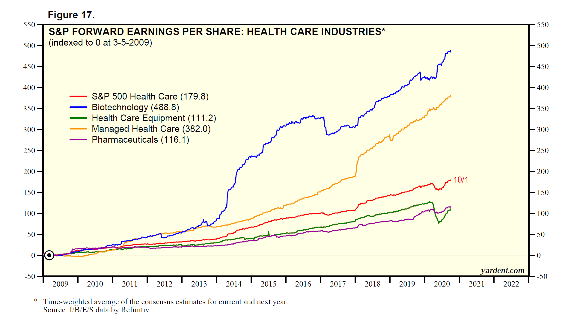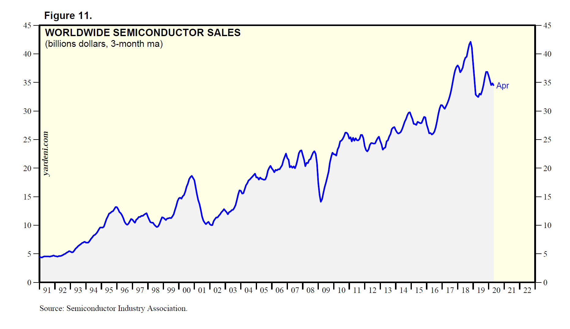 Corporate Finance I: Accounting for Fun & Profits. Yesterday, Joe and I raised our estimates for S&P 500 revenues and earnings per share and profit margins to the following: 2020 ($1,400, $140, 10%), 2021 ($1,545, $170, 11%), and 2022 ($1,625, $195, 12%). As a result, our S&P 500 year-end targets for this year and the next two years are now 3740, 4290, and 4620. (See YRI Earnings Forecasts.)