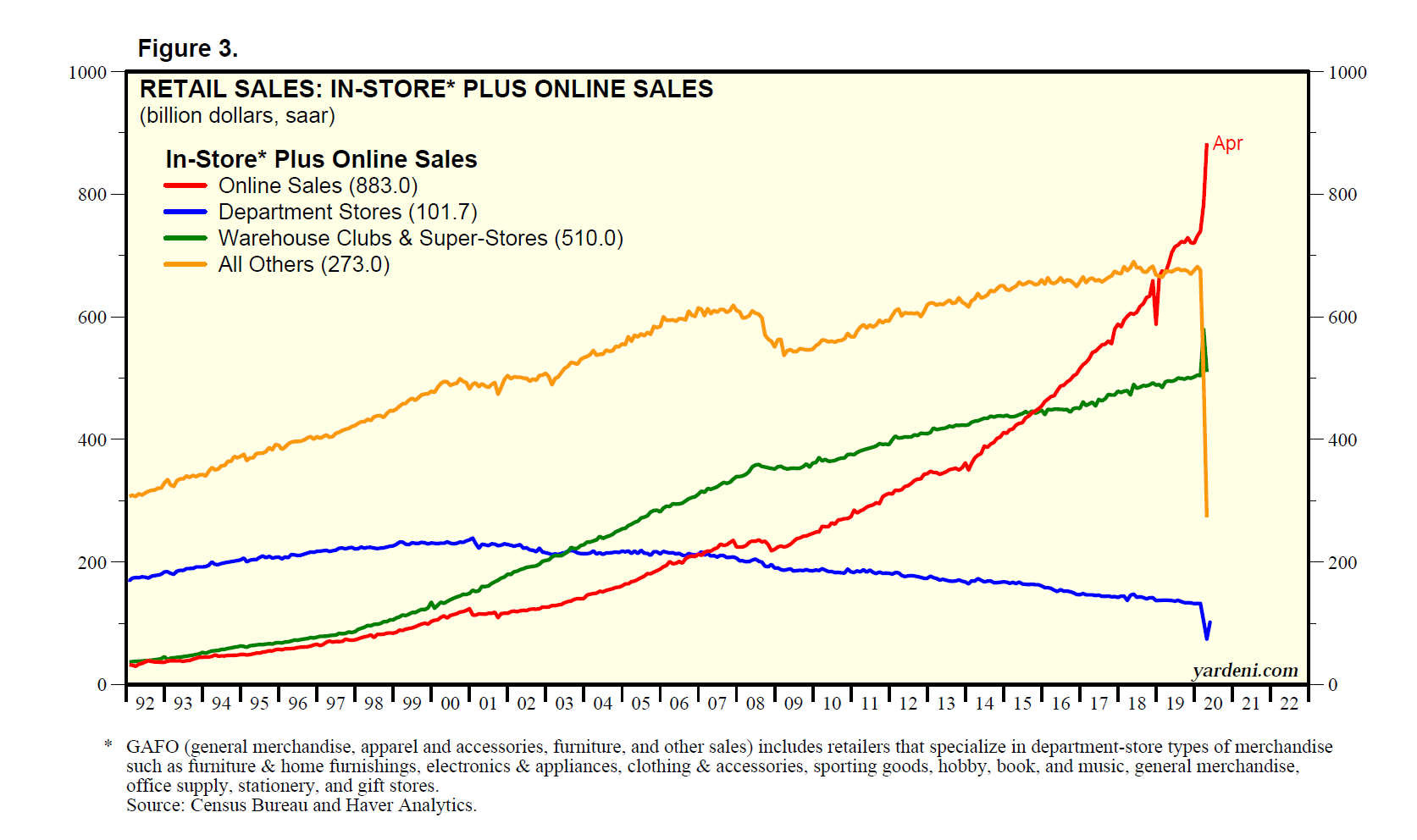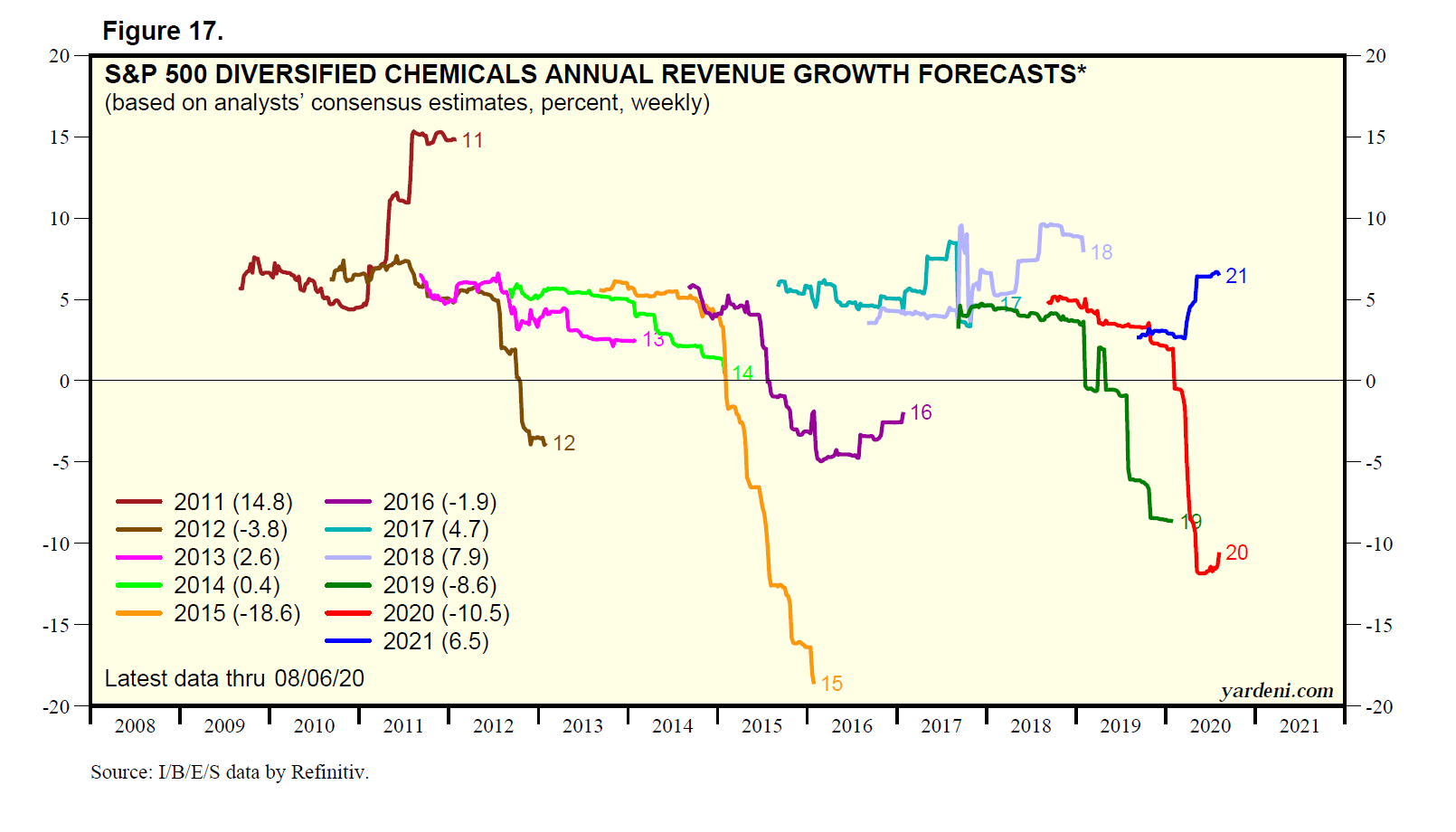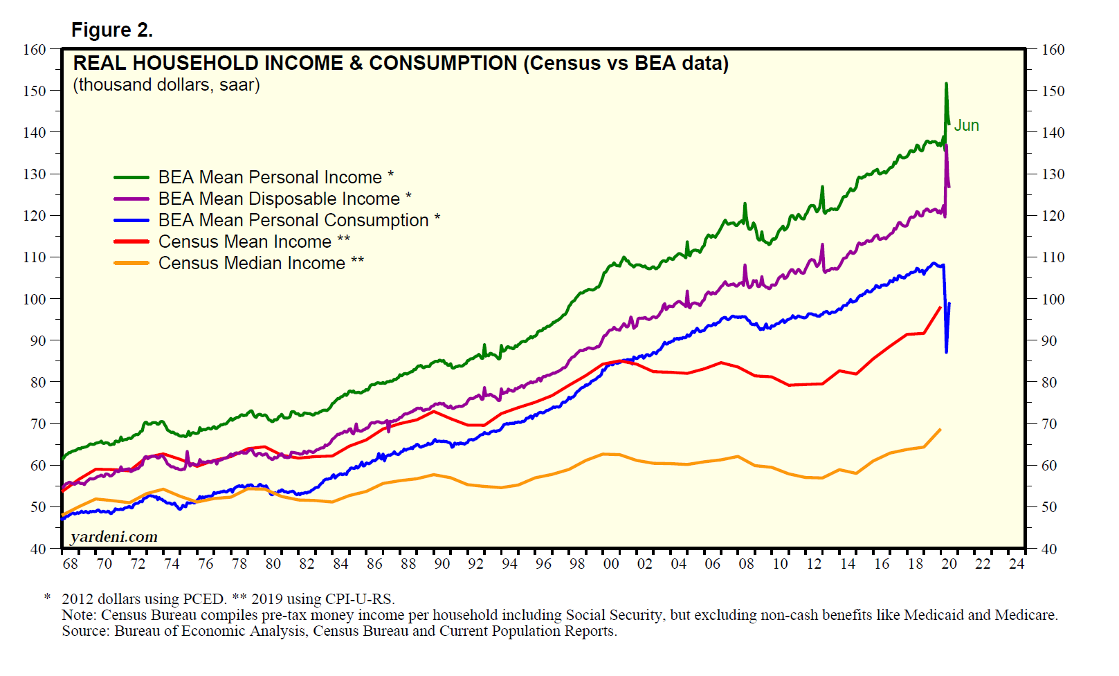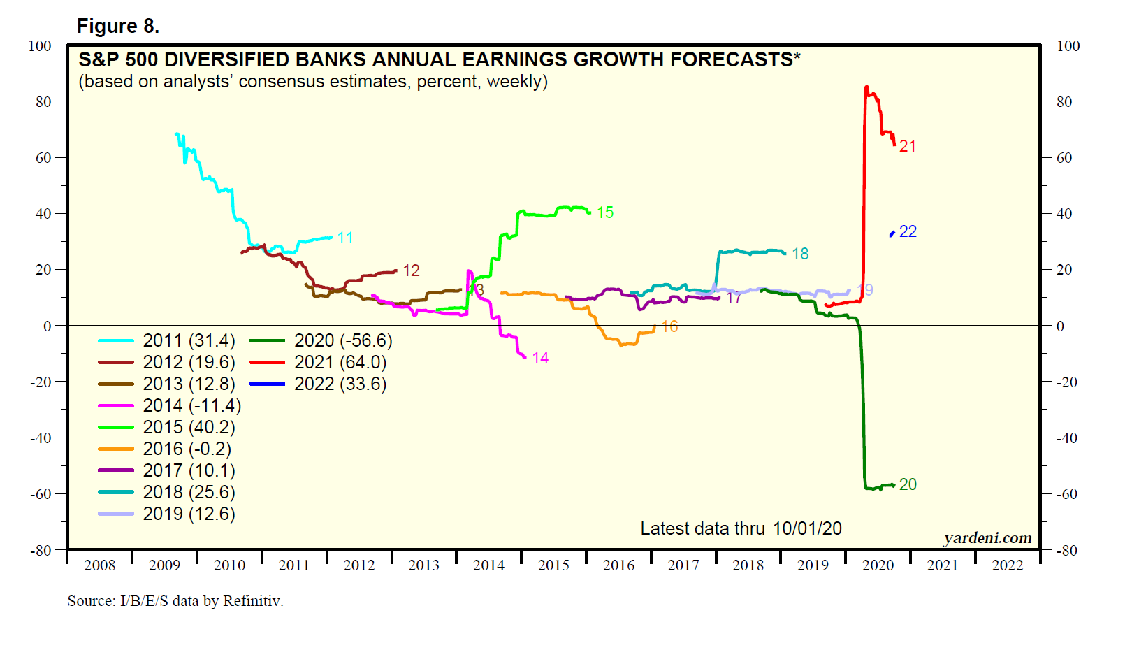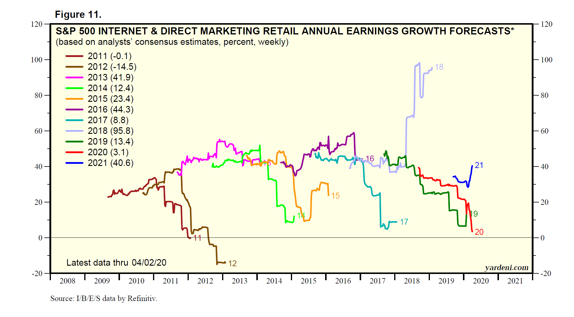 Corporate Finance I: Accounting for Fun & Profits. Yesterday, Joe and I raised our estimates for S&P 500 revenues and earnings per share and profit margins to the following: 2020 ($1,400, $140, 10%), 2021 ($1,545, $170, 11%), and 2022 ($1,625, $195, 12%). As a result, our S&P 500 year-end targets for this year and the next two years are now 3740, 4290, and 4620. (See YRI Earnings Forecasts.)