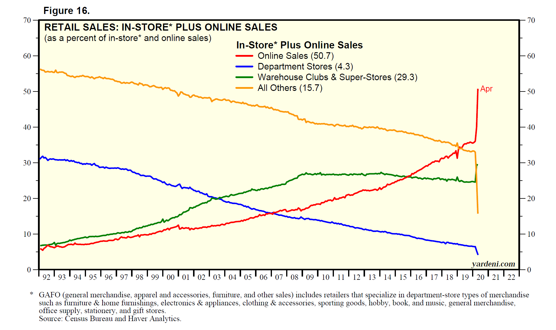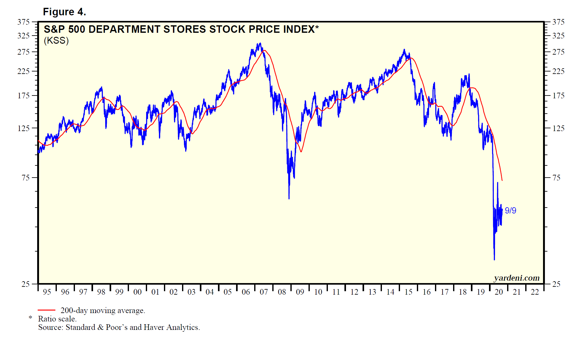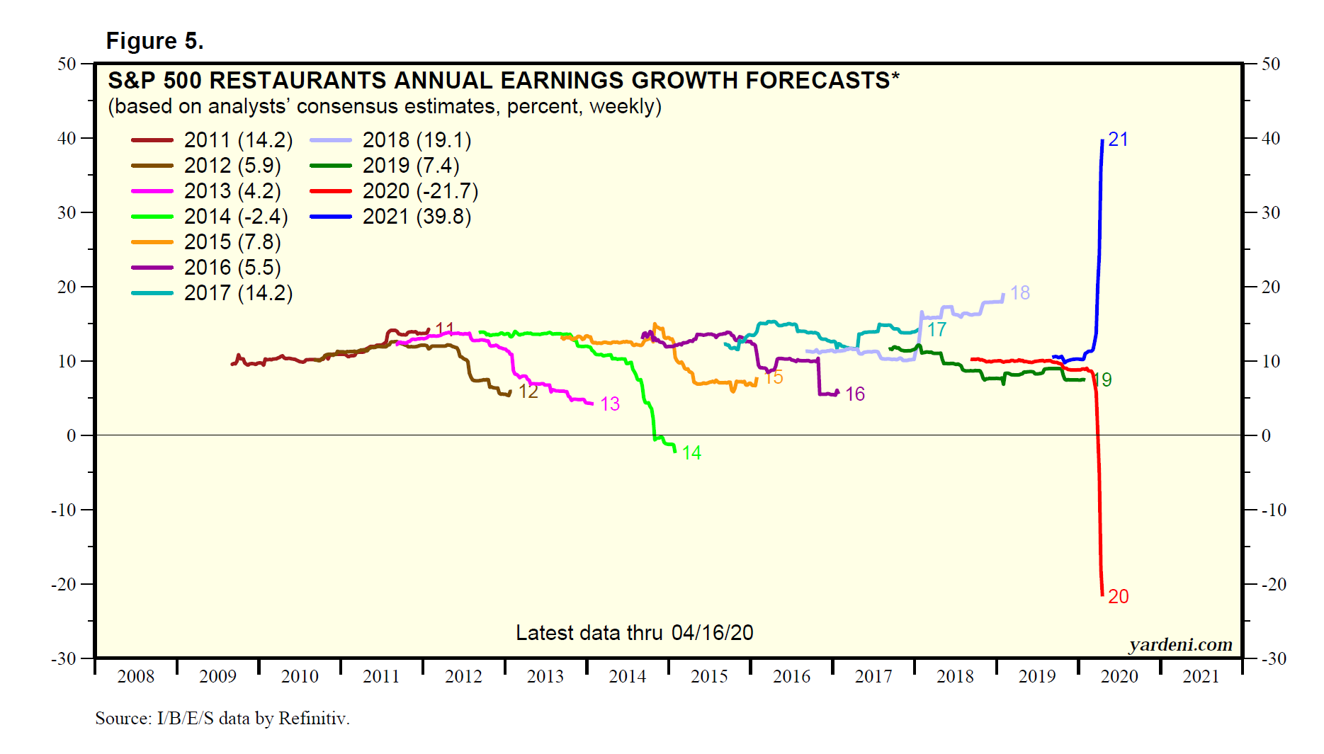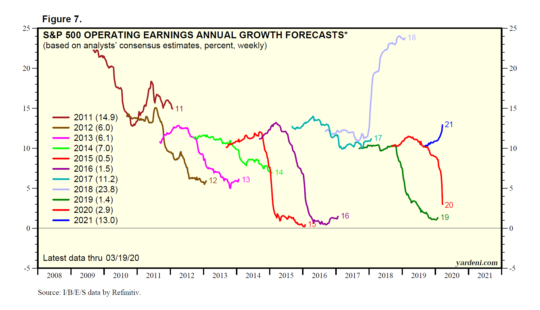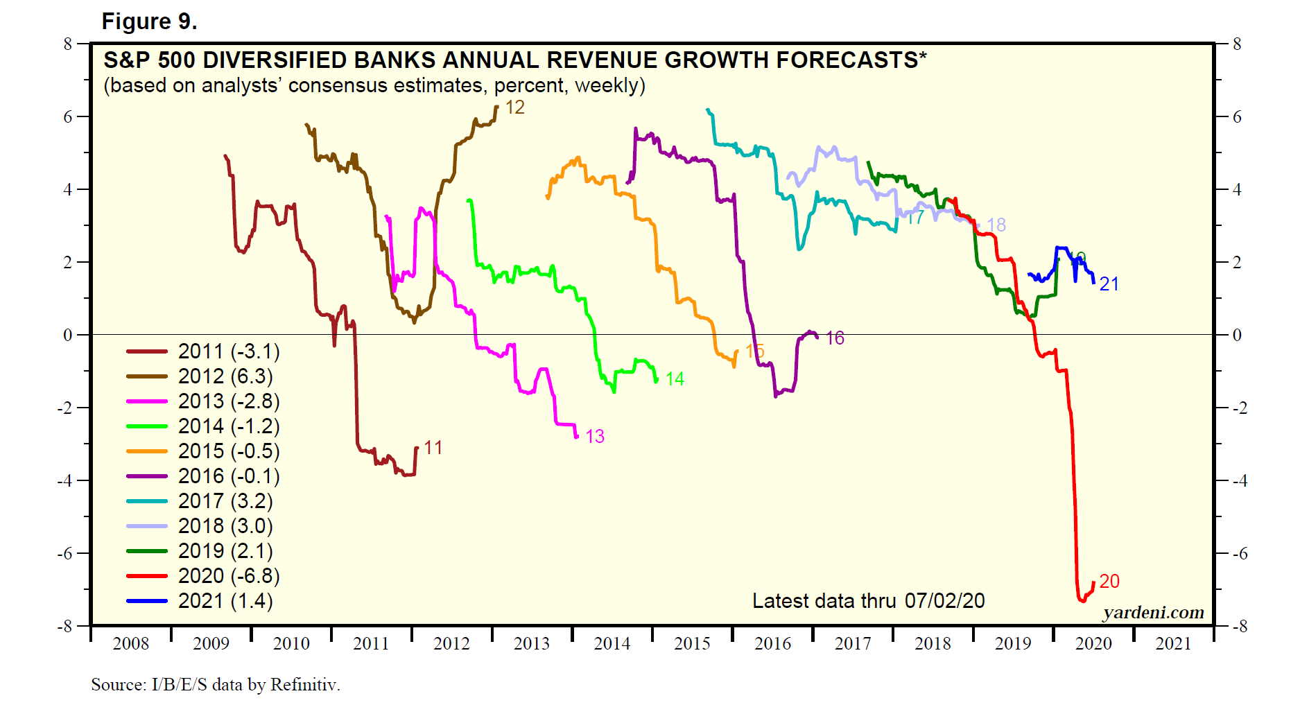 Corporate Finance I: Accounting for Fun & Profits. Yesterday, Joe and I raised our estimates for S&P 500 revenues and earnings per share and profit margins to the following: 2020 ($1,400, $140, 10%), 2021 ($1,545, $170, 11%), and 2022 ($1,625, $195, 12%). As a result, our S&P 500 year-end targets for this year and the next two years are now 3740, 4290, and 4620. (See YRI Earnings Forecasts.)