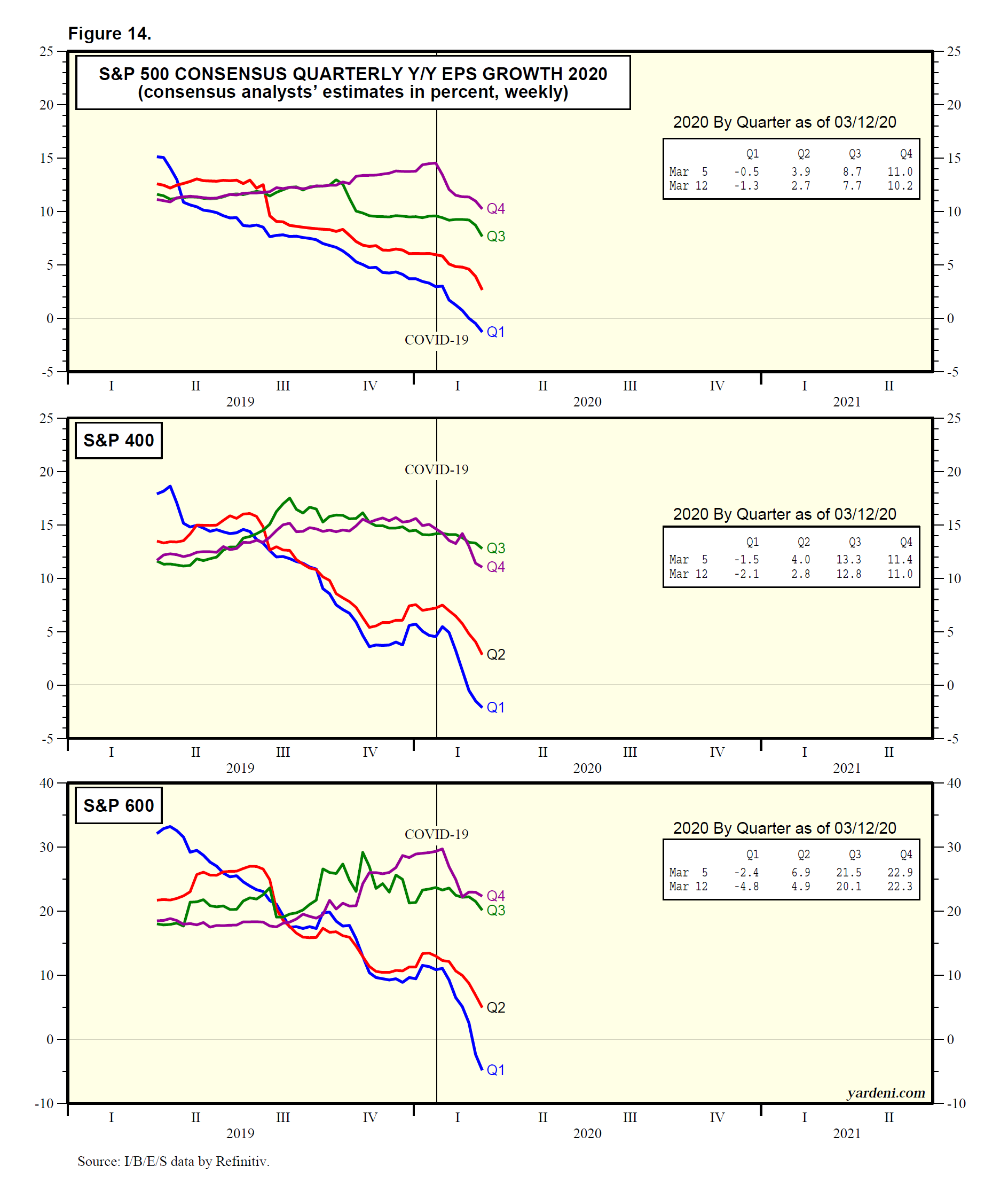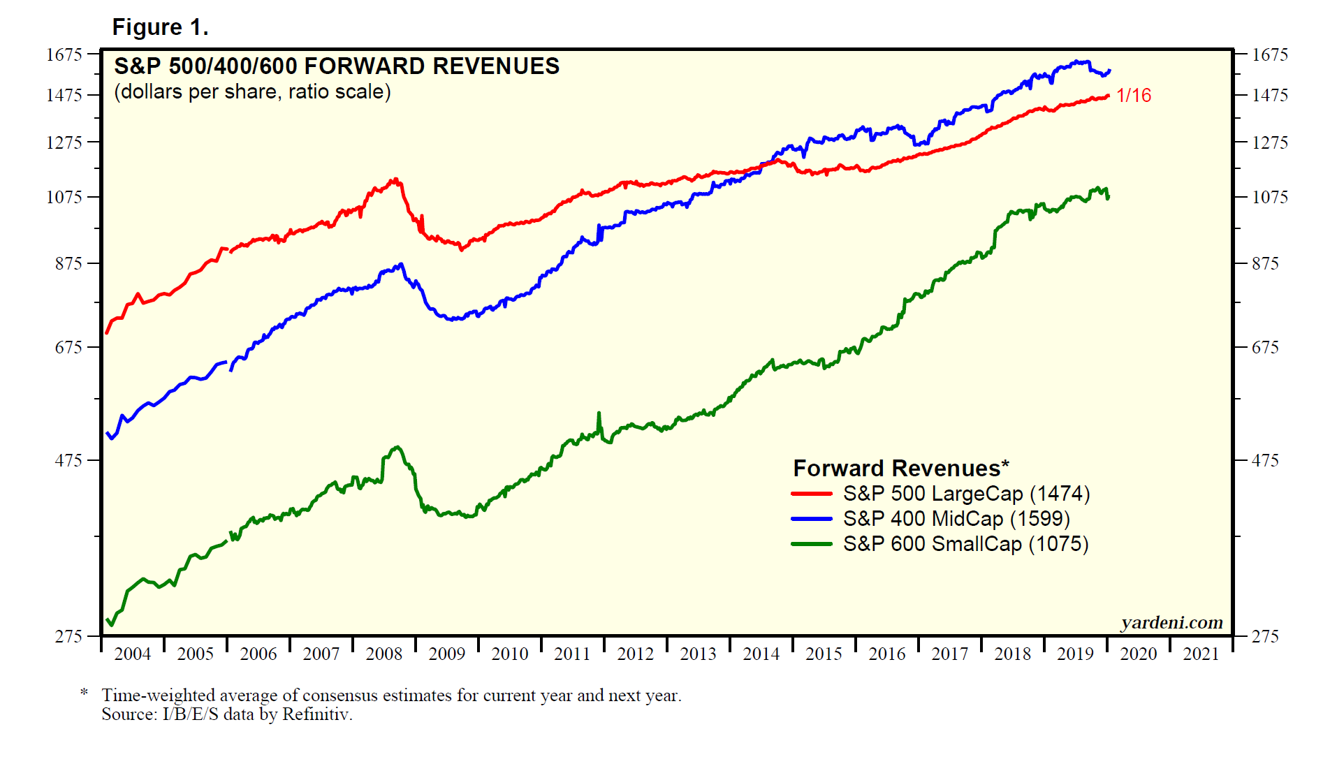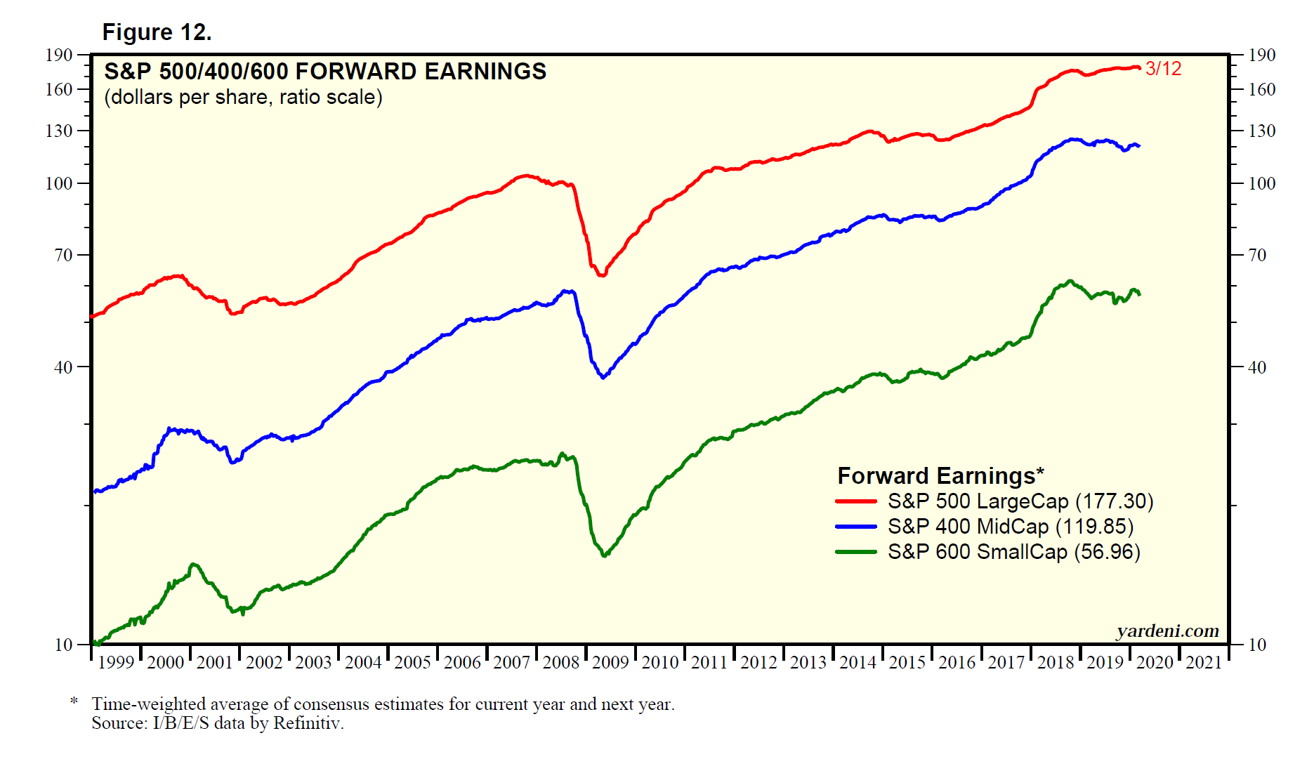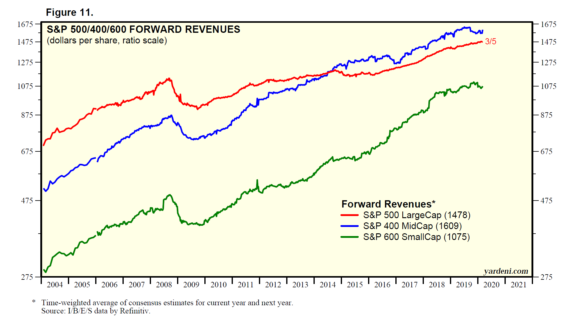 Strategy III: Yearning for Earnings. We would feel much better about the stock market’s prospects if the P/E meltup stopped long enough to let earnings catch up. The problem is that the uptrend in S&P 500 forward earnings, which was visible during the spring and summer of last year, has stalled since last fall. There is even a hint of forward revenues stalling during the last few weeks of 2019 (Fig. 11).