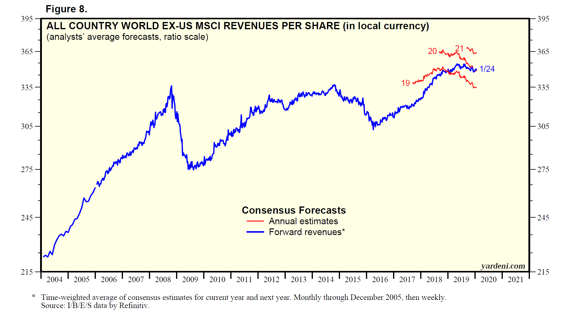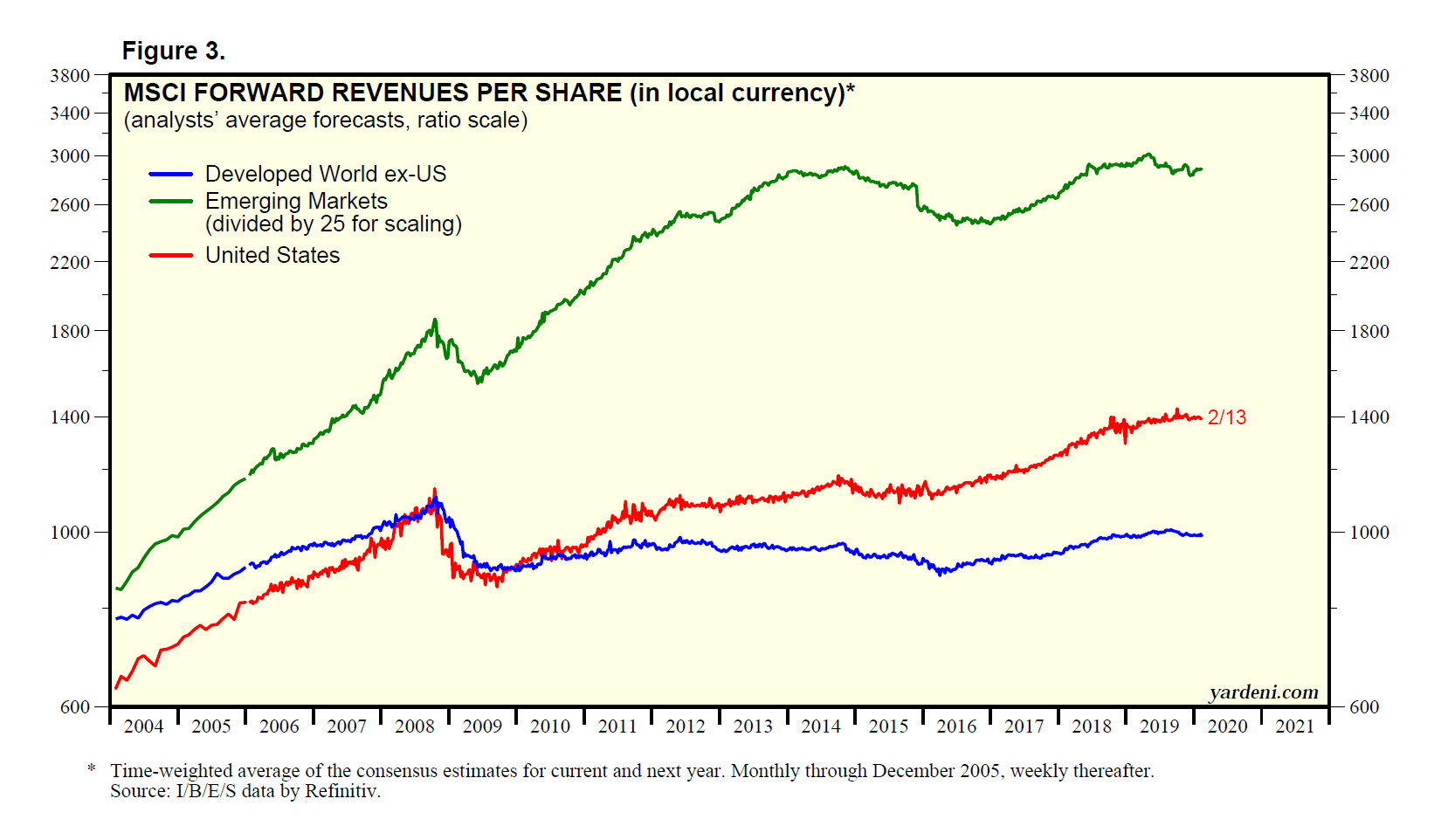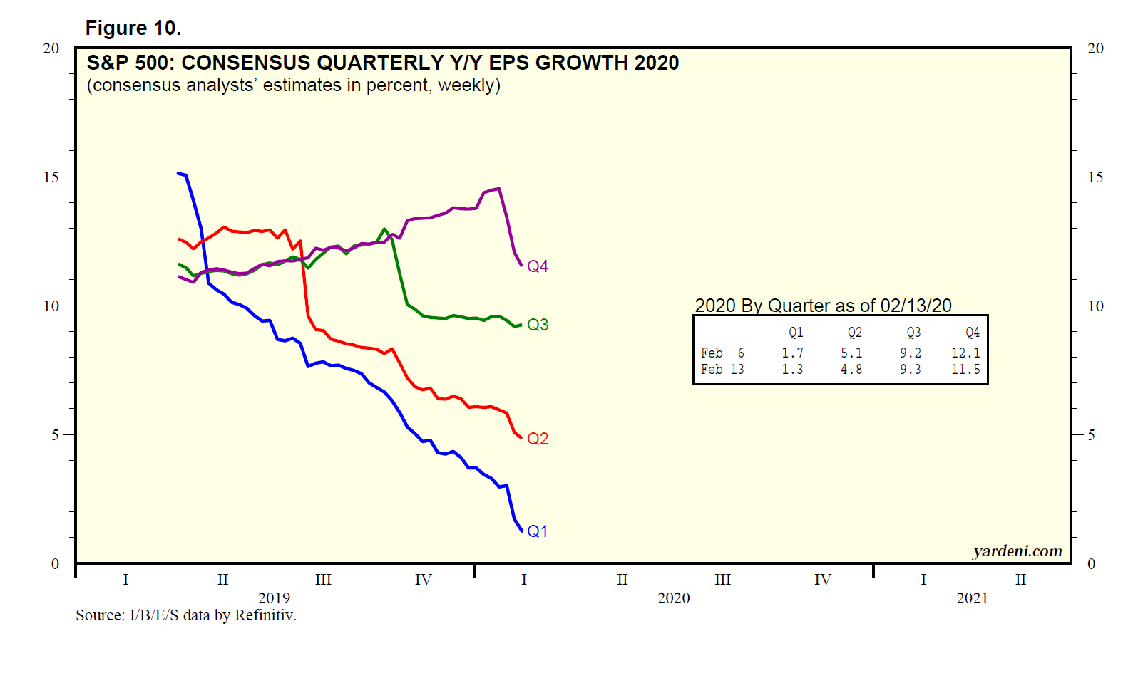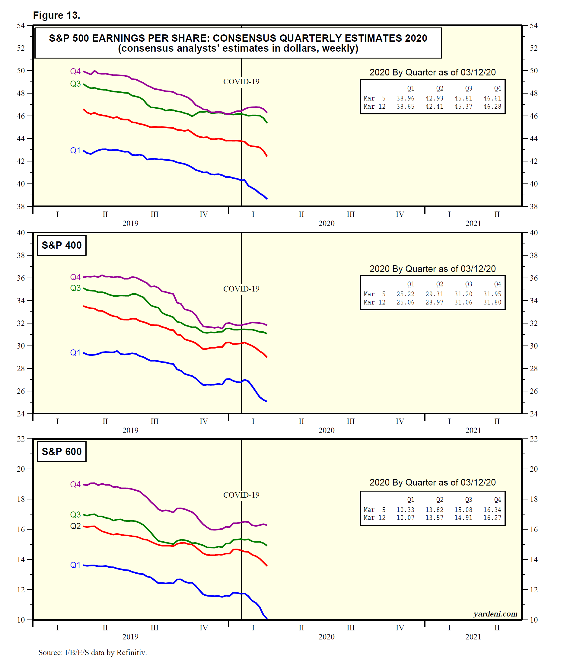 Strategy III: Yearning for Earnings. We would feel much better about the stock market’s prospects if the P/E meltup stopped long enough to let earnings catch up. The problem is that the uptrend in S&P 500 forward earnings, which was visible during the spring and summer of last year, has stalled since last fall. There is even a hint of forward revenues stalling during the last few weeks of 2019 (Fig. 11).