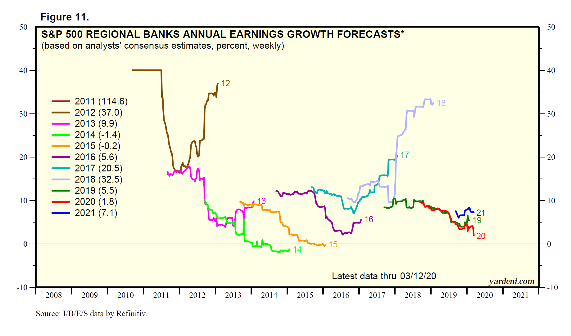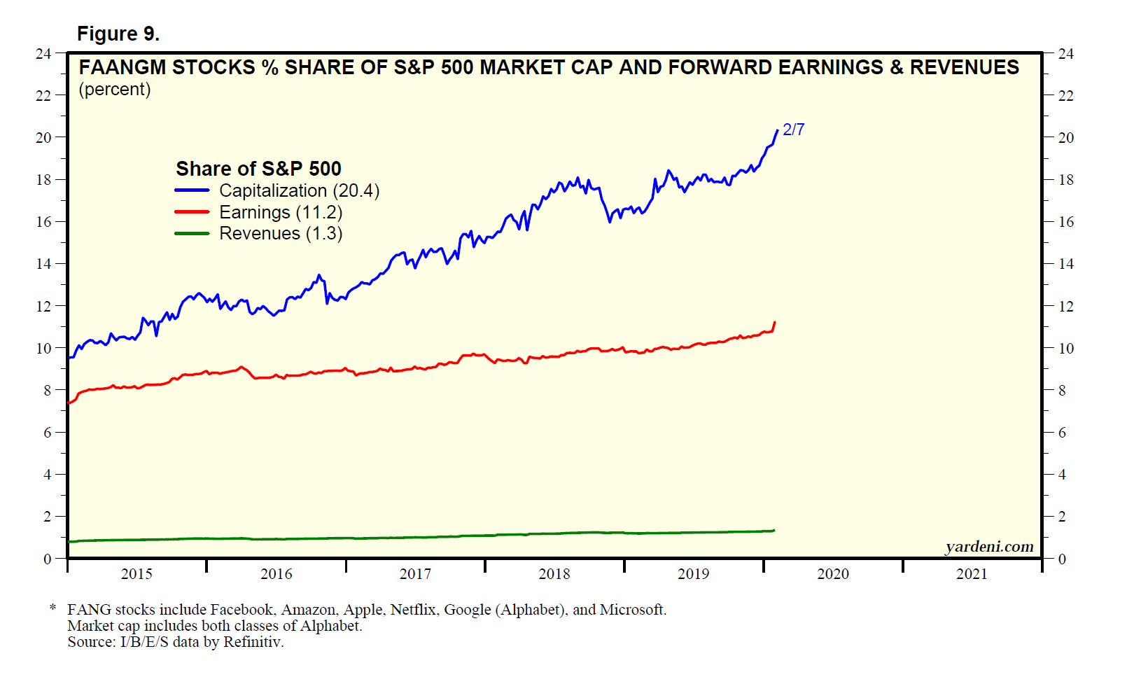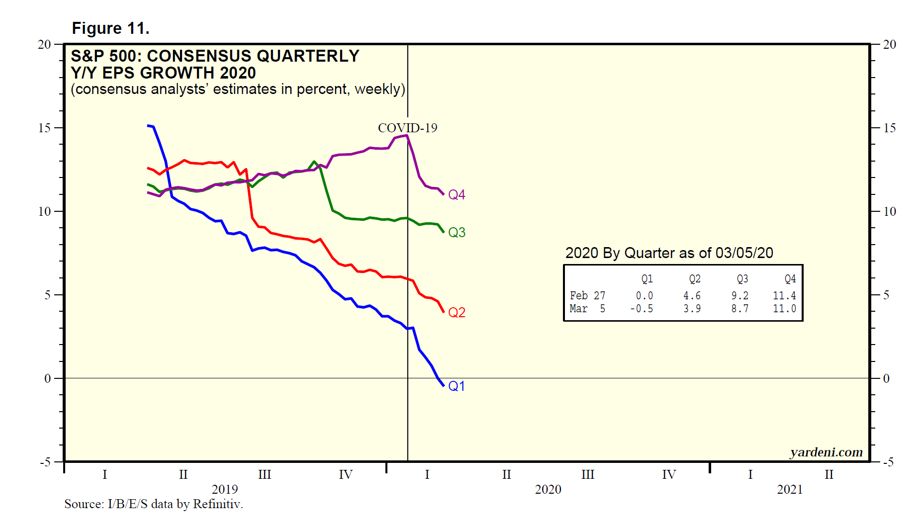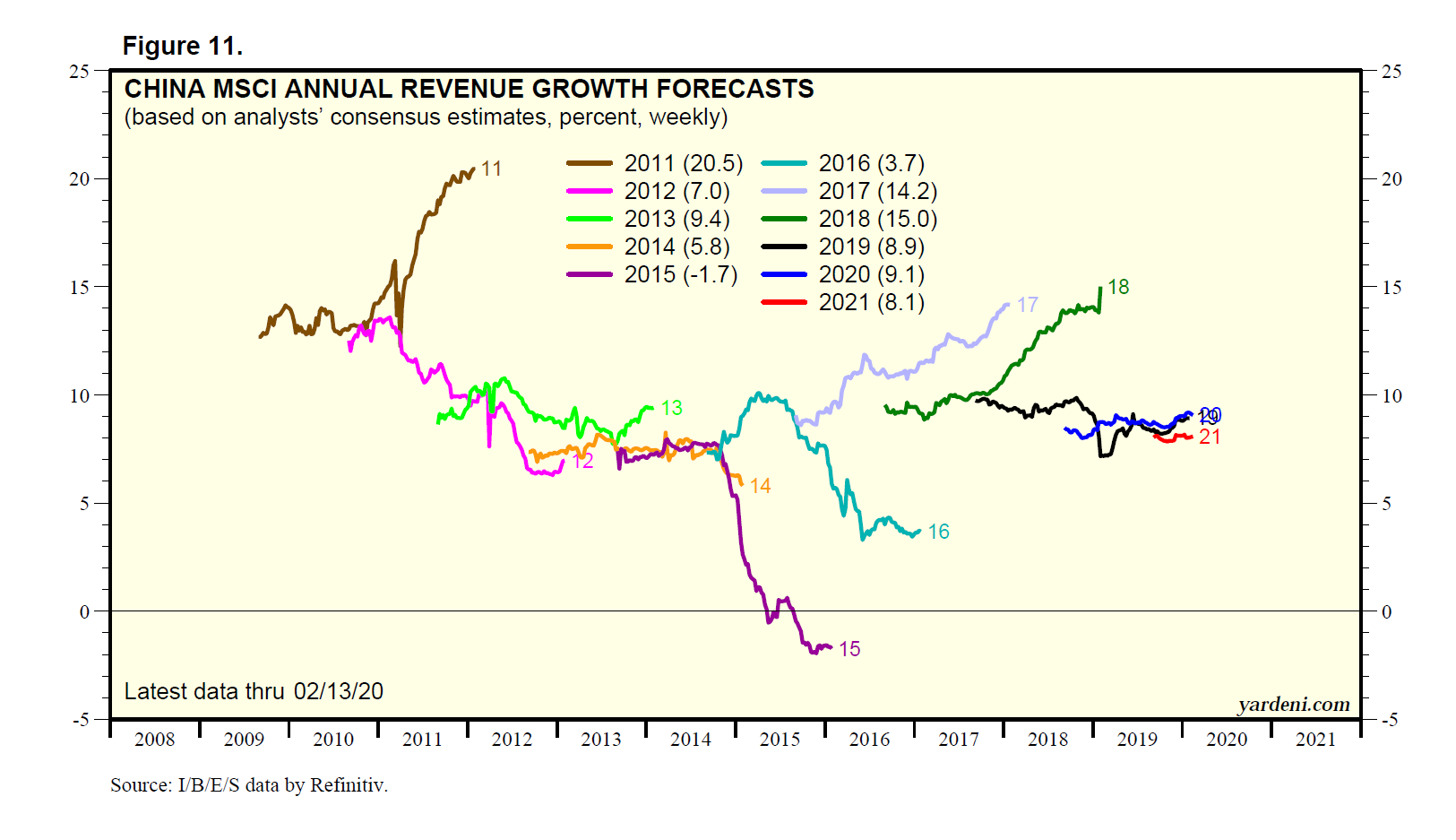 Strategy III: Yearning for Earnings. We would feel much better about the stock market’s prospects if the P/E meltup stopped long enough to let earnings catch up. The problem is that the uptrend in S&P 500 forward earnings, which was visible during the spring and summer of last year, has stalled since last fall. There is even a hint of forward revenues stalling during the last few weeks of 2019 (Fig. 11).