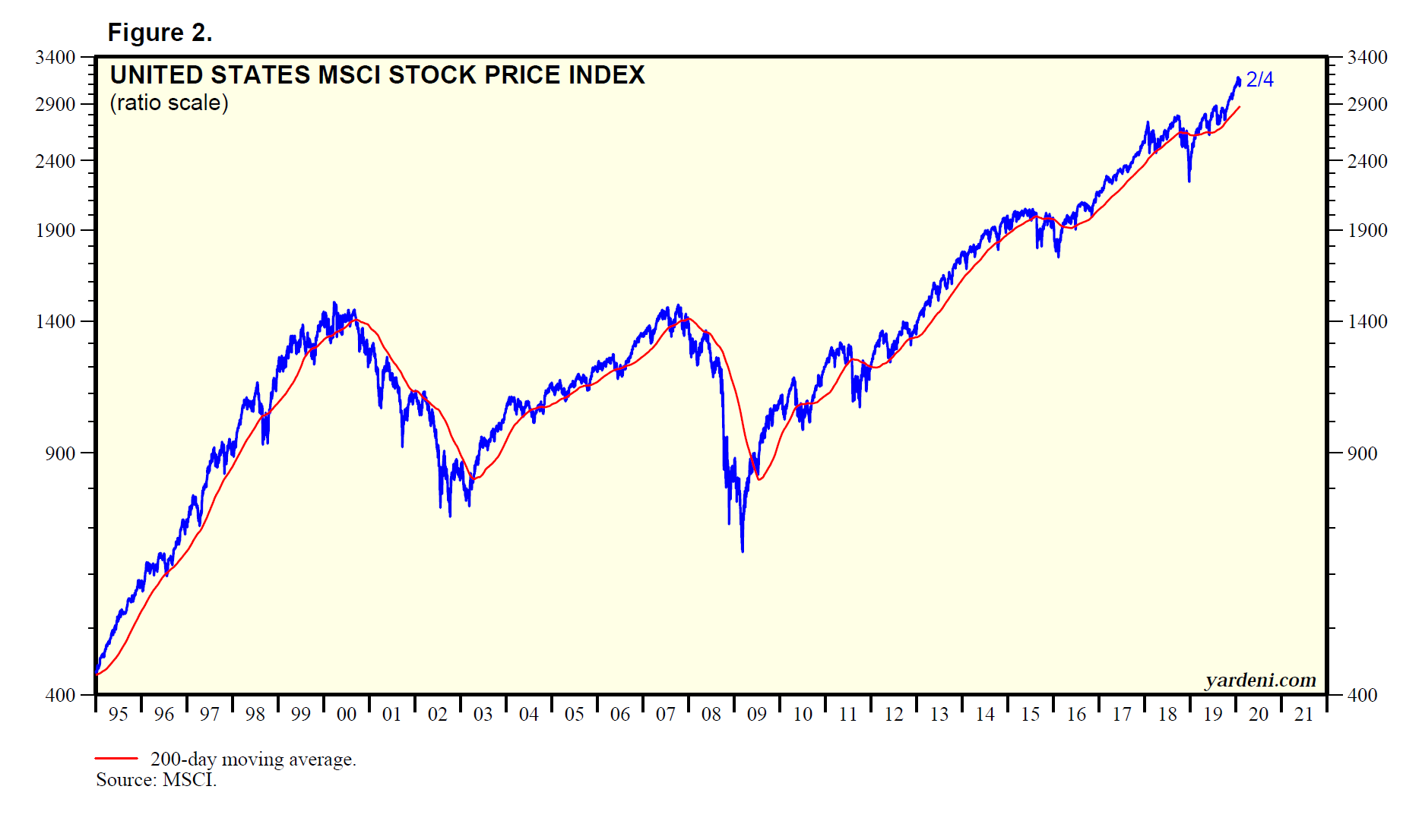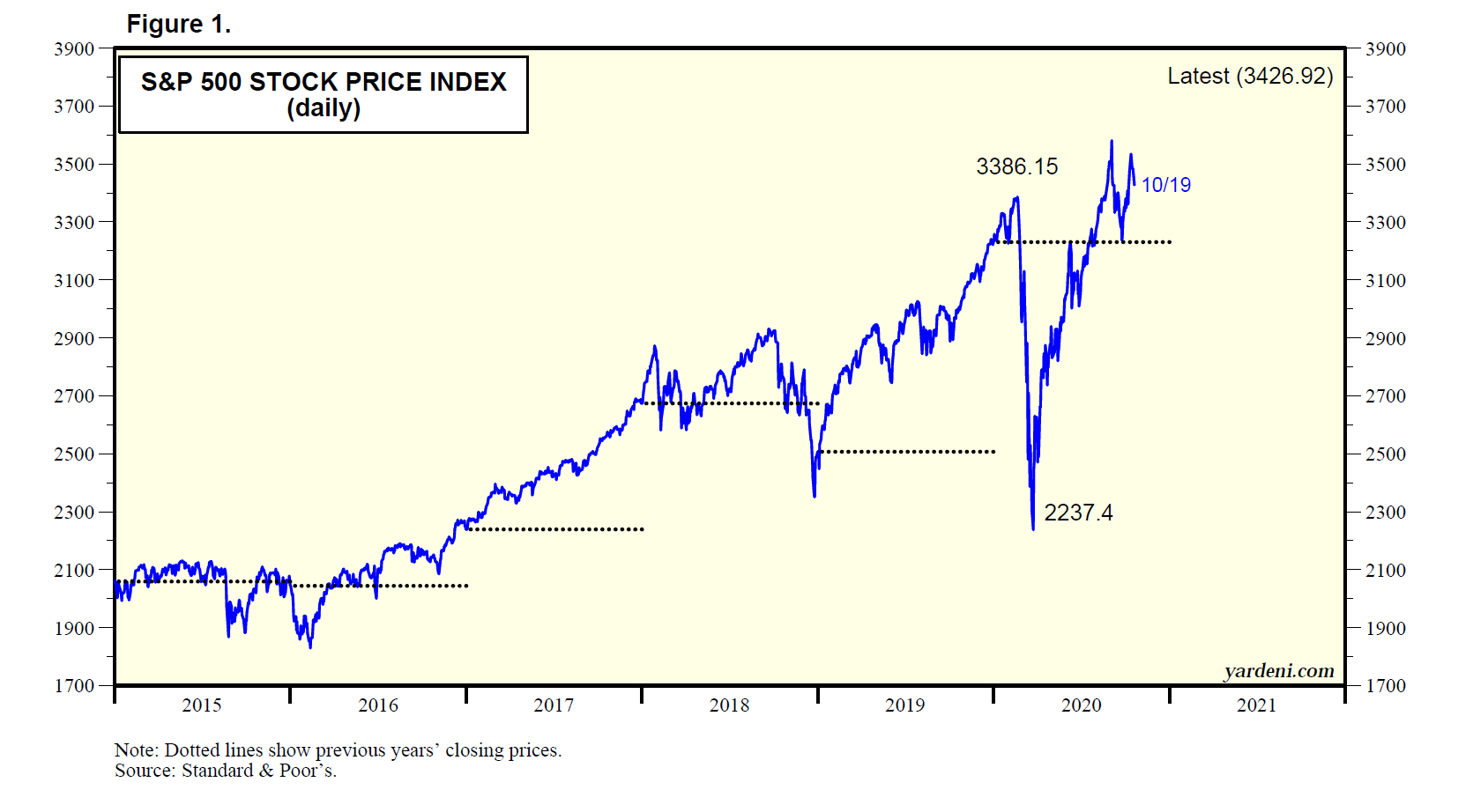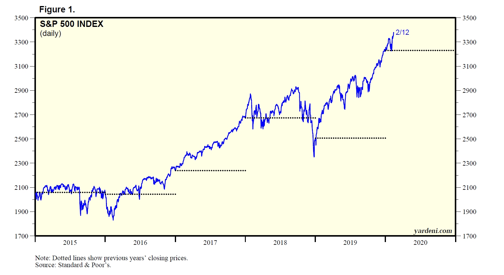 You might recall that Joe and I predicted that the S&P 500 would get to 3100 by the end of 2018 and 3500 by the end of 2019. We got close, with a record high during 2018 of 2930.75 on 9/20. But then the market took a 19.8% dive through 12/24/18. So we pushed out our 3100 target to the end of last year and our 3500 target to the end of this year. The first target arrived ahead of our revised schedule, on 11/15 last year. The second target may occur well ahead of schedule since the S&P 500 needs only to increase by 8.2% to get to 3500.