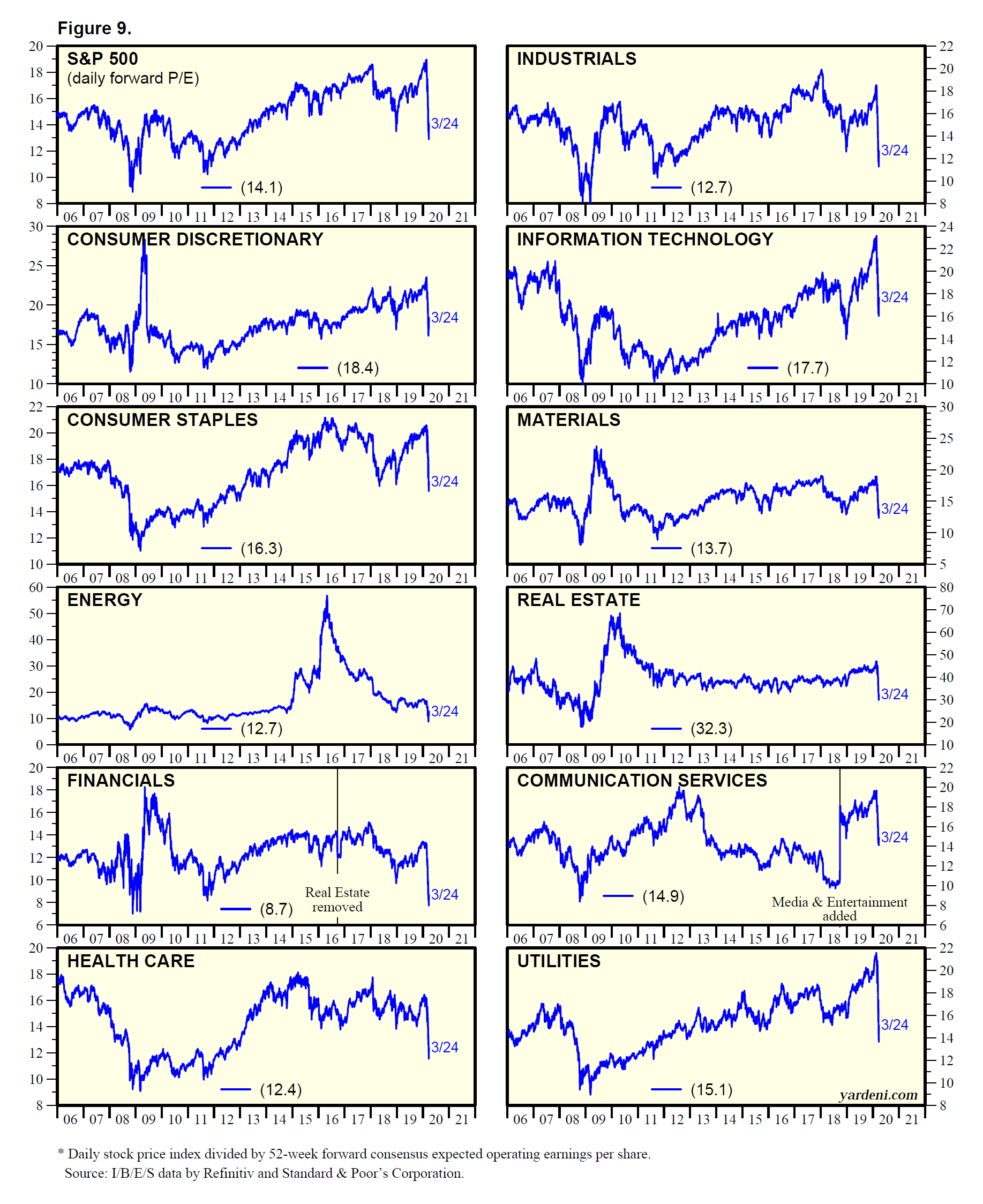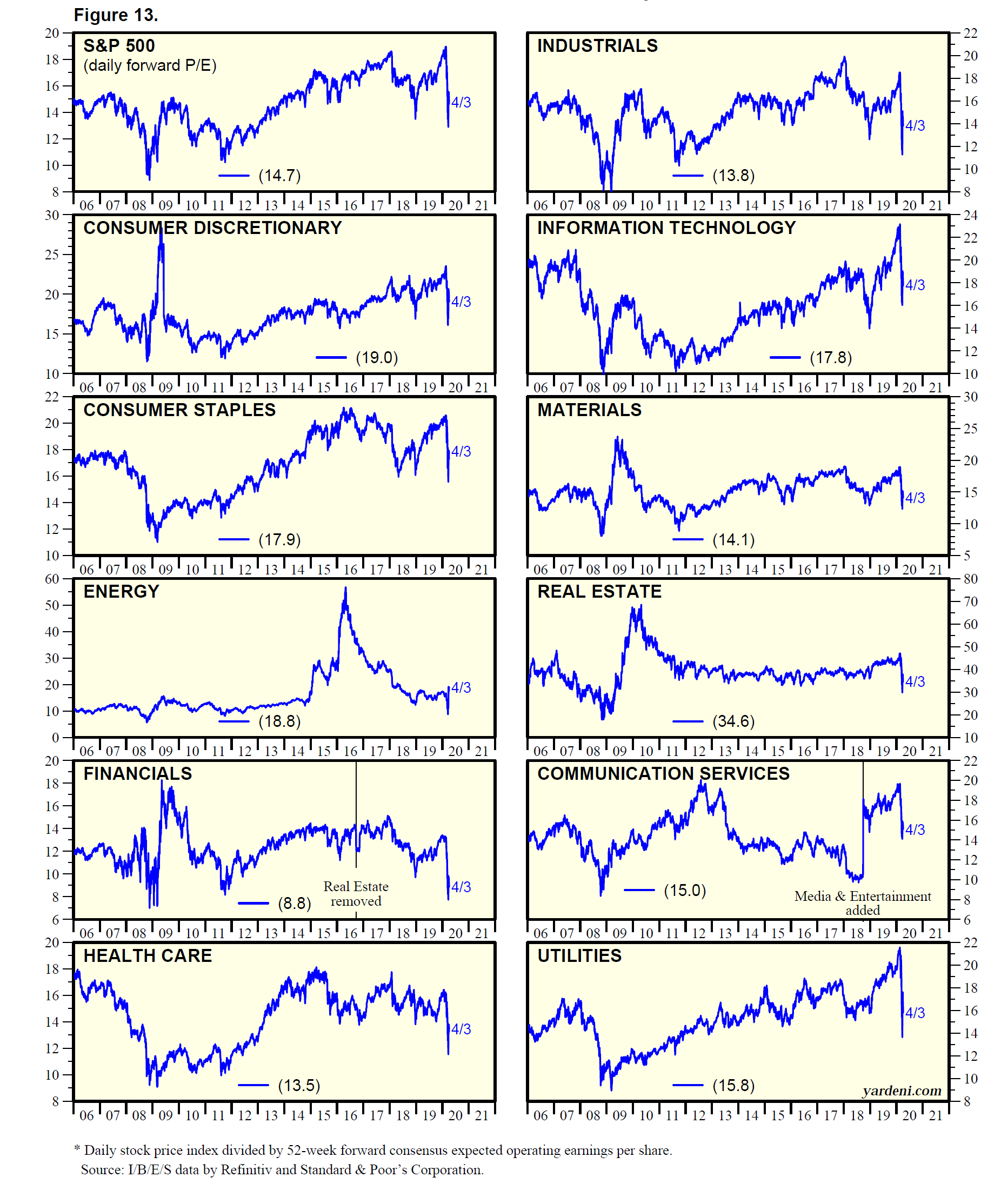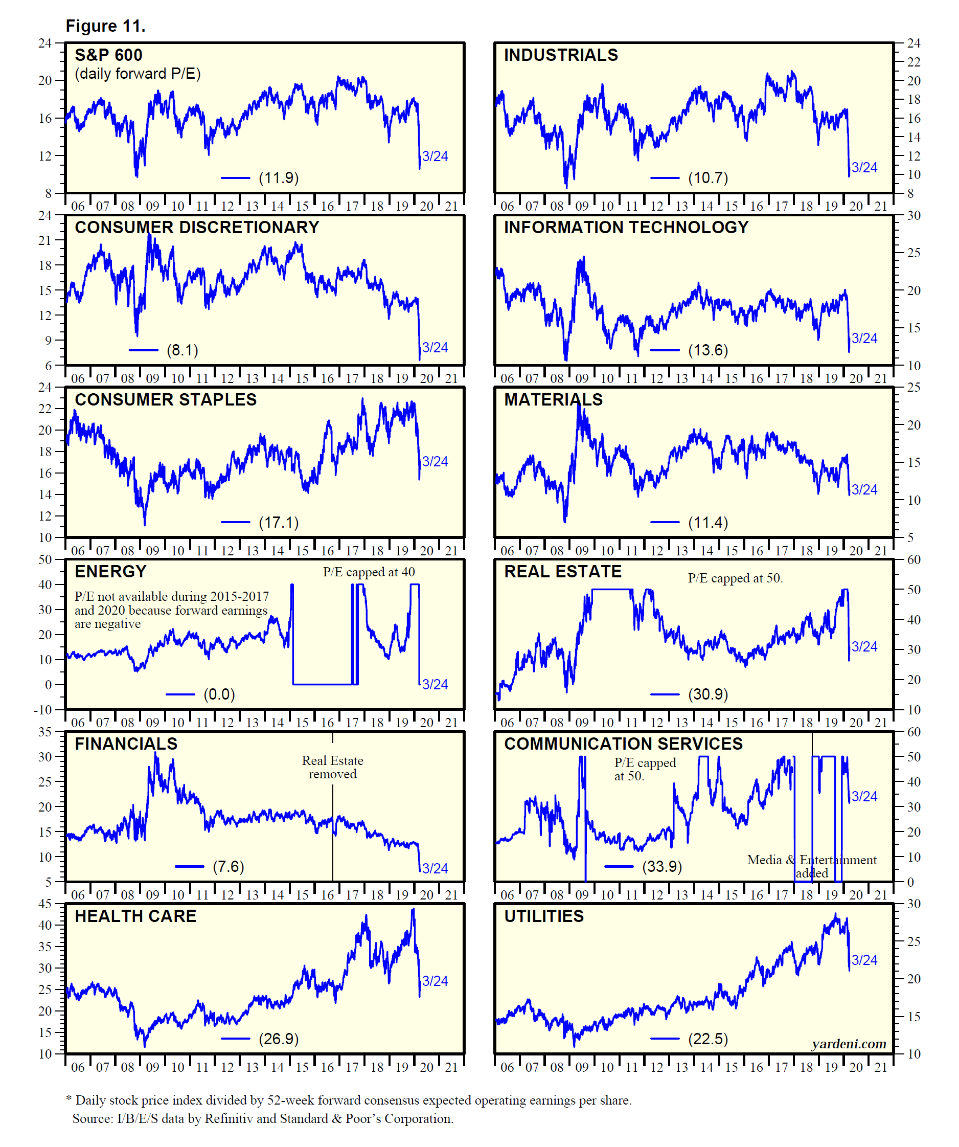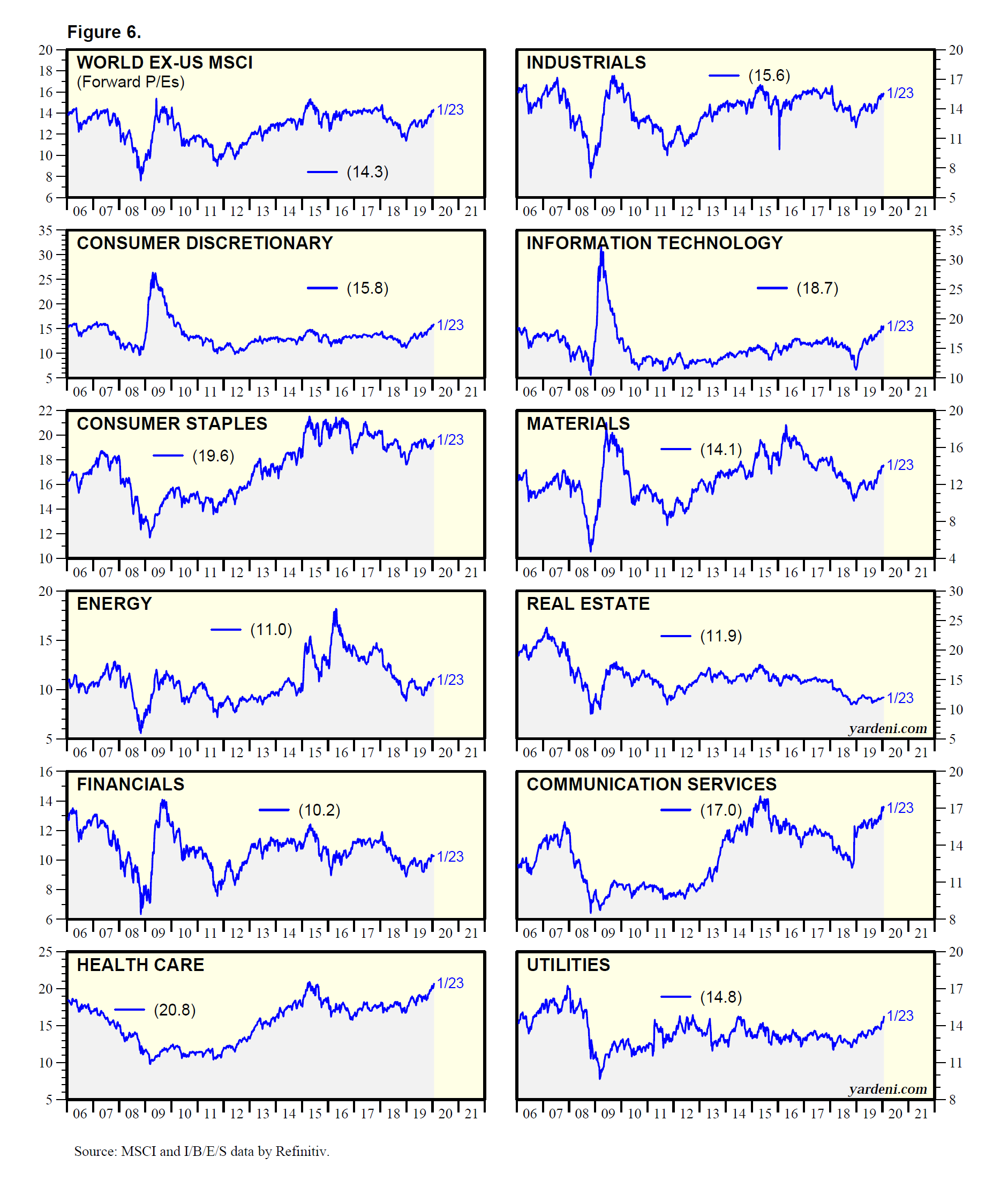 (1) Where we stand. Here’s the performance derby for the S&P 500 sectors’ current and year-ago forward P/E: Real Estate (43.4, 36.1), Consumer Discretionary (22.1, 18.2), Information Technology (21.5, 15.2), Consumer Staples (20.1, 16.6), Utilities (19.9, 15.8), Communication Services (18.6, 15.7), S&P 500 (18.3, 14.5), Materials (18.2, 13.5), Energy (17.1, 13.3), Industrials (16.8, 13.4), Health Care (16.0, 14.5), and Financials (13.3, 10.4) (Table 1).