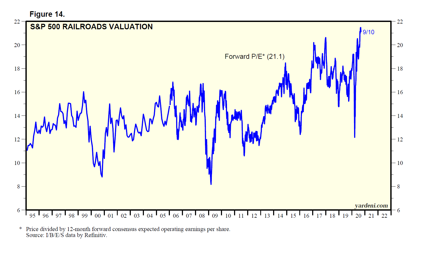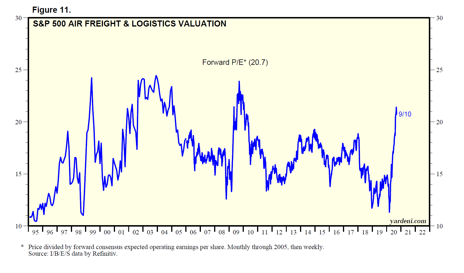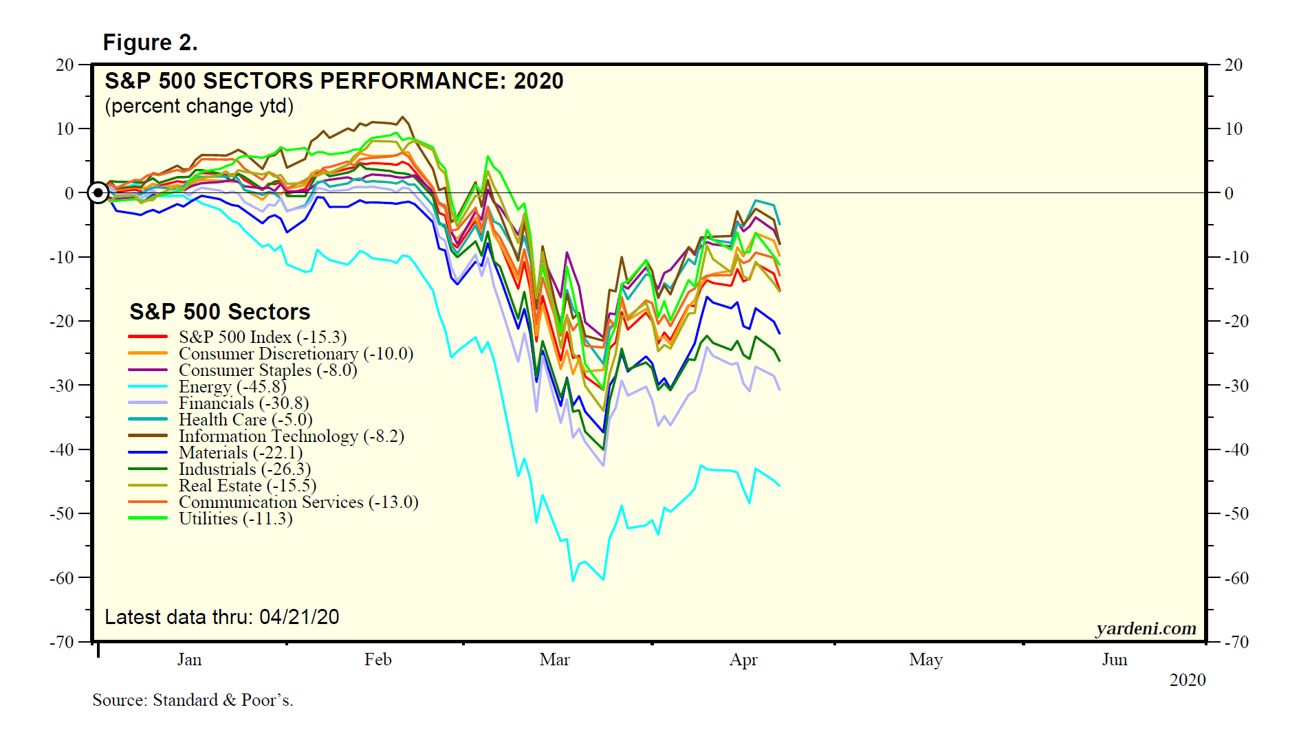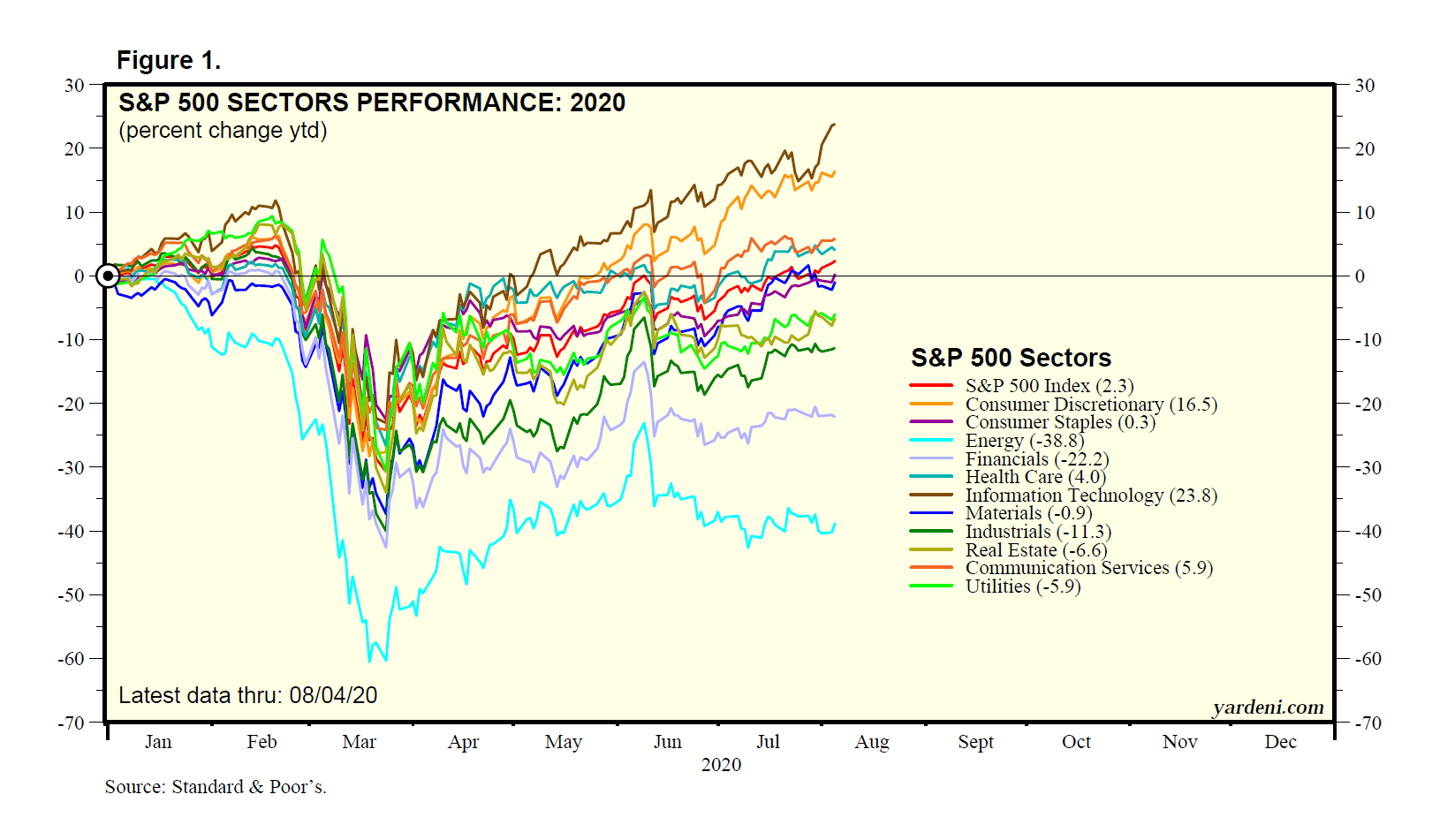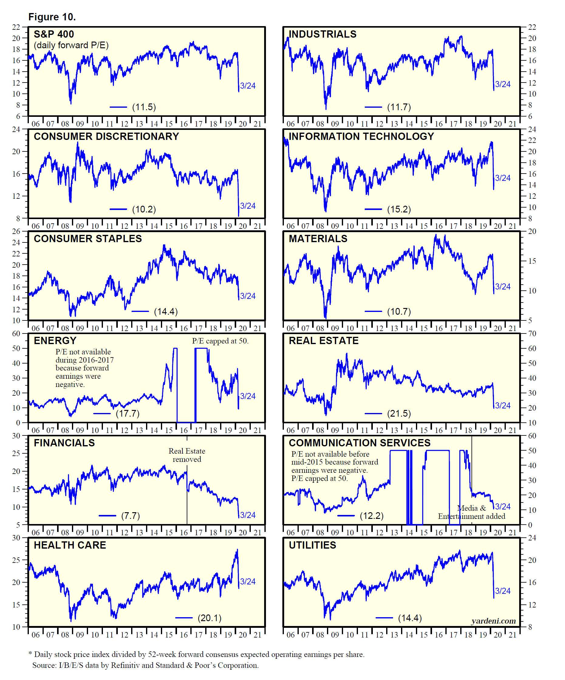 (1) Where we stand. Here’s the performance derby for the S&P 500 sectors’ current and year-ago forward P/E: Real Estate (43.4, 36.1), Consumer Discretionary (22.1, 18.2), Information Technology (21.5, 15.2), Consumer Staples (20.1, 16.6), Utilities (19.9, 15.8), Communication Services (18.6, 15.7), S&P 500 (18.3, 14.5), Materials (18.2, 13.5), Energy (17.1, 13.3), Industrials (16.8, 13.4), Health Care (16.0, 14.5), and Financials (13.3, 10.4) (Table 1).