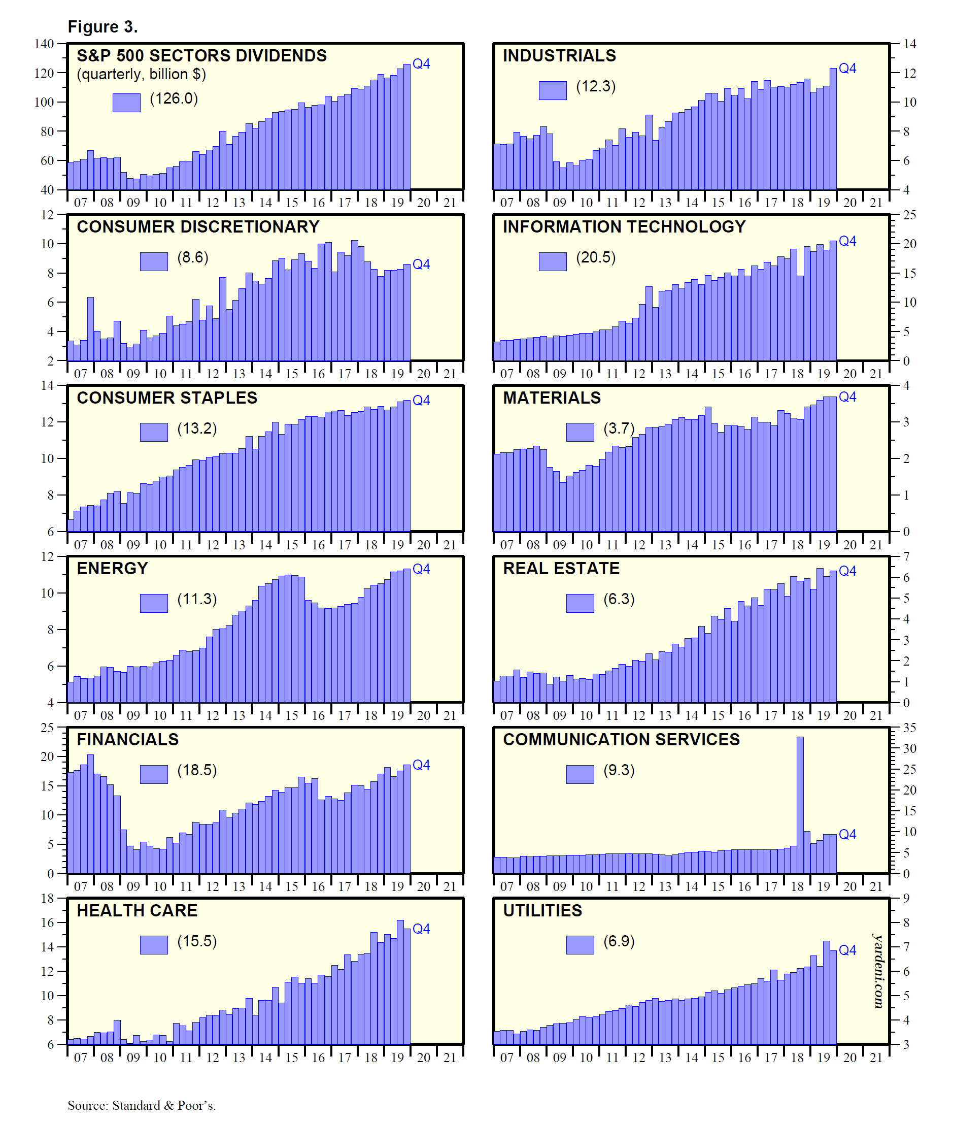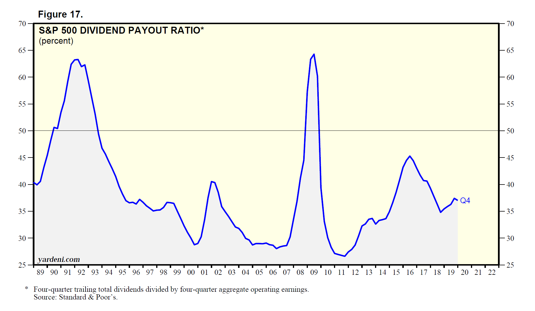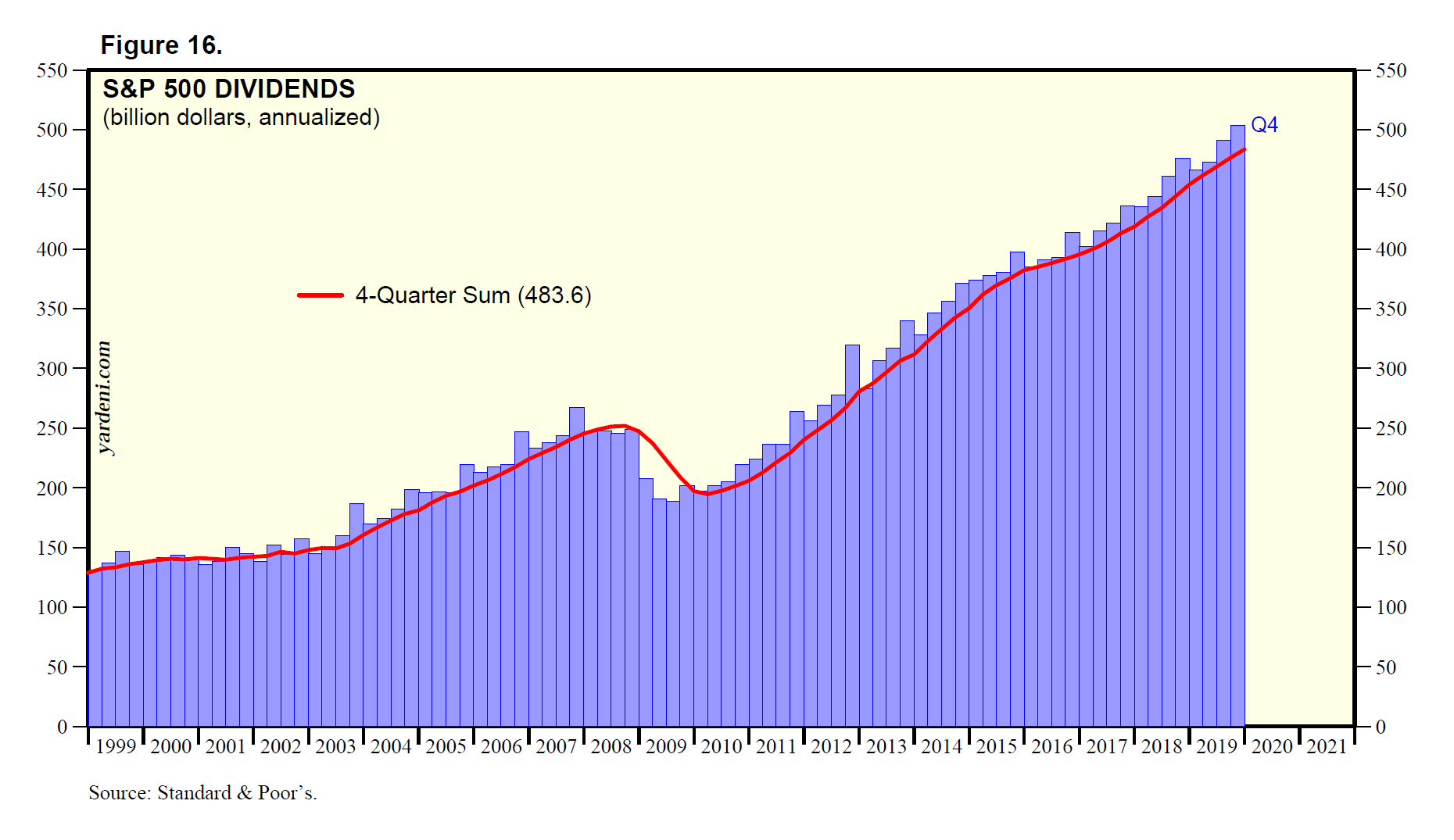 There was a growth recession in earnings last year partly because comparisons were tough following the boost to earnings during 2018 by Trump’s corporate tax cut. A cheerier perspective is provided by S&P 500 aggregate dividends, which rose 5.8% y/y to a record high of $504 billion at an annualized rate during Q4-2019 (Fig. 12). There’s no sign of a growth recession in S&P 500 dividends. Here are some more thoughts on dividends: