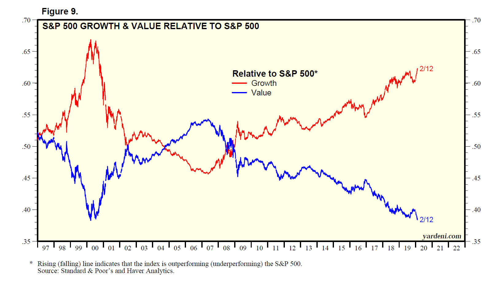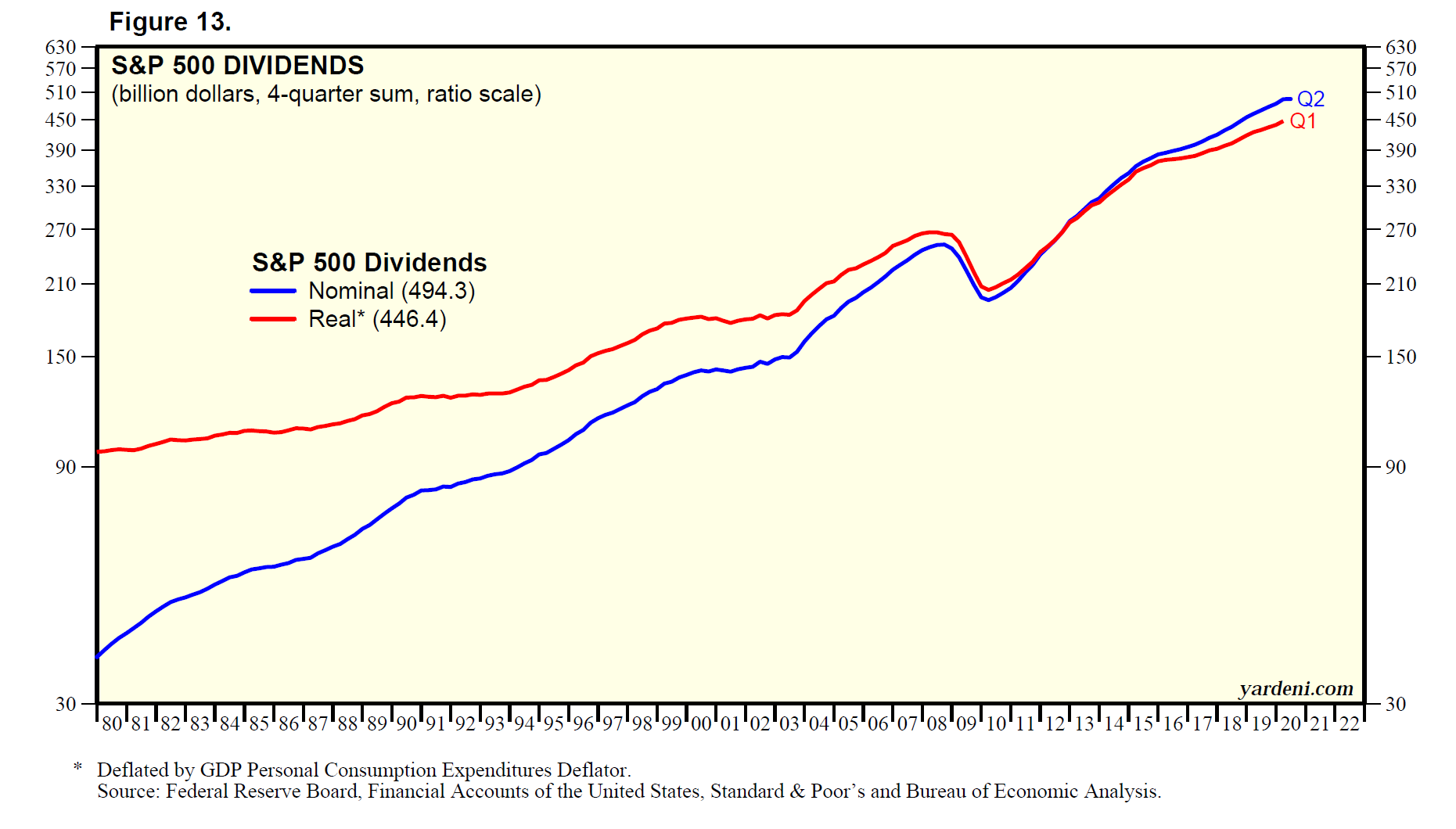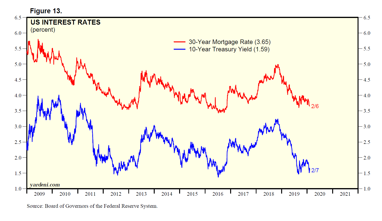 There was a growth recession in earnings last year partly because comparisons were tough following the boost to earnings during 2018 by Trump’s corporate tax cut. A cheerier perspective is provided by S&P 500 aggregate dividends, which rose 5.8% y/y to a record high of $504 billion at an annualized rate during Q4-2019 (Fig. 12). There’s no sign of a growth recession in S&P 500 dividends. Here are some more thoughts on dividends:
