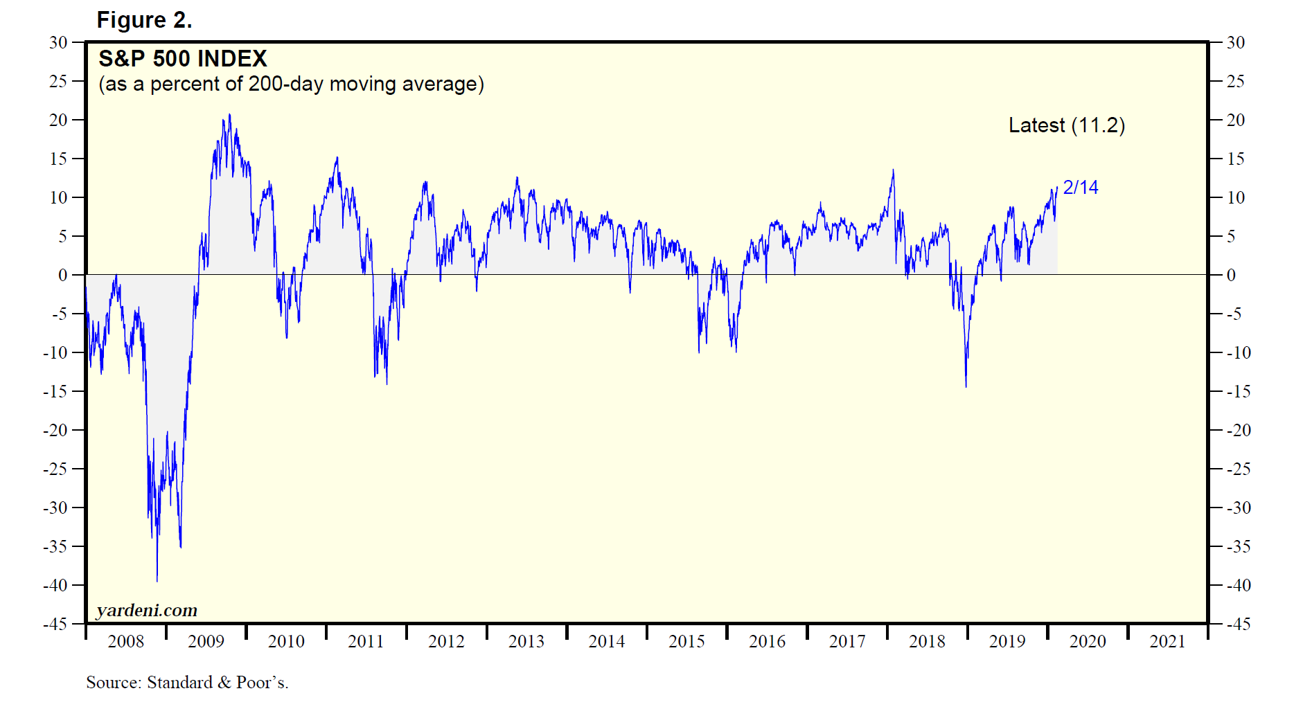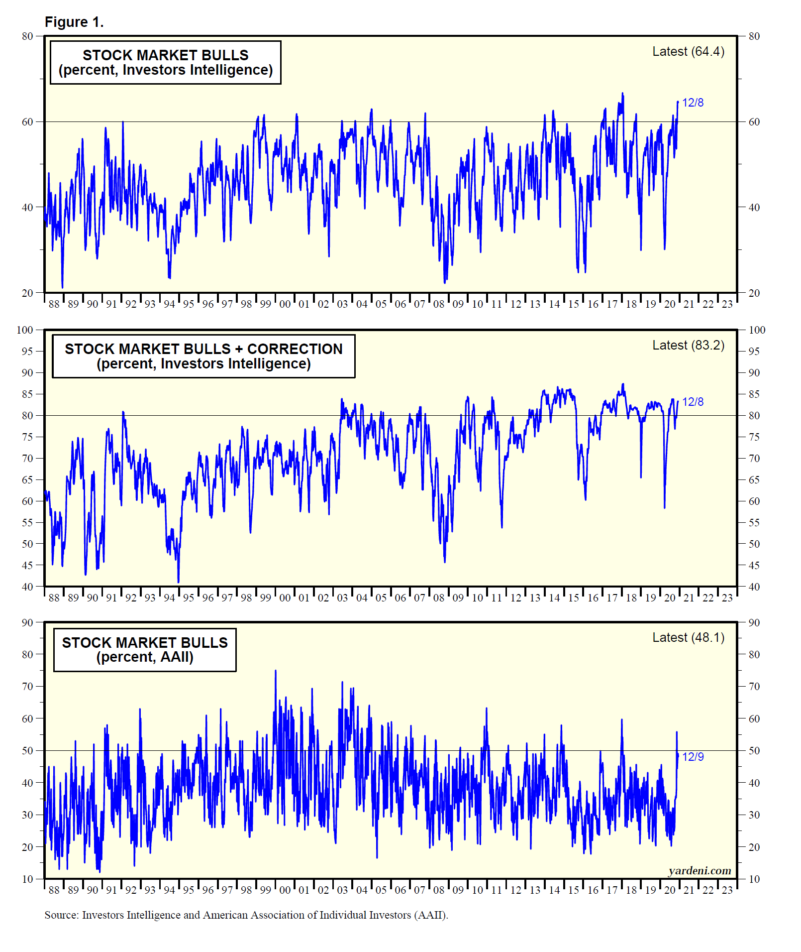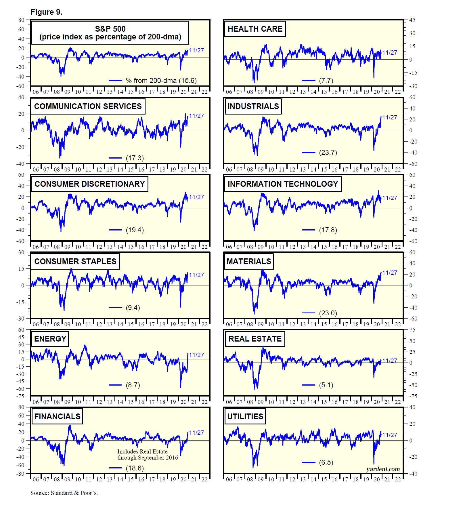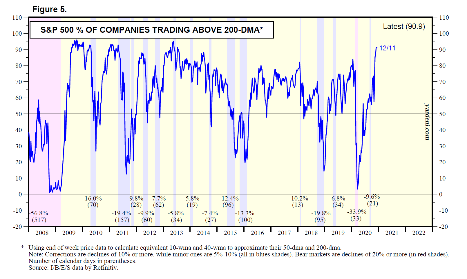 One sign of excessive exuberance is that the S&P 500 was 15.3% above its 200-day moving average at Friday’s close, among the highest readings of the bull market since 2009 (Fig. 4). In addition, the percentage of S&P 500 companies trading above their 200-dmas on December 11 was 90.9%, down slightly from the prior week’s 91.3%, which was the highest since July 12, 2013 (Fig. 5).