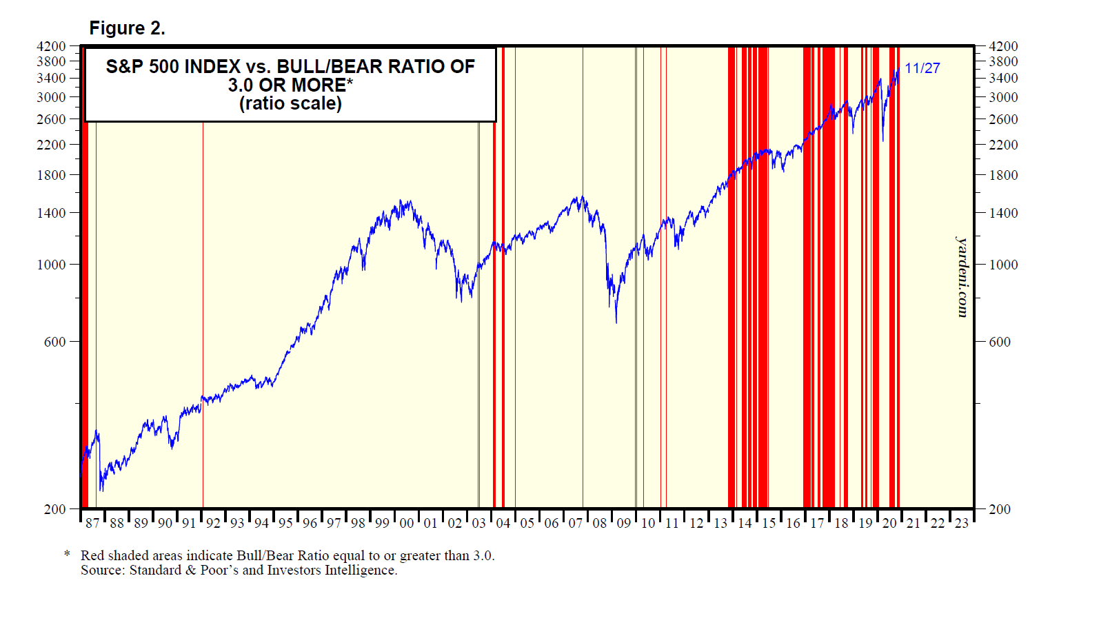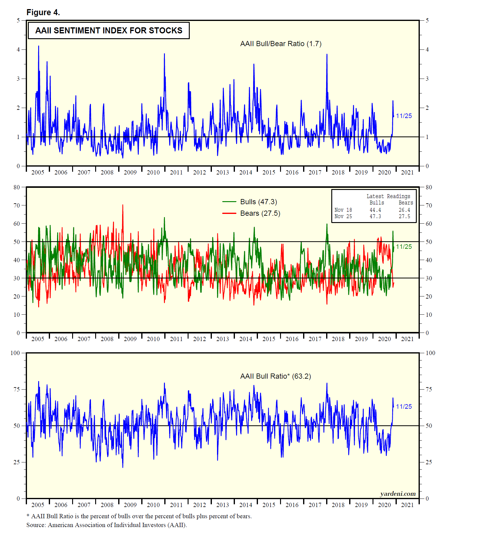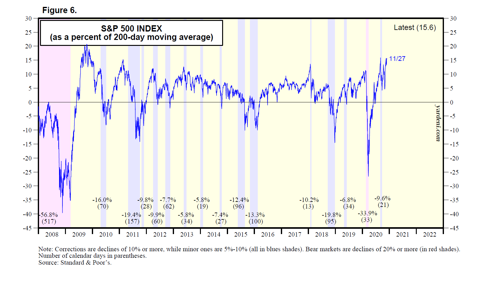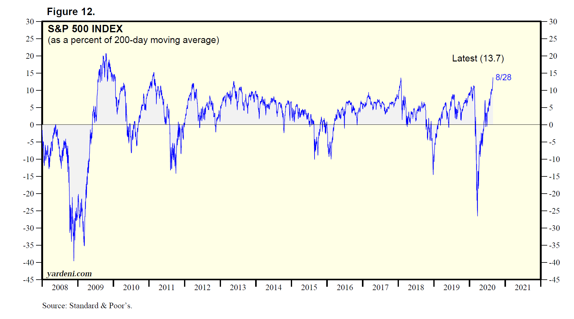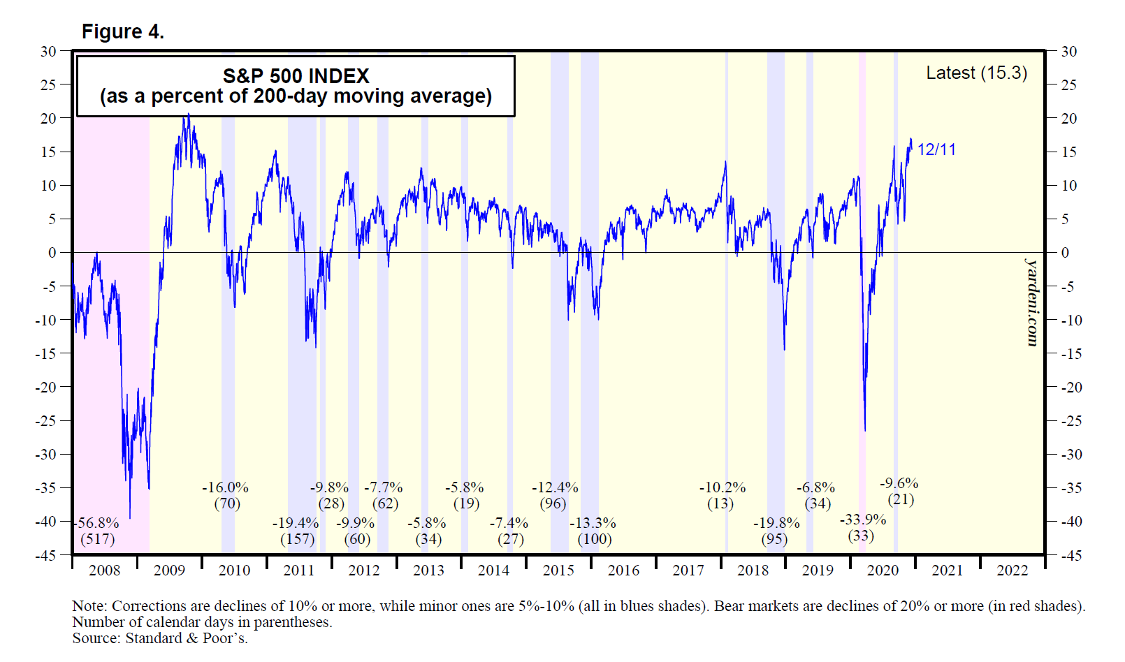 One sign of excessive exuberance is that the S&P 500 was 15.3% above its 200-day moving average at Friday’s close, among the highest readings of the bull market since 2009 (Fig. 4). In addition, the percentage of S&P 500 companies trading above their 200-dmas on December 11 was 90.9%, down slightly from the prior week’s 91.3%, which was the highest since July 12, 2013 (Fig. 5).