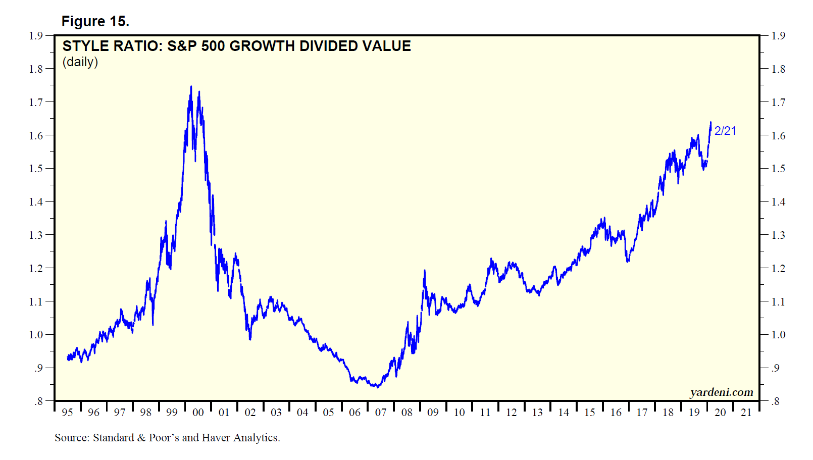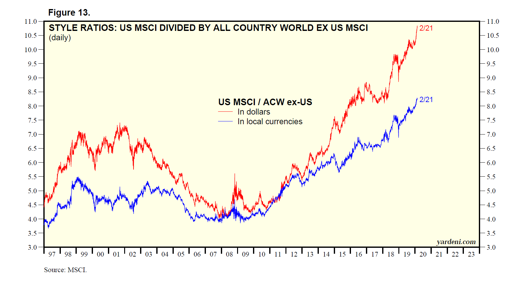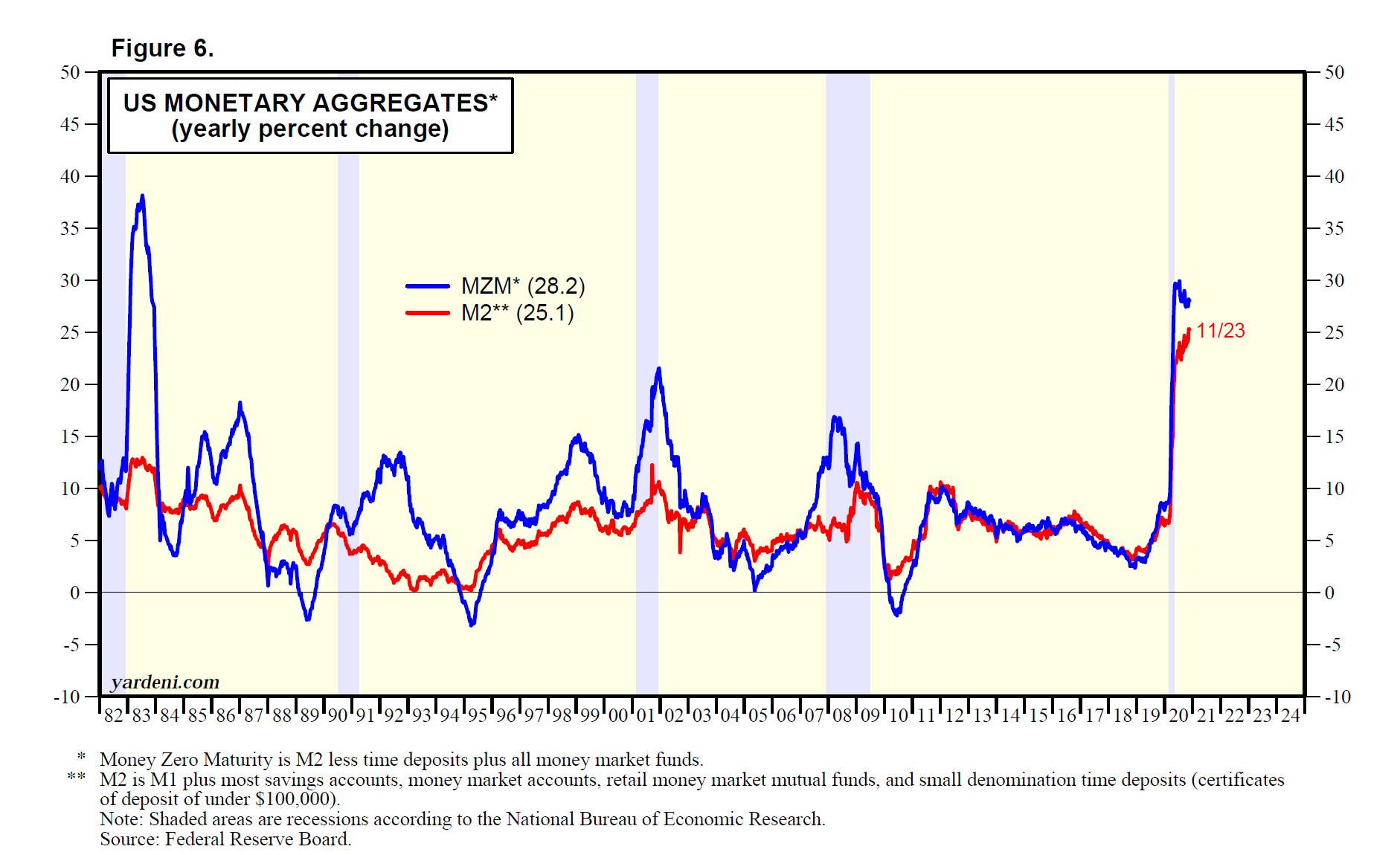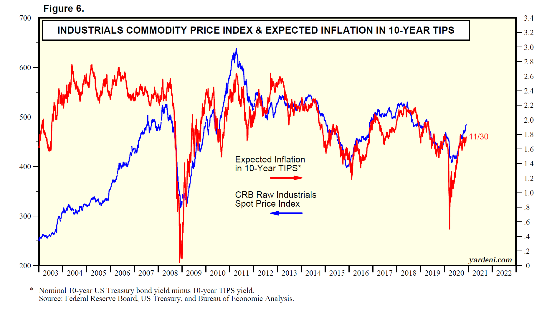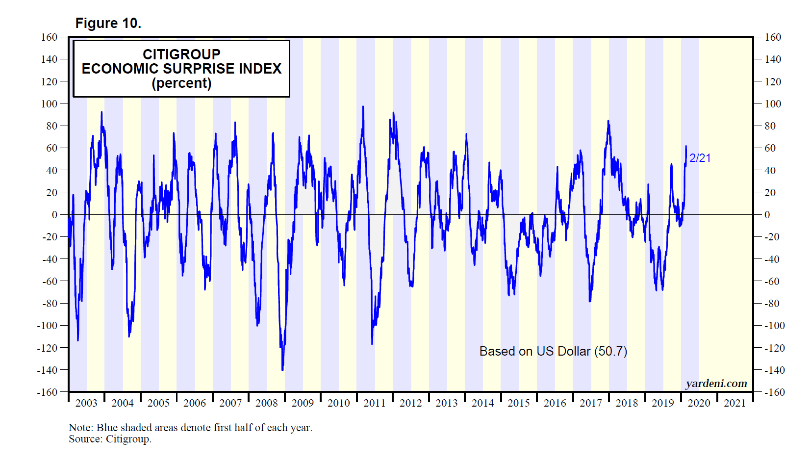 The meltup in the price of Tesla shares and the prices of recent IPOs is yet another sign of irrational exuberance. Furthermore, with all due respect to Bitcoin’s fans, we view it and other cryptocurrencies as “digital tulips.” We have no way to value them. We prefer assets with earnings, dividends, coupons, and rents—i.e., an income stream we can value. Nevertheless, we do watch Bitcoin’s price action as a gauge of speculative excesses, which are back at record highs according to this gauge (Fig. 6).
