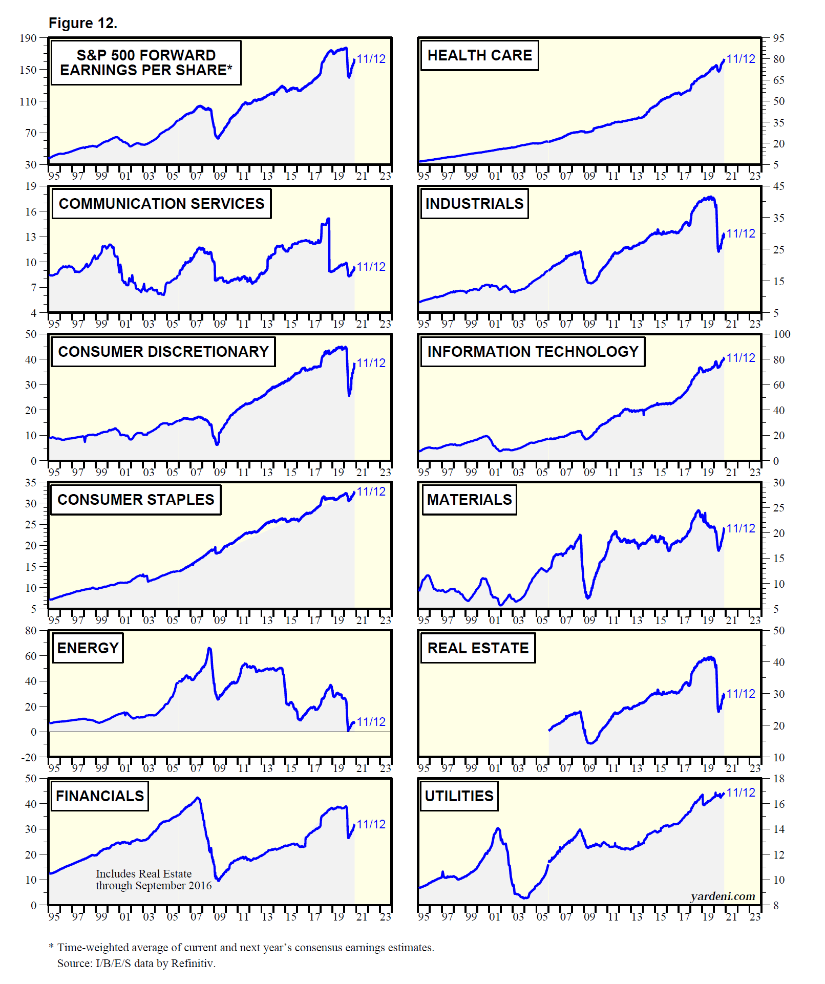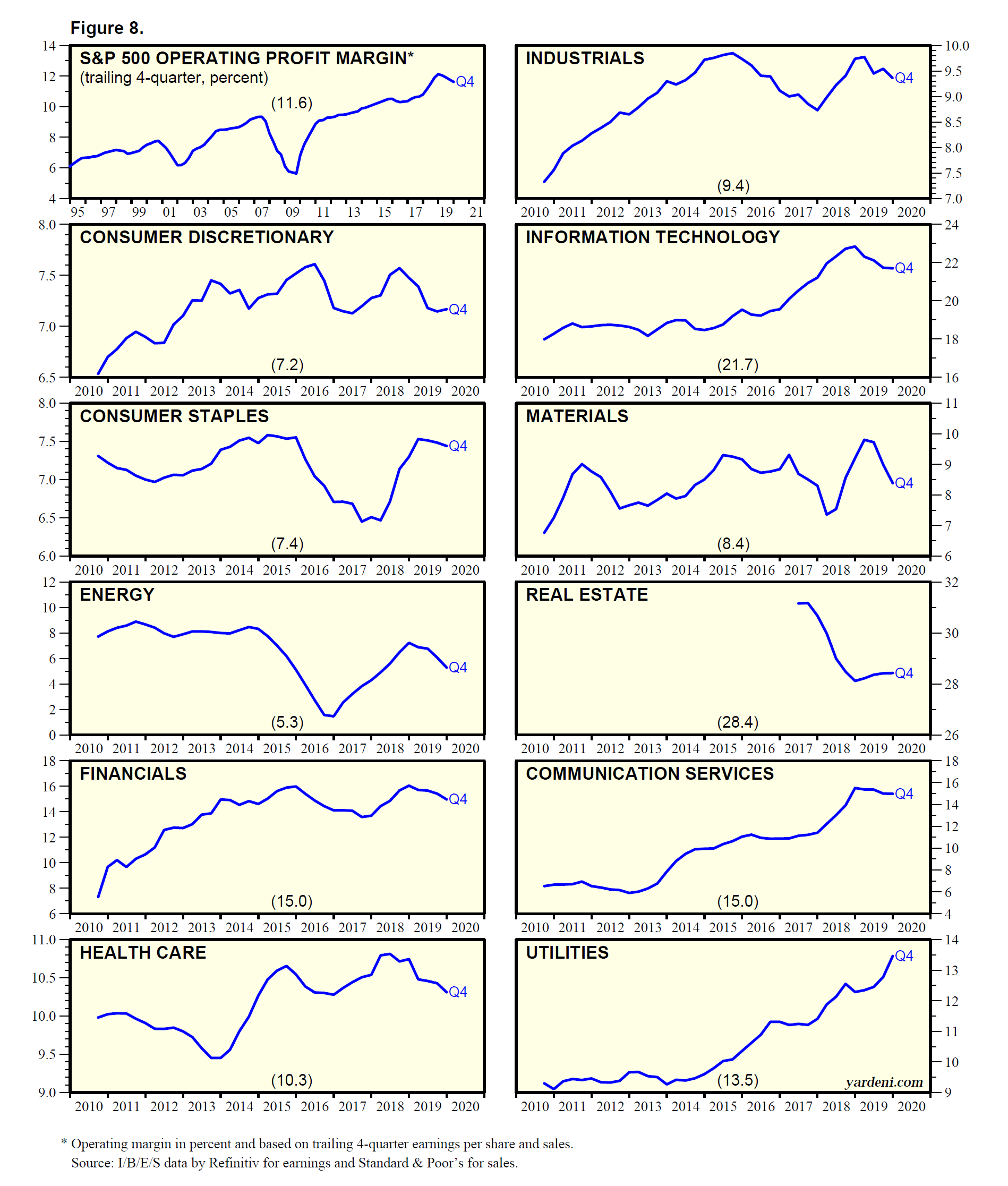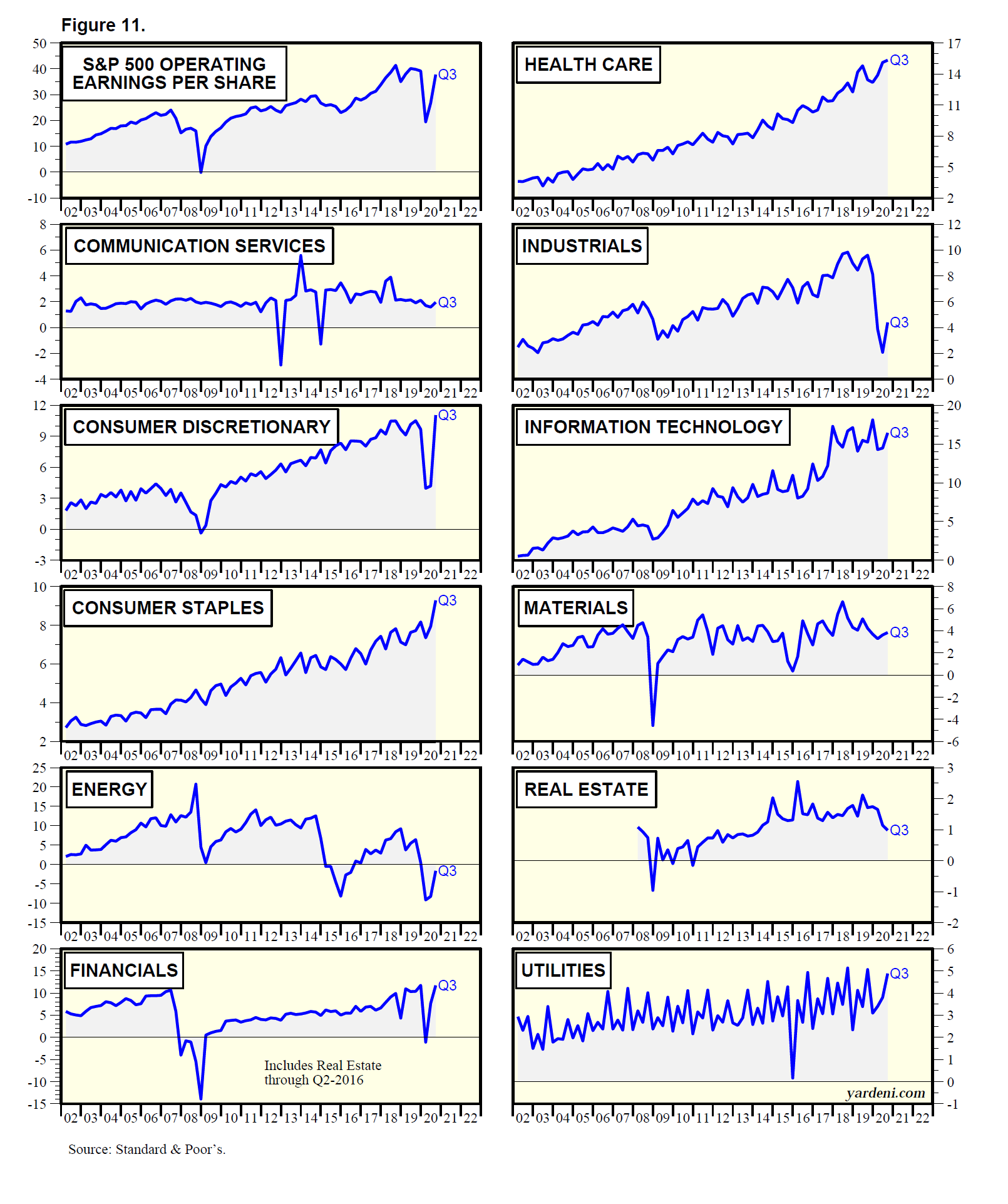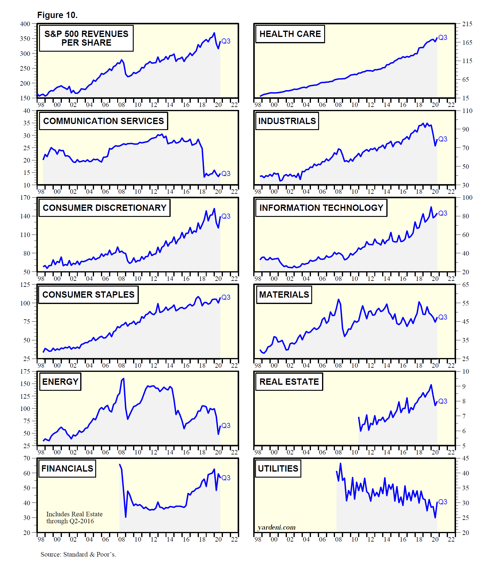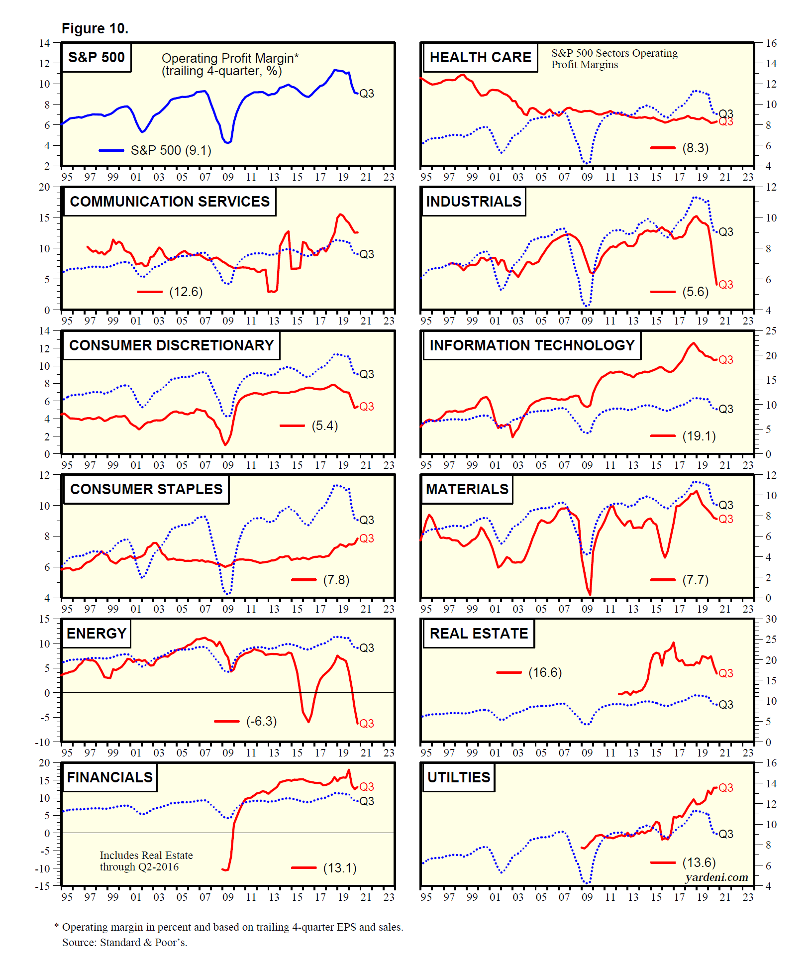 Here is the performance derby for the operating profit margins of the S&P 500’s sectors during Q3-2020 and during their GFC lows: Information Technology (19.1%, 9.5%), Utilities (13.6, 7.6), Financials (13.1, -10.6), Communication Services (12.6, 6.8), S&P 500 (9.1, 4.2), Health Care (8.3, 9.3), Consumer Staples (7.8, 6.0), Materials (7.7, 0.3), Industrials (5.6, 6.4), Consumer Discretionary (5.4, 1.0), and Energy (-6.3, 4.3) (Fig. 10).