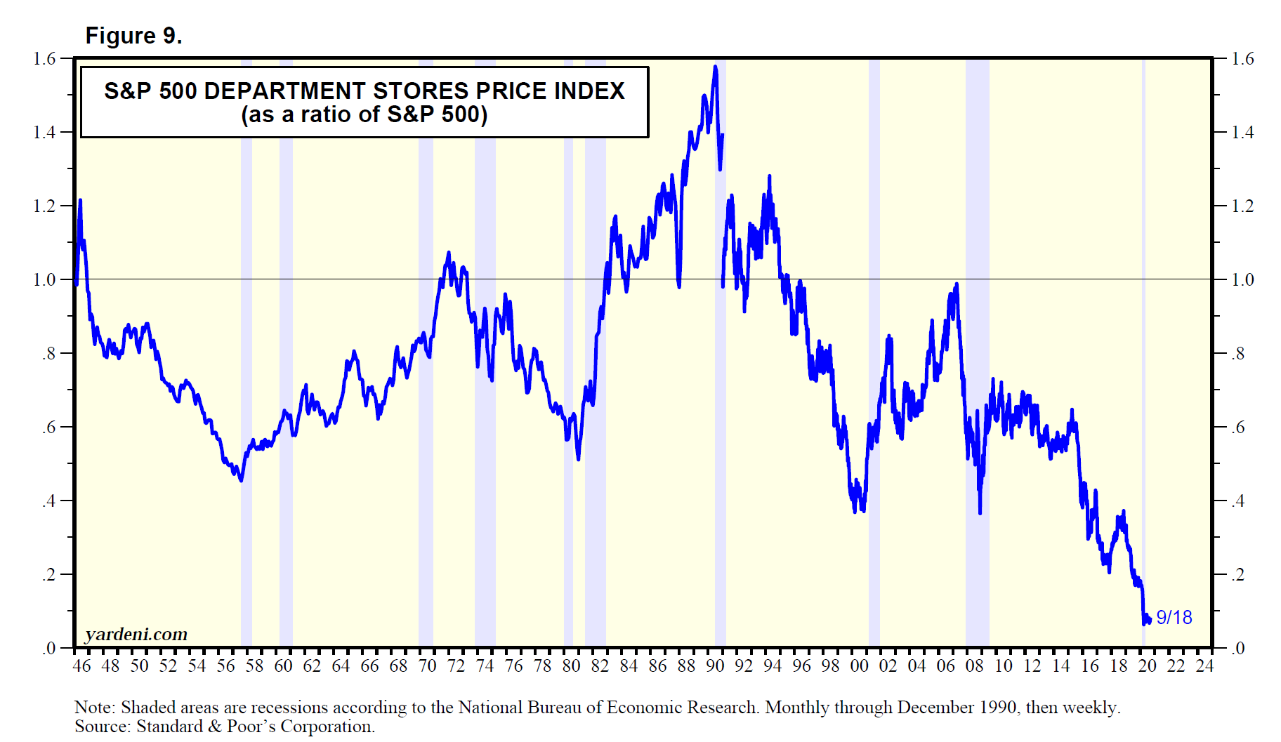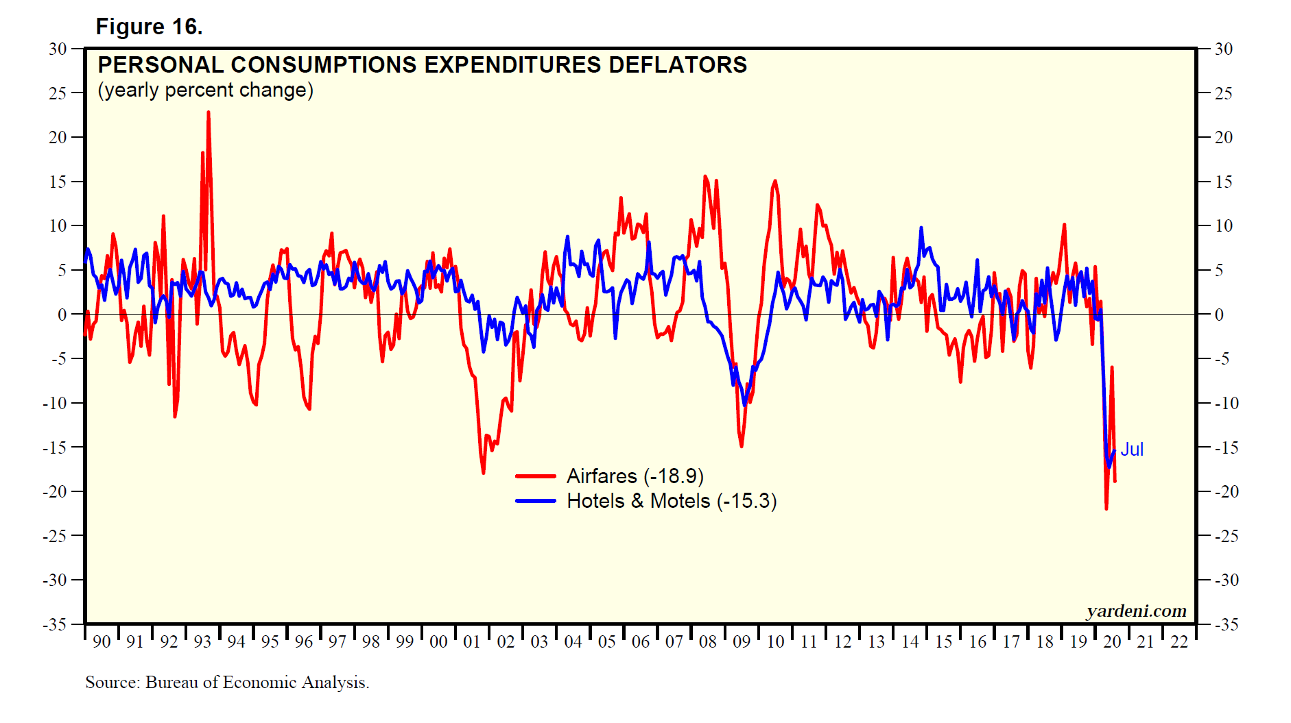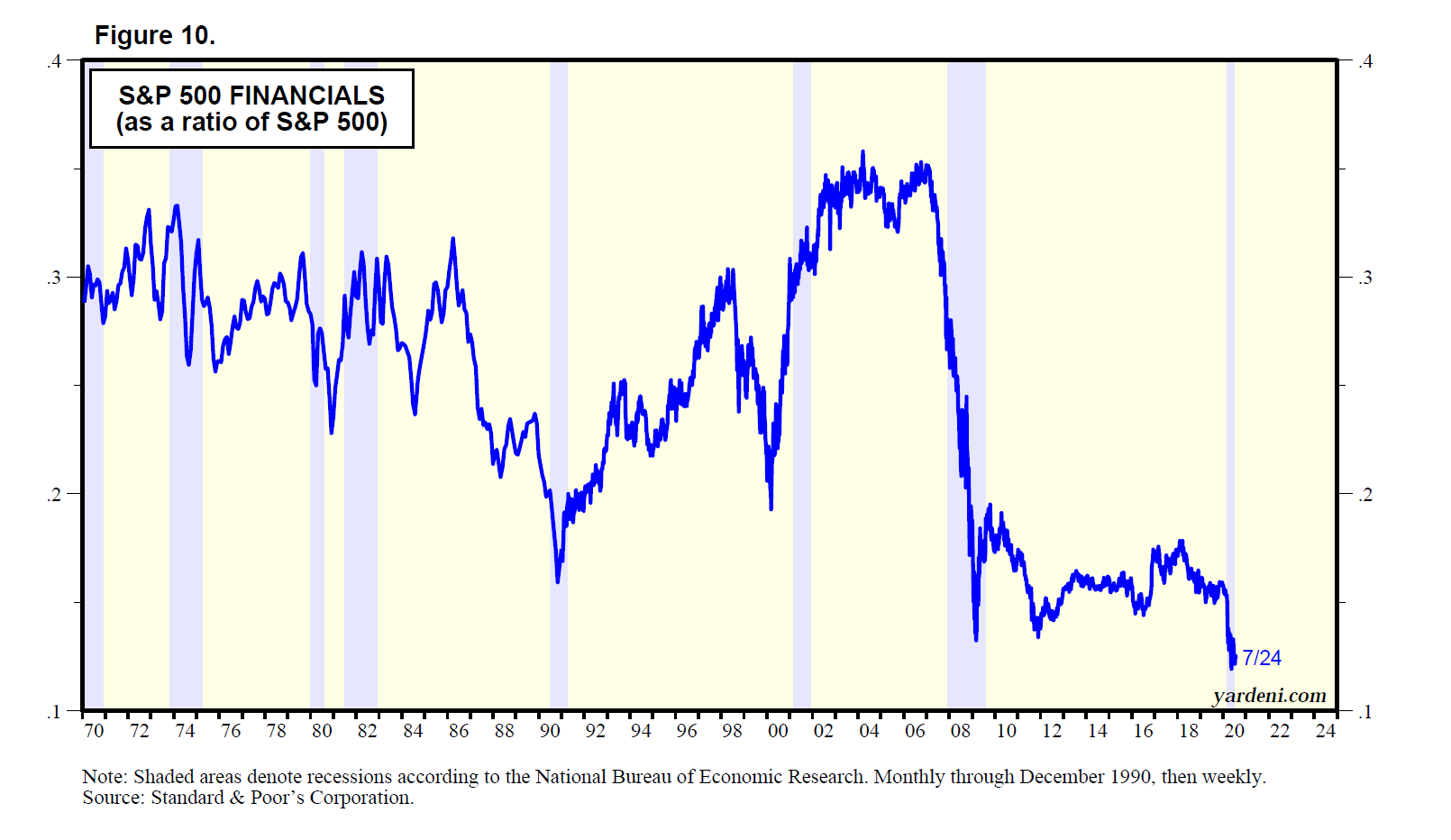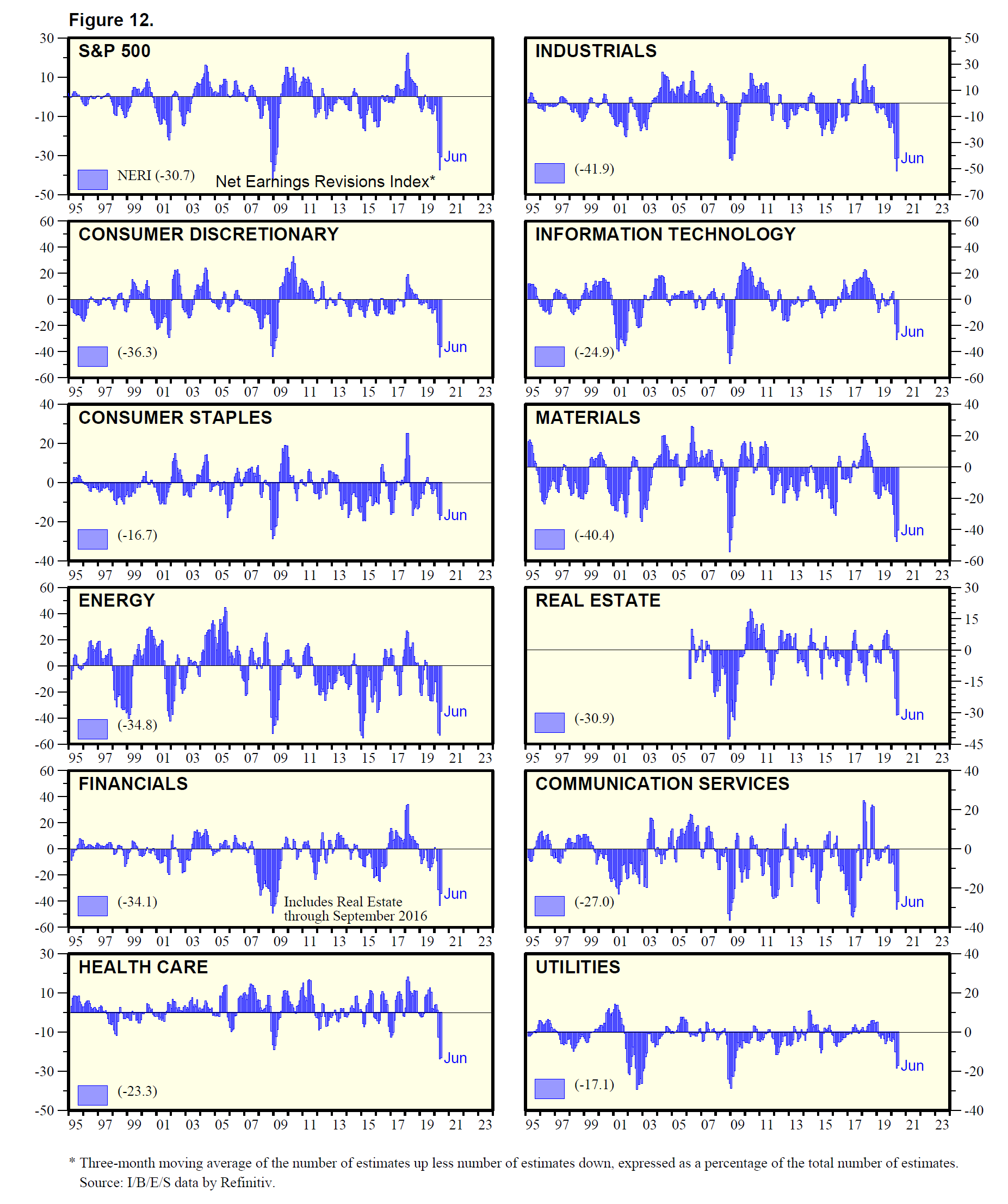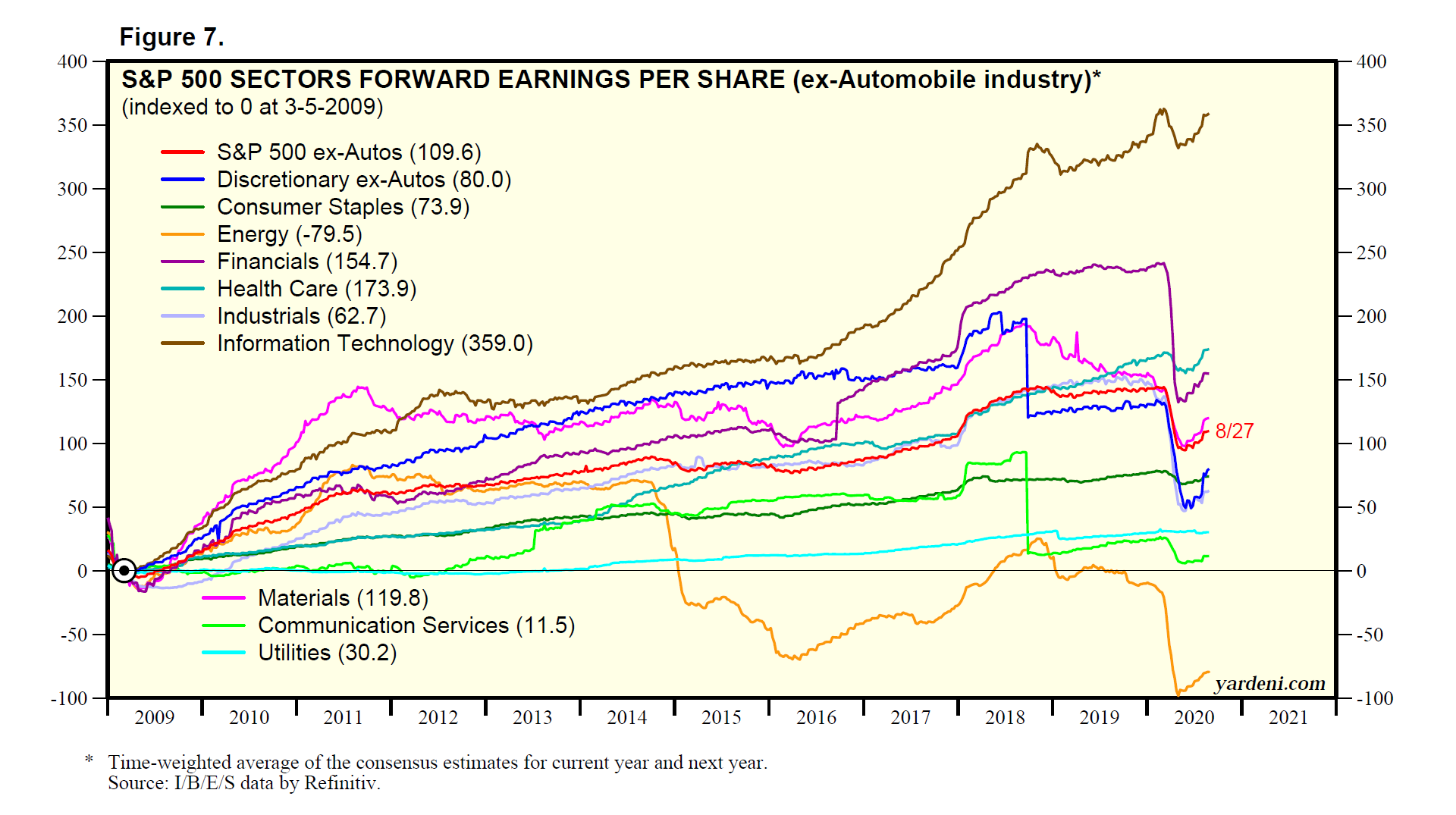 Here is the performance derby for the operating profit margins of the S&P 500’s sectors during Q3-2020 and during their GFC lows: Information Technology (19.1%, 9.5%), Utilities (13.6, 7.6), Financials (13.1, -10.6), Communication Services (12.6, 6.8), S&P 500 (9.1, 4.2), Health Care (8.3, 9.3), Consumer Staples (7.8, 6.0), Materials (7.7, 0.3), Industrials (5.6, 6.4), Consumer Discretionary (5.4, 1.0), and Energy (-6.3, 4.3) (Fig. 10).