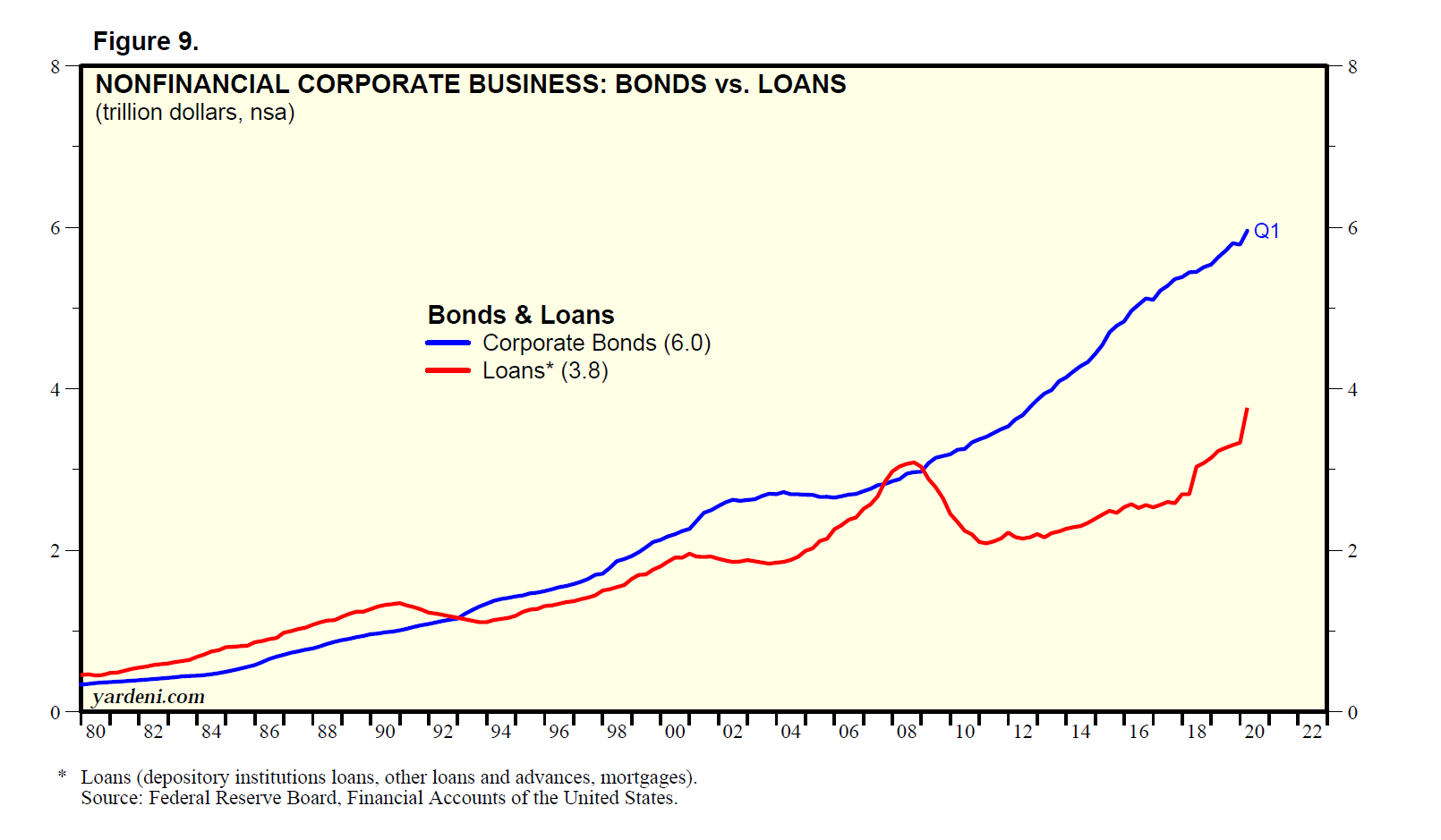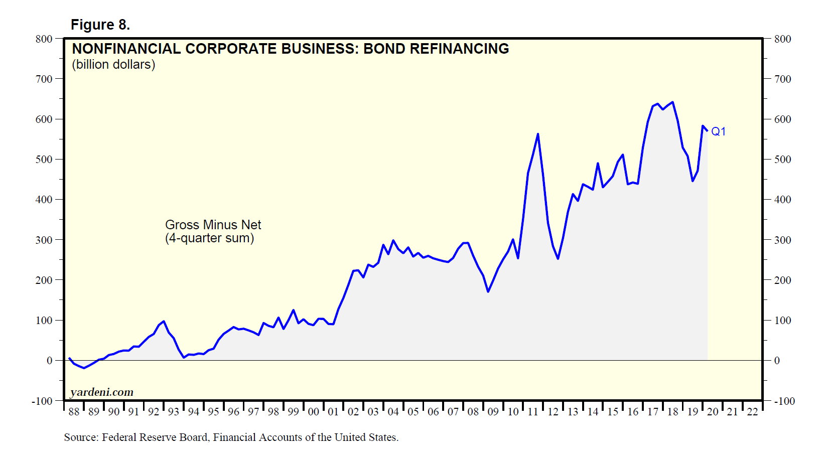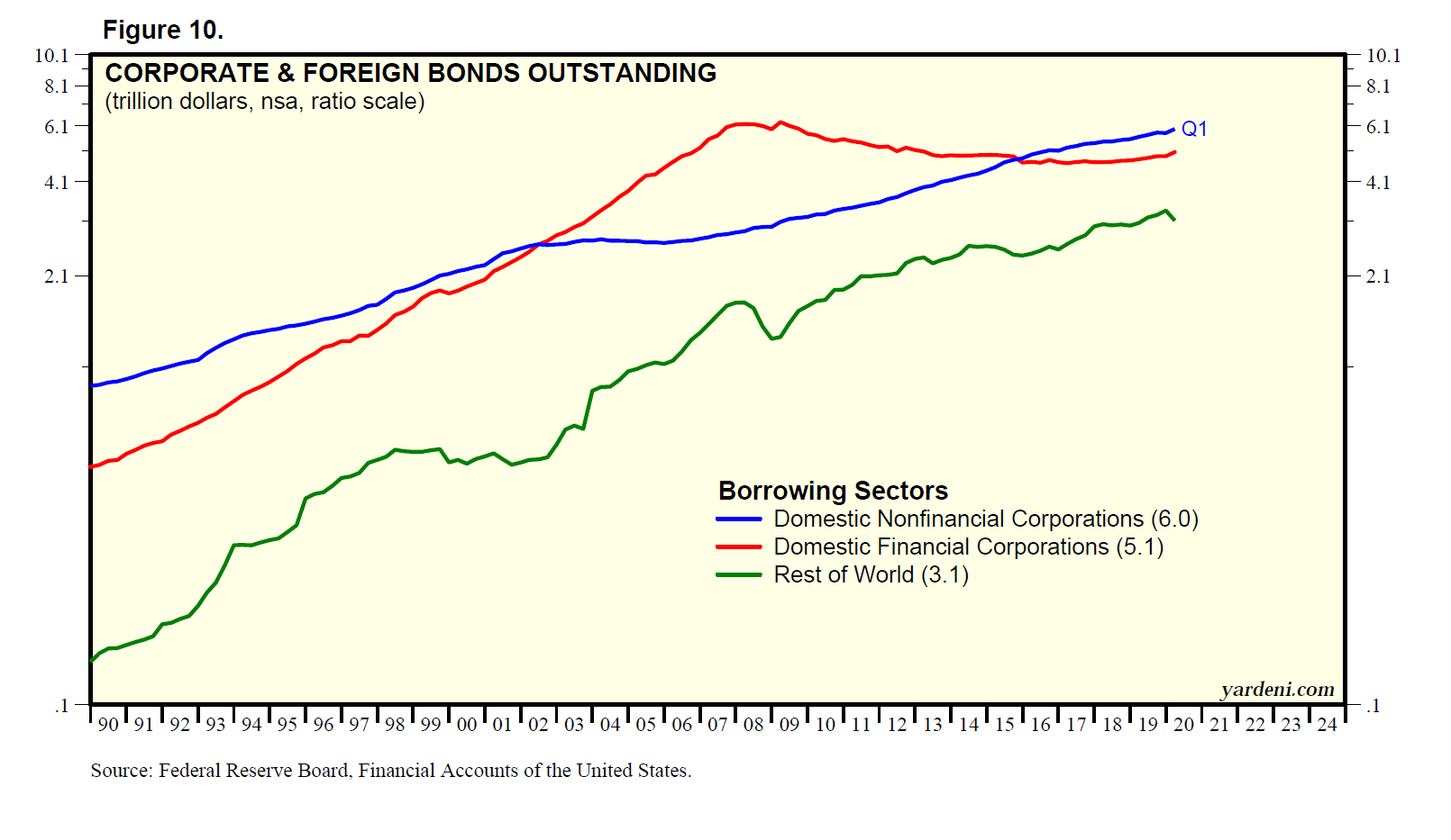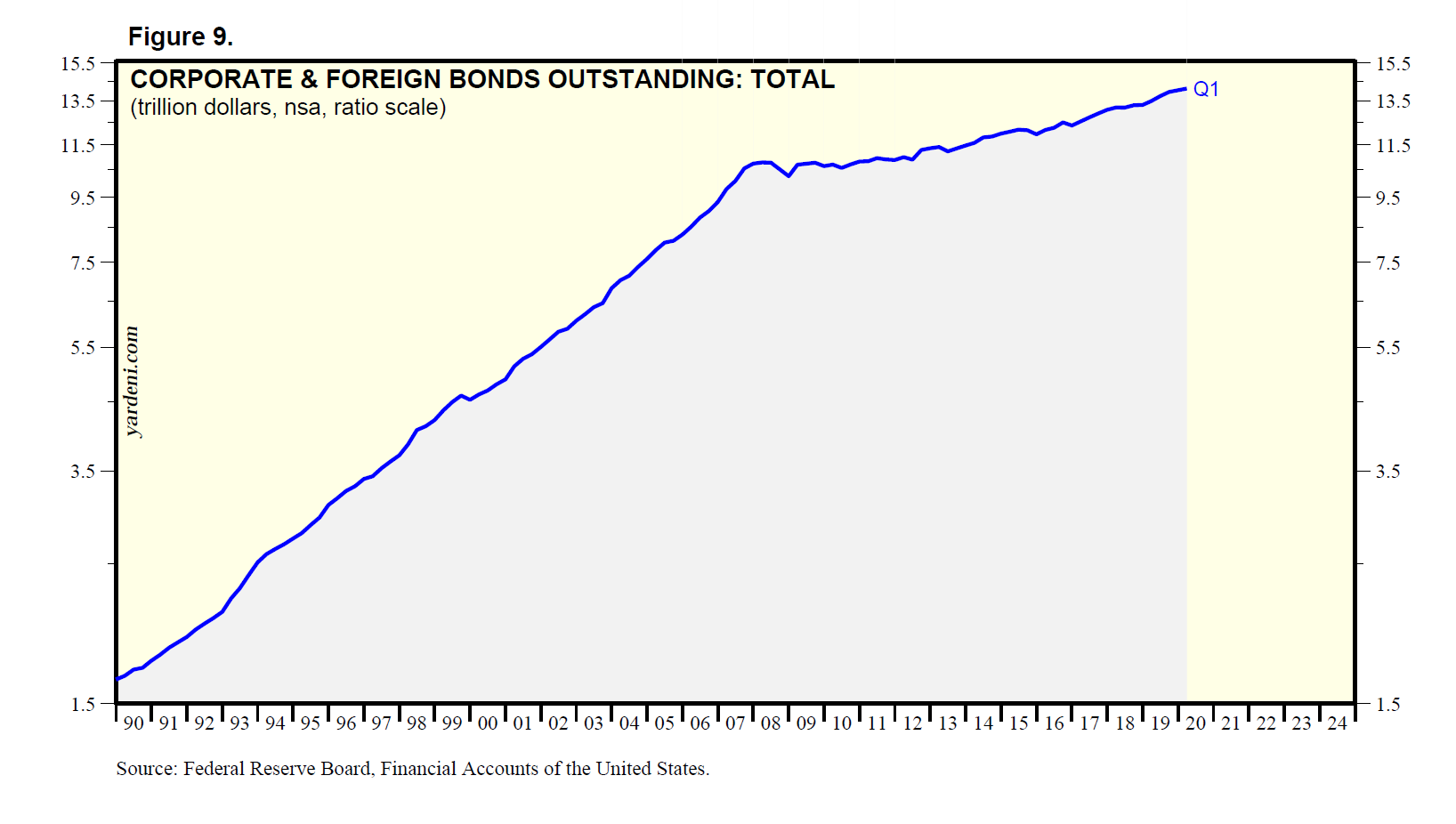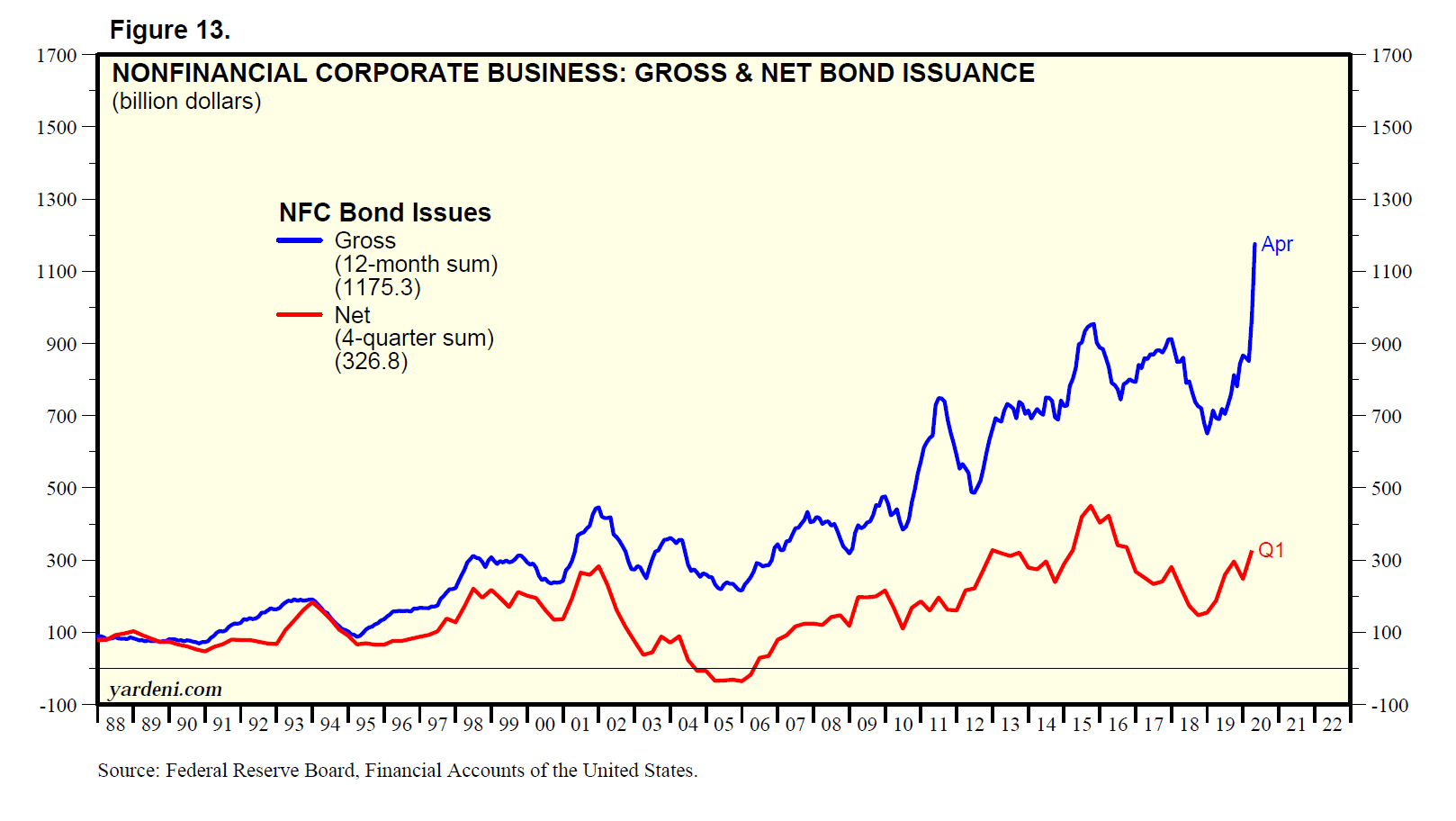 Nonfinancial corporate business debt jumped during Q1 as many companies cashed in their bank lines of credit during March, fearing a credit crunch. When the Fed dramatically eased credit conditions later that month, they scrambled to issue bonds, both to raise cash and to refinance debt at record-low interest rates. Here are some specific figures: