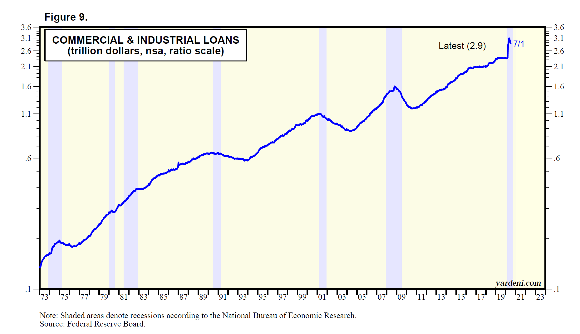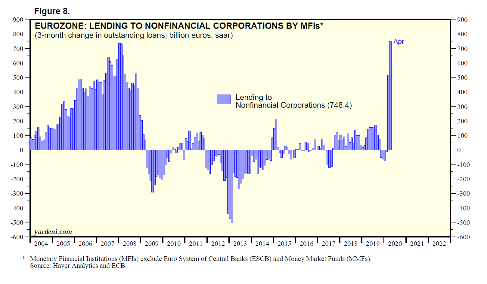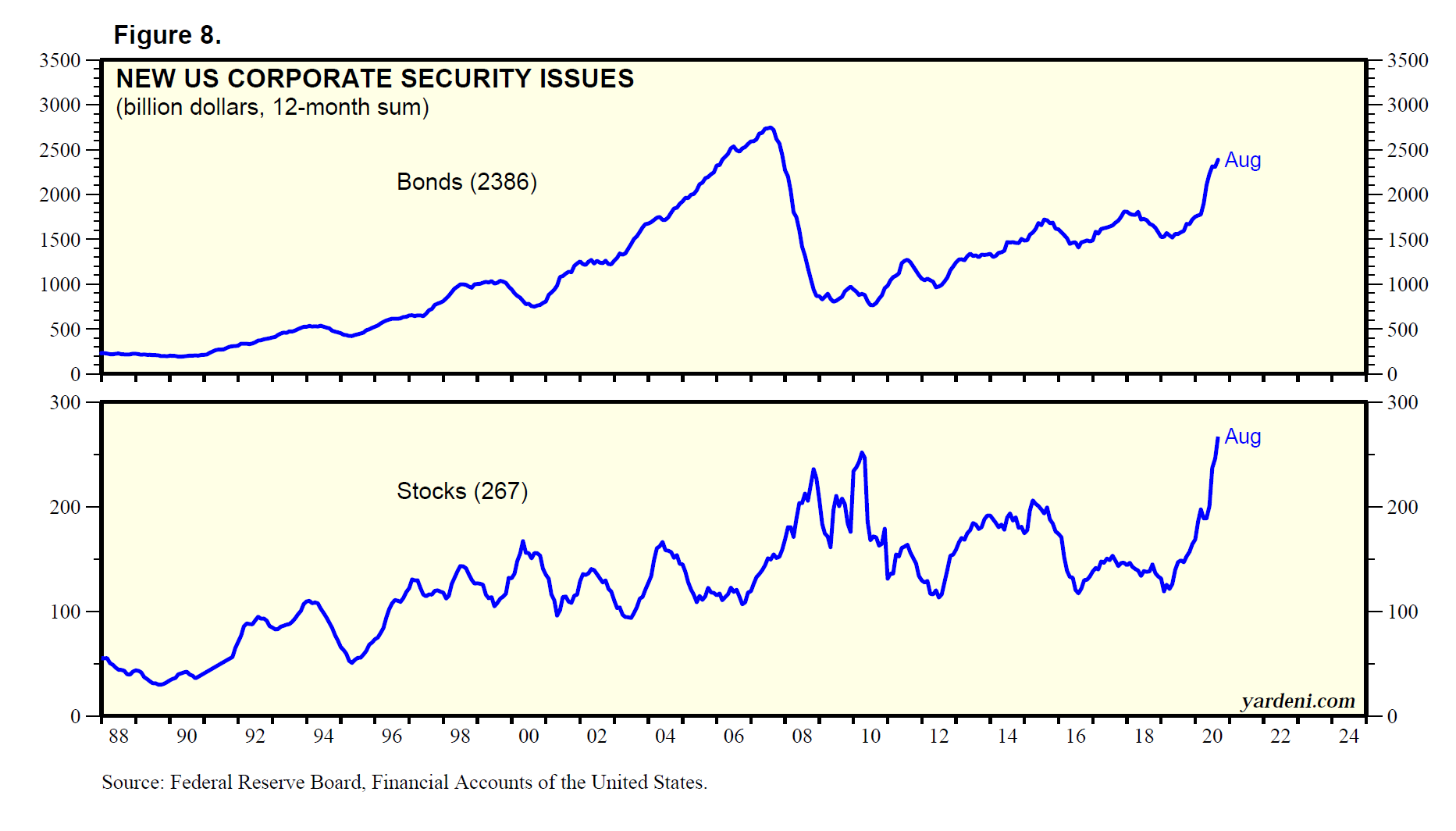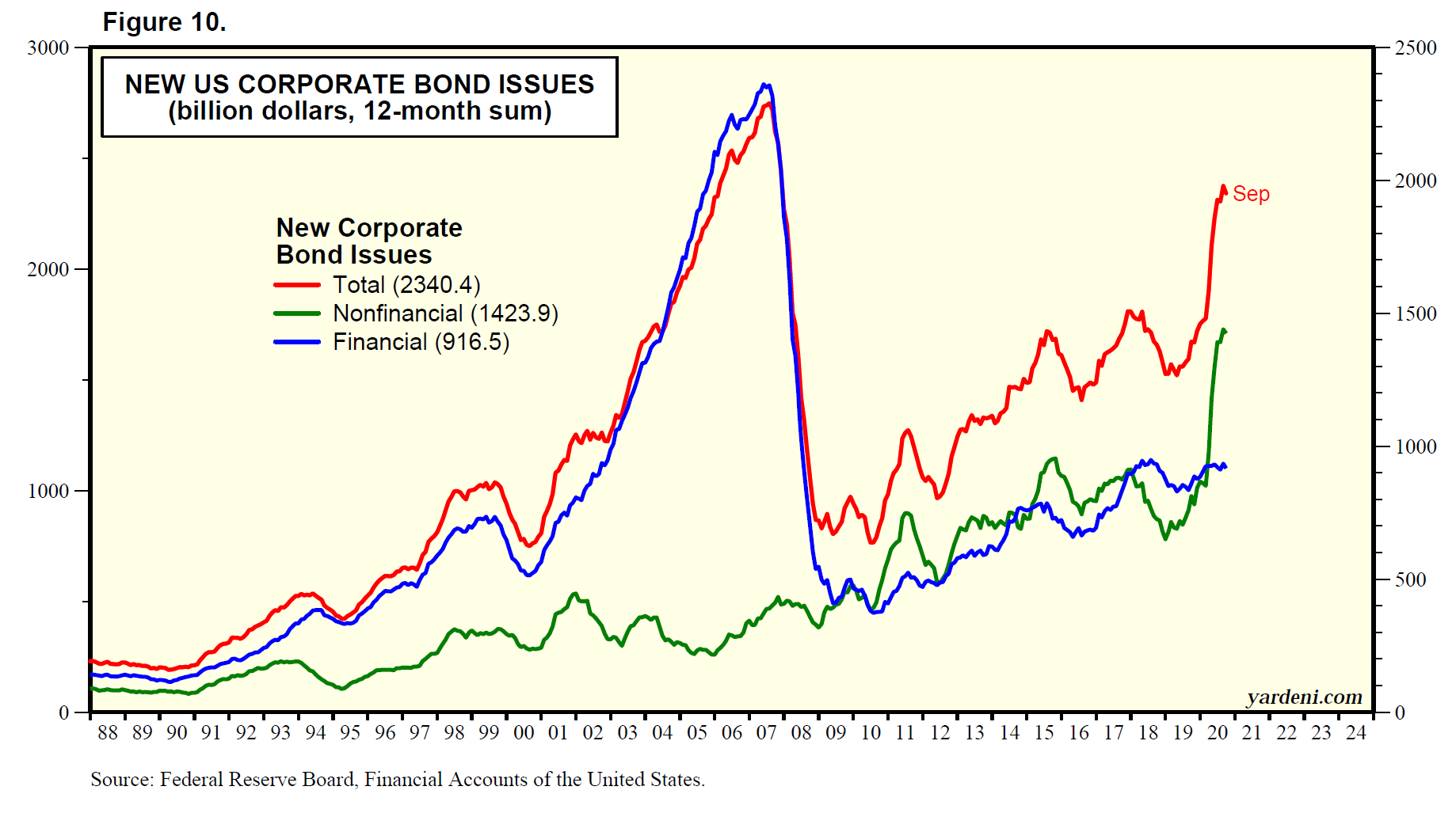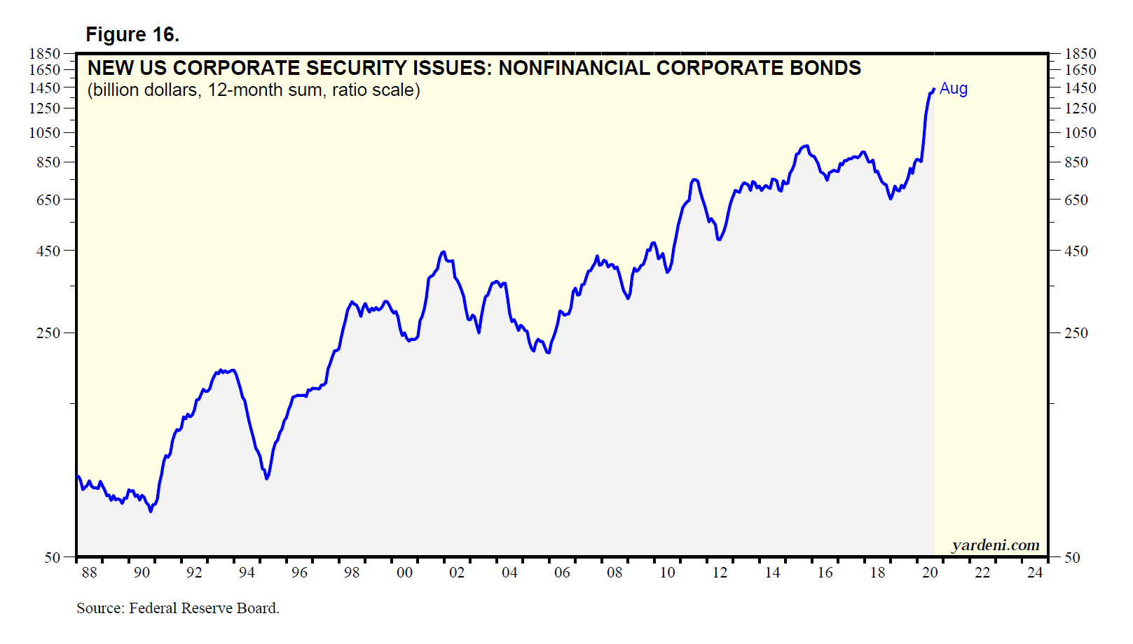 Nonfinancial corporate business debt jumped during Q1 as many companies cashed in their bank lines of credit during March, fearing a credit crunch. When the Fed dramatically eased credit conditions later that month, they scrambled to issue bonds, both to raise cash and to refinance debt at record-low interest rates. Here are some specific figures: