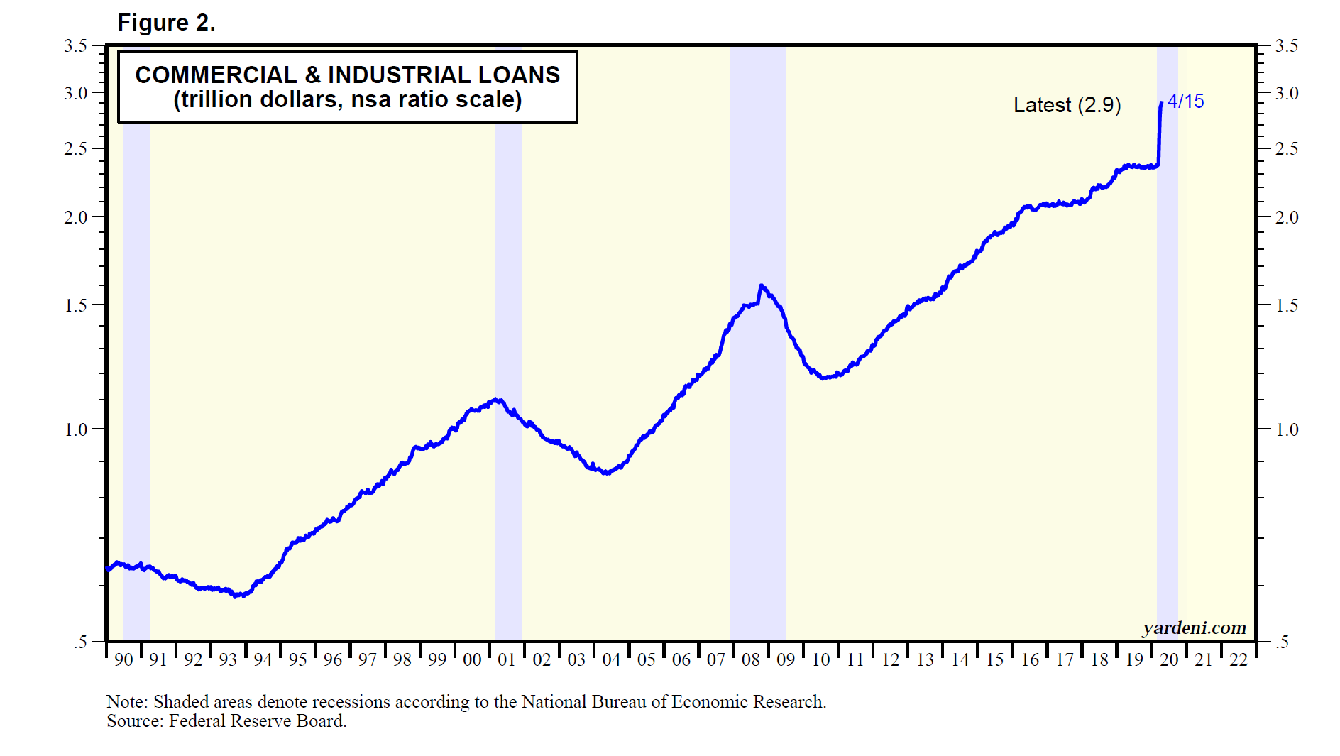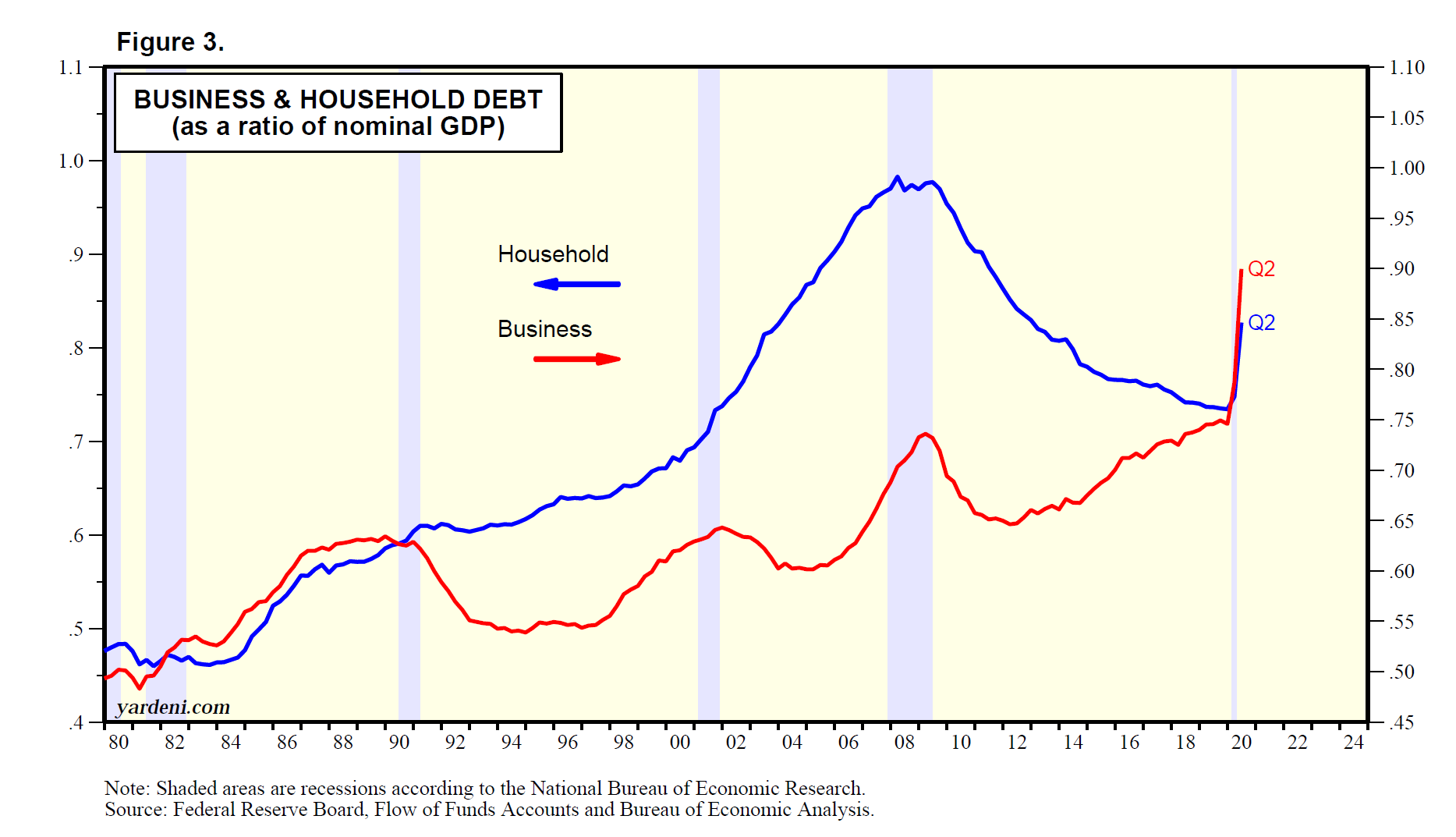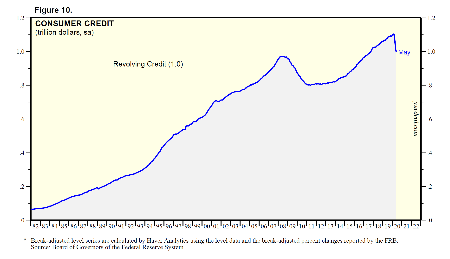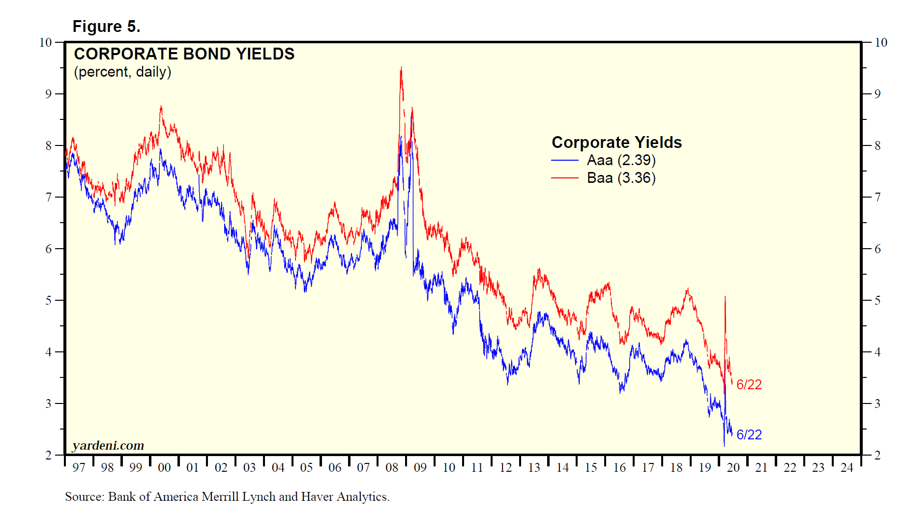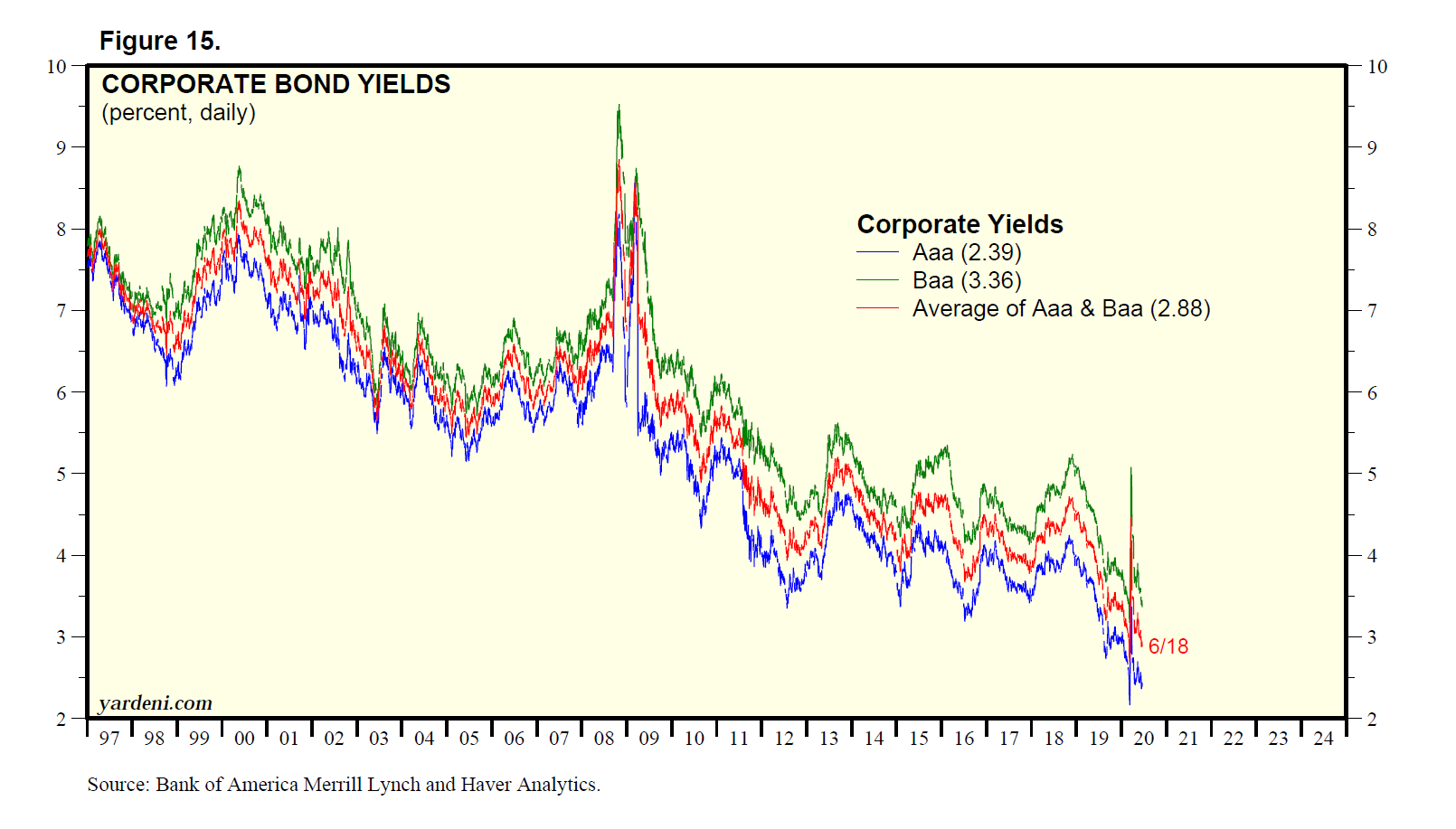 Nonfinancial corporate business debt jumped during Q1 as many companies cashed in their bank lines of credit during March, fearing a credit crunch. When the Fed dramatically eased credit conditions later that month, they scrambled to issue bonds, both to raise cash and to refinance debt at record-low interest rates. Here are some specific figures: