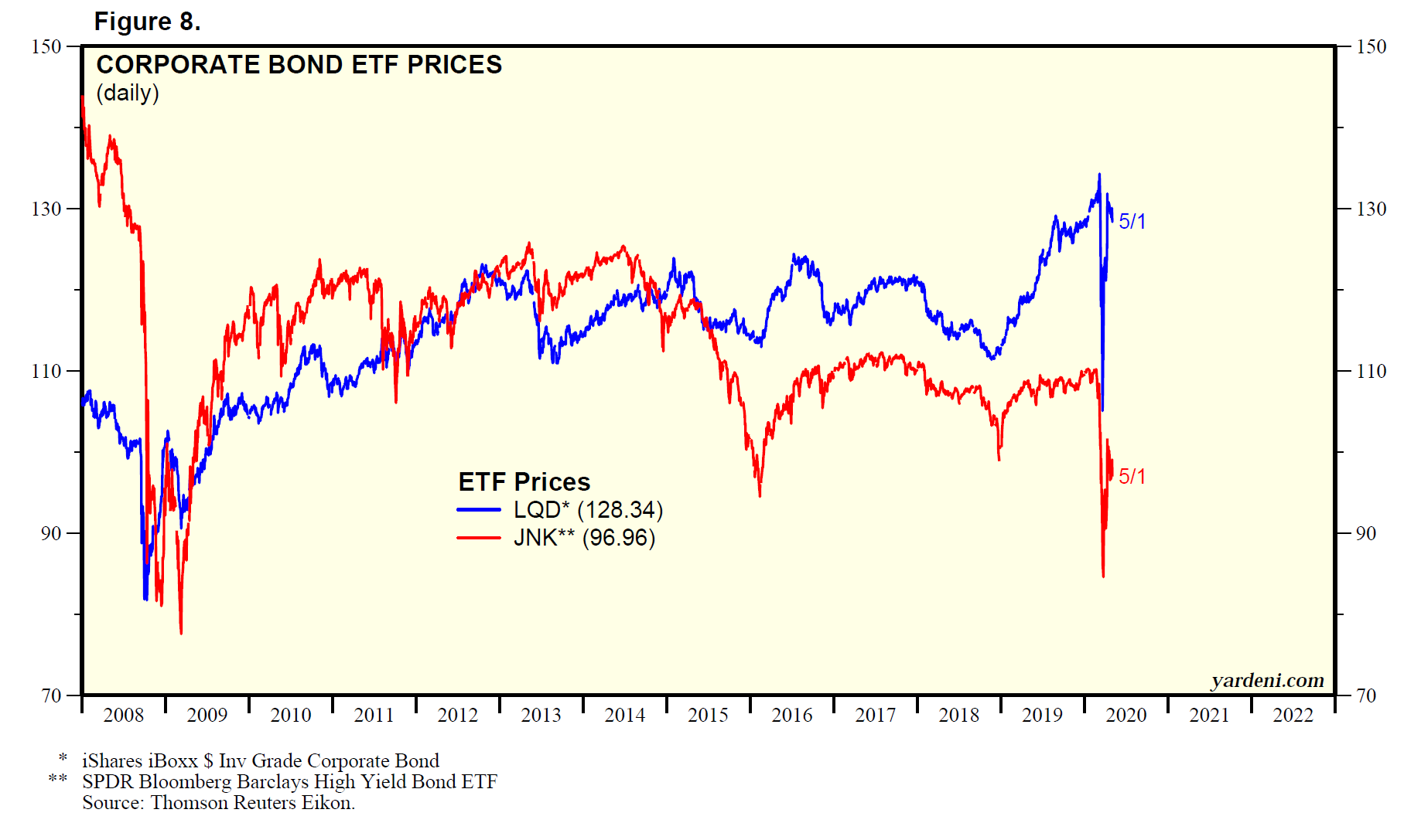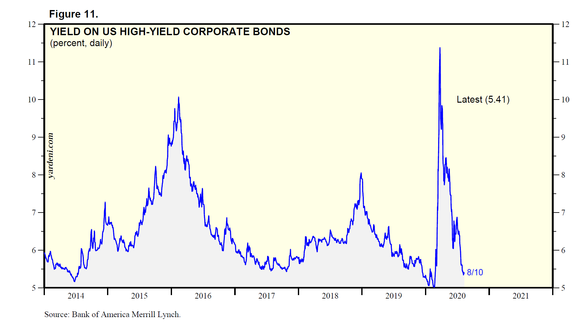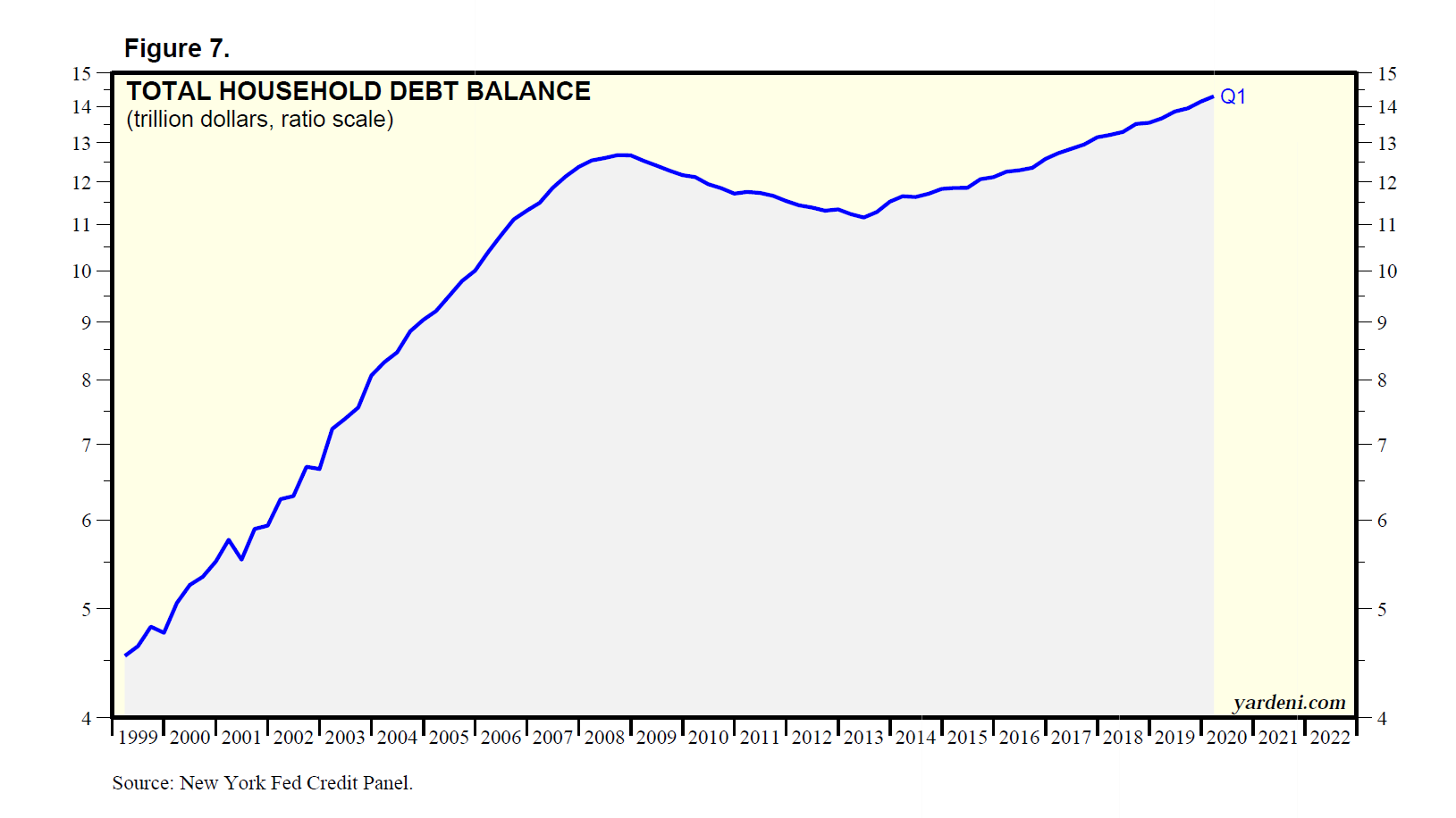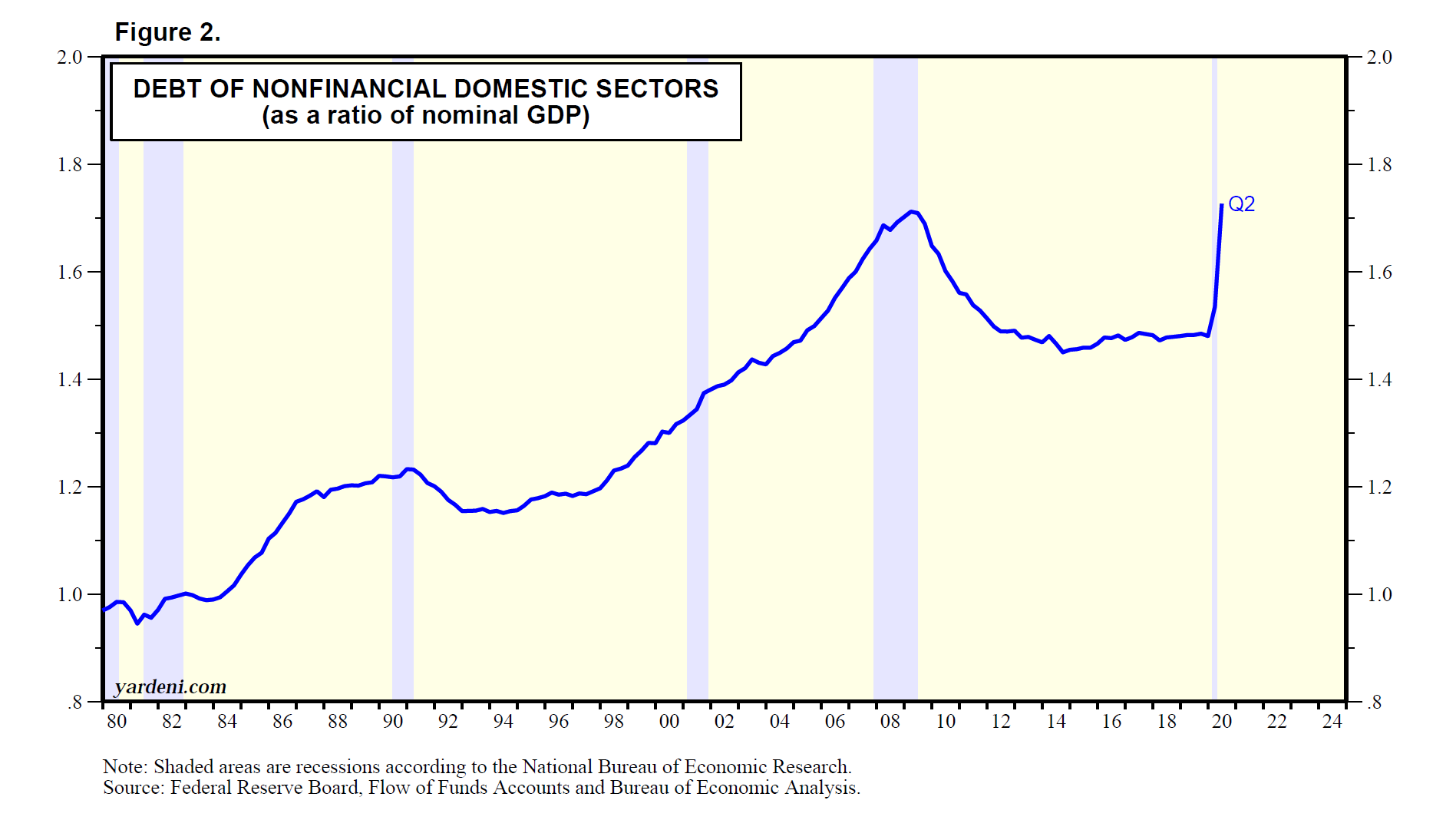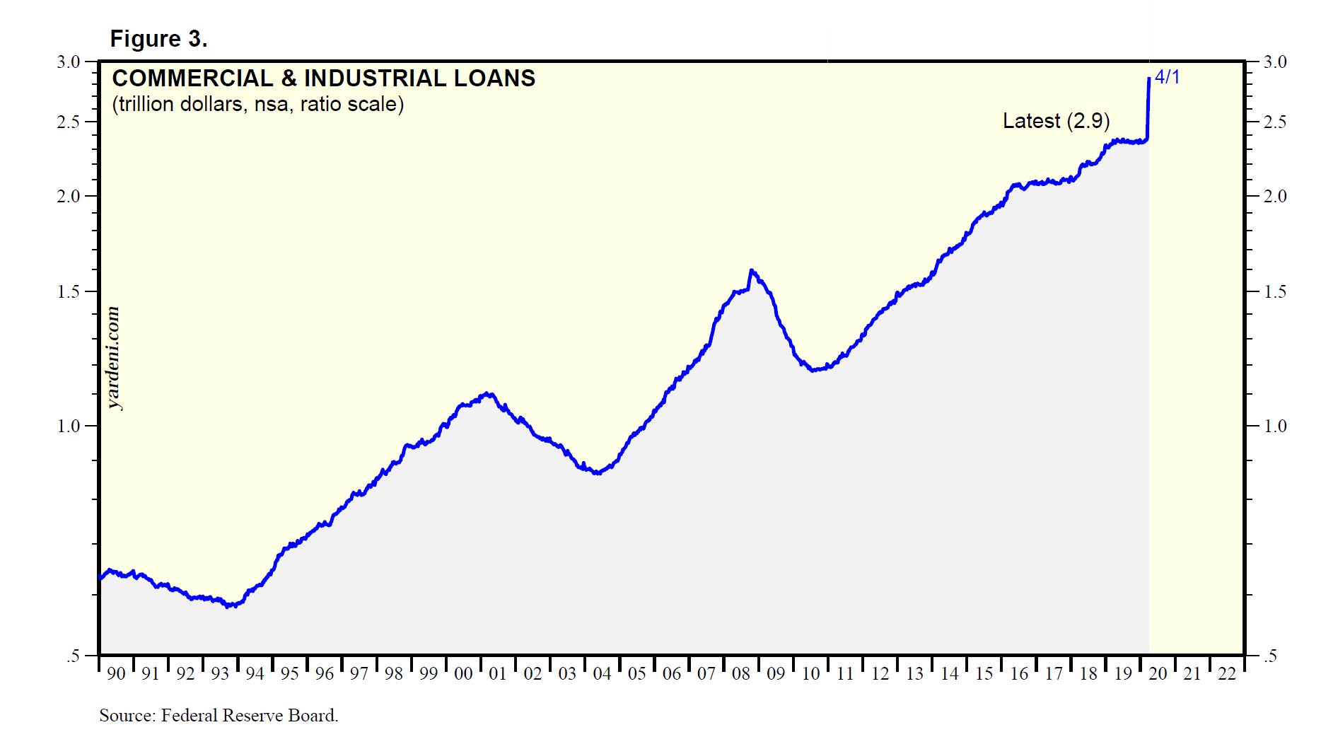 Nonfinancial corporate business debt jumped during Q1 as many companies cashed in their bank lines of credit during March, fearing a credit crunch. When the Fed dramatically eased credit conditions later that month, they scrambled to issue bonds, both to raise cash and to refinance debt at record-low interest rates. Here are some specific figures: