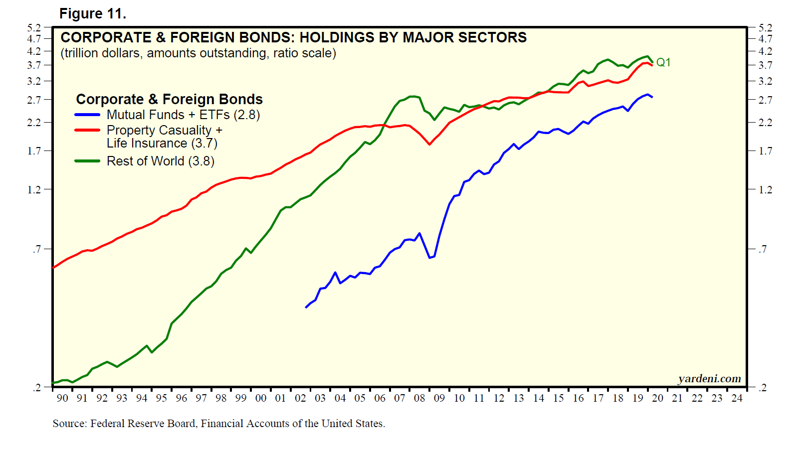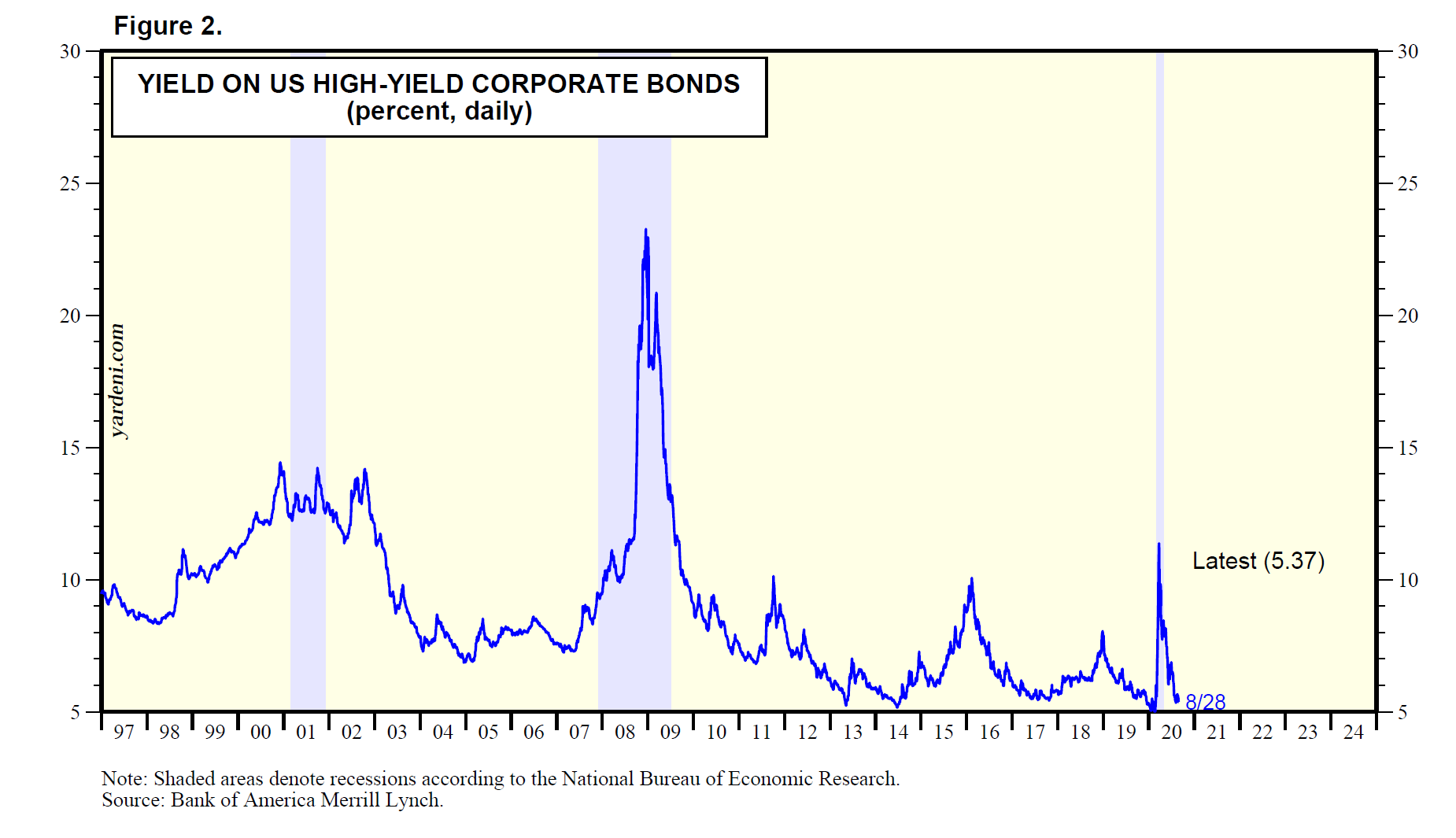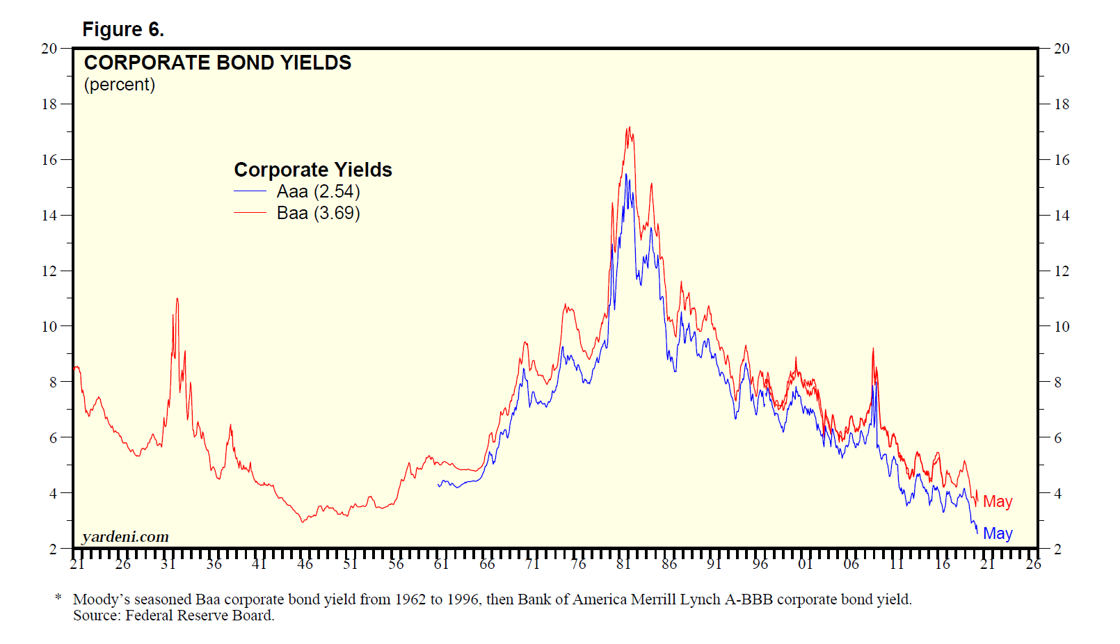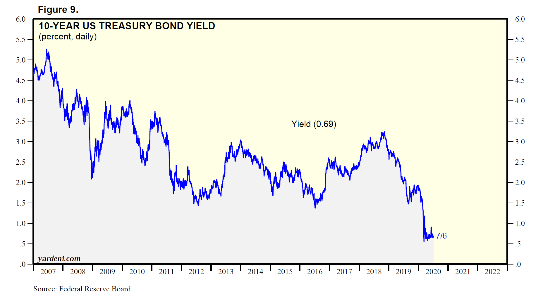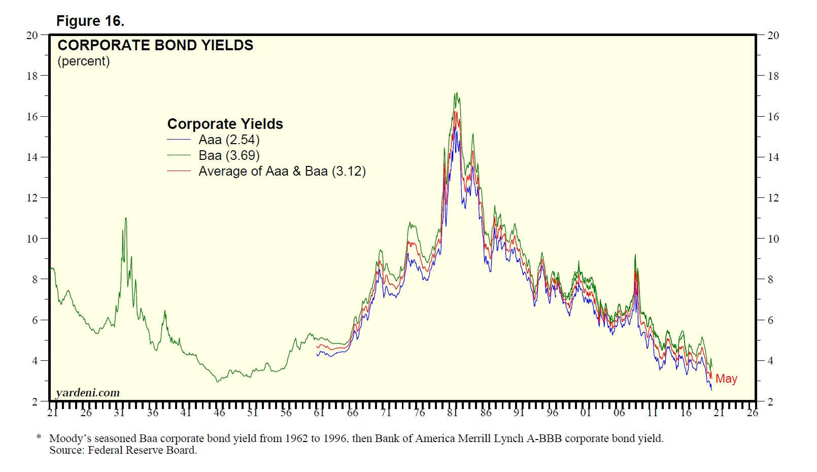 Nonfinancial corporate business debt jumped during Q1 as many companies cashed in their bank lines of credit during March, fearing a credit crunch. When the Fed dramatically eased credit conditions later that month, they scrambled to issue bonds, both to raise cash and to refinance debt at record-low interest rates. Here are some specific figures: