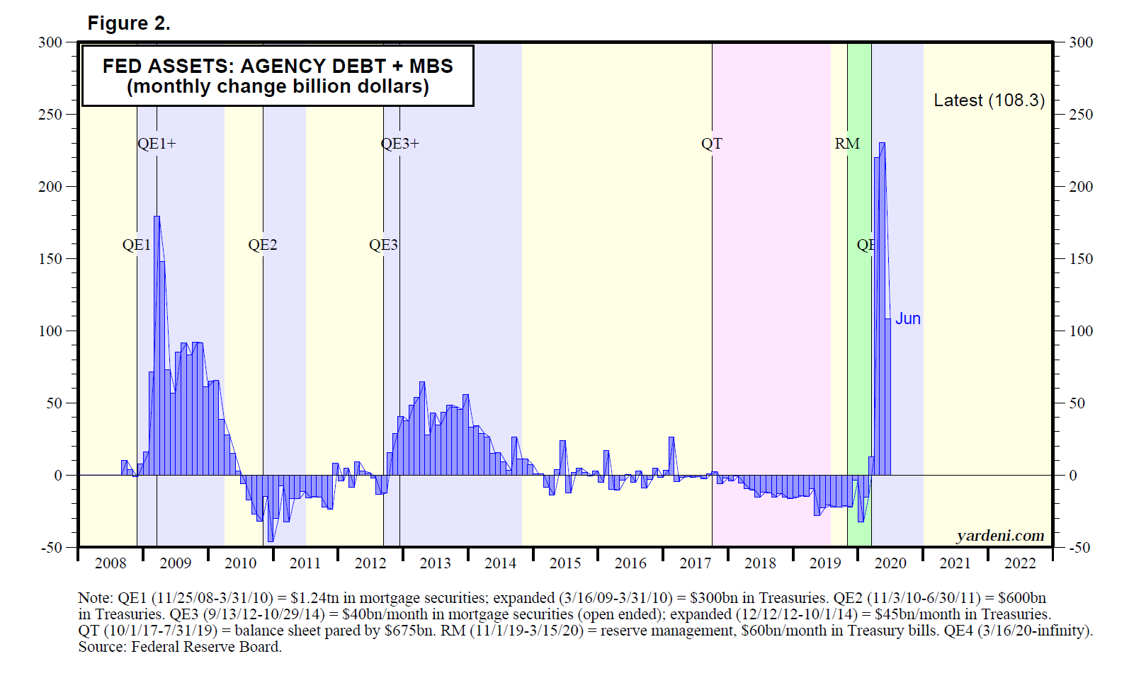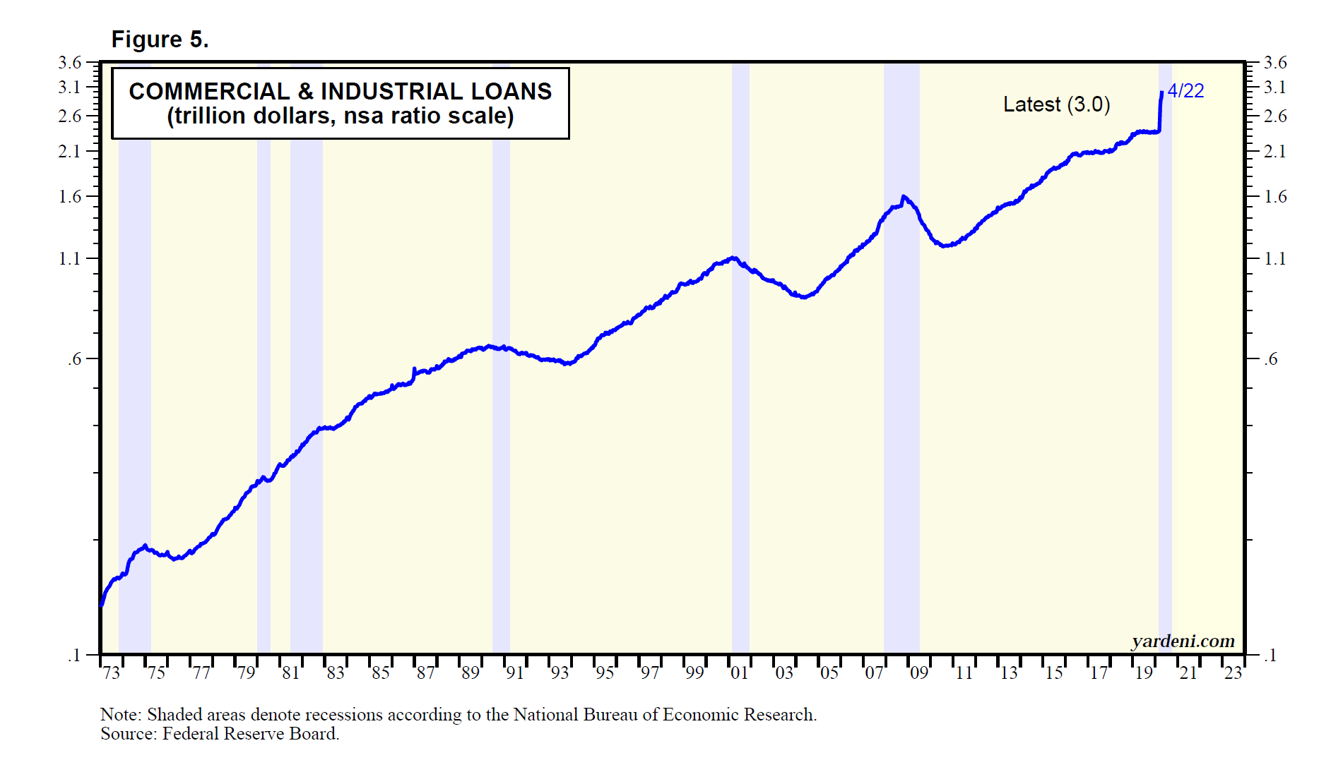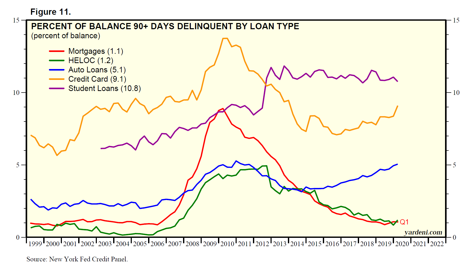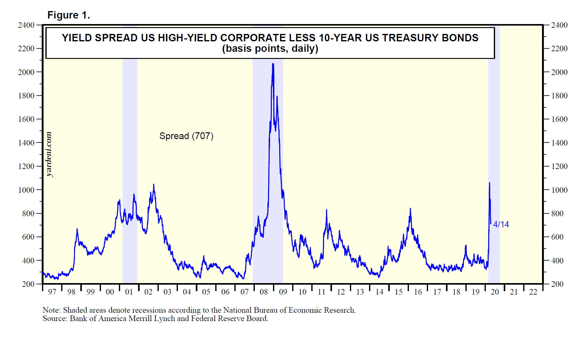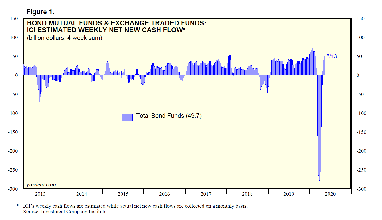 Nonfinancial corporate business debt jumped during Q1 as many companies cashed in their bank lines of credit during March, fearing a credit crunch. When the Fed dramatically eased credit conditions later that month, they scrambled to issue bonds, both to raise cash and to refinance debt at record-low interest rates. Here are some specific figures: