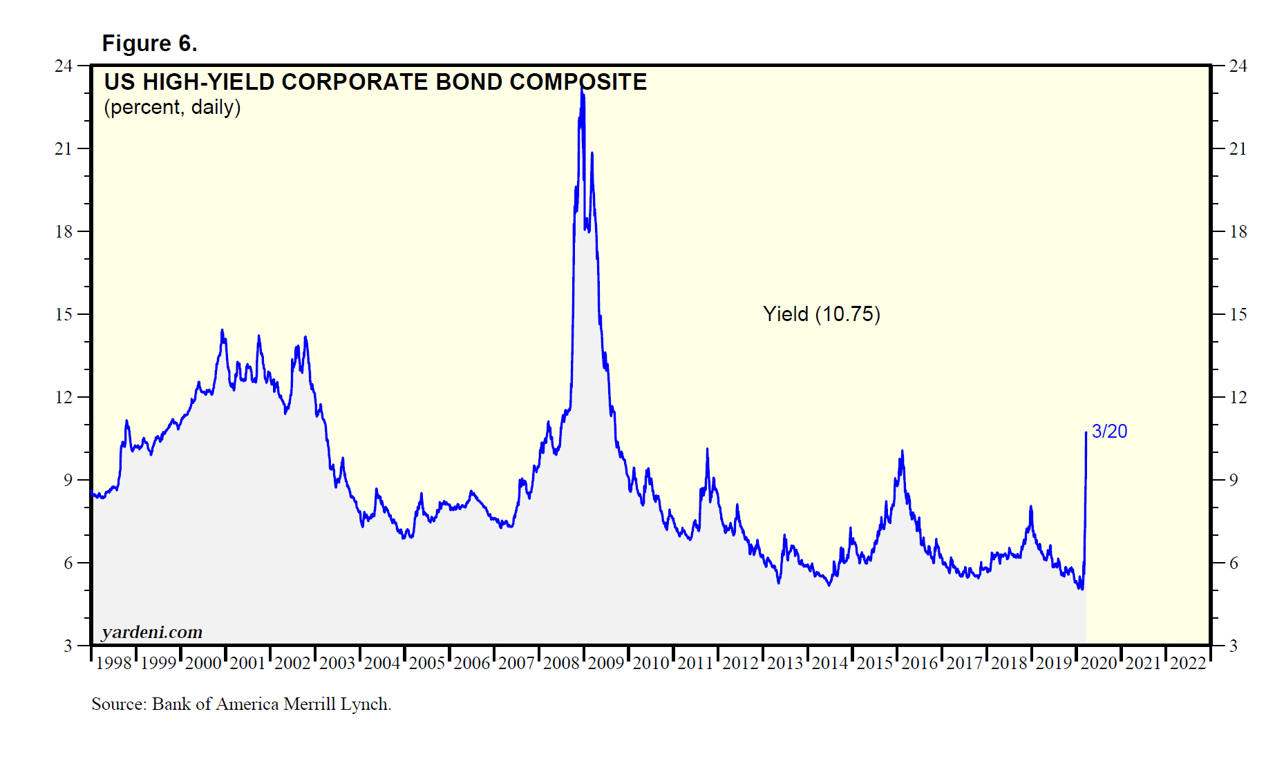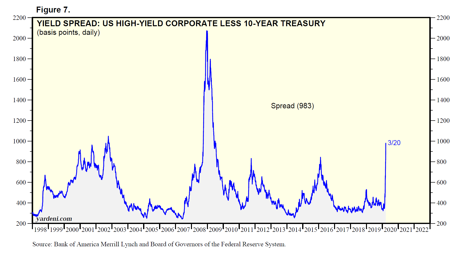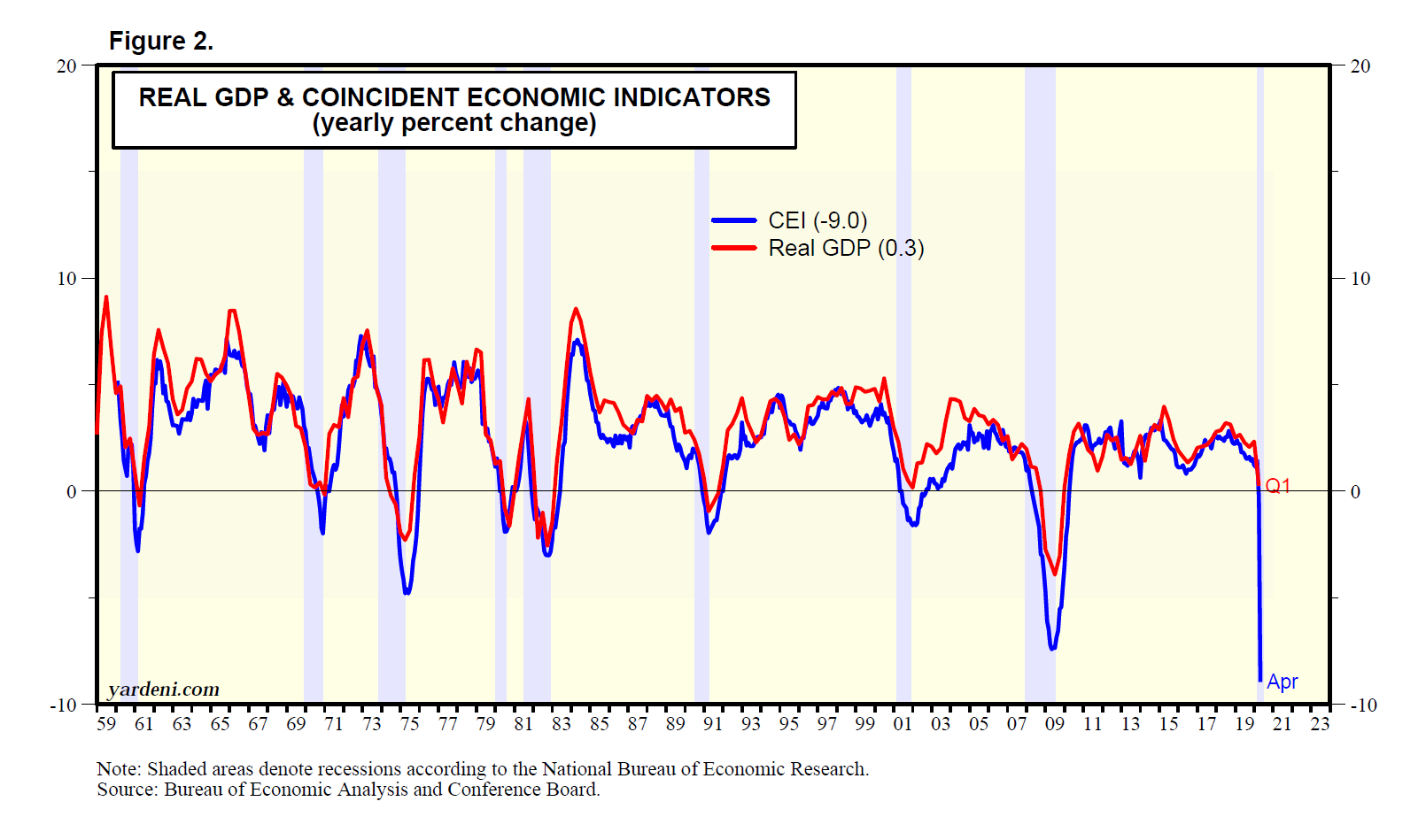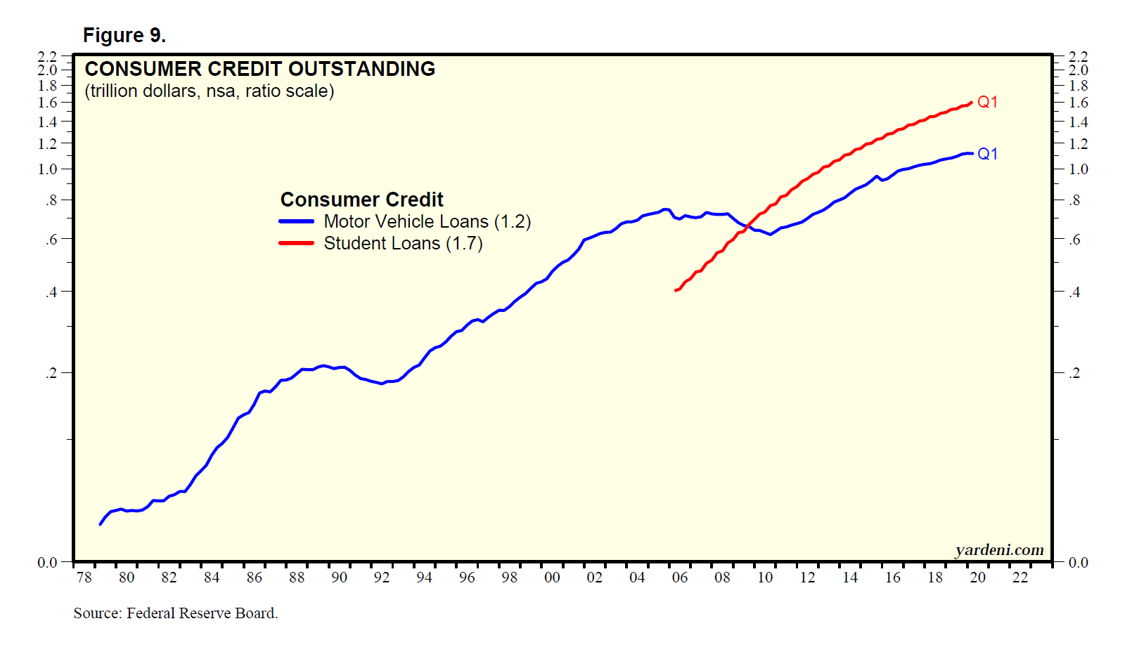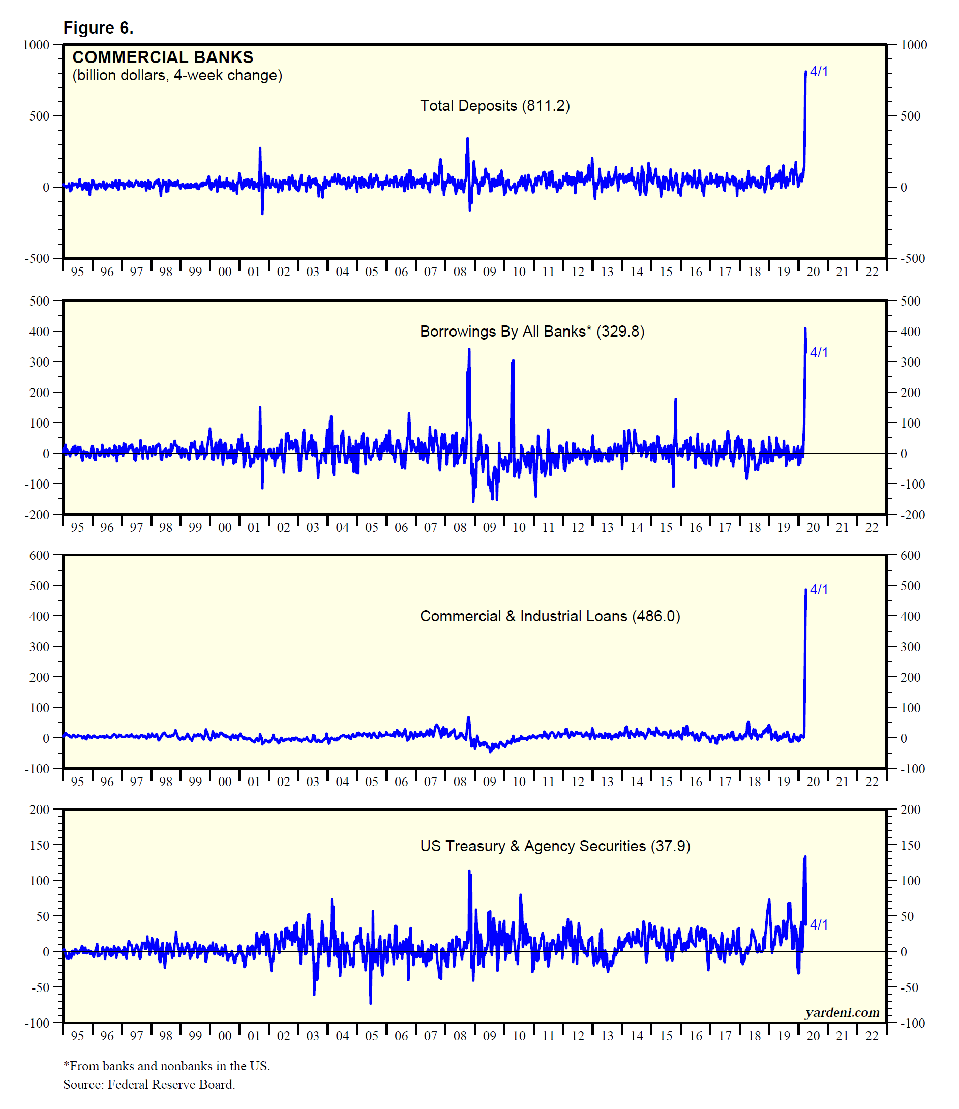 Nonfinancial corporate business debt jumped during Q1 as many companies cashed in their bank lines of credit during March, fearing a credit crunch. When the Fed dramatically eased credit conditions later that month, they scrambled to issue bonds, both to raise cash and to refinance debt at record-low interest rates. Here are some specific figures: