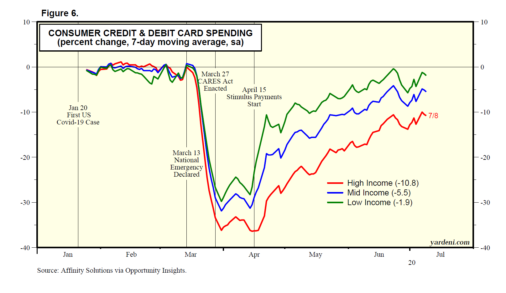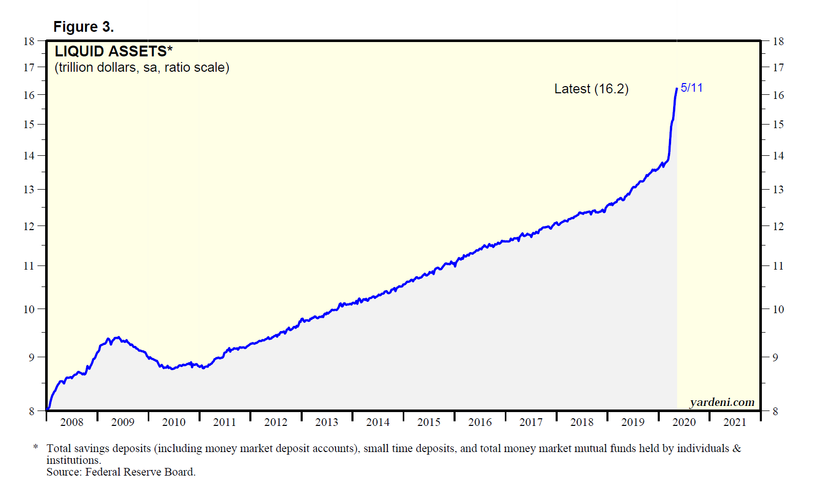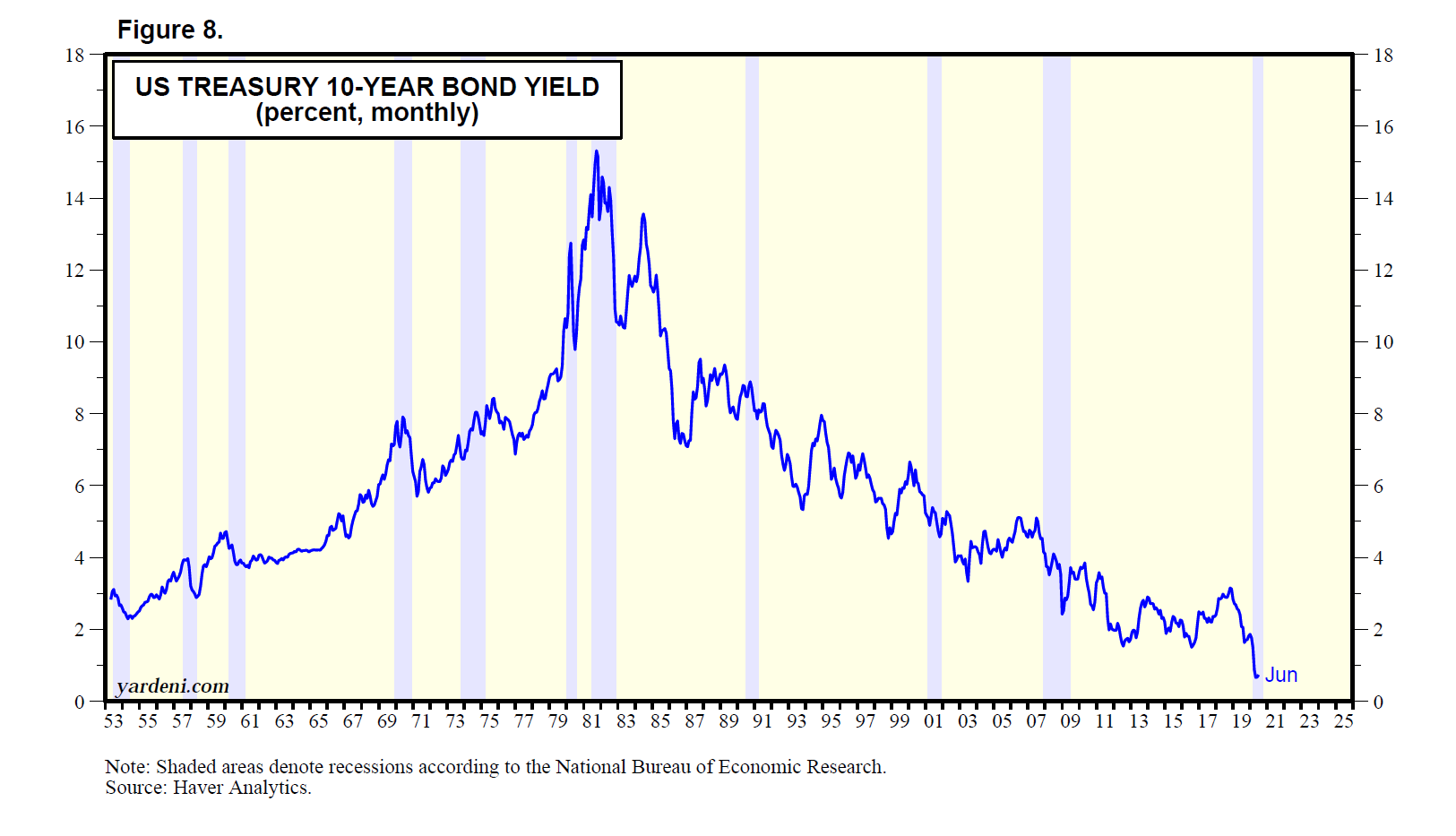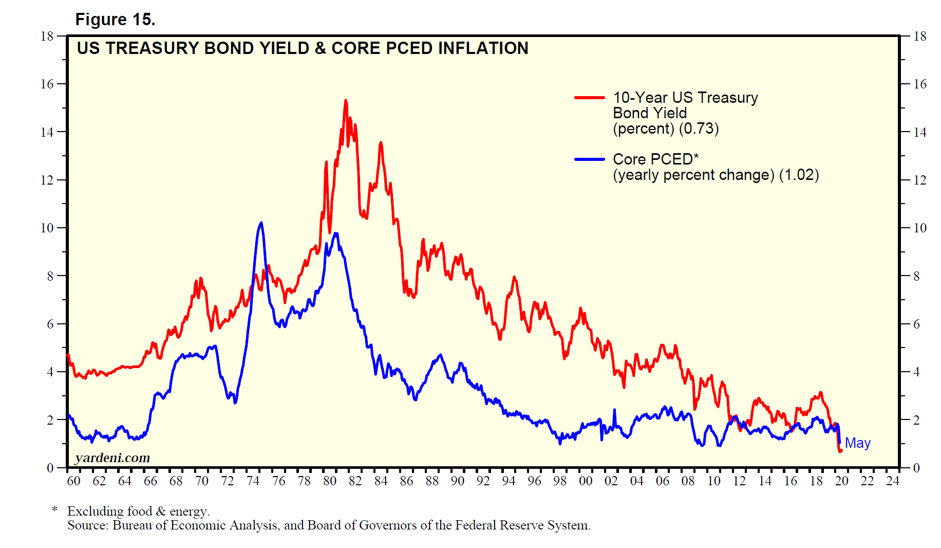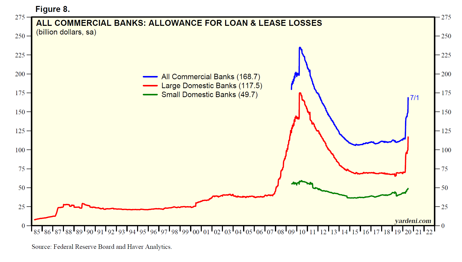 Nonfinancial corporate business debt jumped during Q1 as many companies cashed in their bank lines of credit during March, fearing a credit crunch. When the Fed dramatically eased credit conditions later that month, they scrambled to issue bonds, both to raise cash and to refinance debt at record-low interest rates. Here are some specific figures:
