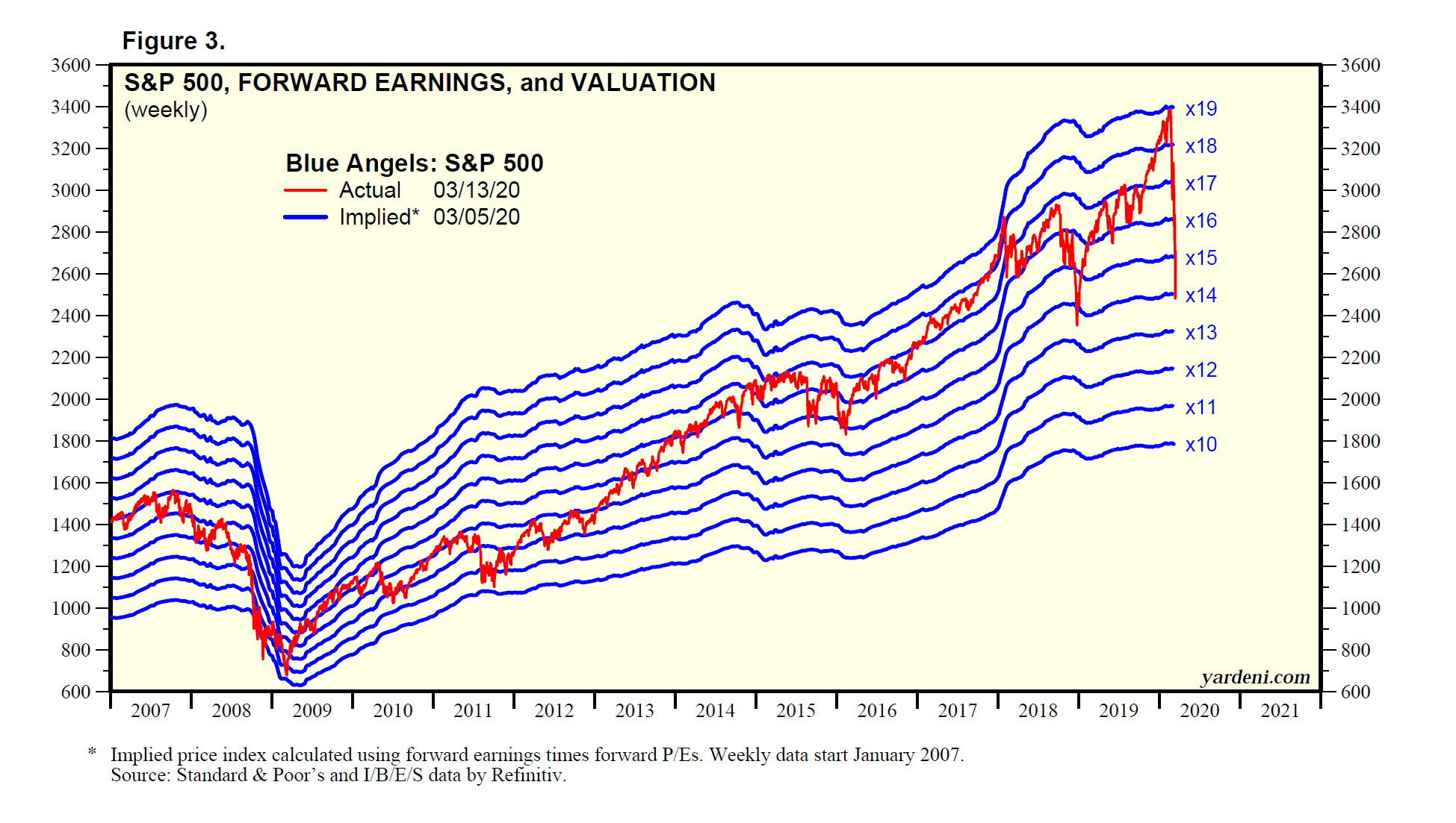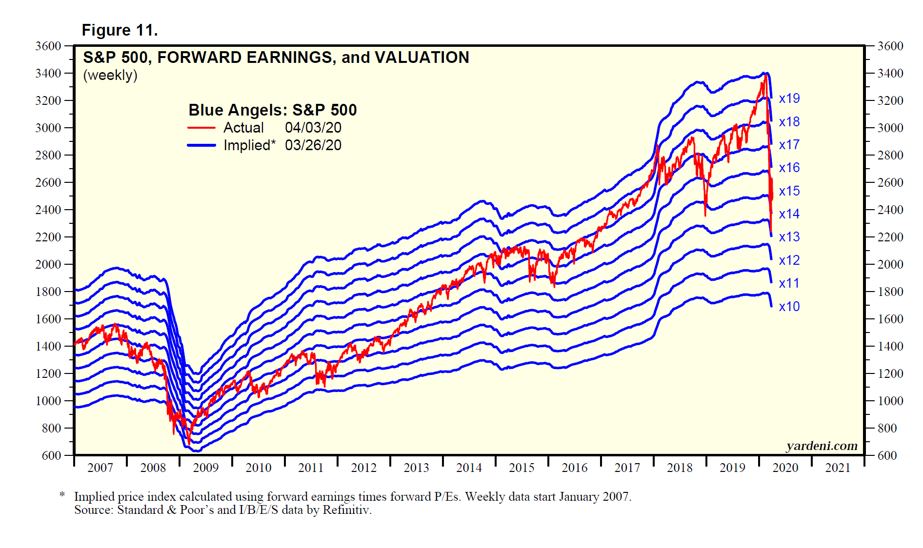Strategy II: Is the Meltup Scenario on Hold? The S&P 500 forward P/E rose to 18.4 on Thursday (Fig. 6). The peak for the current bull market so far was 18.6 on 1/23/18. It has certainly been a meltup in this P/E since it bottomed most recently at 13.5 on 12/24/18. So it is up 37.8% since then, while the S&P 500 stock price index is up 37.6%. The S&P 500 forward earnings is basically flat over the same period, as clearly demonstrated by our Blue Angels analysis (Fig. 7).