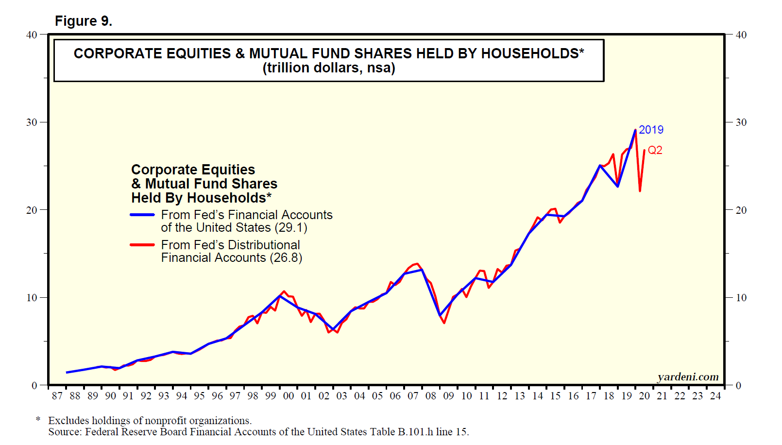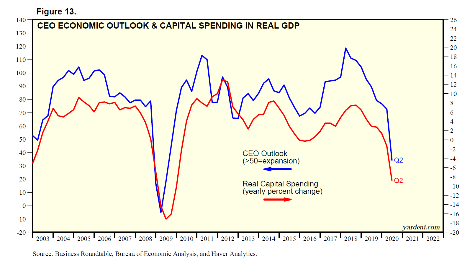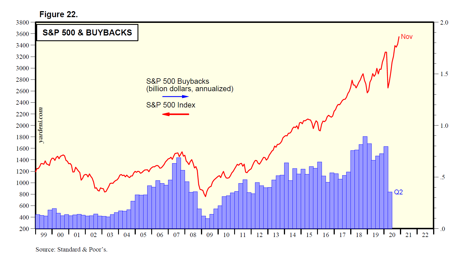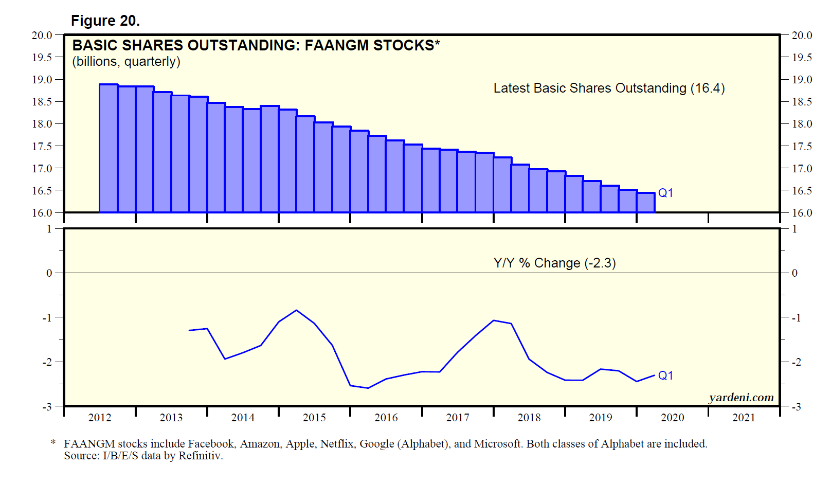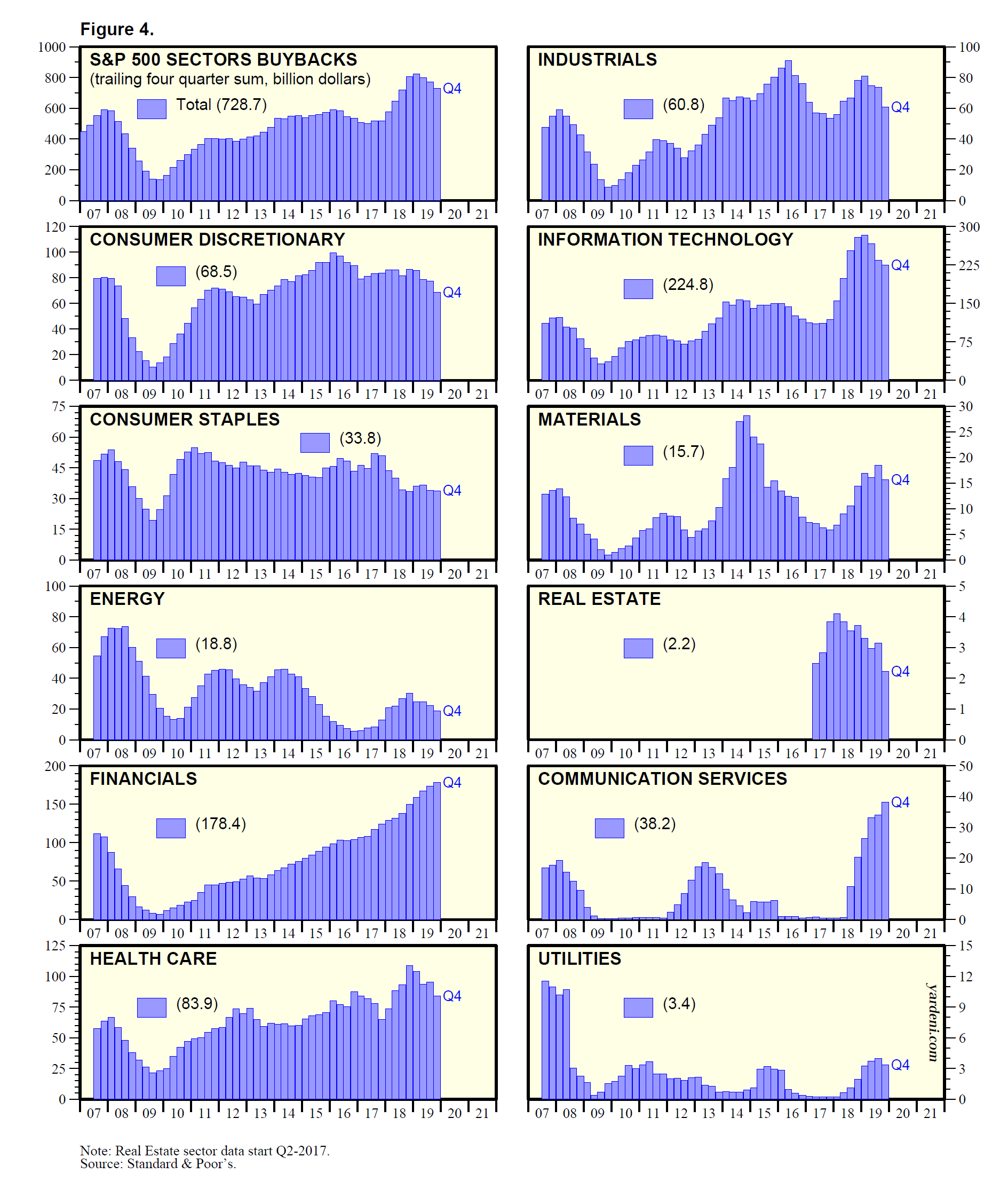 What about stock buybacks? They dropped sharply during Q2-2020 to the slowest pace since Q1-2012 (Fig. 22). In our Topical Study dated May 20, 2019 and titled “Stock Buybacks: The True Story,” Joe and I concluded: