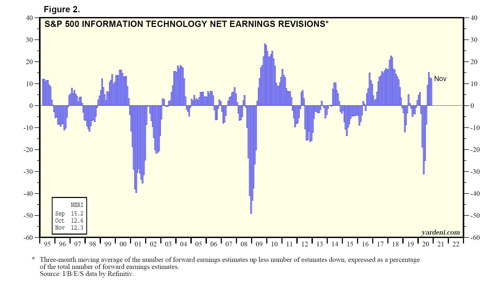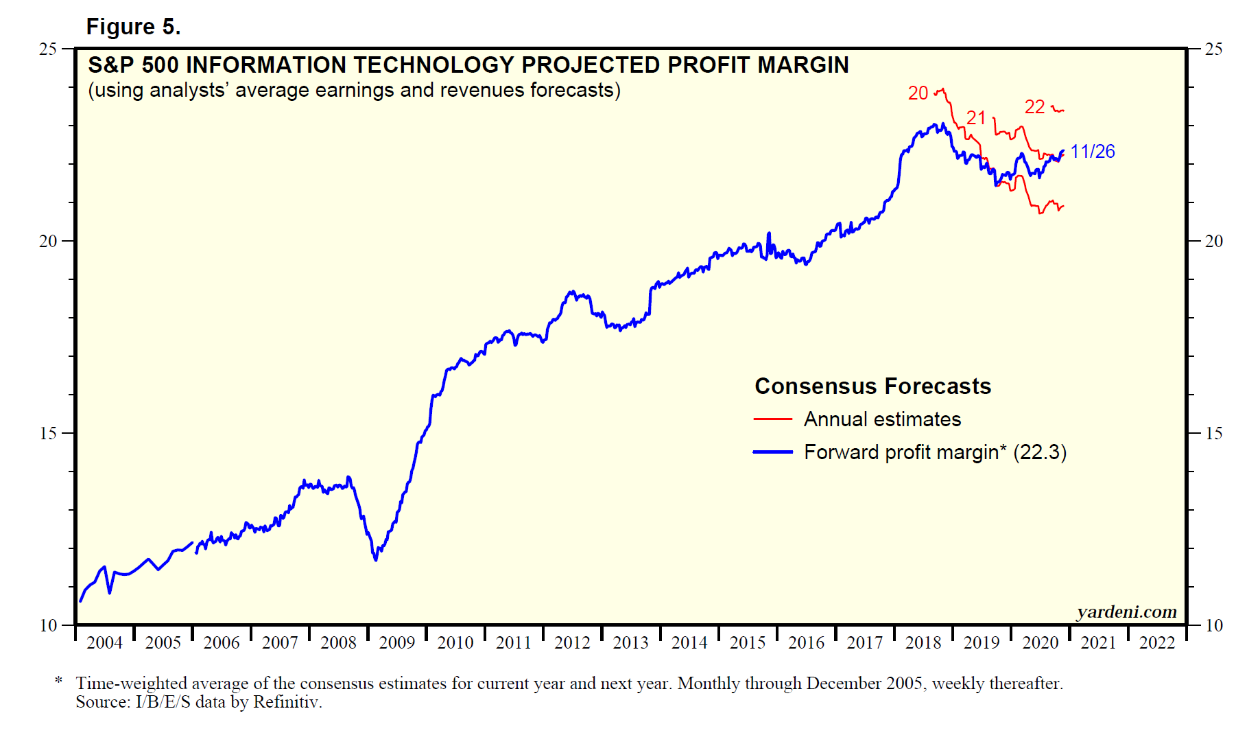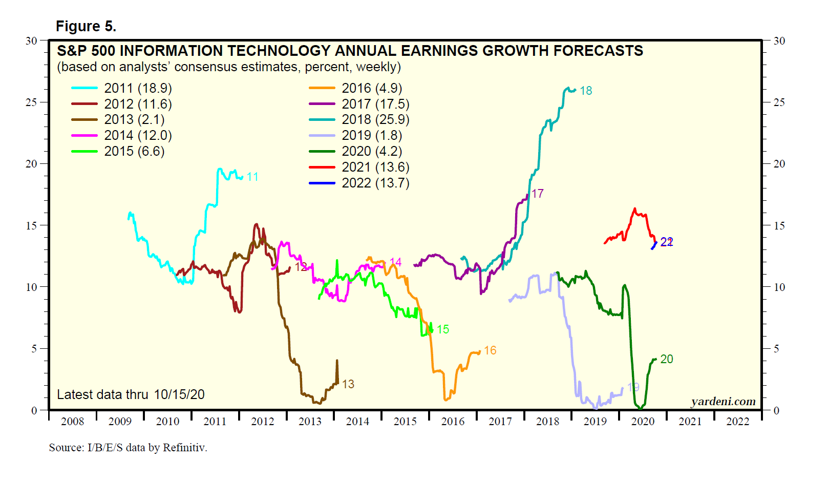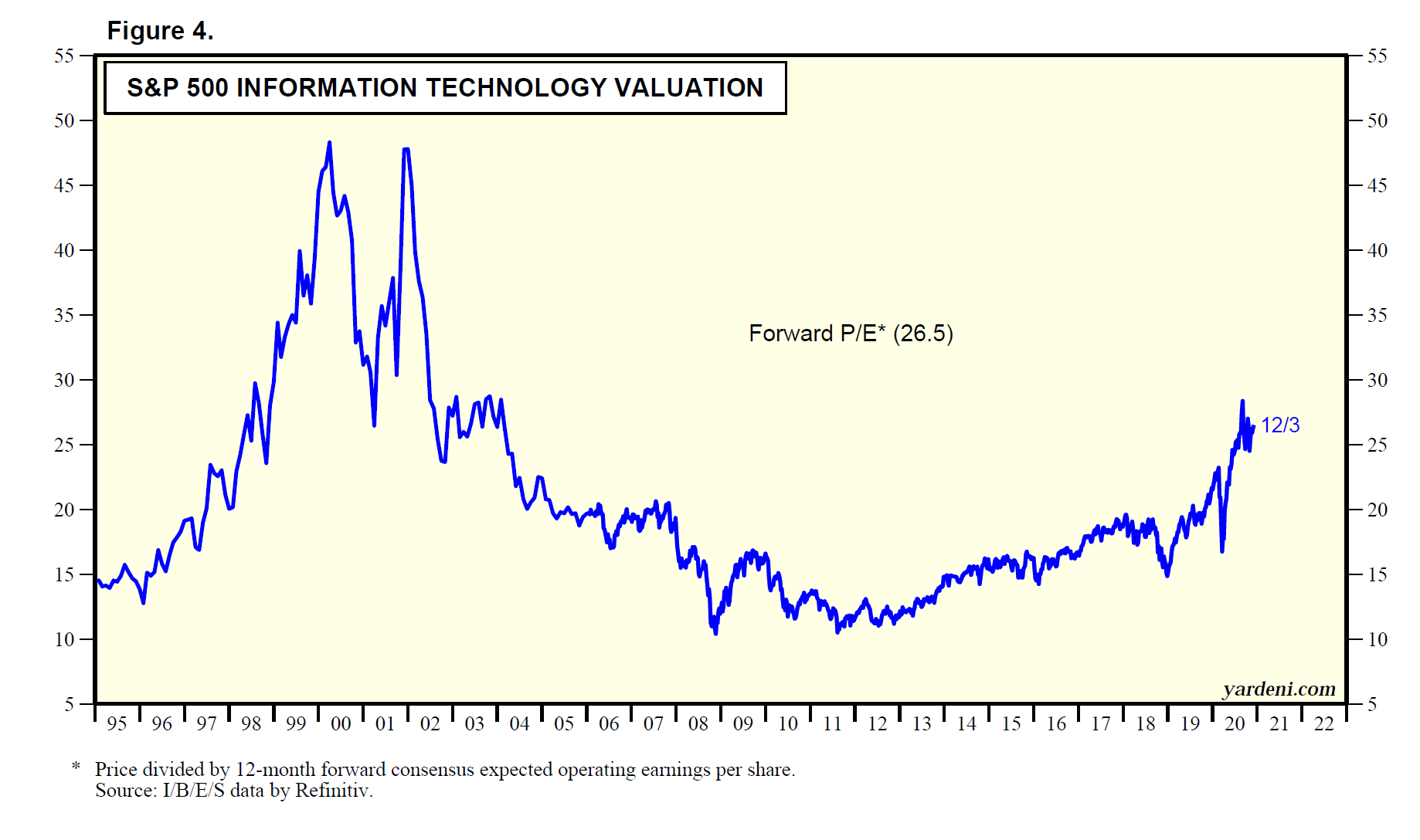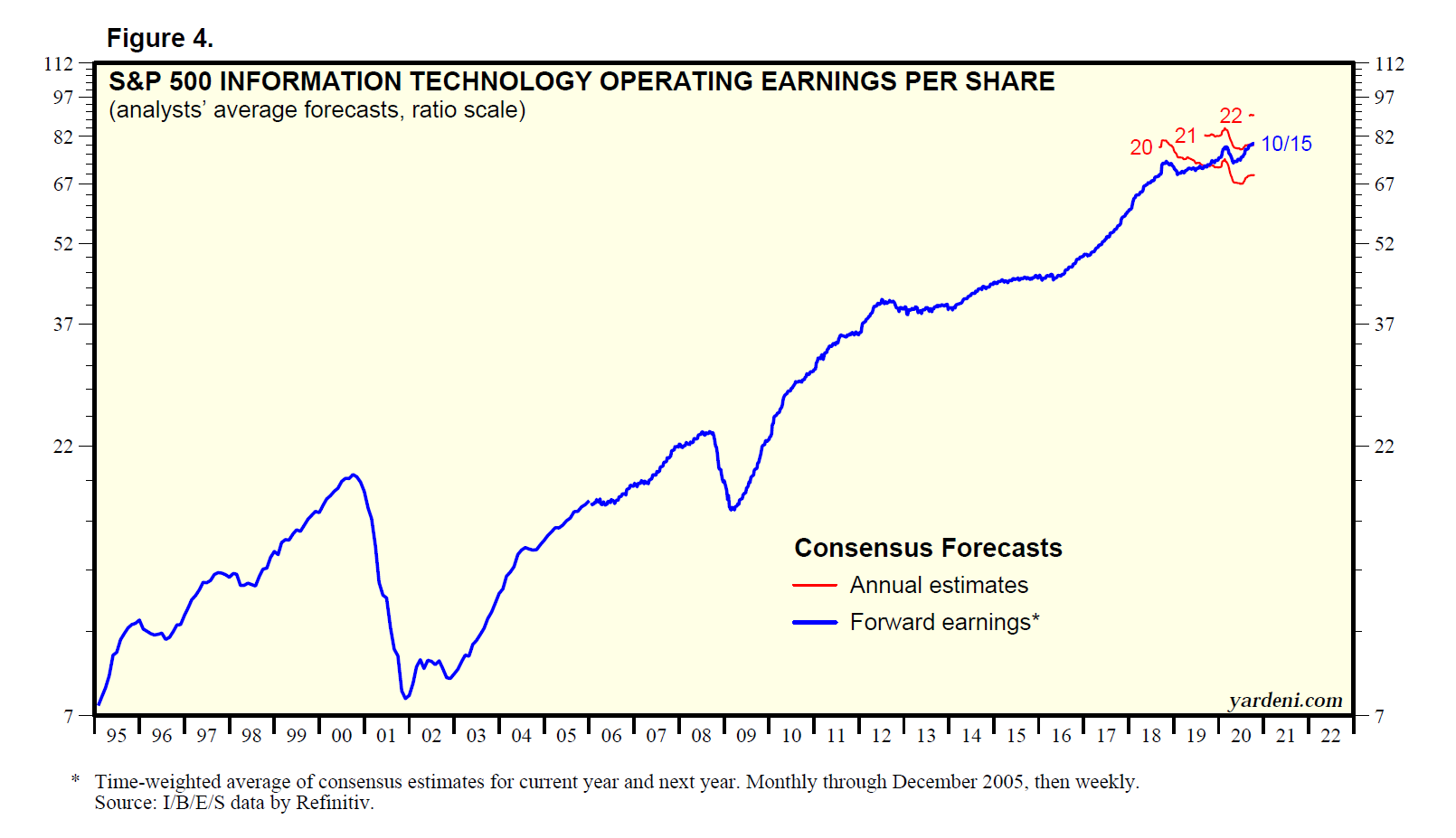 The S&P 500 Information Technology stock price index fell from September 2 through the end of October and subsequently started climbing higher once again. It’s at 2243.06 as of Wednesday’s close—a just a hair above its September high (Fig. 1). Over the past four months, the S&P 500 Information Technology sector’s net earnings revisions have been positive: 15.2% in September, 12.6% in October, and 12.3% in November (Fig. 2). Analysts are forecasting that Information Technology sector’s earnings will grow by 15.3% in 2021 and 12.5% in 2022 (Fig. 3). That has helped its forward P/E to shrink a touch to 26.5, down from its recent peak of 28.3 on September 3 (Fig. 4).