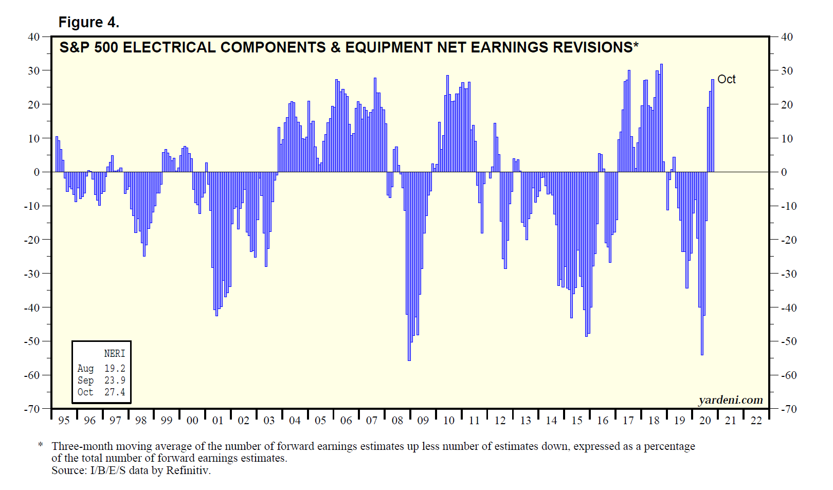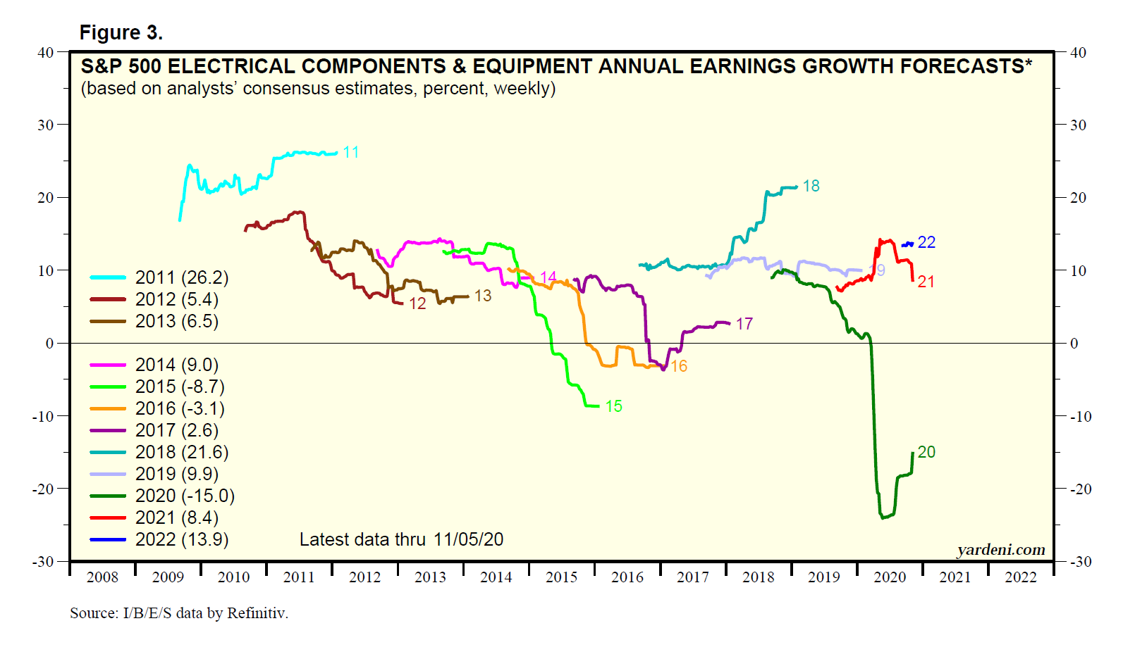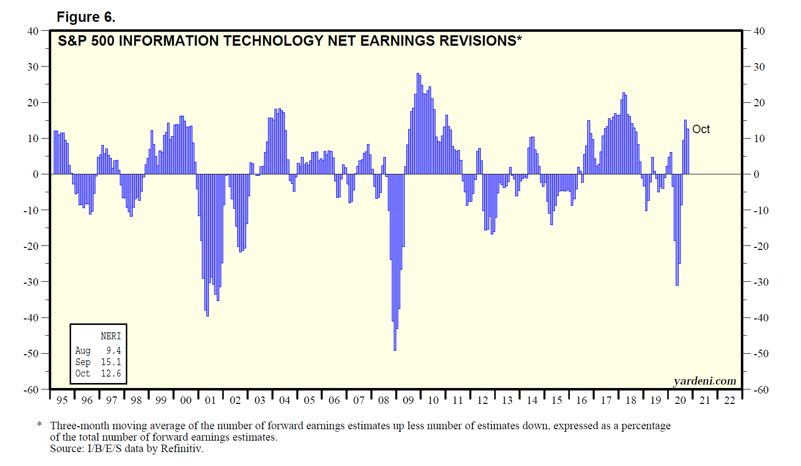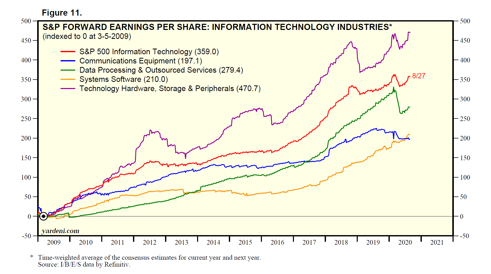 The S&P 500 Information Technology stock price index fell from September 2 through the end of October and subsequently started climbing higher once again. It’s at 2243.06 as of Wednesday’s close—a just a hair above its September high (Fig. 1). Over the past four months, the S&P 500 Information Technology sector’s net earnings revisions have been positive: 15.2% in September, 12.6% in October, and 12.3% in November (Fig. 2). Analysts are forecasting that Information Technology sector’s earnings will grow by 15.3% in 2021 and 12.5% in 2022 (Fig. 3). That has helped its forward P/E to shrink a touch to 26.5, down from its recent peak of 28.3 on September 3 (Fig. 4).
