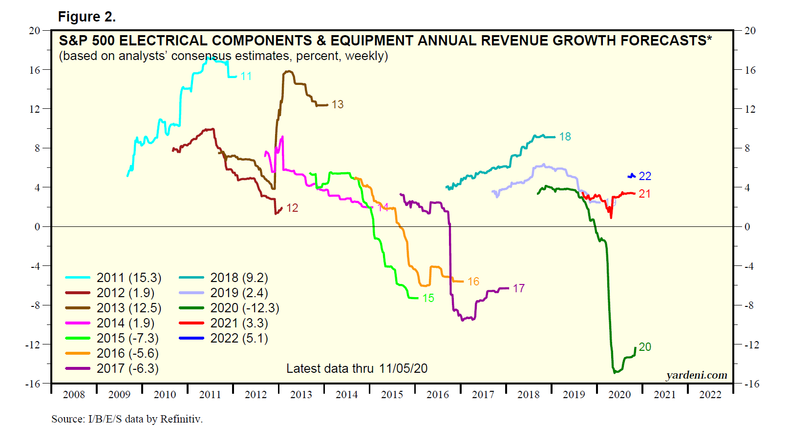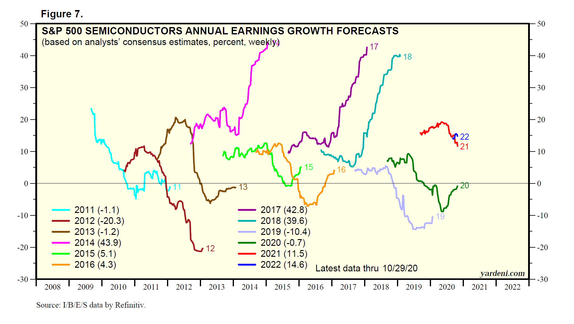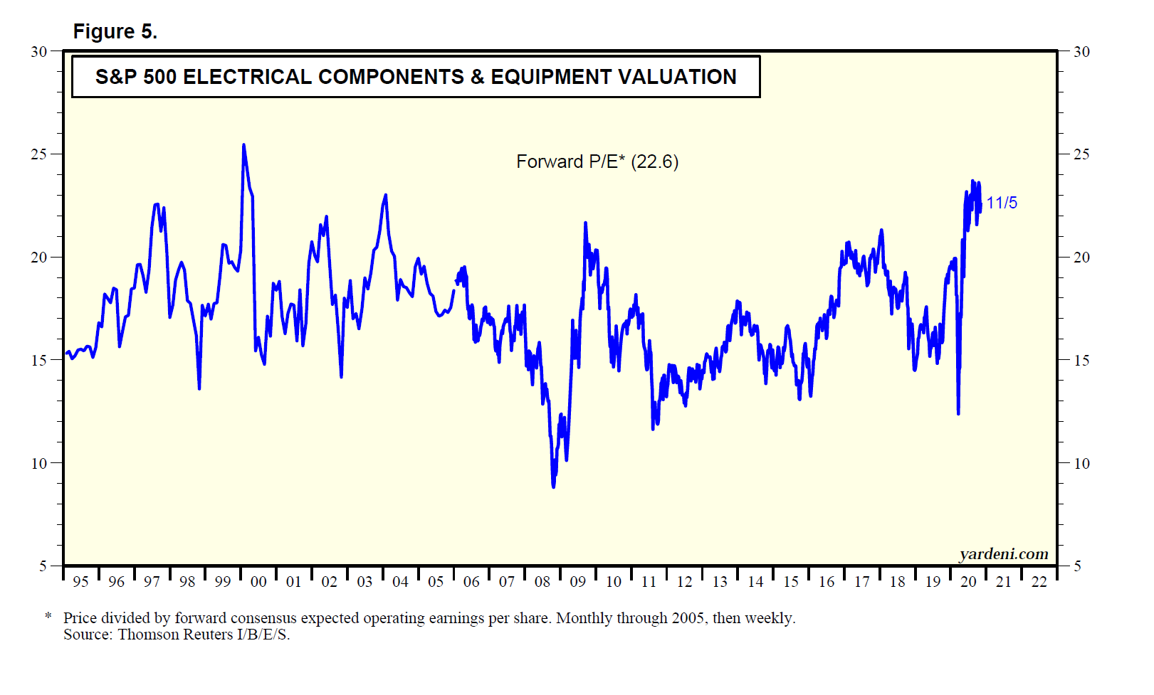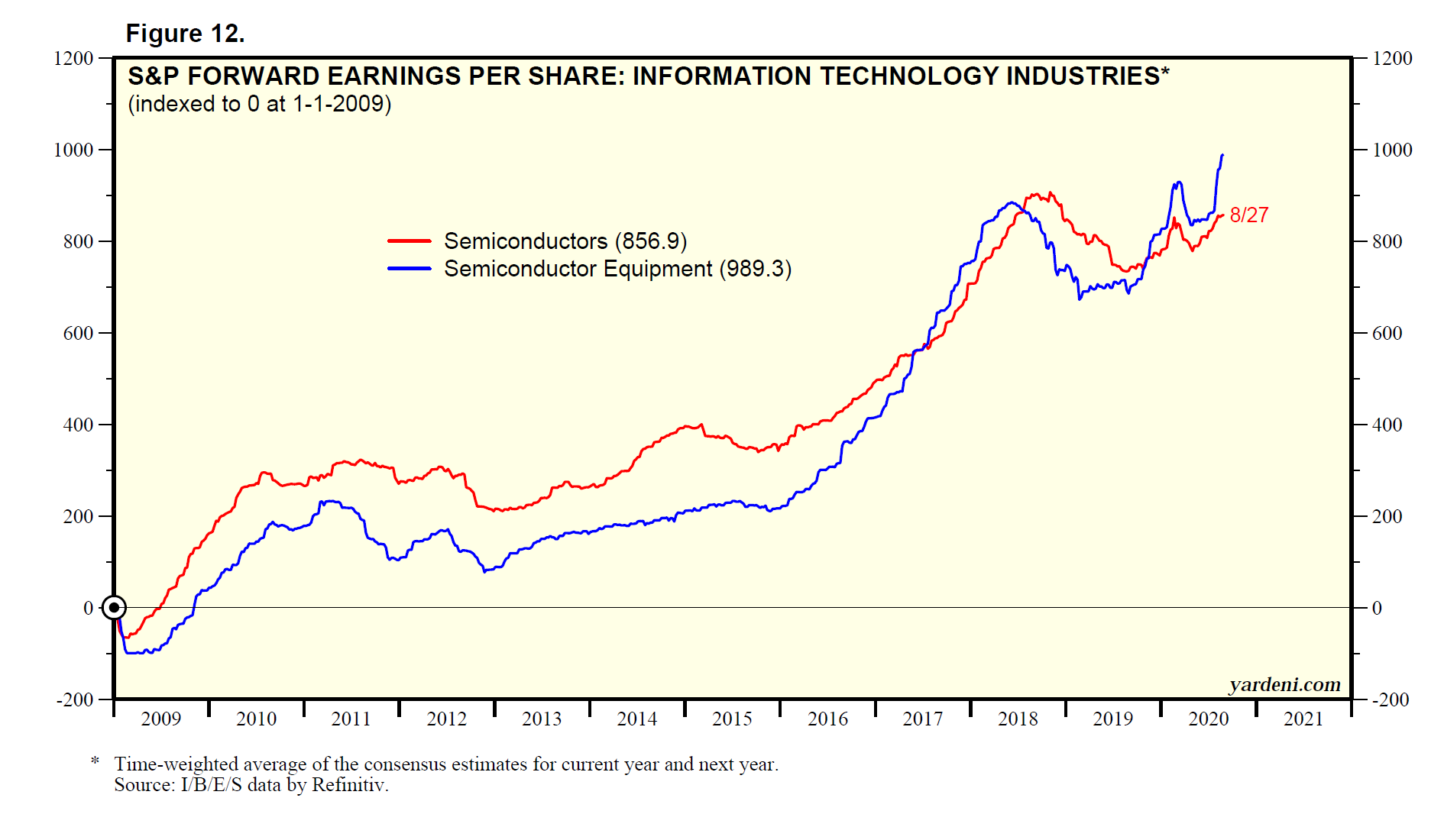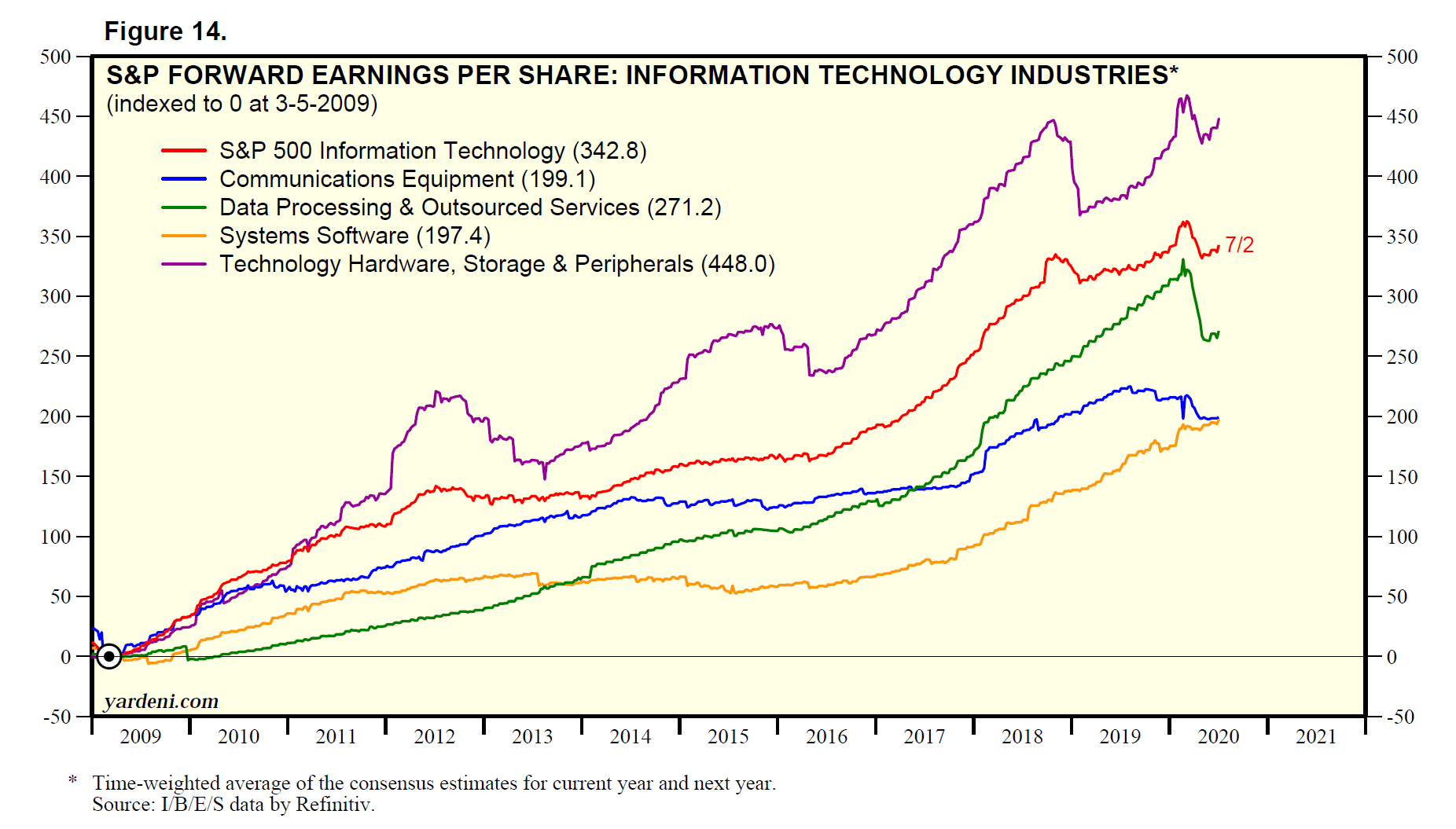 The S&P 500 Information Technology stock price index fell from September 2 through the end of October and subsequently started climbing higher once again. It’s at 2243.06 as of Wednesday’s close—a just a hair above its September high (Fig. 1). Over the past four months, the S&P 500 Information Technology sector’s net earnings revisions have been positive: 15.2% in September, 12.6% in October, and 12.3% in November (Fig. 2). Analysts are forecasting that Information Technology sector’s earnings will grow by 15.3% in 2021 and 12.5% in 2022 (Fig. 3). That has helped its forward P/E to shrink a touch to 26.5, down from its recent peak of 28.3 on September 3 (Fig. 4).