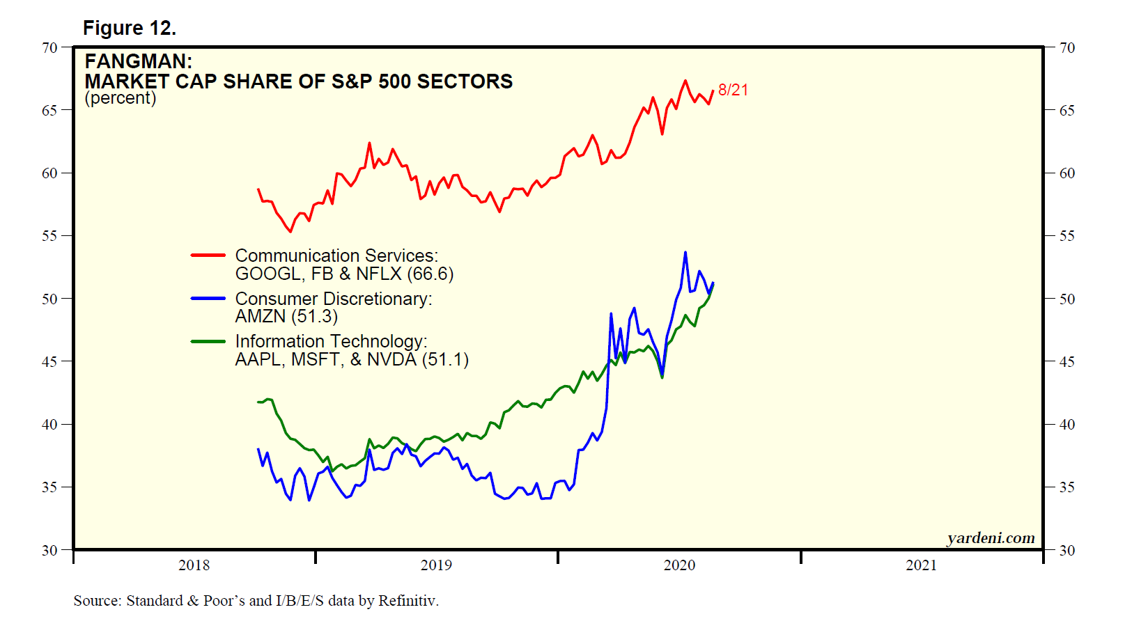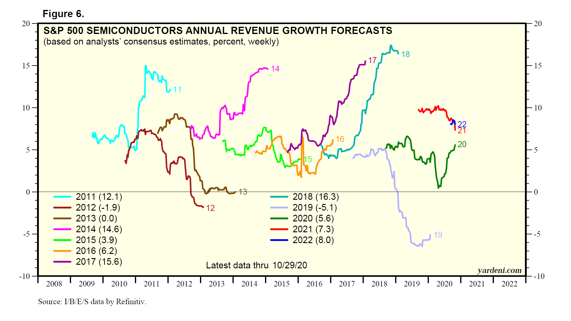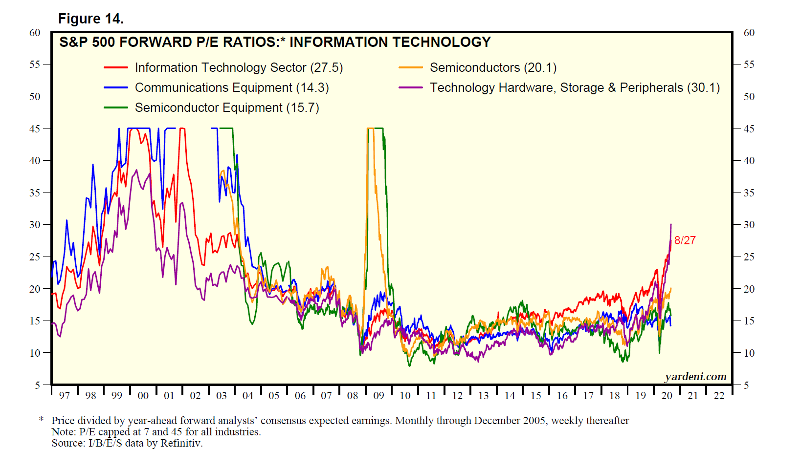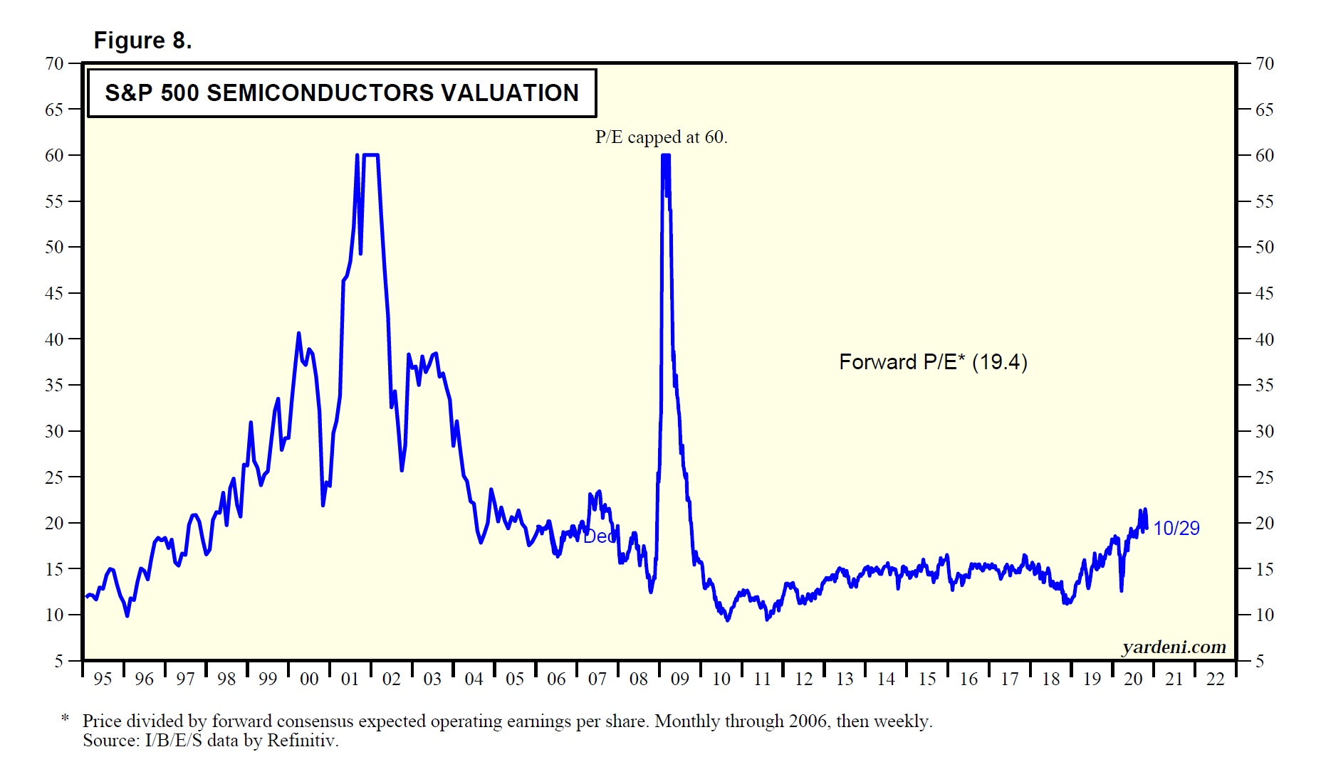 The S&P 500 Information Technology stock price index fell from September 2 through the end of October and subsequently started climbing higher once again. It’s at 2243.06 as of Wednesday’s close—a just a hair above its September high (Fig. 1). Over the past four months, the S&P 500 Information Technology sector’s net earnings revisions have been positive: 15.2% in September, 12.6% in October, and 12.3% in November (Fig. 2). Analysts are forecasting that Information Technology sector’s earnings will grow by 15.3% in 2021 and 12.5% in 2022 (Fig. 3). That has helped its forward P/E to shrink a touch to 26.5, down from its recent peak of 28.3 on September 3 (Fig. 4).