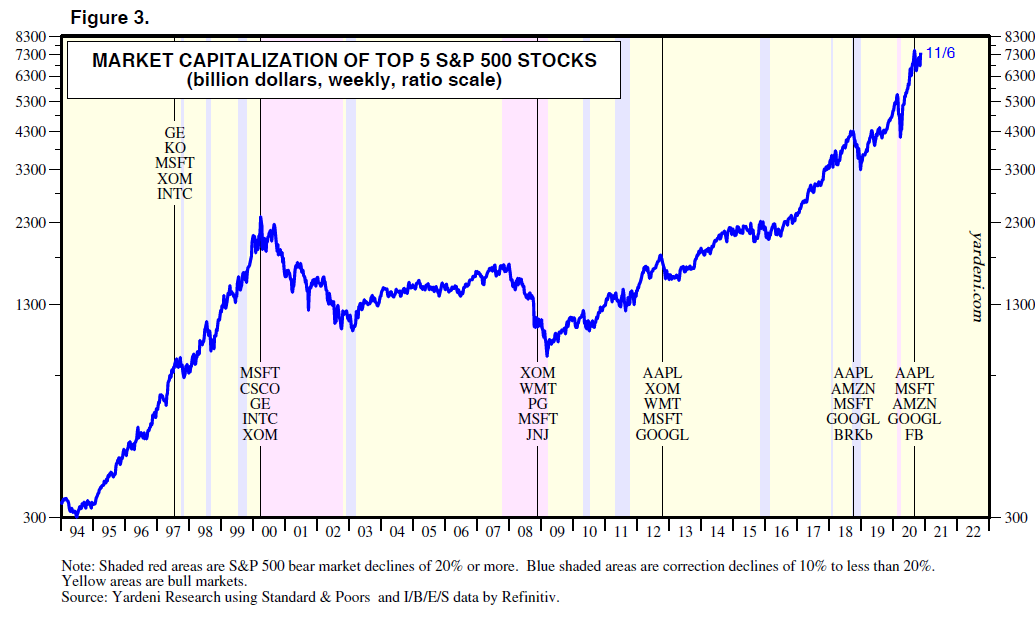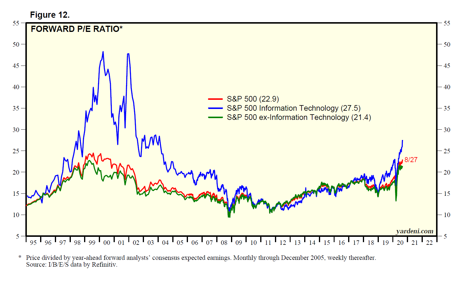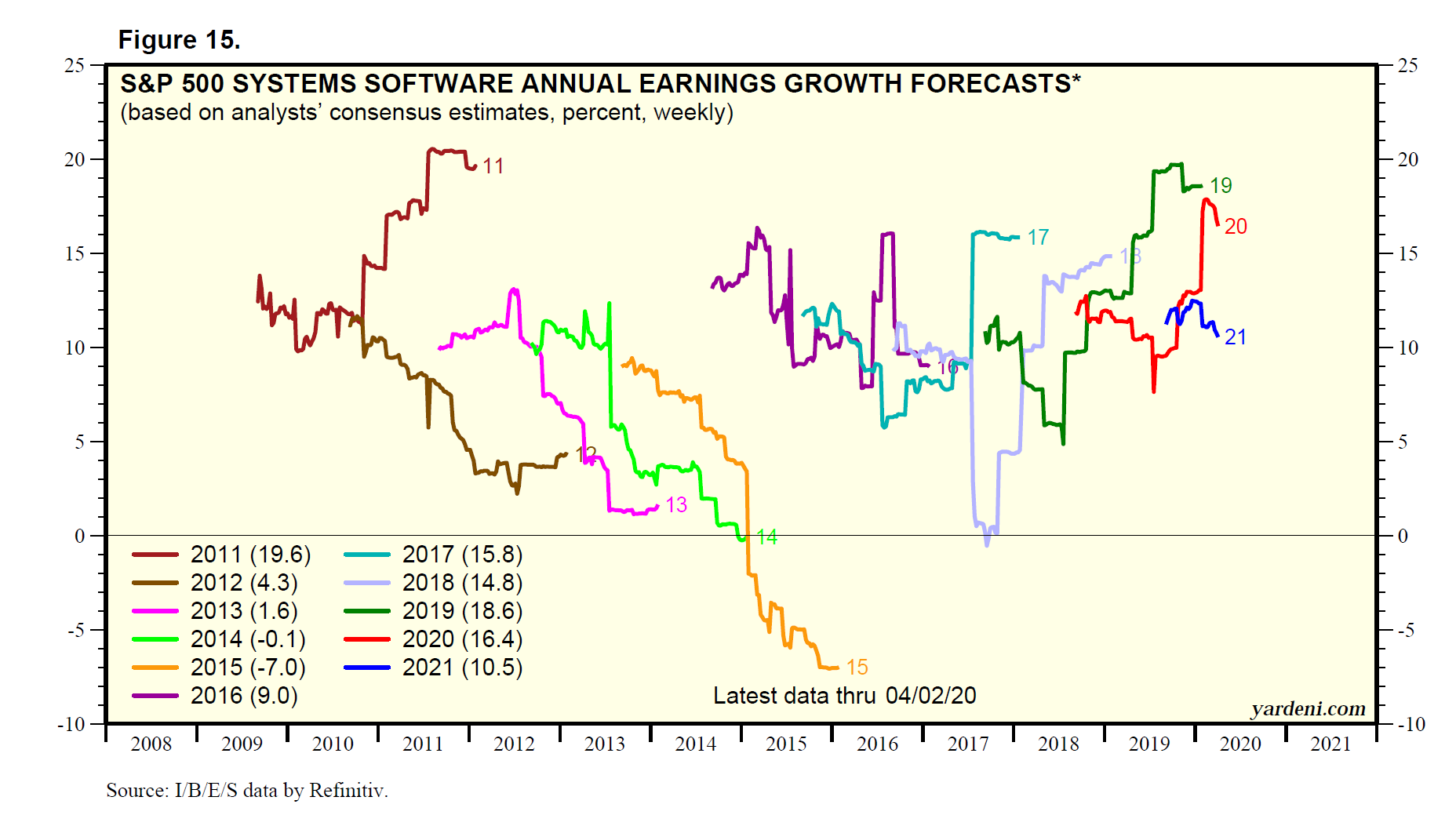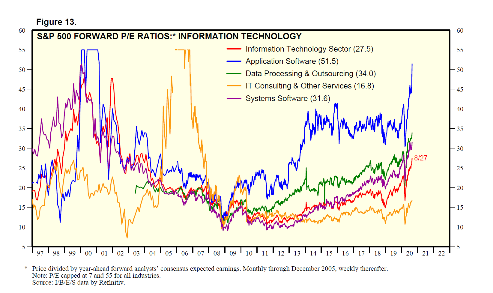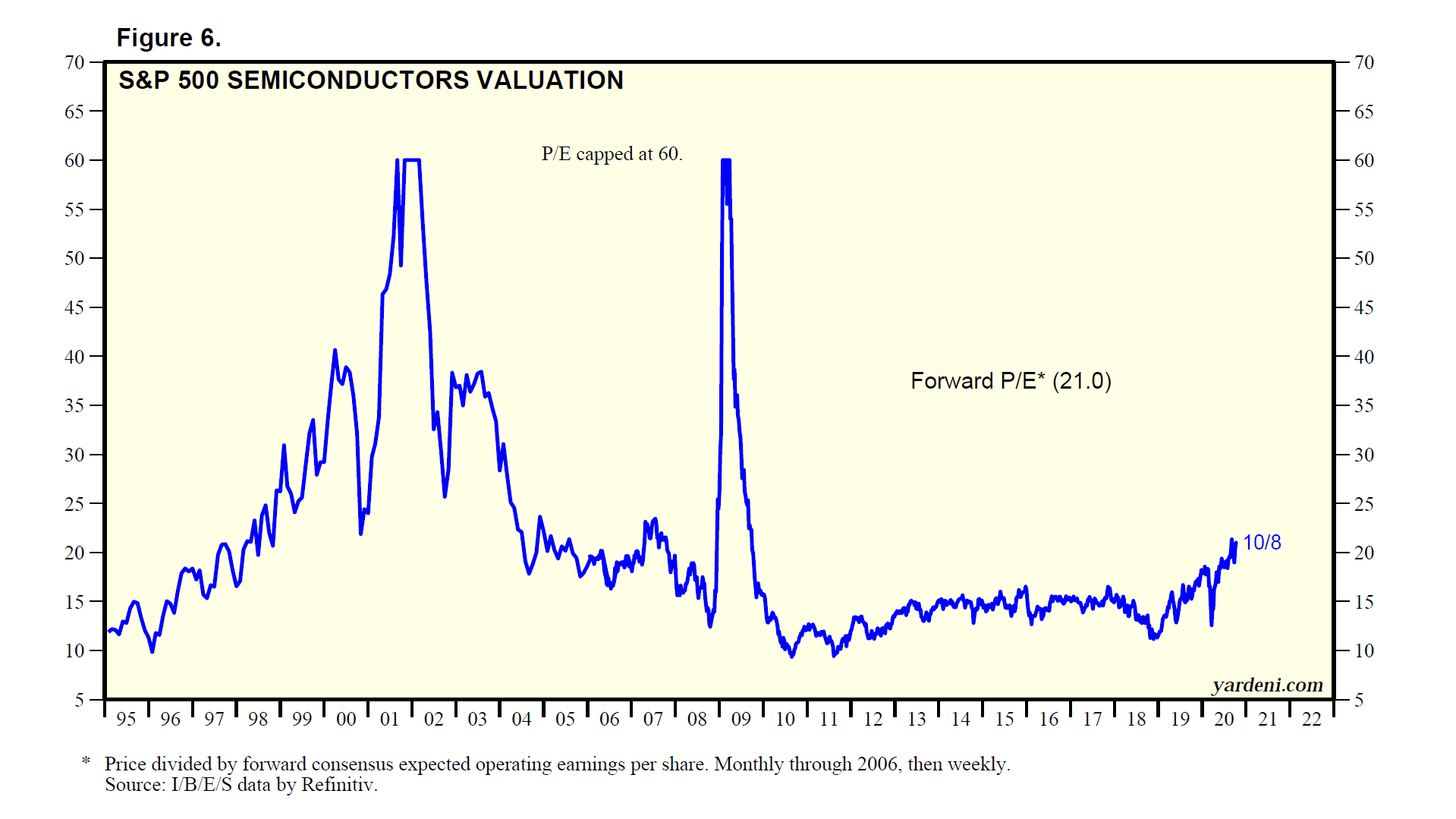 The S&P 500 Information Technology stock price index fell from September 2 through the end of October and subsequently started climbing higher once again. It’s at 2243.06 as of Wednesday’s close—a just a hair above its September high (Fig. 1). Over the past four months, the S&P 500 Information Technology sector’s net earnings revisions have been positive: 15.2% in September, 12.6% in October, and 12.3% in November (Fig. 2). Analysts are forecasting that Information Technology sector’s earnings will grow by 15.3% in 2021 and 12.5% in 2022 (Fig. 3). That has helped its forward P/E to shrink a touch to 26.5, down from its recent peak of 28.3 on September 3 (Fig. 4).