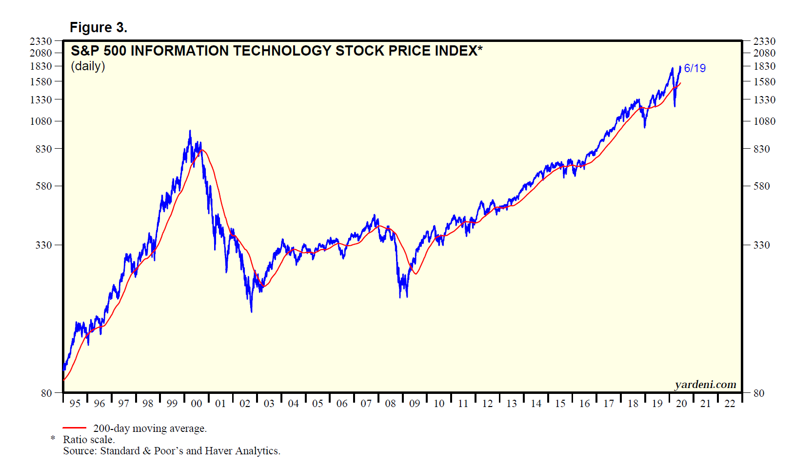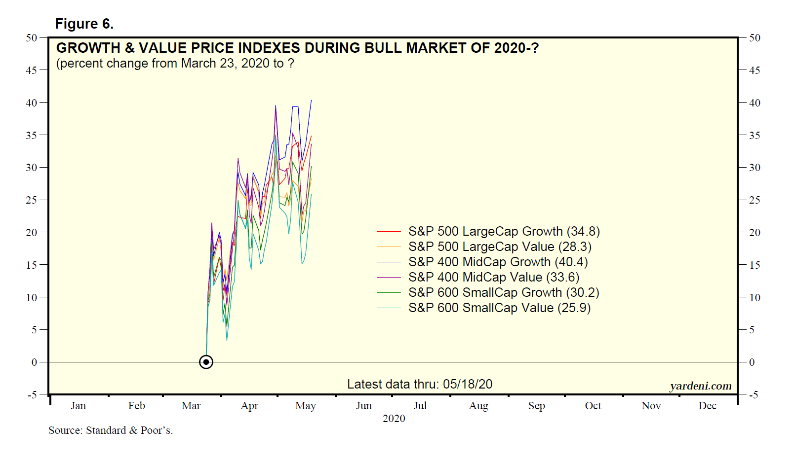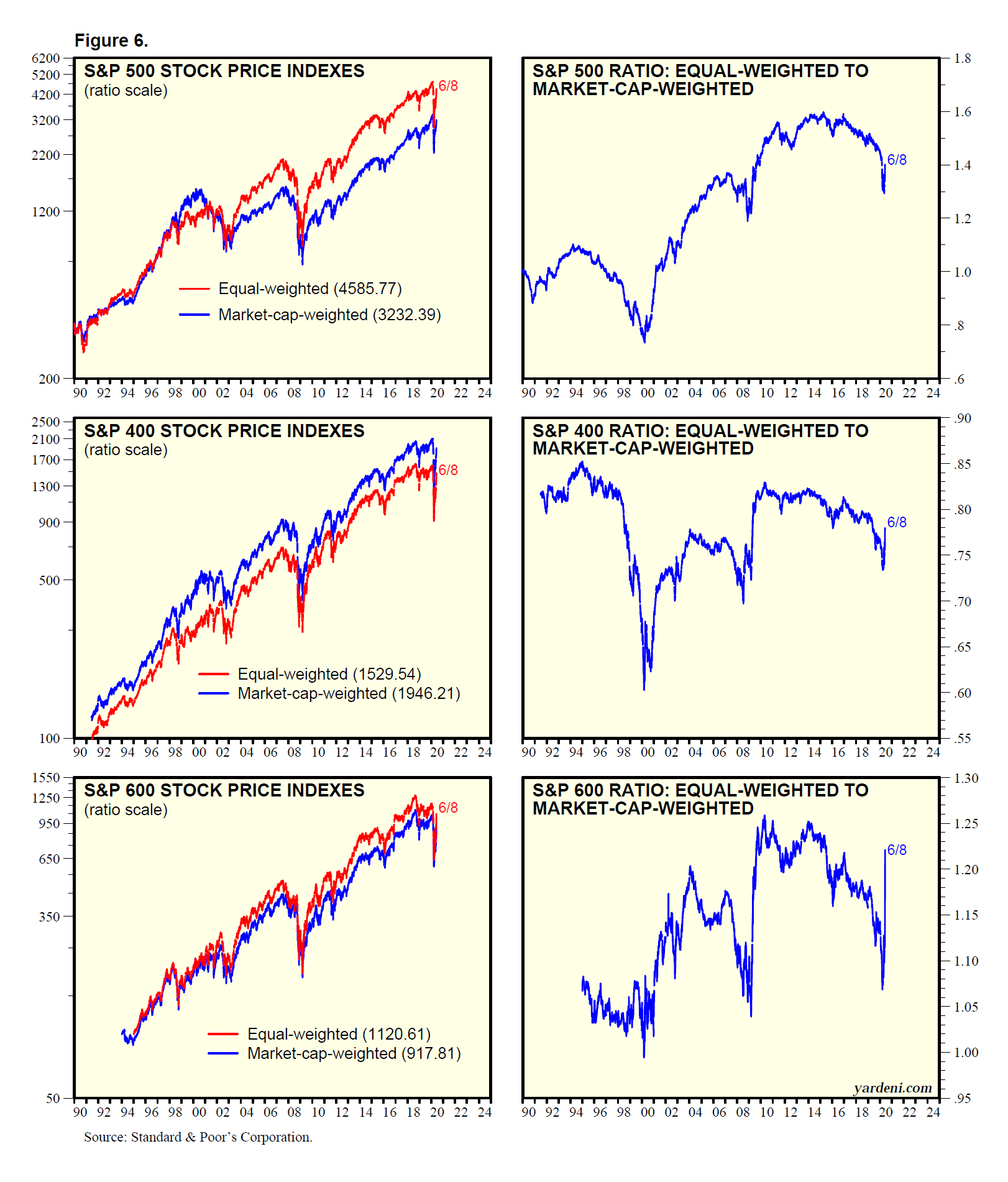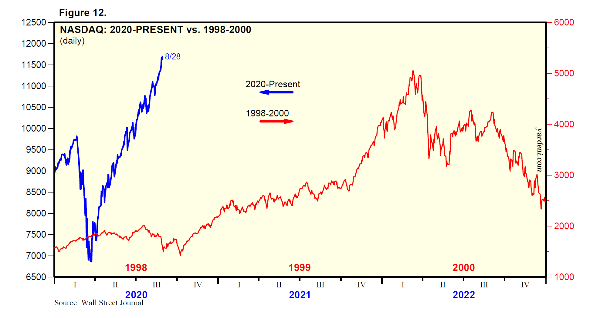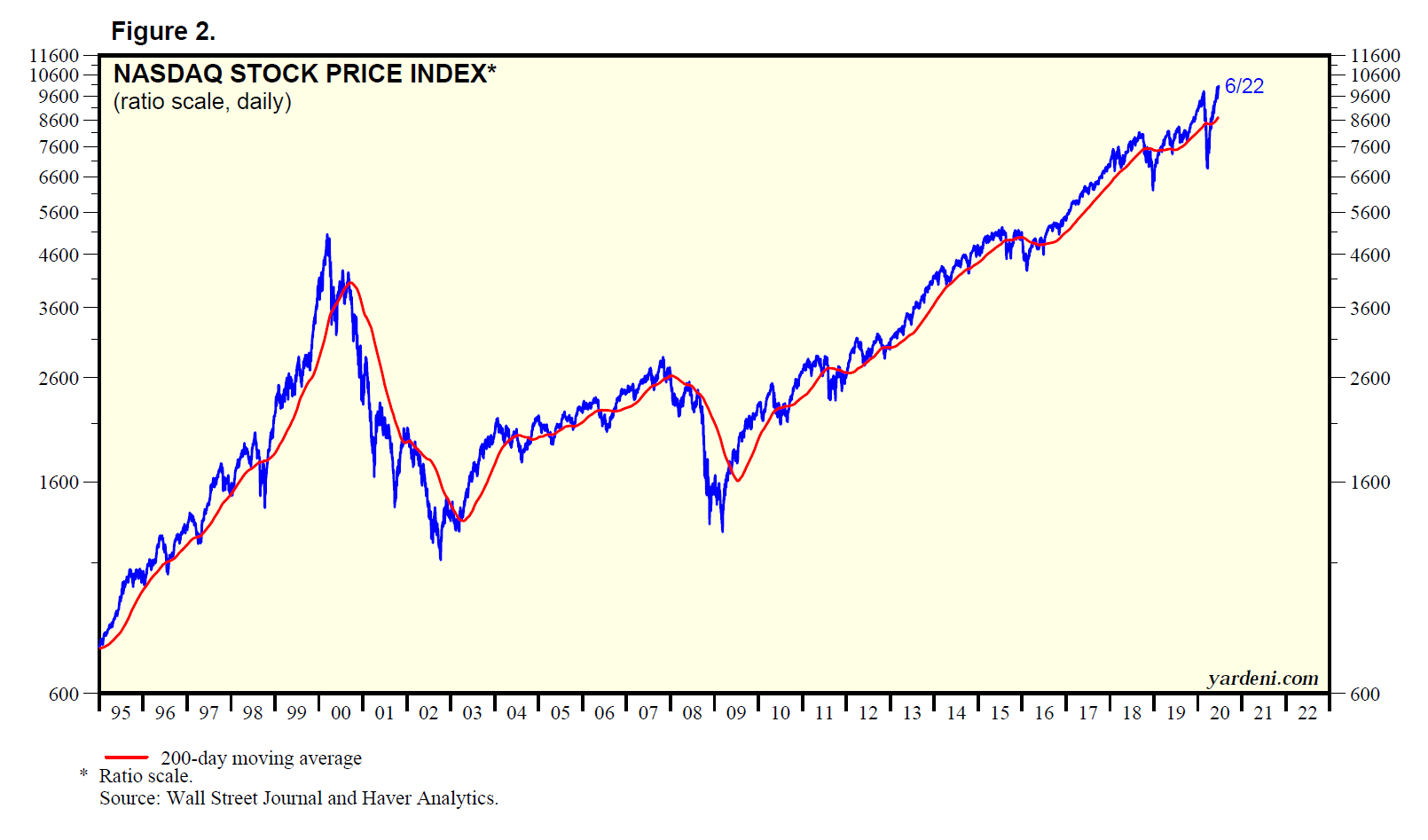 We will become more concerned about the latter scenarios if the market continues to go straight up and investors “party like it’s 1999” all over again, to quote the singer Prince. Following the LTCM crisis, the S&P 500 and the Nasdaq soared 59.6% and 236.7% from the end of August 1998 through March 2000. So far, since the pandemic low on March 23, they are up 63.7% and 80.4% through Friday’s close (Fig. 3).