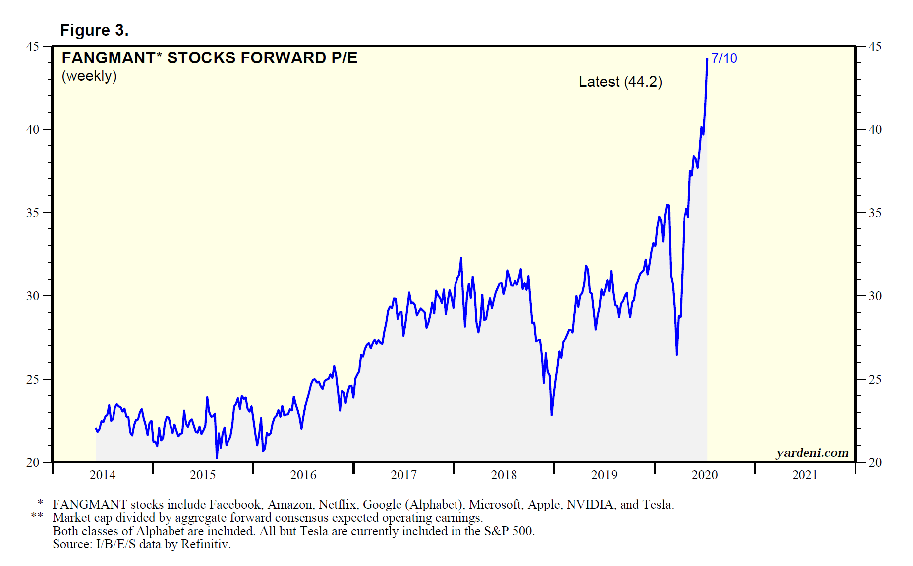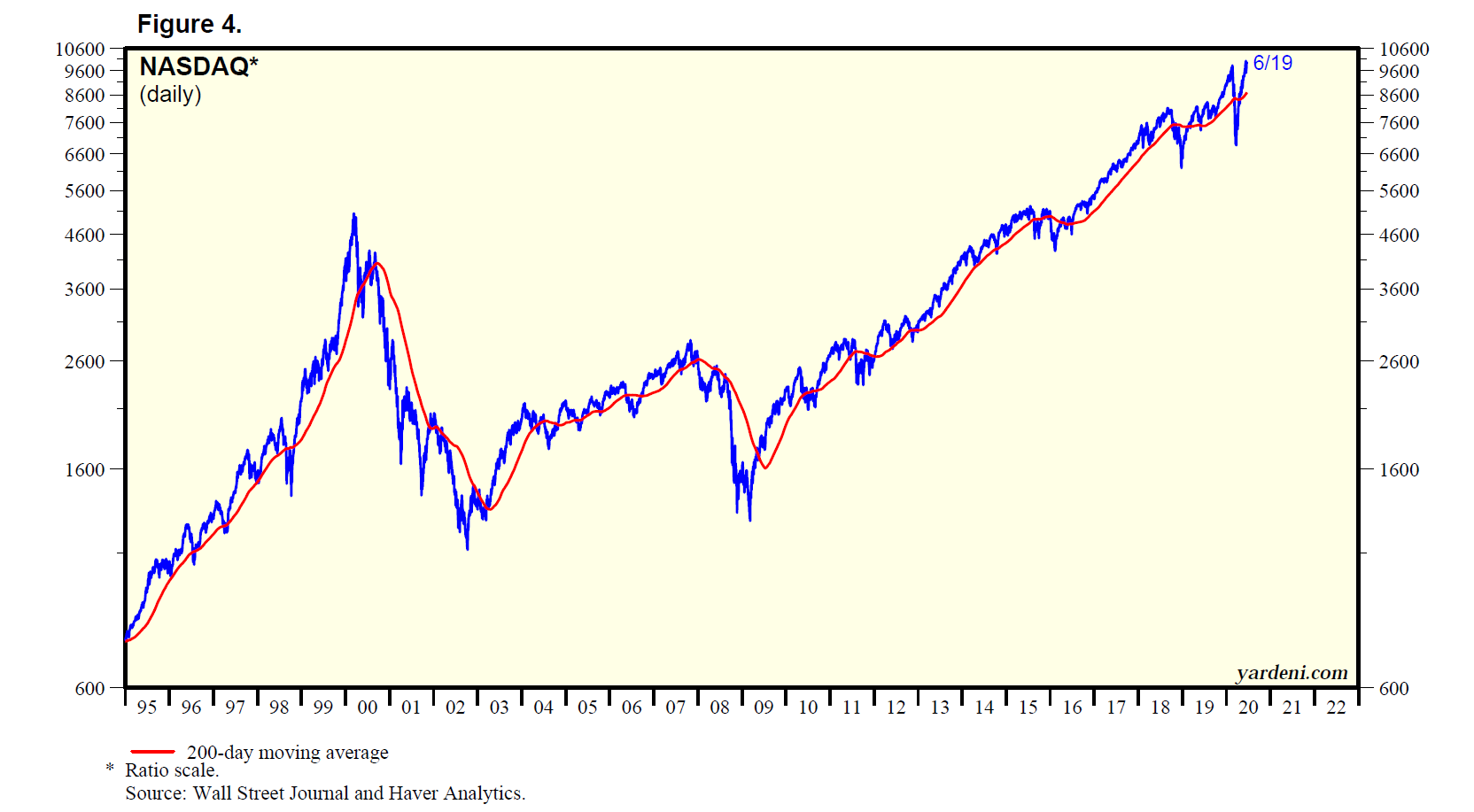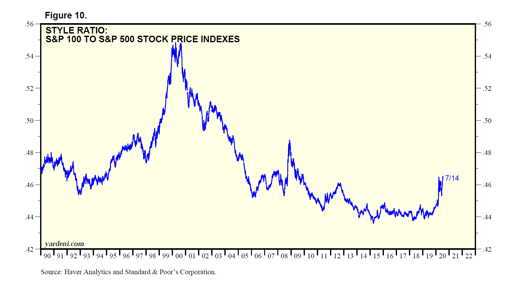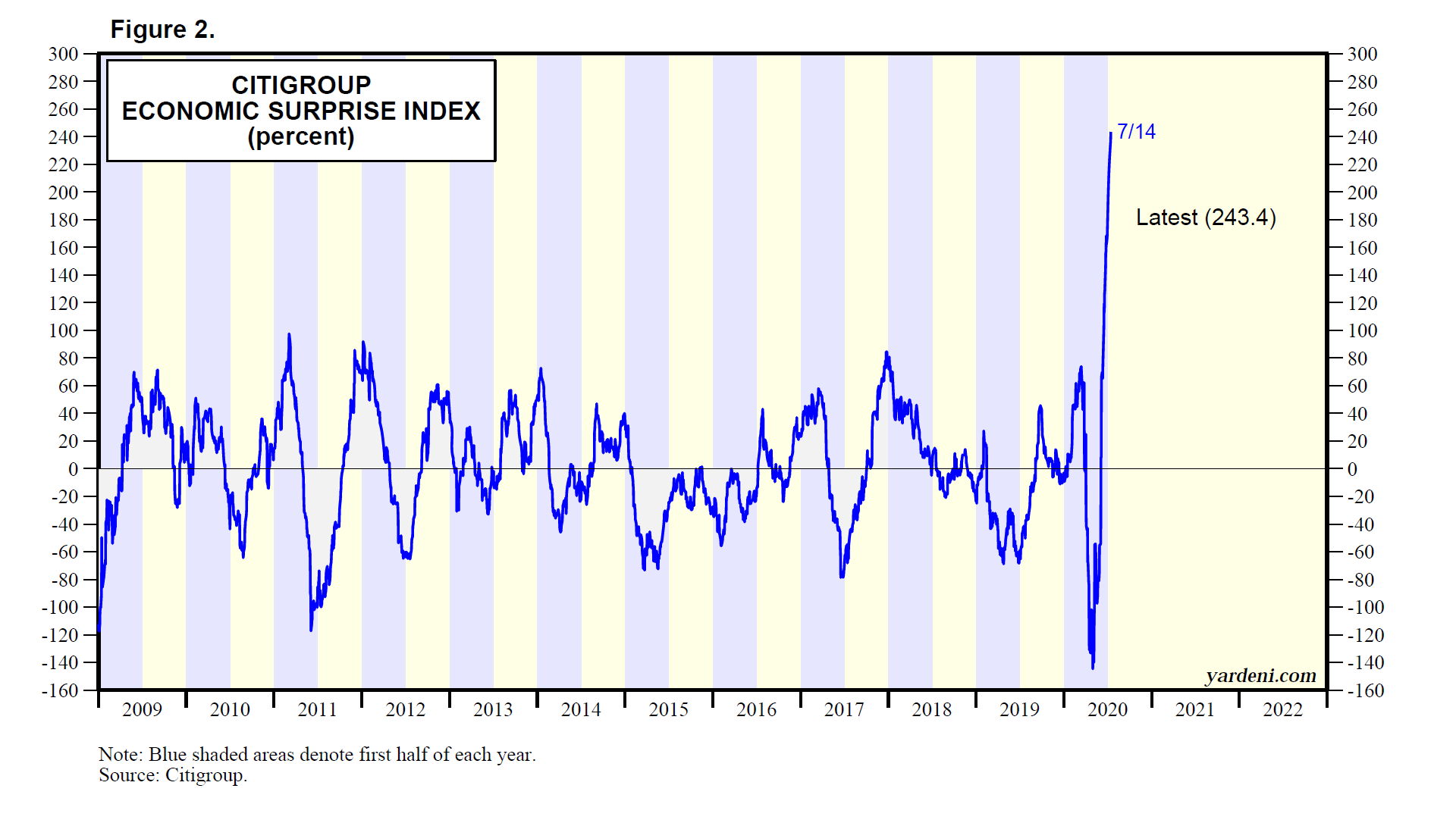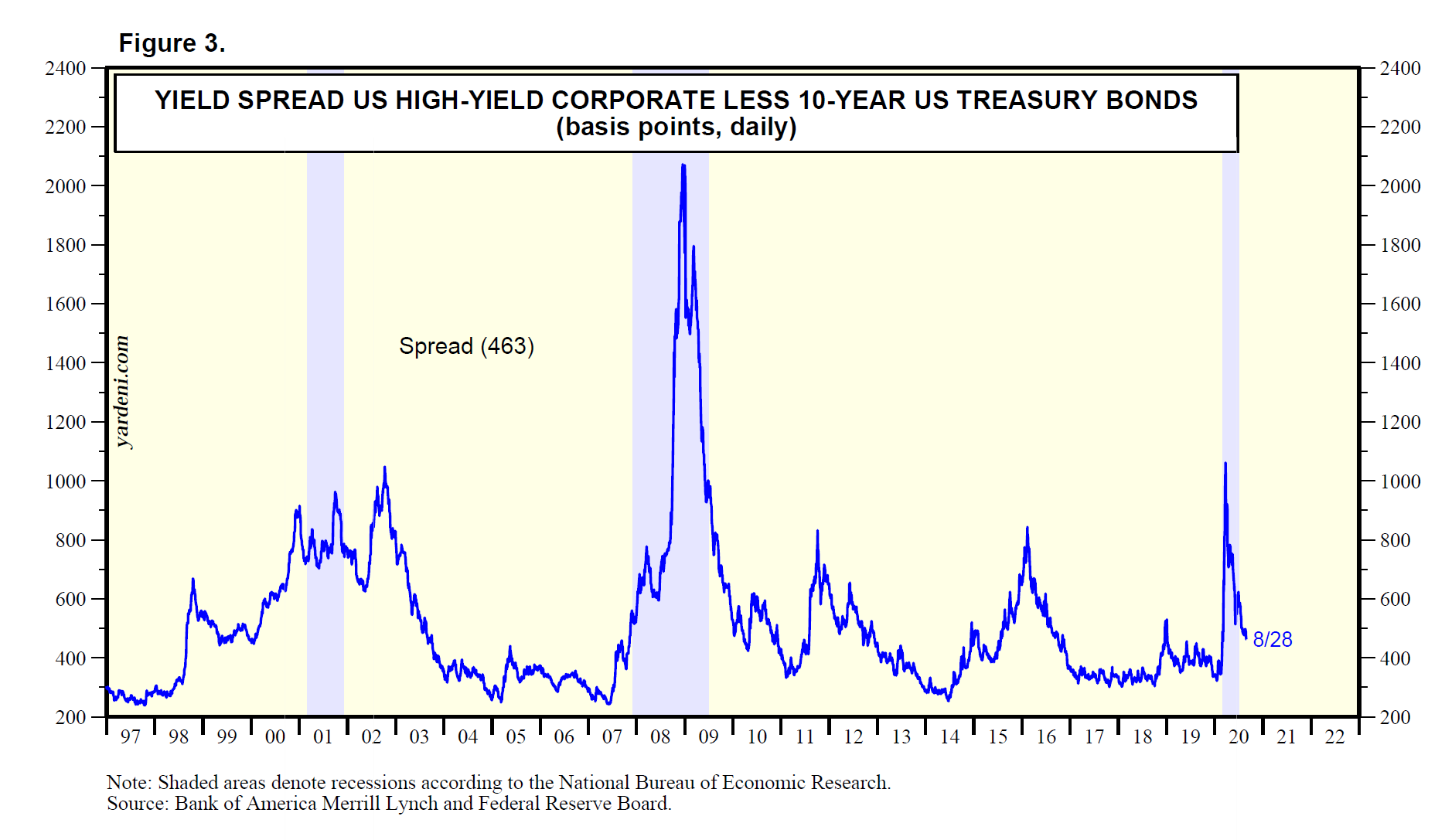 We will become more concerned about the latter scenarios if the market continues to go straight up and investors “party like it’s 1999” all over again, to quote the singer Prince. Following the LTCM crisis, the S&P 500 and the Nasdaq soared 59.6% and 236.7% from the end of August 1998 through March 2000. So far, since the pandemic low on March 23, they are up 63.7% and 80.4% through Friday’s close (Fig. 3).