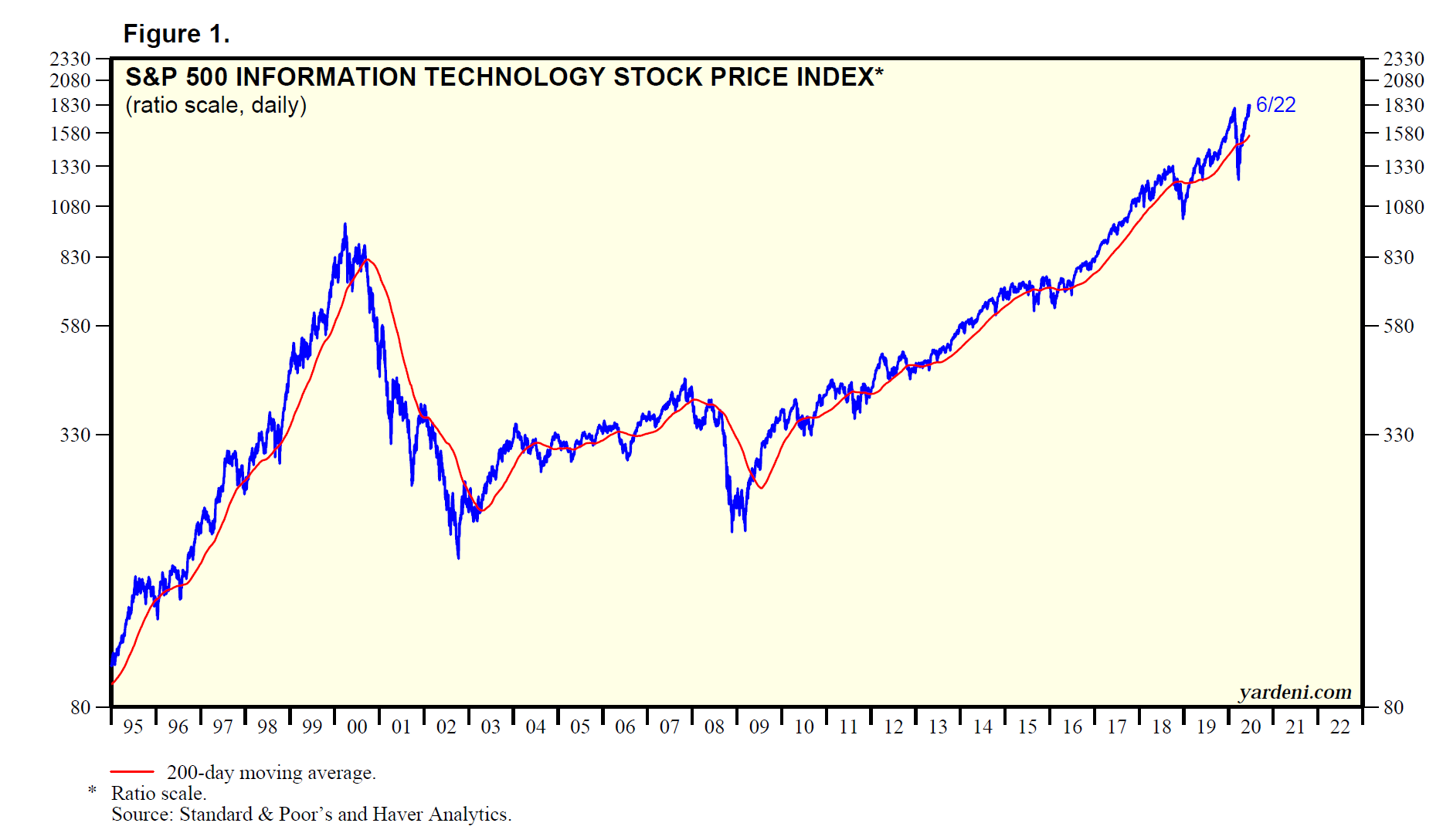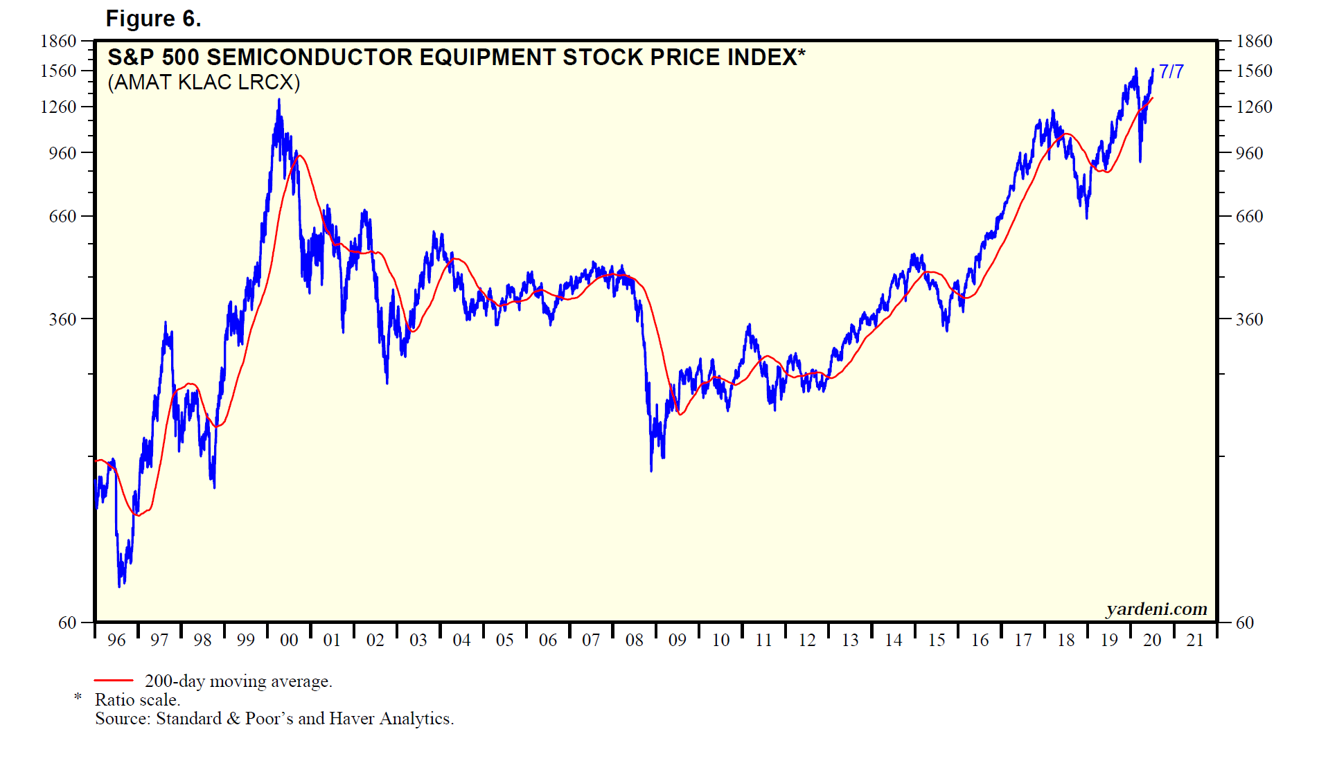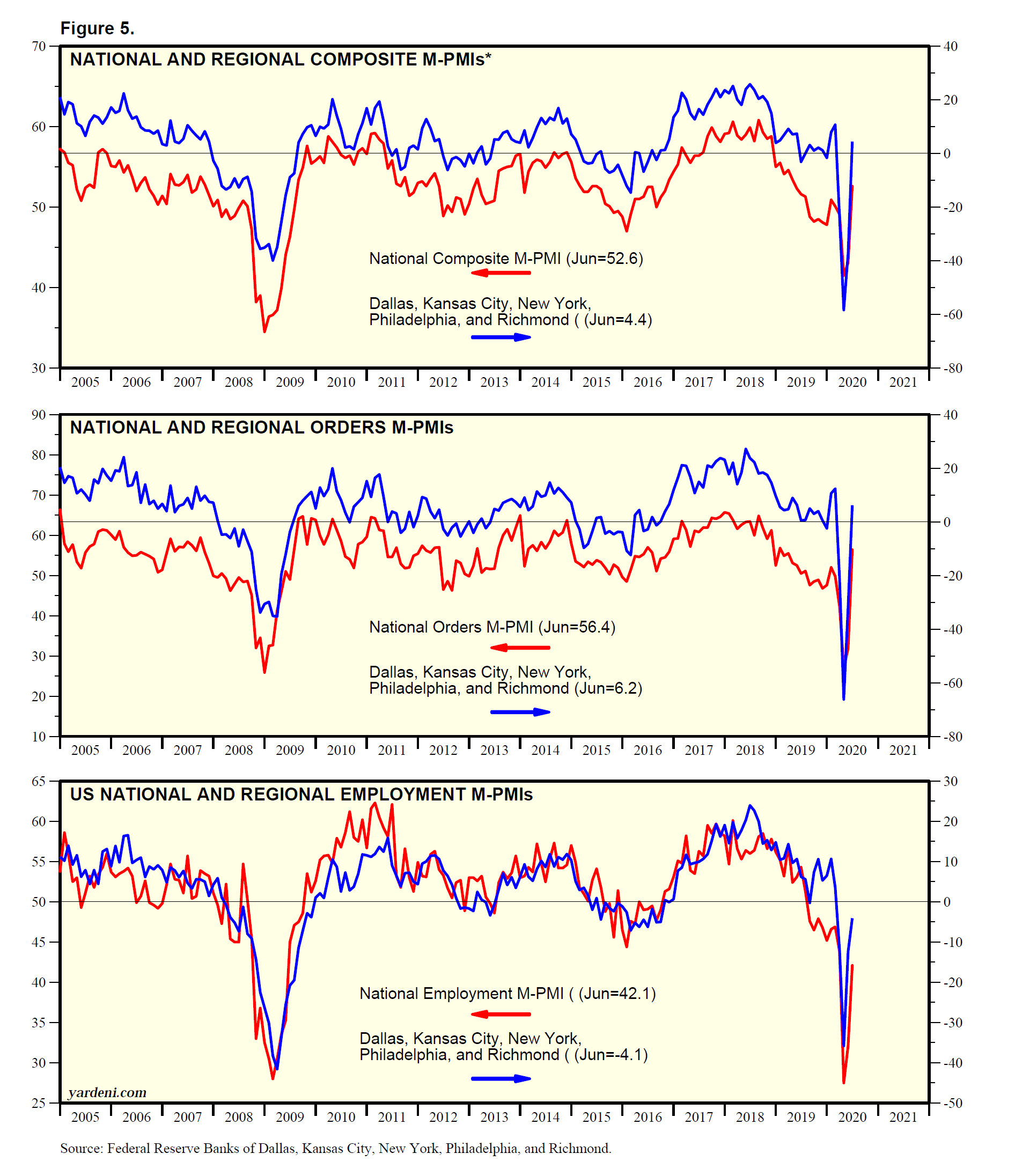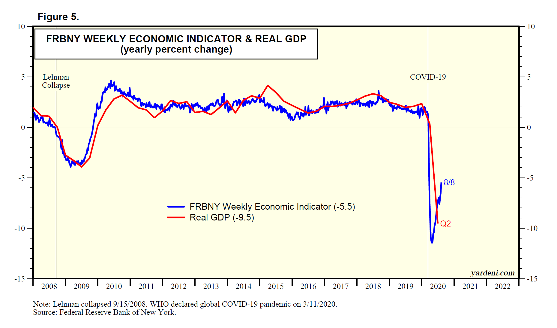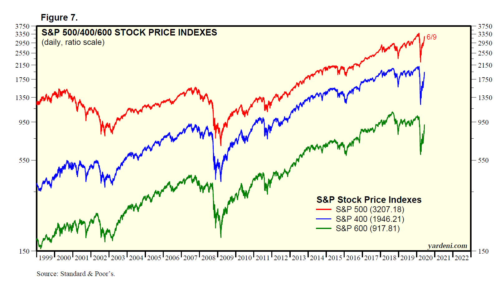 We will become more concerned about the latter scenarios if the market continues to go straight up and investors “party like it’s 1999” all over again, to quote the singer Prince. Following the LTCM crisis, the S&P 500 and the Nasdaq soared 59.6% and 236.7% from the end of August 1998 through March 2000. So far, since the pandemic low on March 23, they are up 63.7% and 80.4% through Friday’s close (Fig. 3).