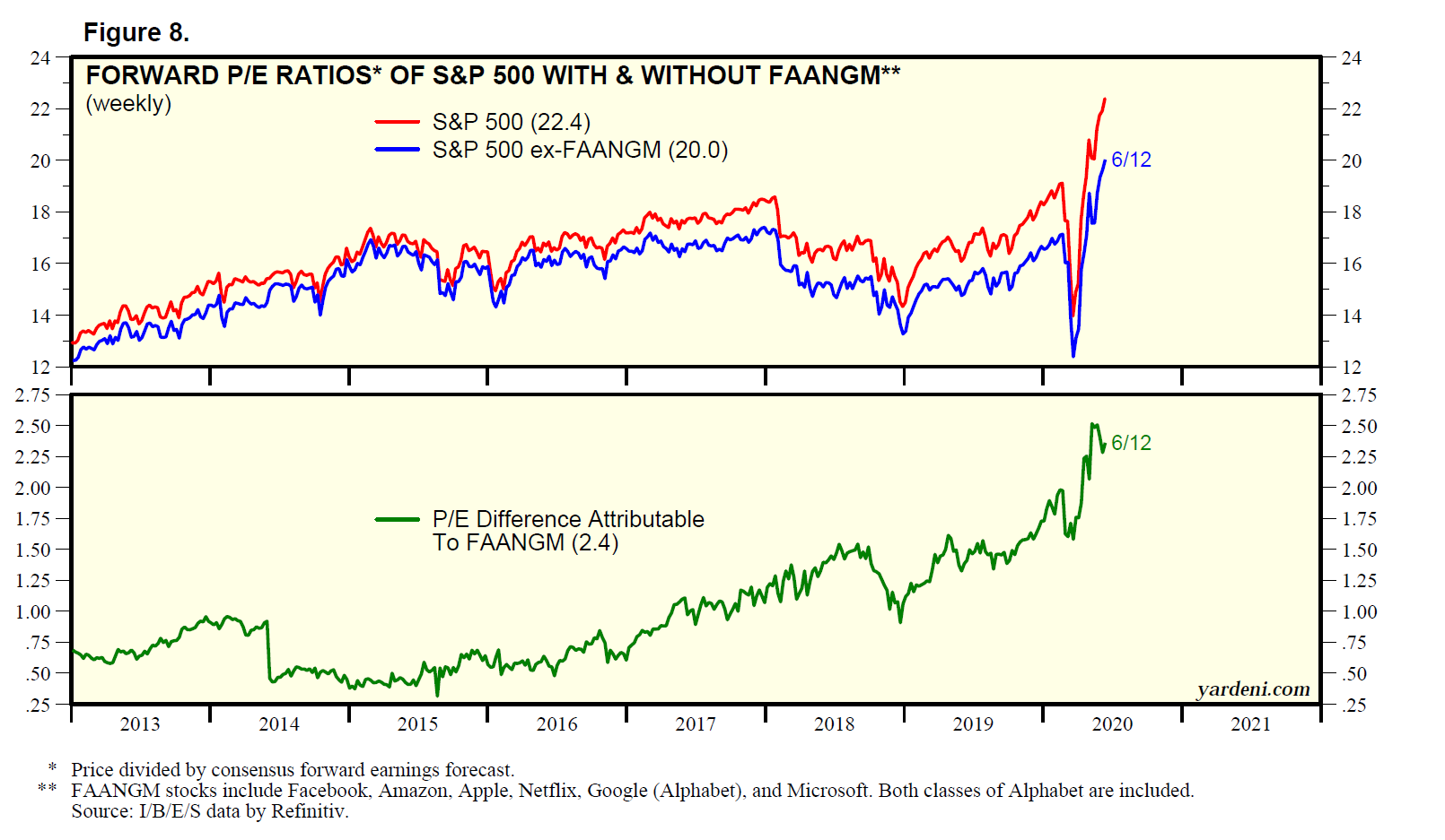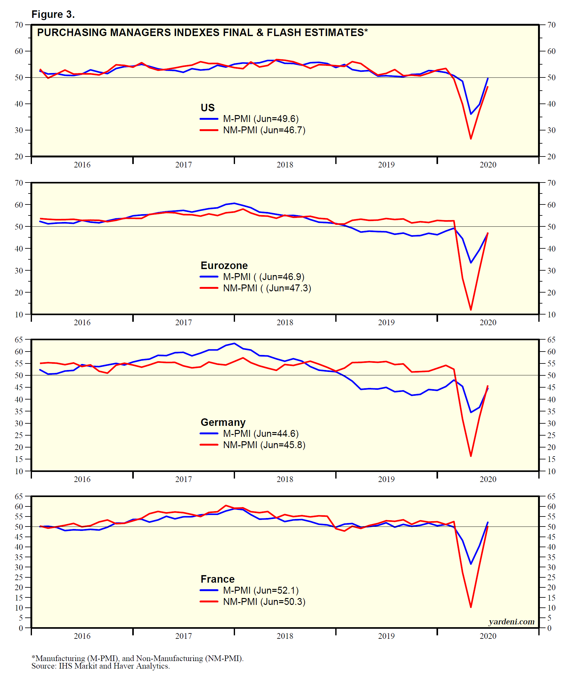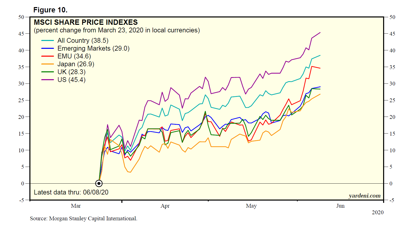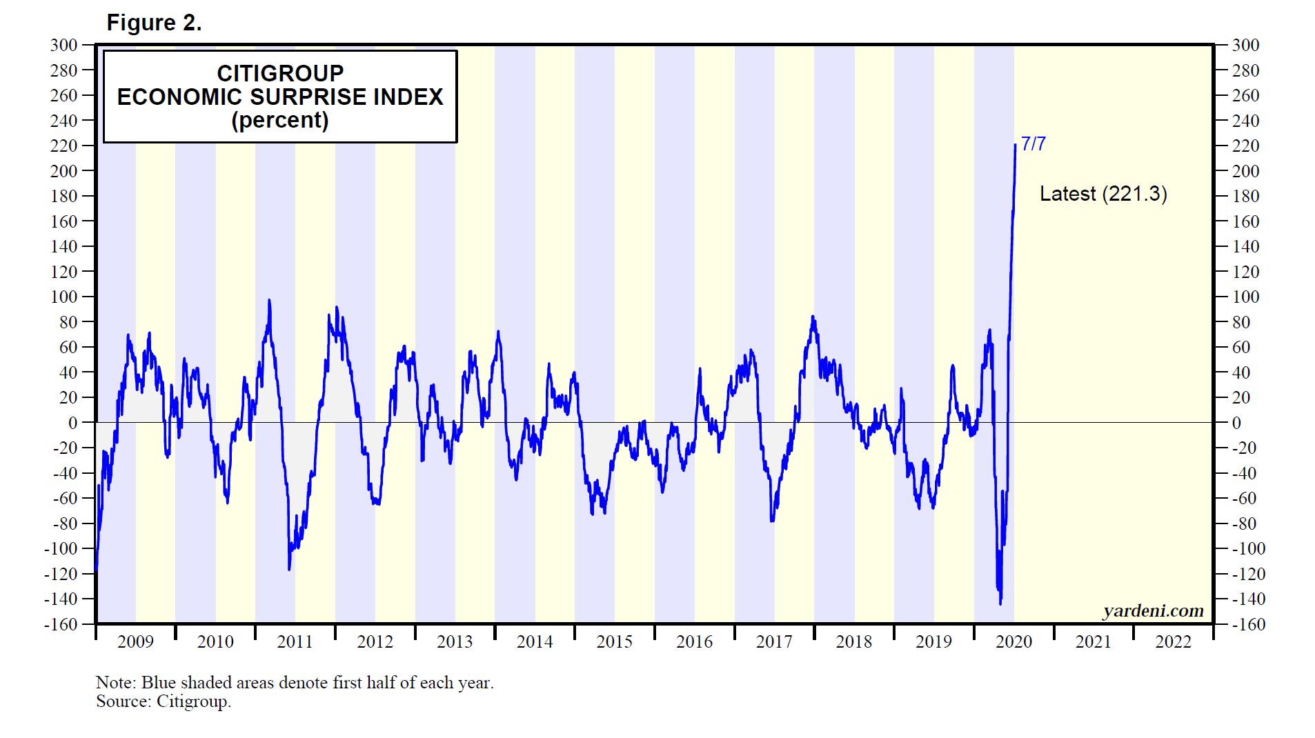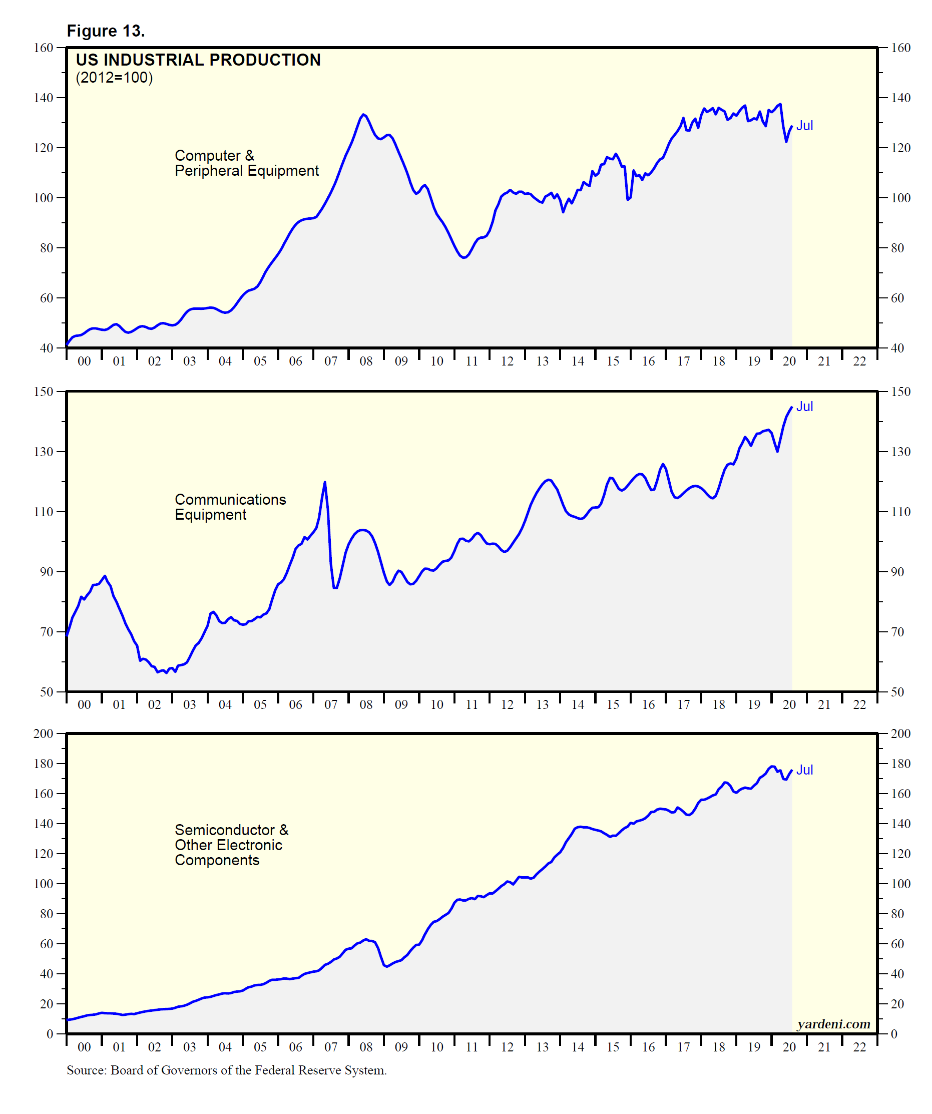 We will become more concerned about the latter scenarios if the market continues to go straight up and investors “party like it’s 1999” all over again, to quote the singer Prince. Following the LTCM crisis, the S&P 500 and the Nasdaq soared 59.6% and 236.7% from the end of August 1998 through March 2000. So far, since the pandemic low on March 23, they are up 63.7% and 80.4% through Friday’s close (Fig. 3).