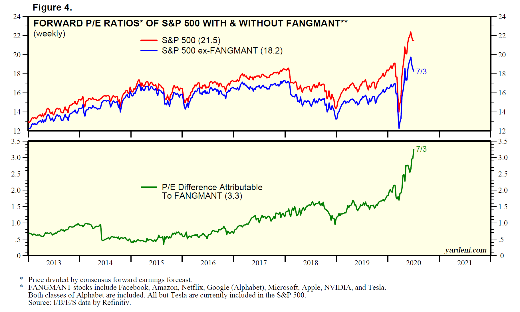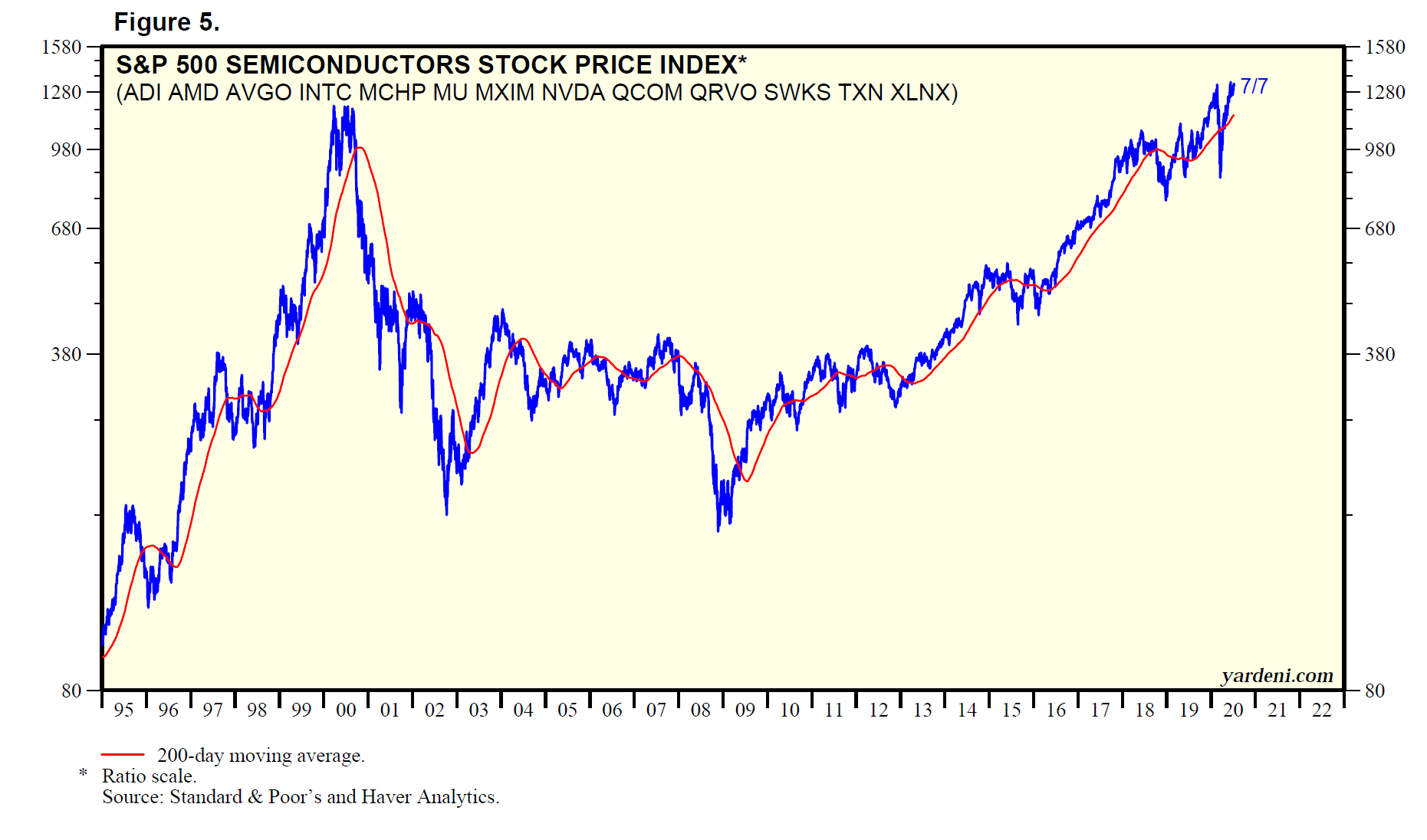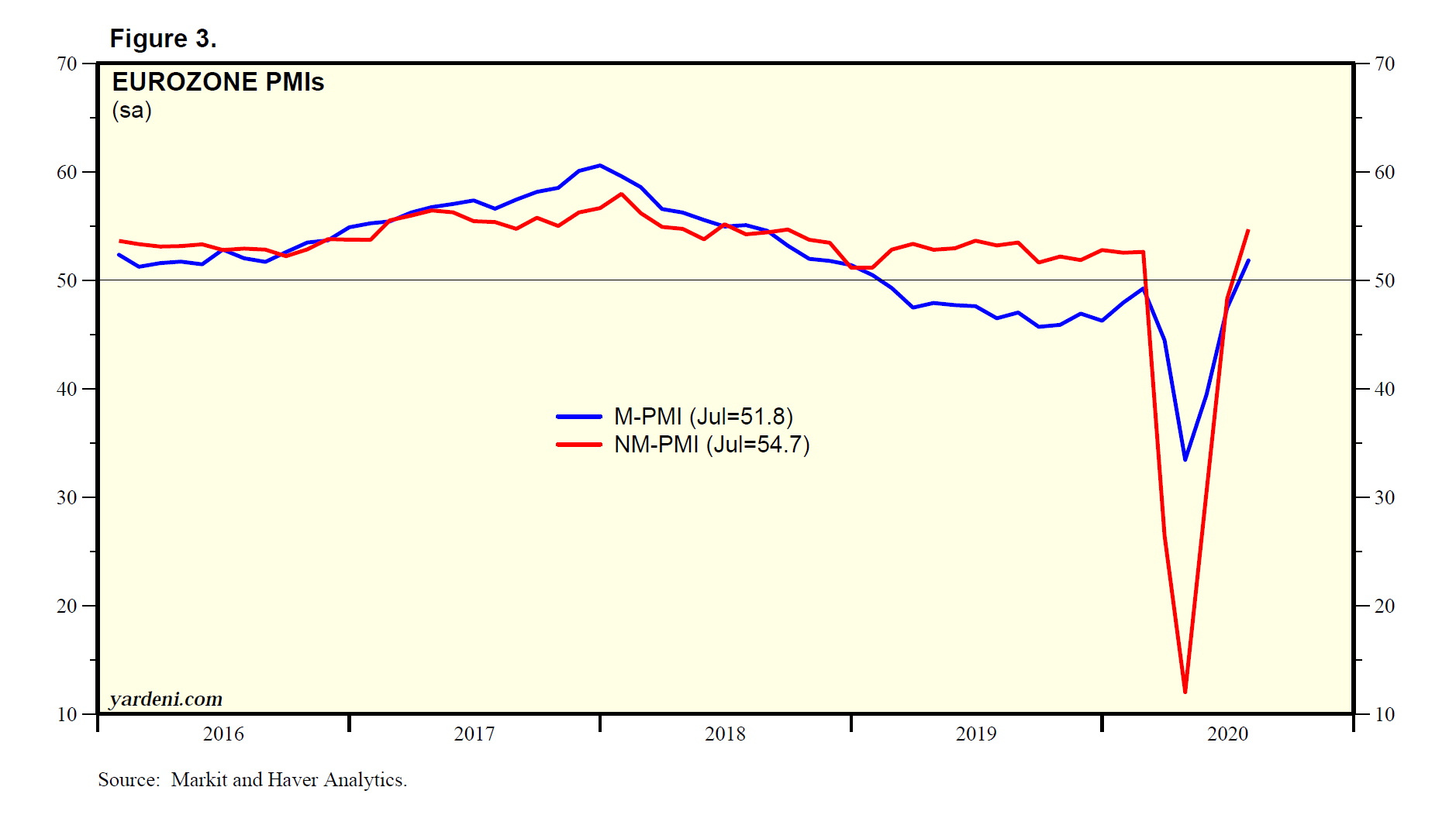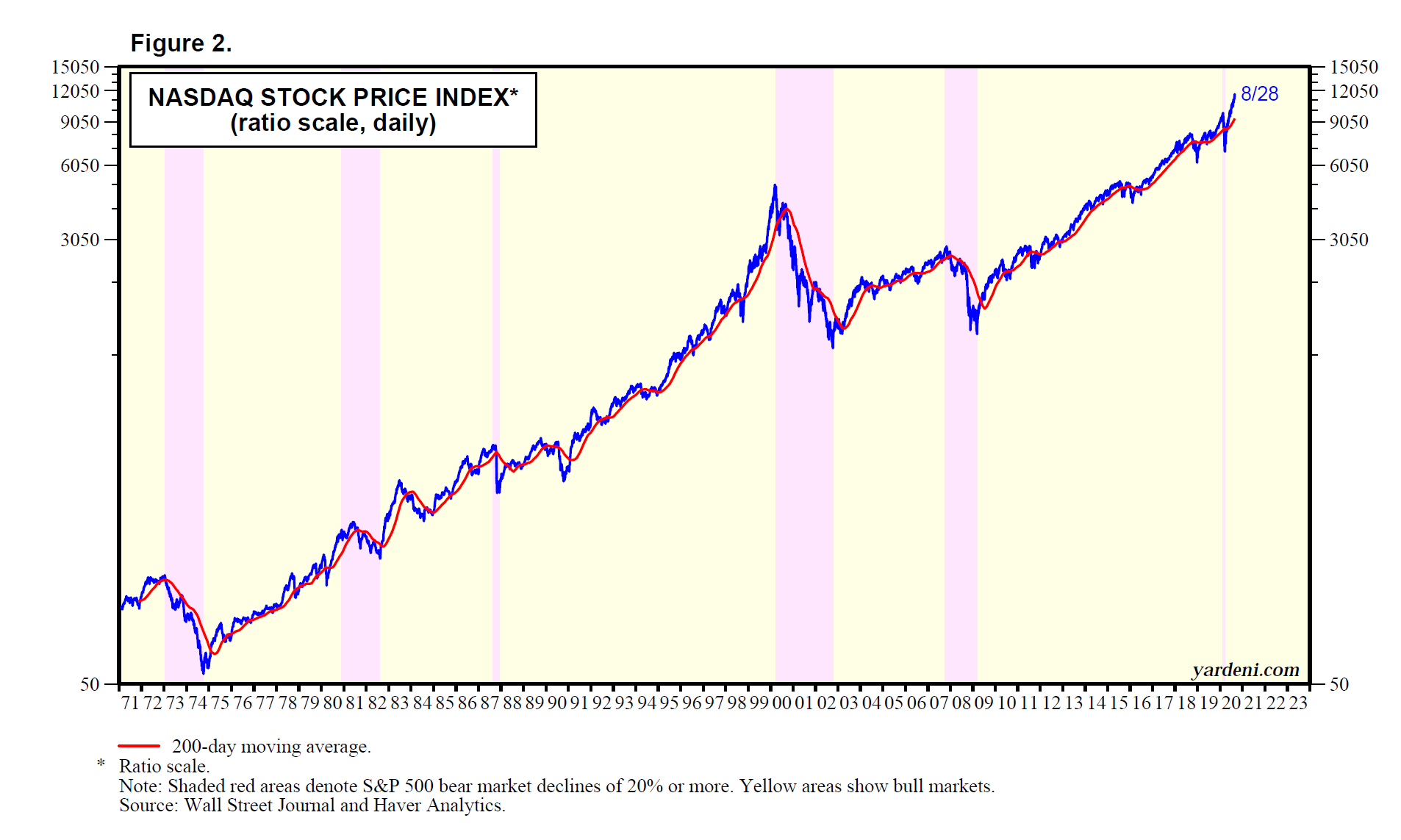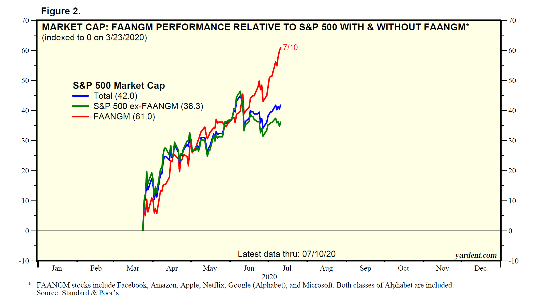 We will become more concerned about the latter scenarios if the market continues to go straight up and investors “party like it’s 1999” all over again, to quote the singer Prince. Following the LTCM crisis, the S&P 500 and the Nasdaq soared 59.6% and 236.7% from the end of August 1998 through March 2000. So far, since the pandemic low on March 23, they are up 63.7% and 80.4% through Friday’s close (Fig. 3).