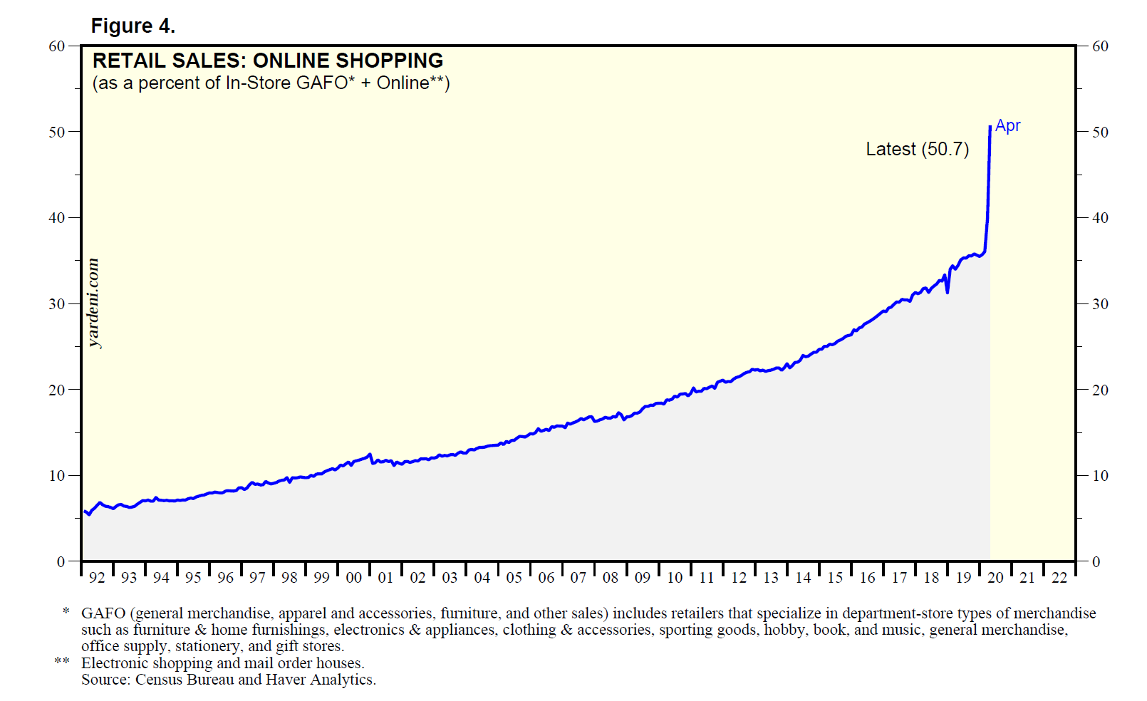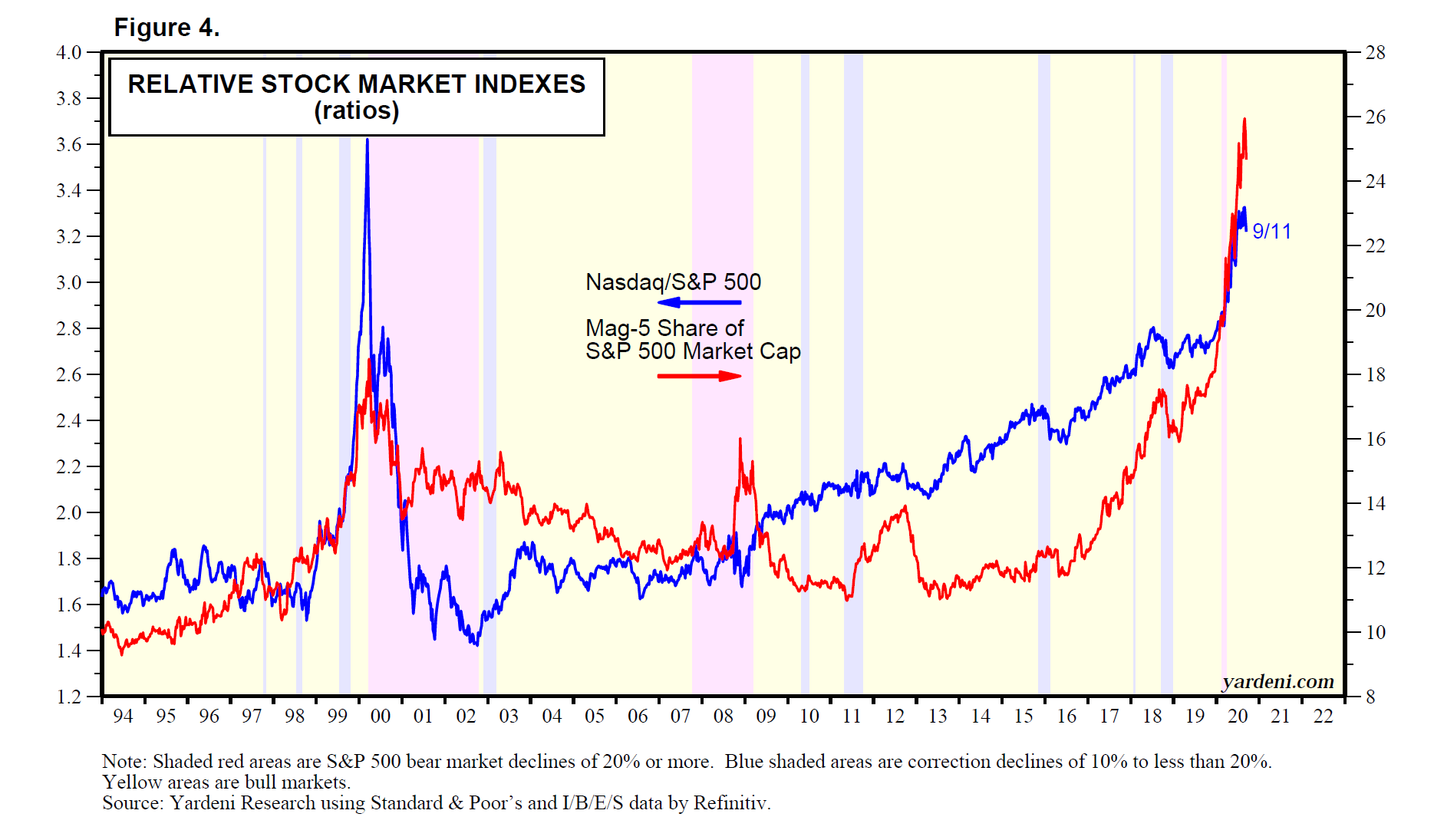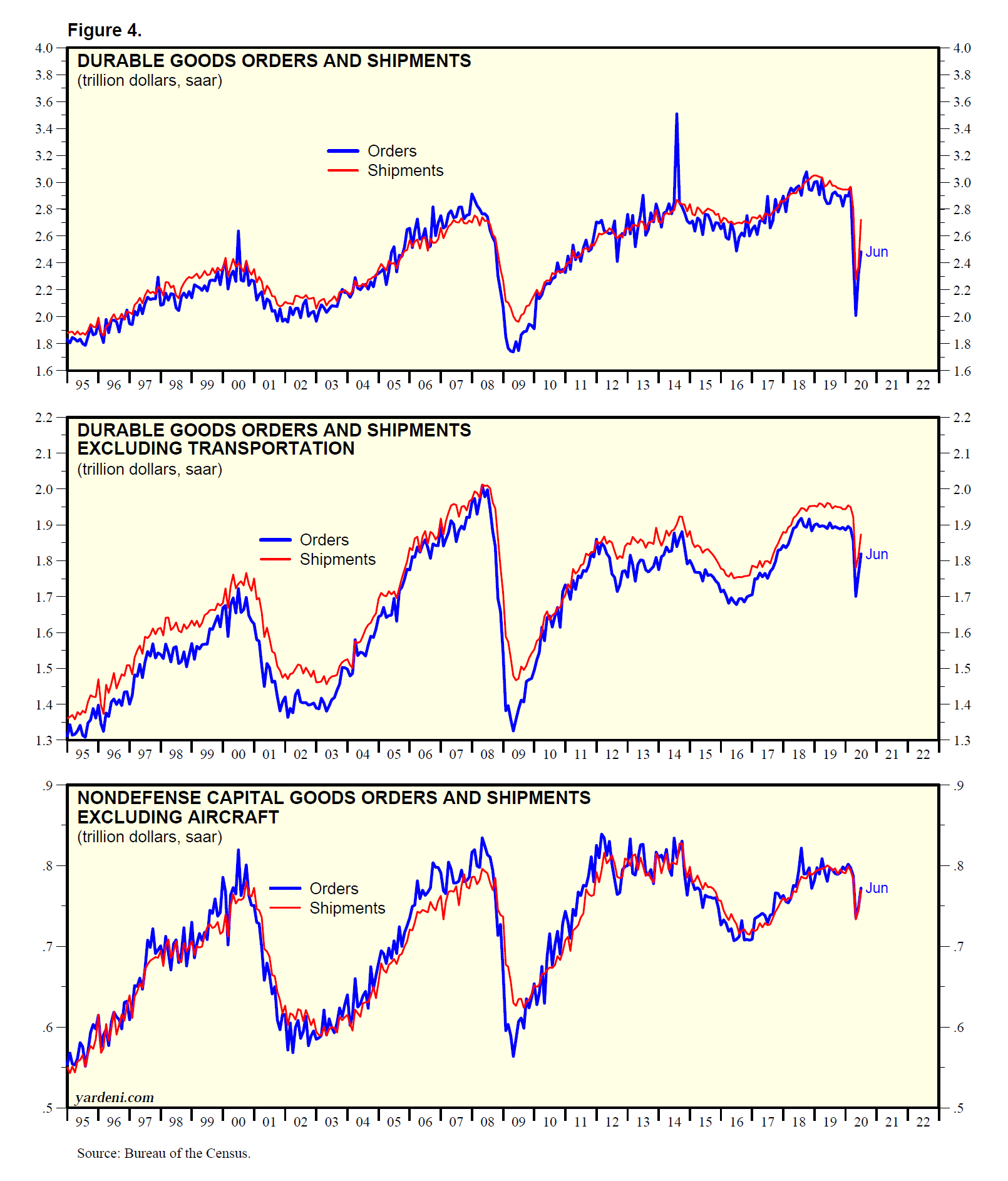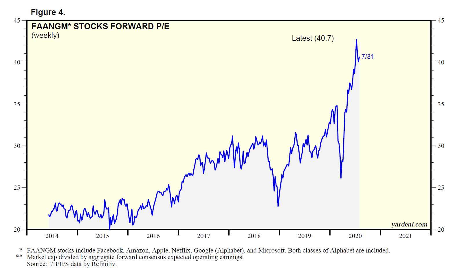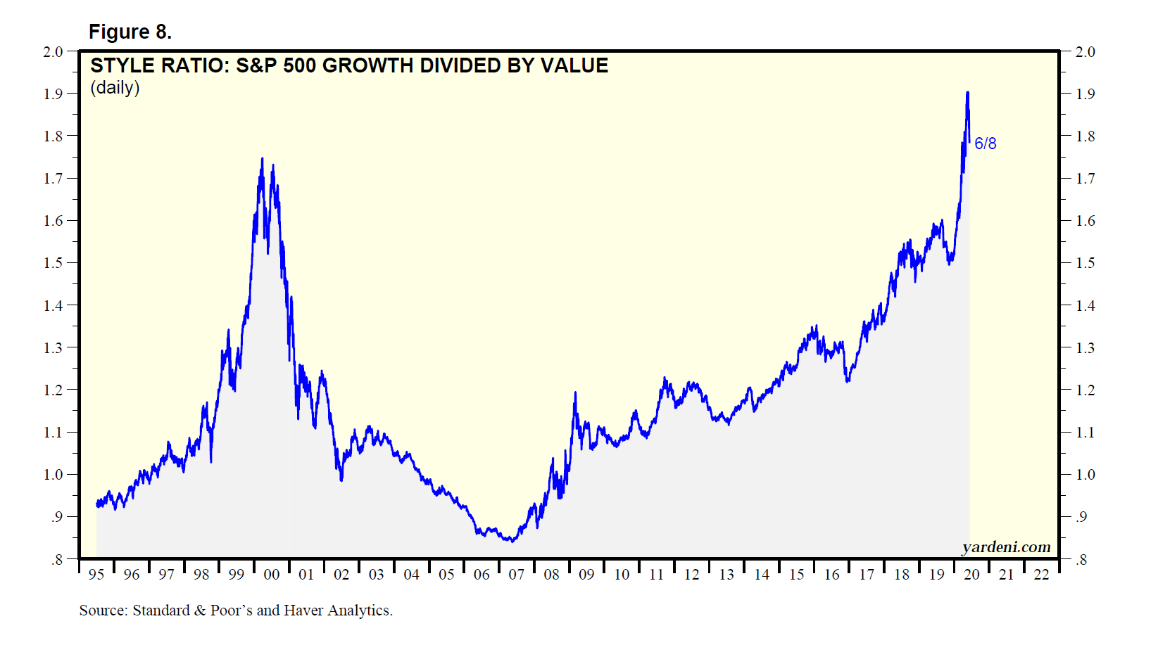 We will become more concerned about the latter scenarios if the market continues to go straight up and investors “party like it’s 1999” all over again, to quote the singer Prince. Following the LTCM crisis, the S&P 500 and the Nasdaq soared 59.6% and 236.7% from the end of August 1998 through March 2000. So far, since the pandemic low on March 23, they are up 63.7% and 80.4% through Friday’s close (Fig. 3).