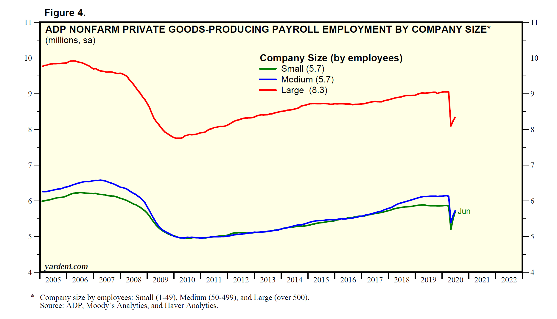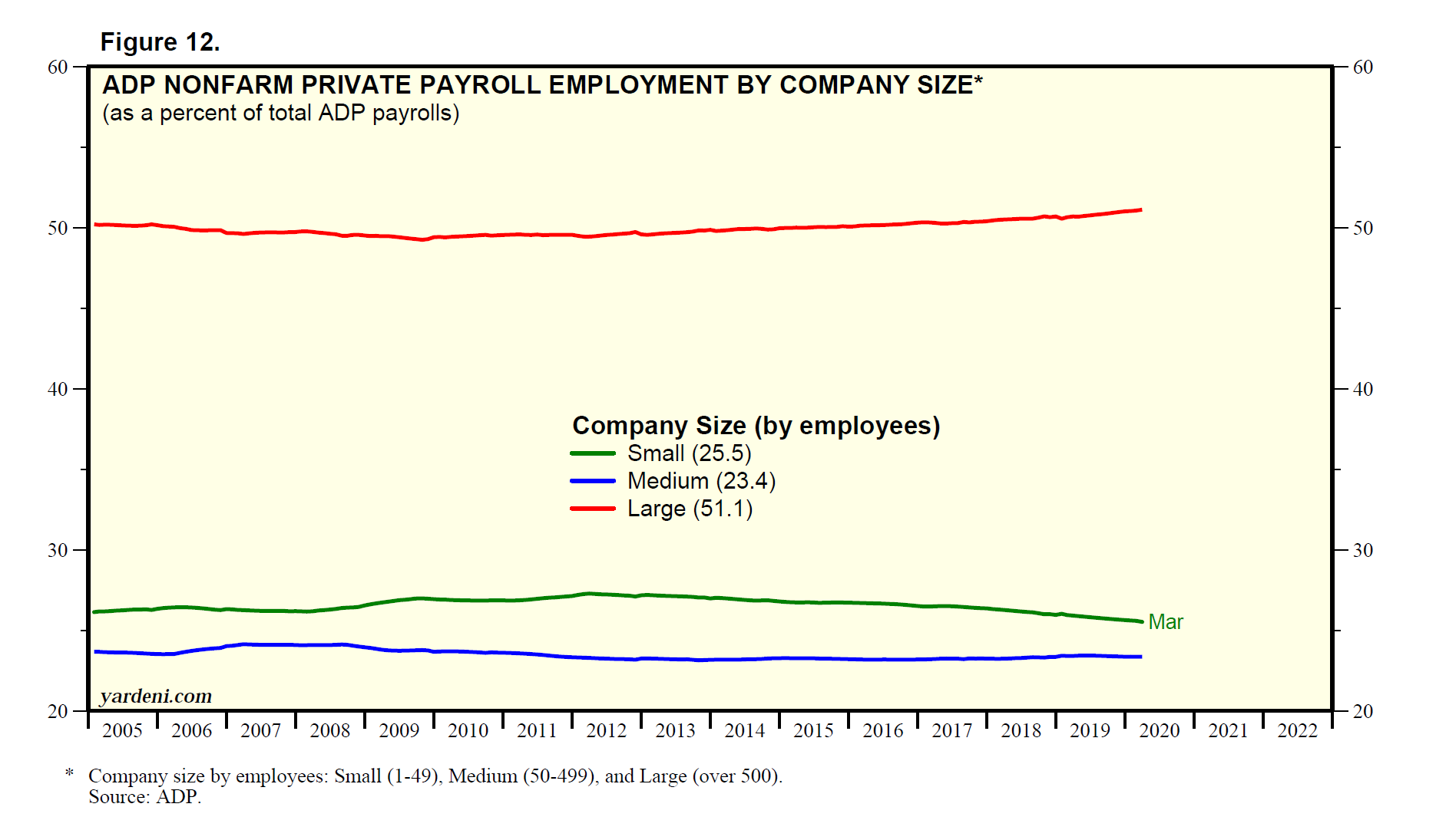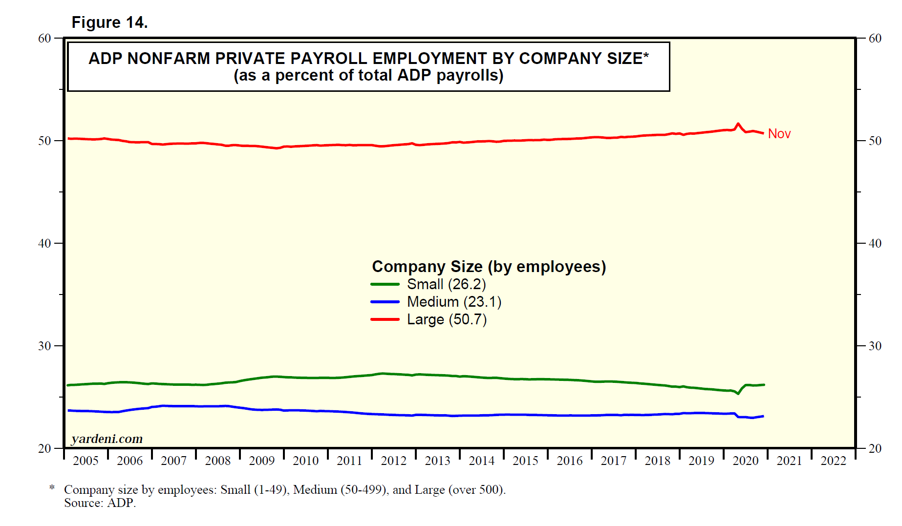 (5) Impact on employment. ADP compiles monthly data for the private-sector payrolls of large, medium, and small companies. Passthroughs are likely to account for the bulk of small companies, which currently employ 31.3 million workers and account for 26.2% of total private-sector payrolls (Fig. 13 and Fig. 14).