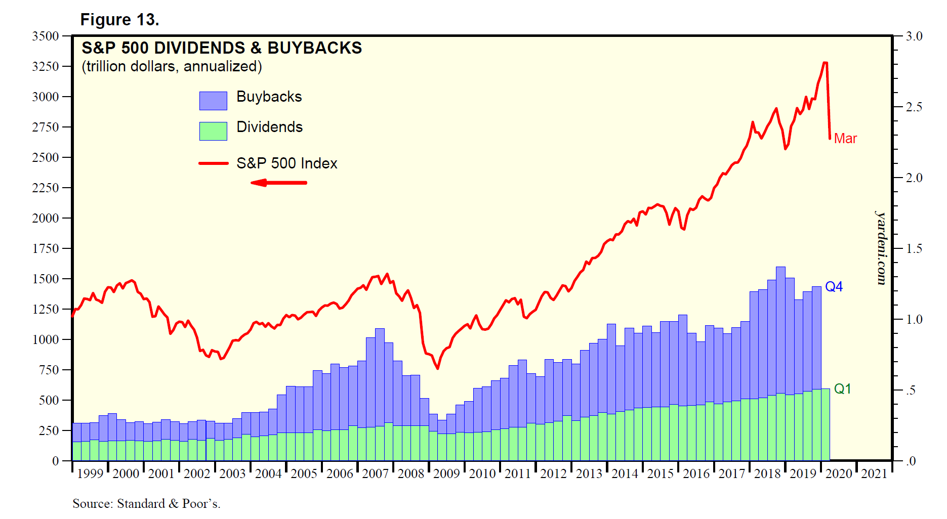 (1) Most buybacks are aimed at offsetting earnings dilution resulting from employee stock compensation plans. The funds for these buybacks are treated as compensation expense. So they aren’t paid for with either undistributed profits (at the expense of workers or capital spending) or funds raised in the bond market.