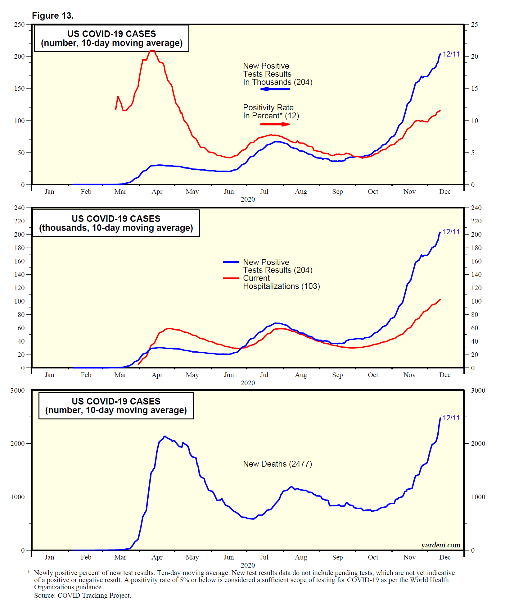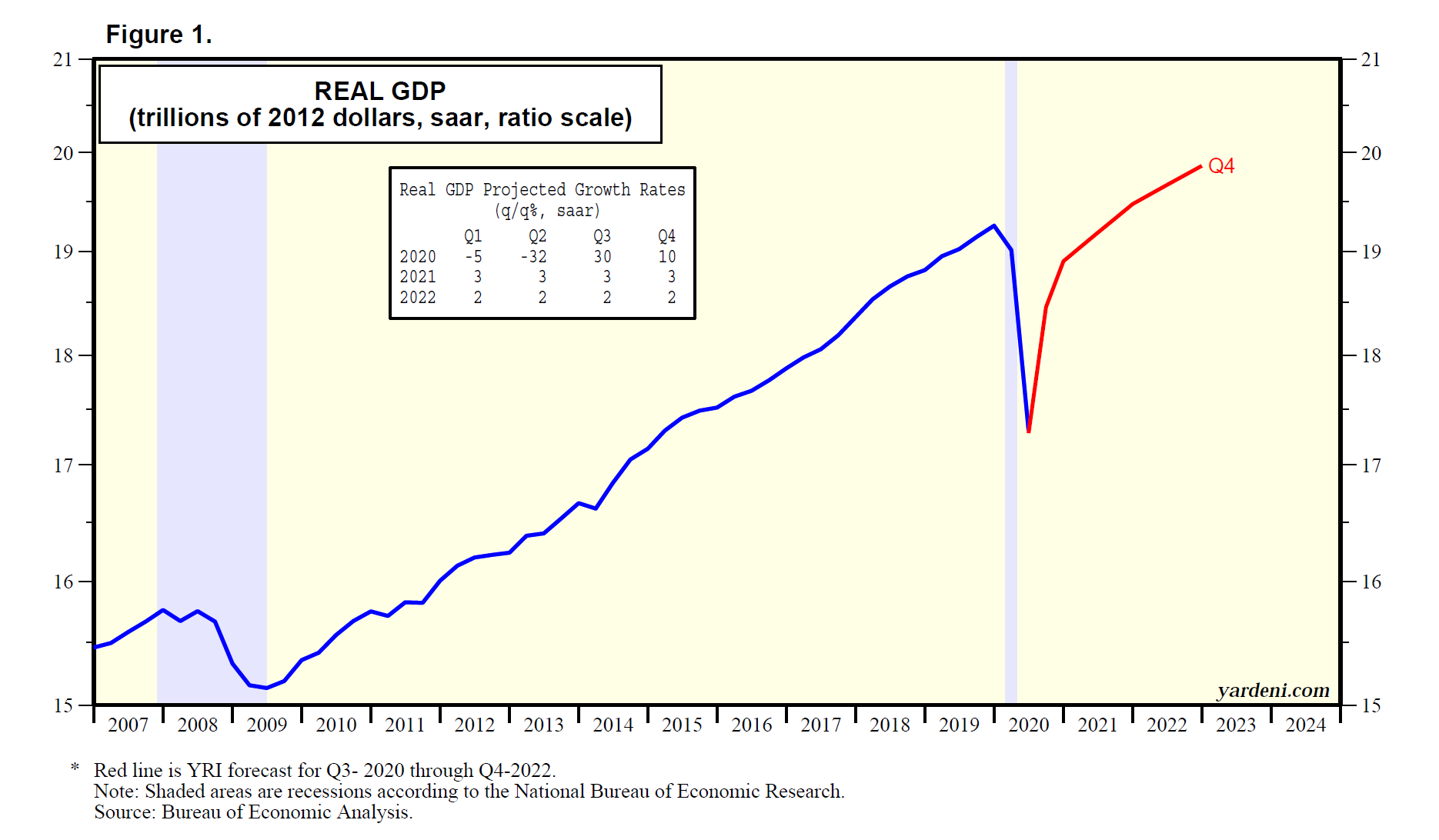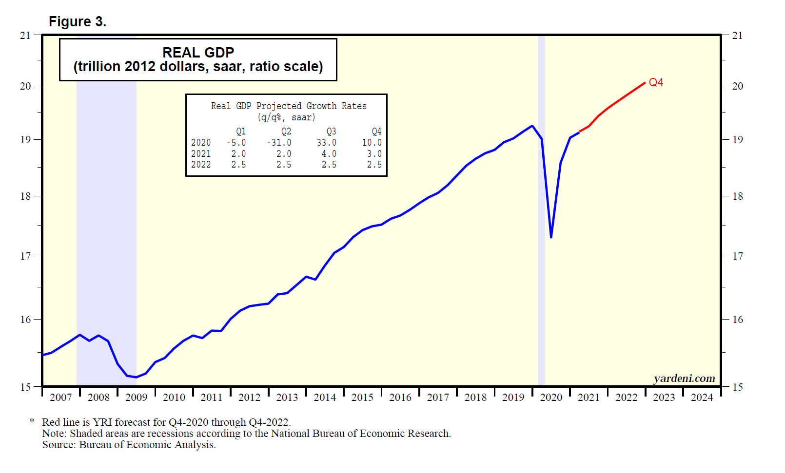 (1) GDP and S&P 500 revenues. Debbie and I are raising our estimate for Q4-2020 real GDP growth from 5% to 10%. We are lowering both our Q1- and Q2-2021 growth rates to 2% to reflect renewed lockdown restrictions in response to the third wave of the pandemic. We are raising our Q3- and Q4-2021 growth estimates to 4% and 3% because we expect an economic boom after vaccines have been widely distributed during the first half of the coming year. That puts real GDP up 4.6% next year over this year, or up 2.8% on a Q4/Q4 basis. (See YRI Economic Forecasts.)