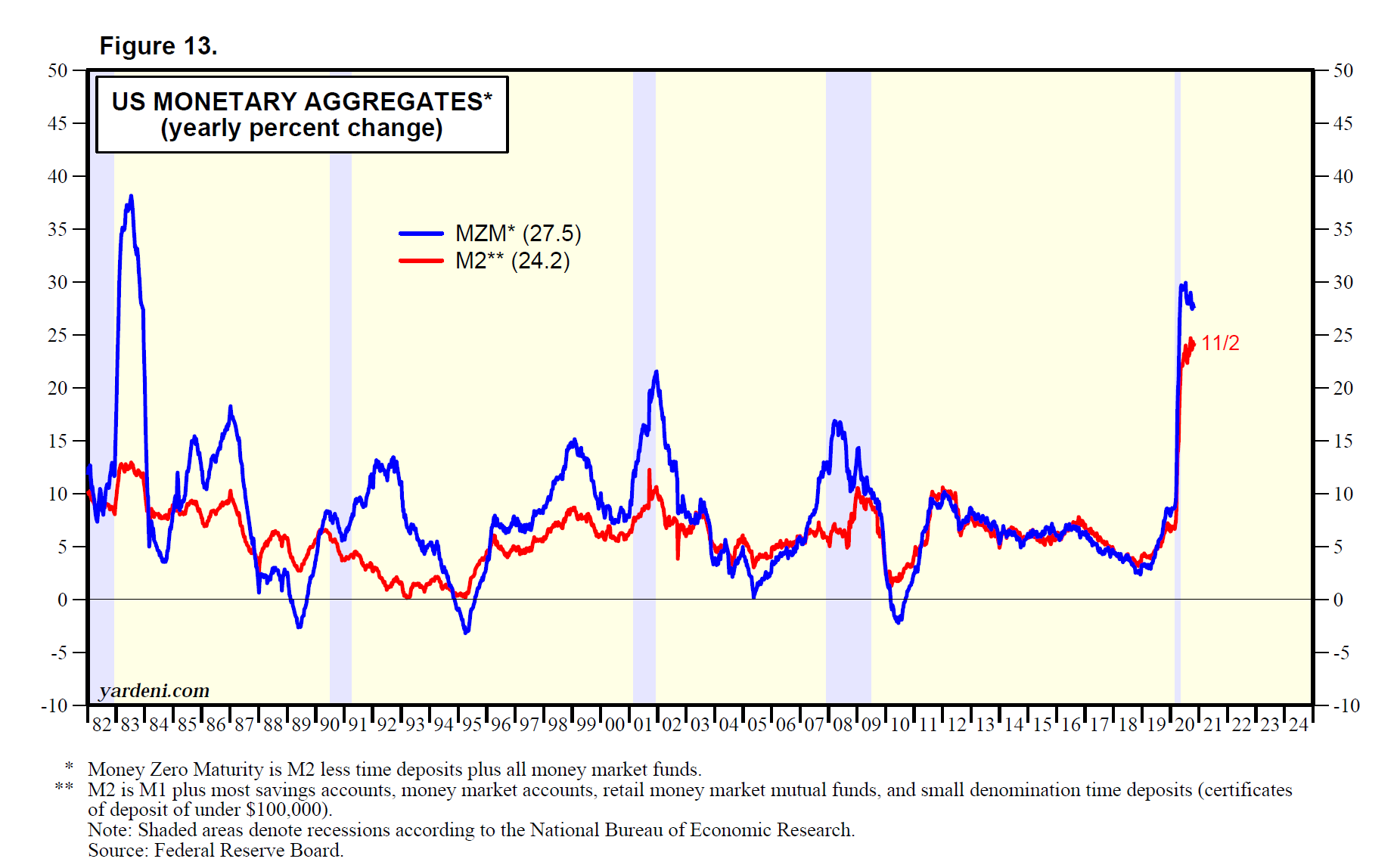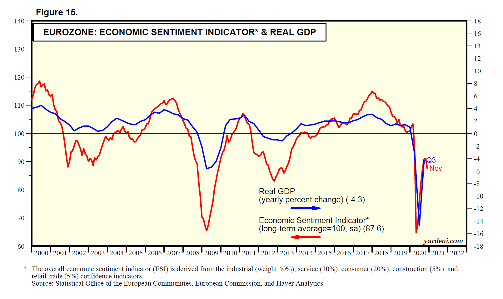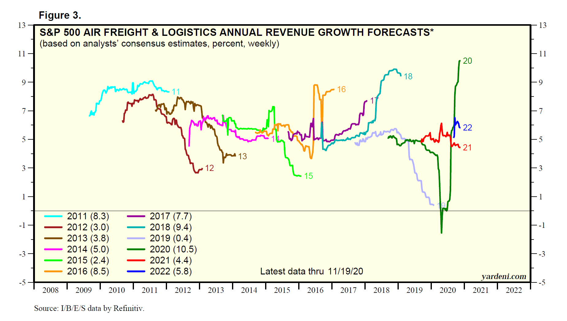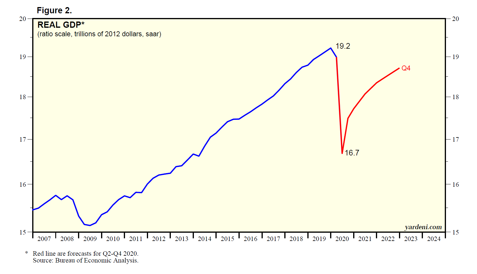 (1) GDP and S&P 500 revenues. Debbie and I are raising our estimate for Q4-2020 real GDP growth from 5% to 10%. We are lowering both our Q1- and Q2-2021 growth rates to 2% to reflect renewed lockdown restrictions in response to the third wave of the pandemic. We are raising our Q3- and Q4-2021 growth estimates to 4% and 3% because we expect an economic boom after vaccines have been widely distributed during the first half of the coming year. That puts real GDP up 4.6% next year over this year, or up 2.8% on a Q4/Q4 basis. (See YRI Economic Forecasts.)