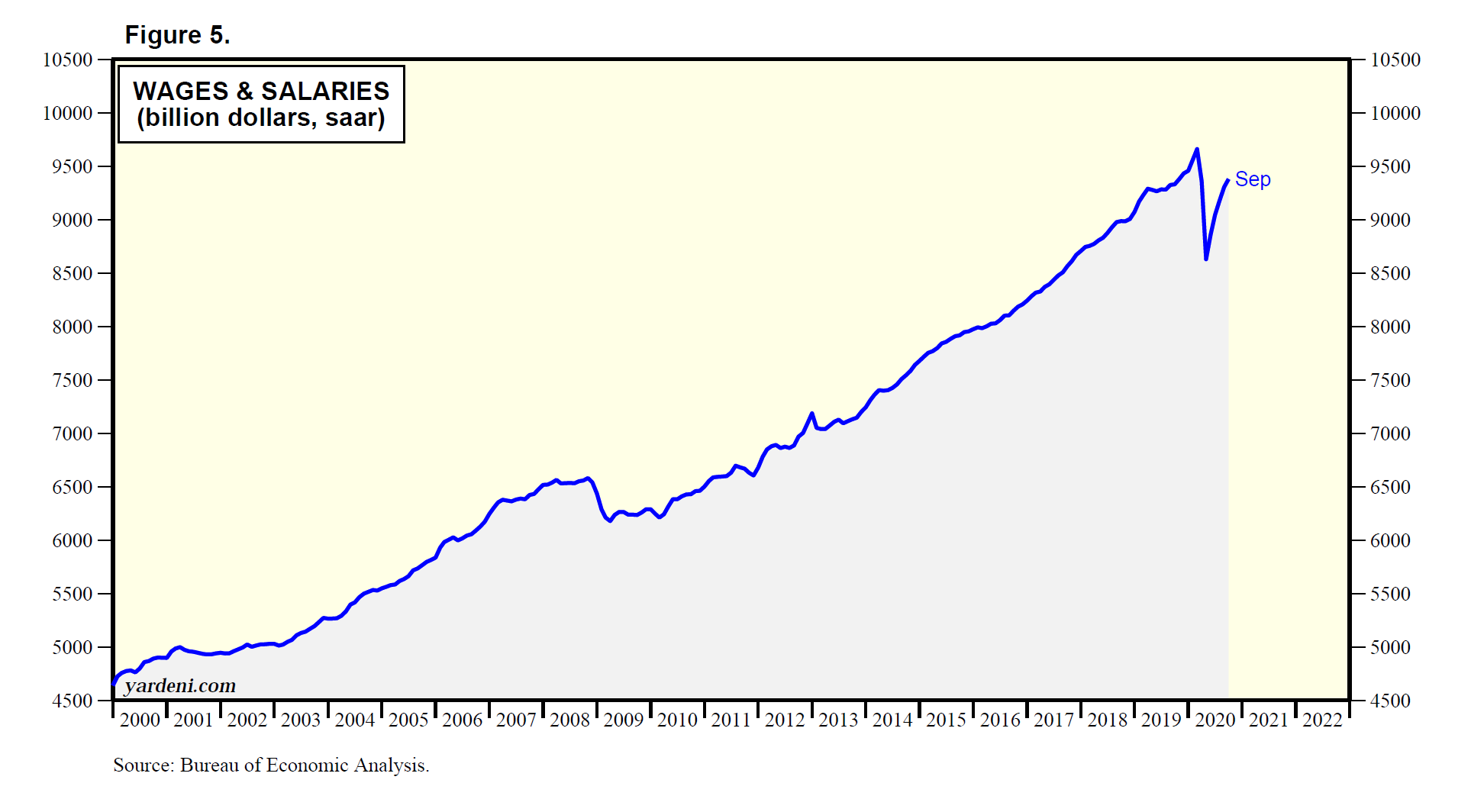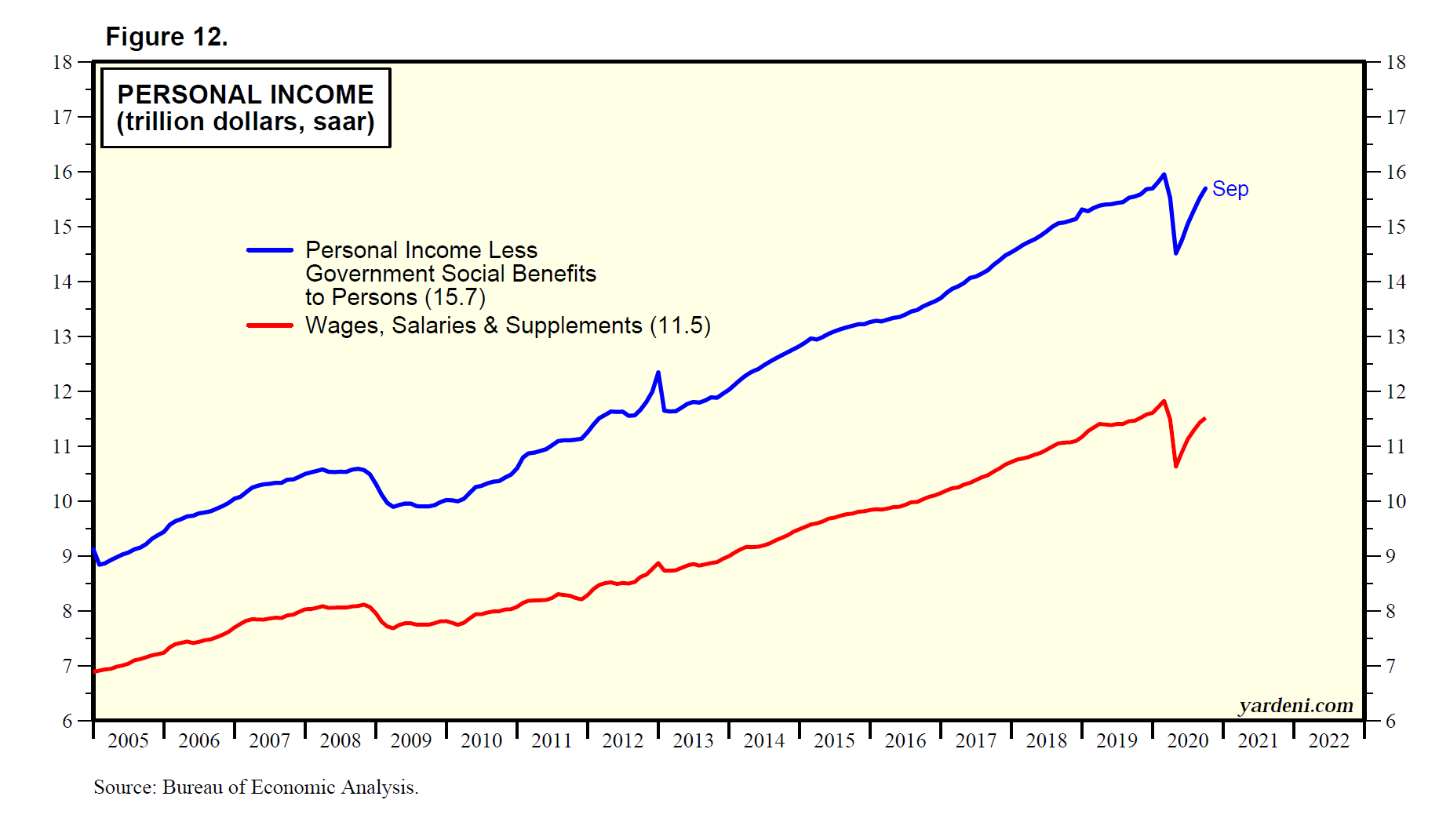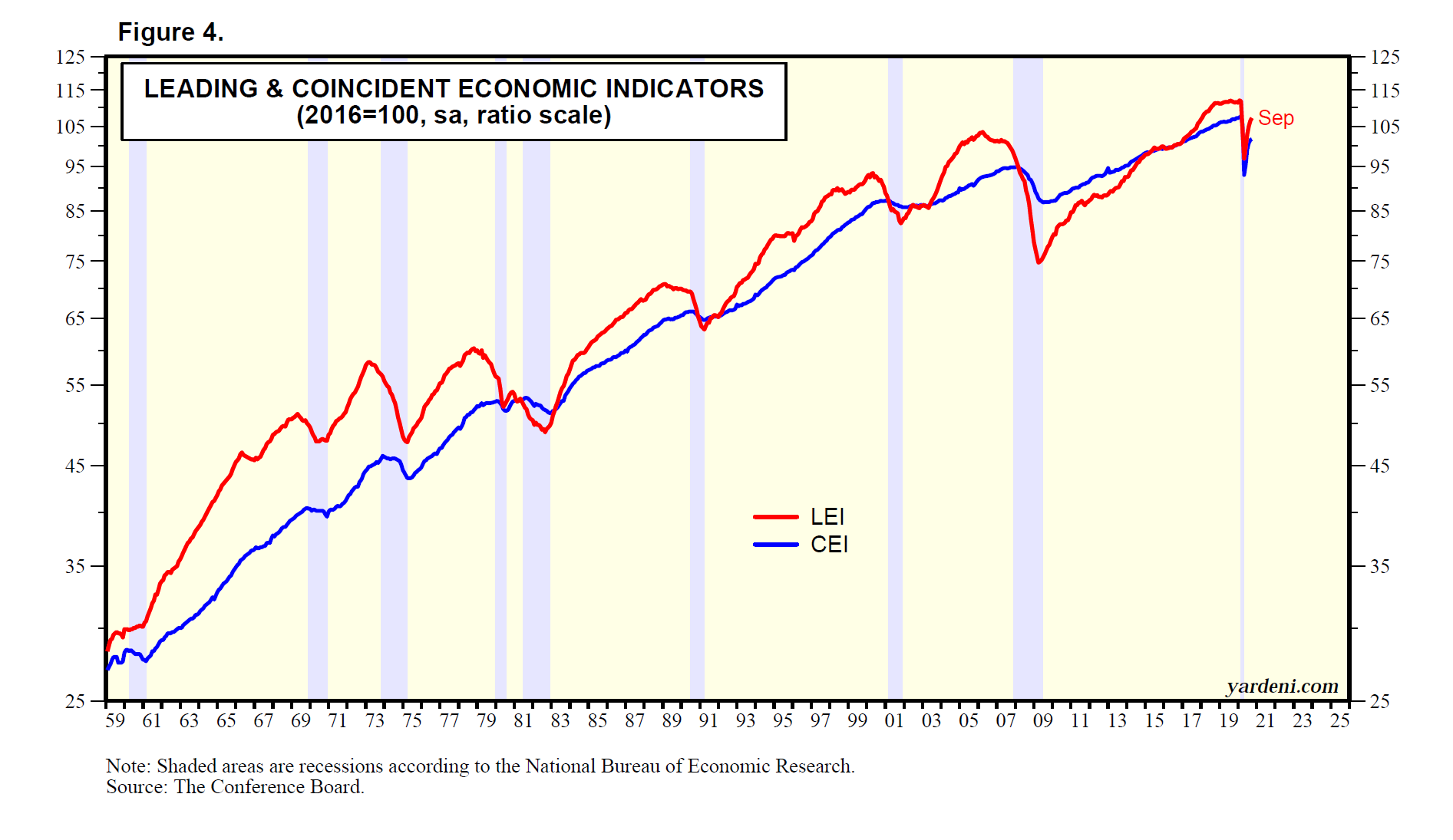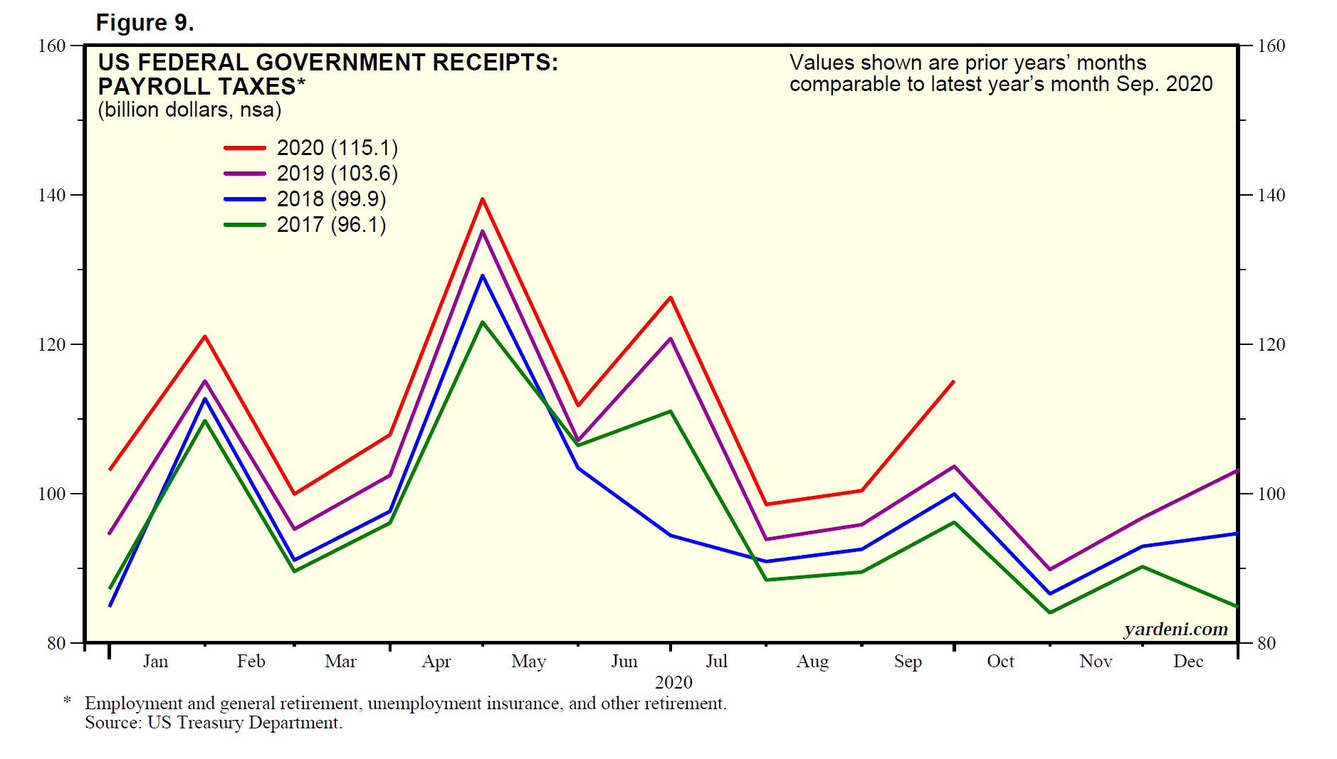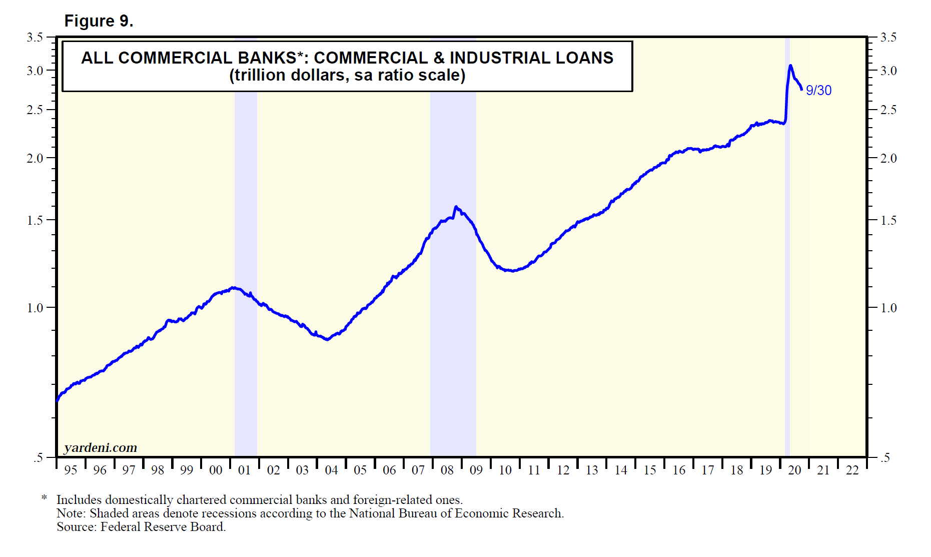 The bottom line is that during Q3 profits have recovered remarkably well from the lockdown recession during the first half of this year. On the other hand, corporate balance sheets are loaded up with more debt than ever. However, much of it has been refinanced at record-low interest rates. It’s all bullish for the economy and the stock market as long as interest rates stay low.