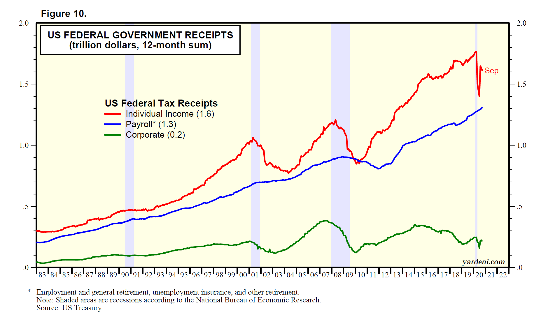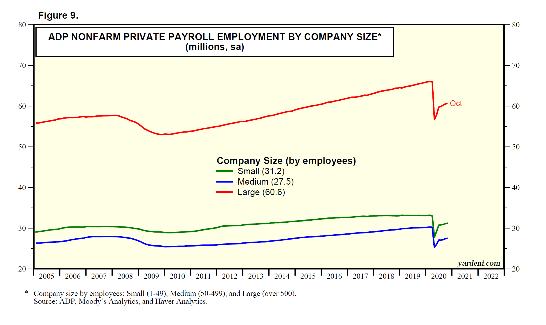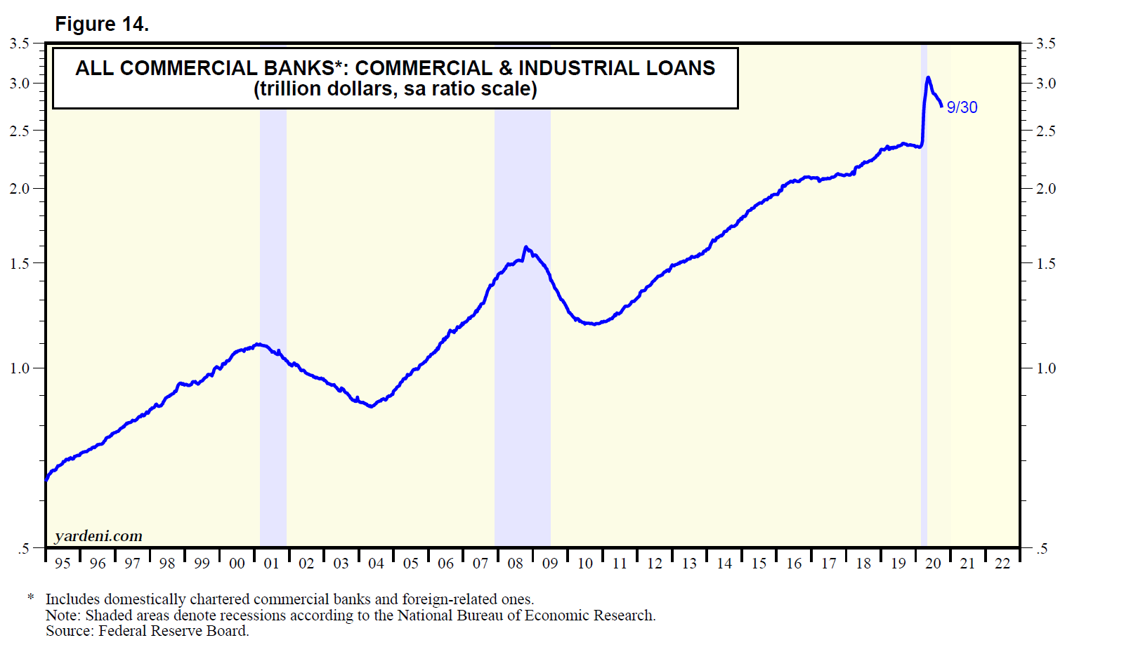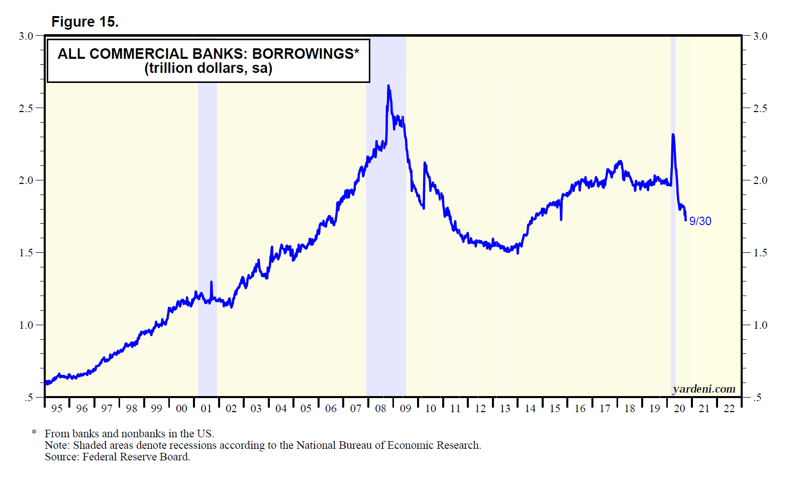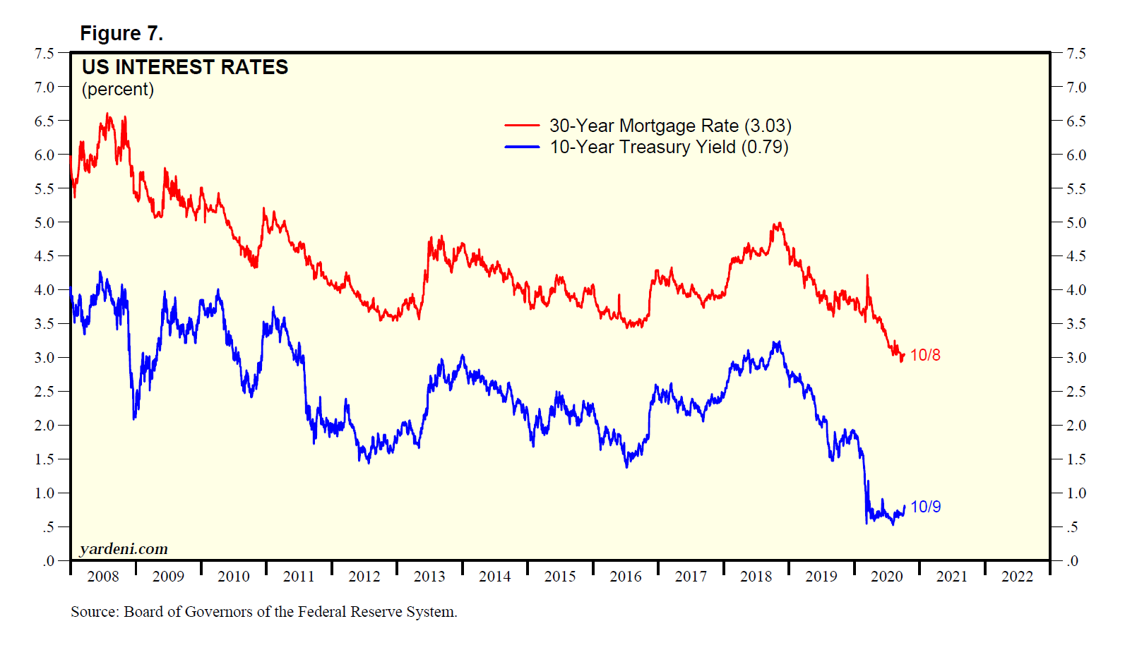 The bottom line is that during Q3 profits have recovered remarkably well from the lockdown recession during the first half of this year. On the other hand, corporate balance sheets are loaded up with more debt than ever. However, much of it has been refinanced at record-low interest rates. It’s all bullish for the economy and the stock market as long as interest rates stay low.