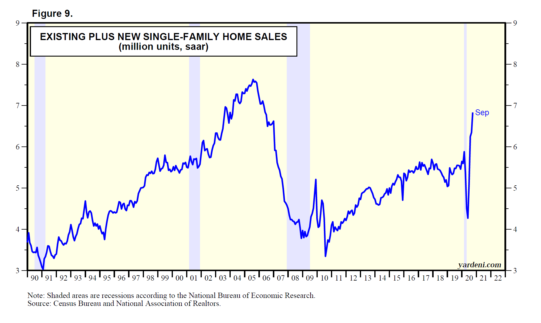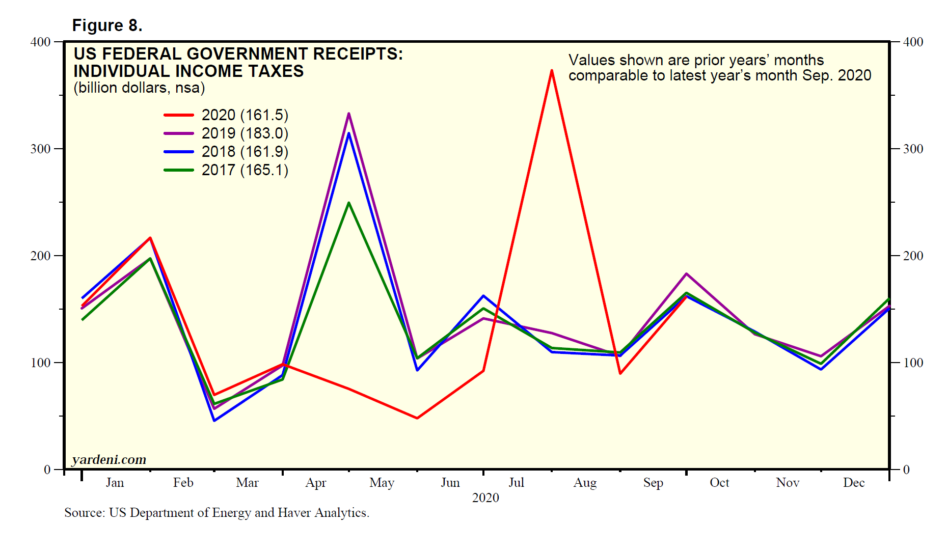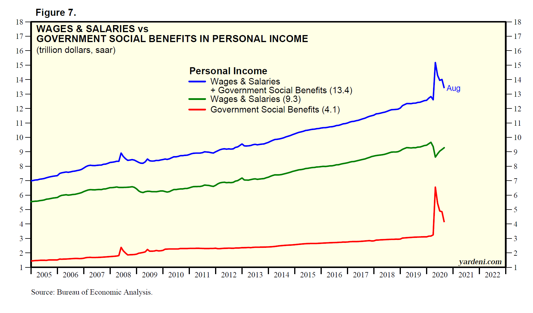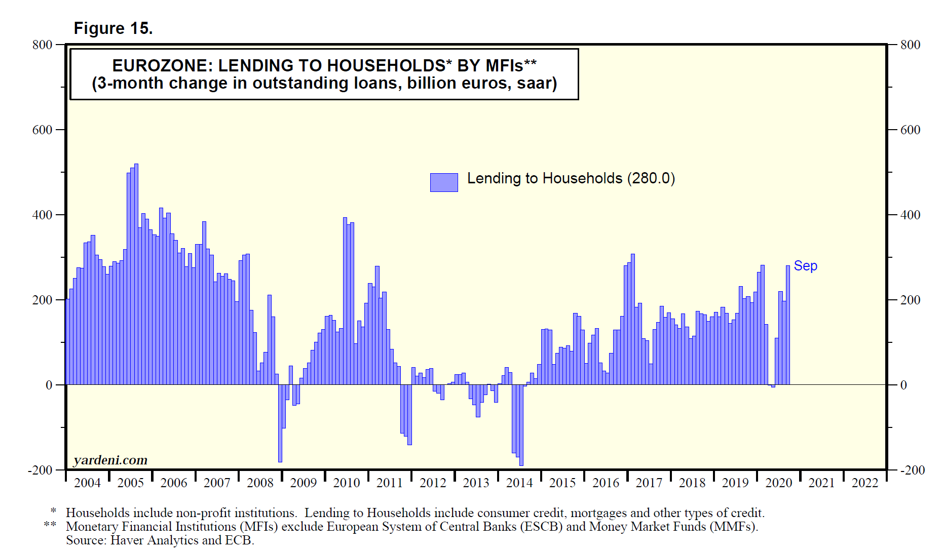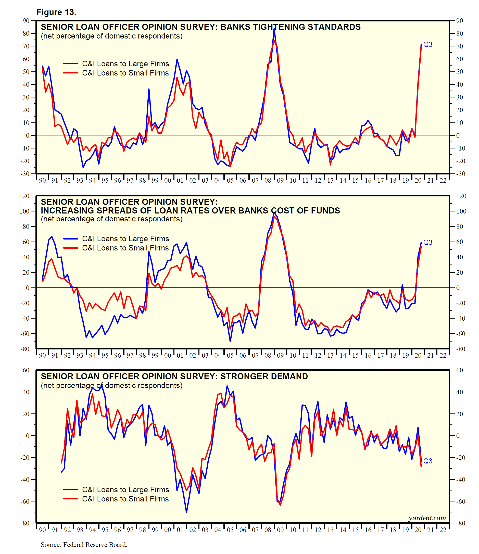 The bottom line is that during Q3 profits have recovered remarkably well from the lockdown recession during the first half of this year. On the other hand, corporate balance sheets are loaded up with more debt than ever. However, much of it has been refinanced at record-low interest rates. It’s all bullish for the economy and the stock market as long as interest rates stay low.