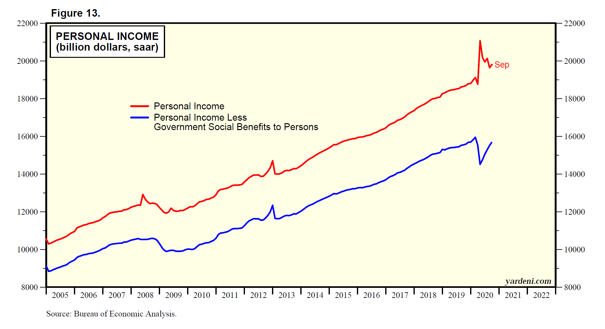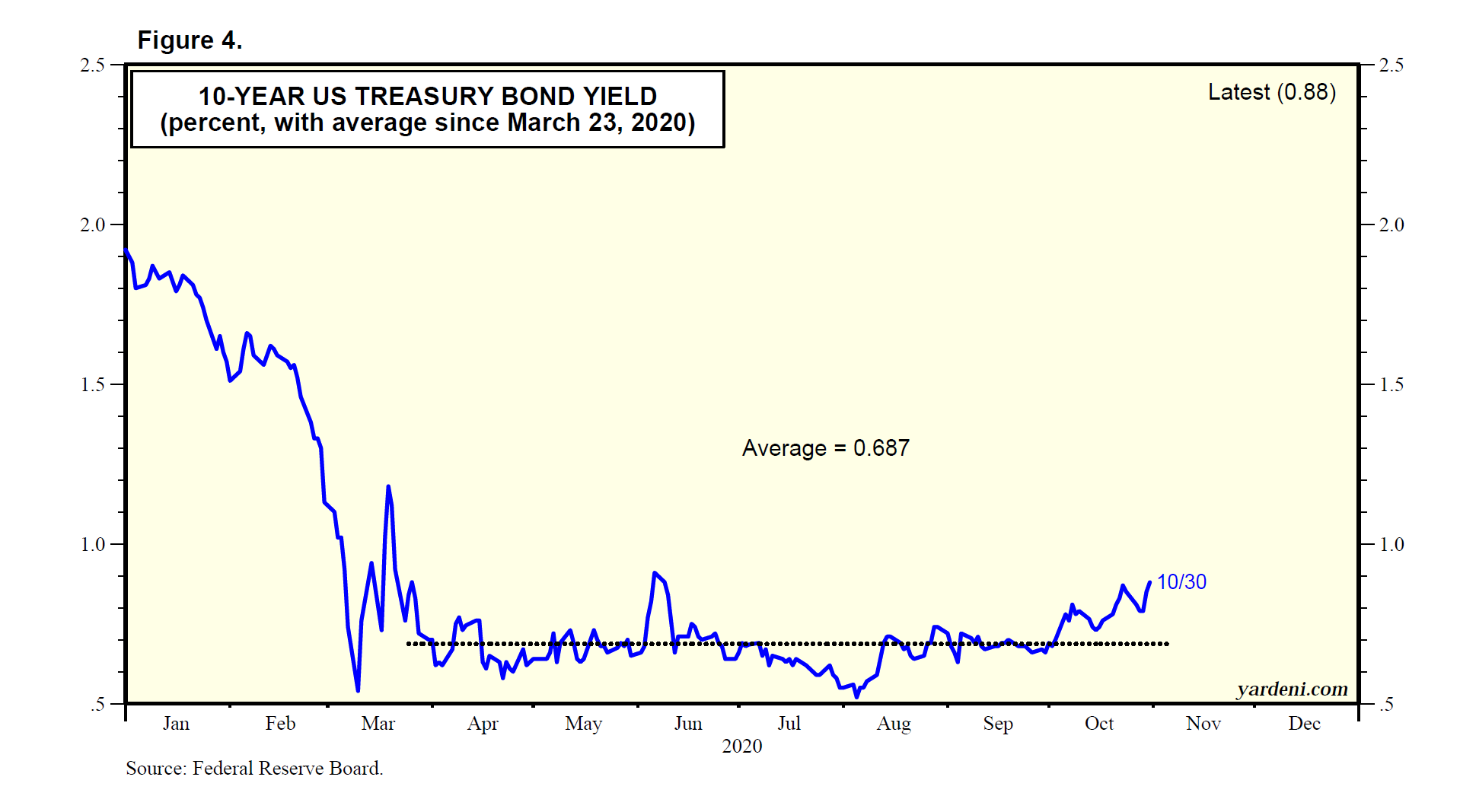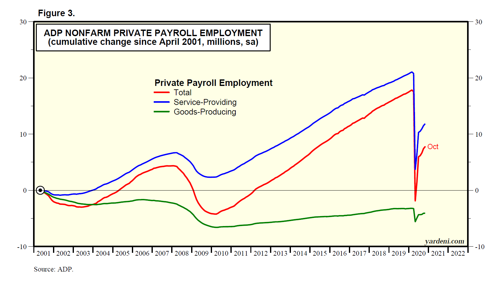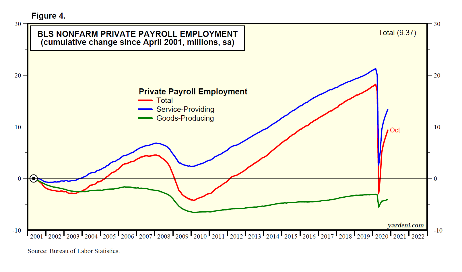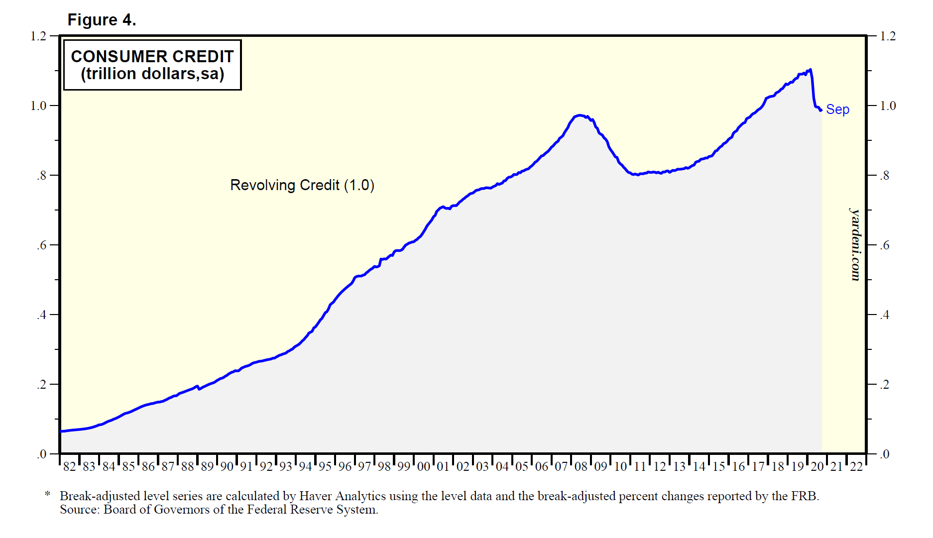 The bottom line is that during Q3 profits have recovered remarkably well from the lockdown recession during the first half of this year. On the other hand, corporate balance sheets are loaded up with more debt than ever. However, much of it has been refinanced at record-low interest rates. It’s all bullish for the economy and the stock market as long as interest rates stay low.